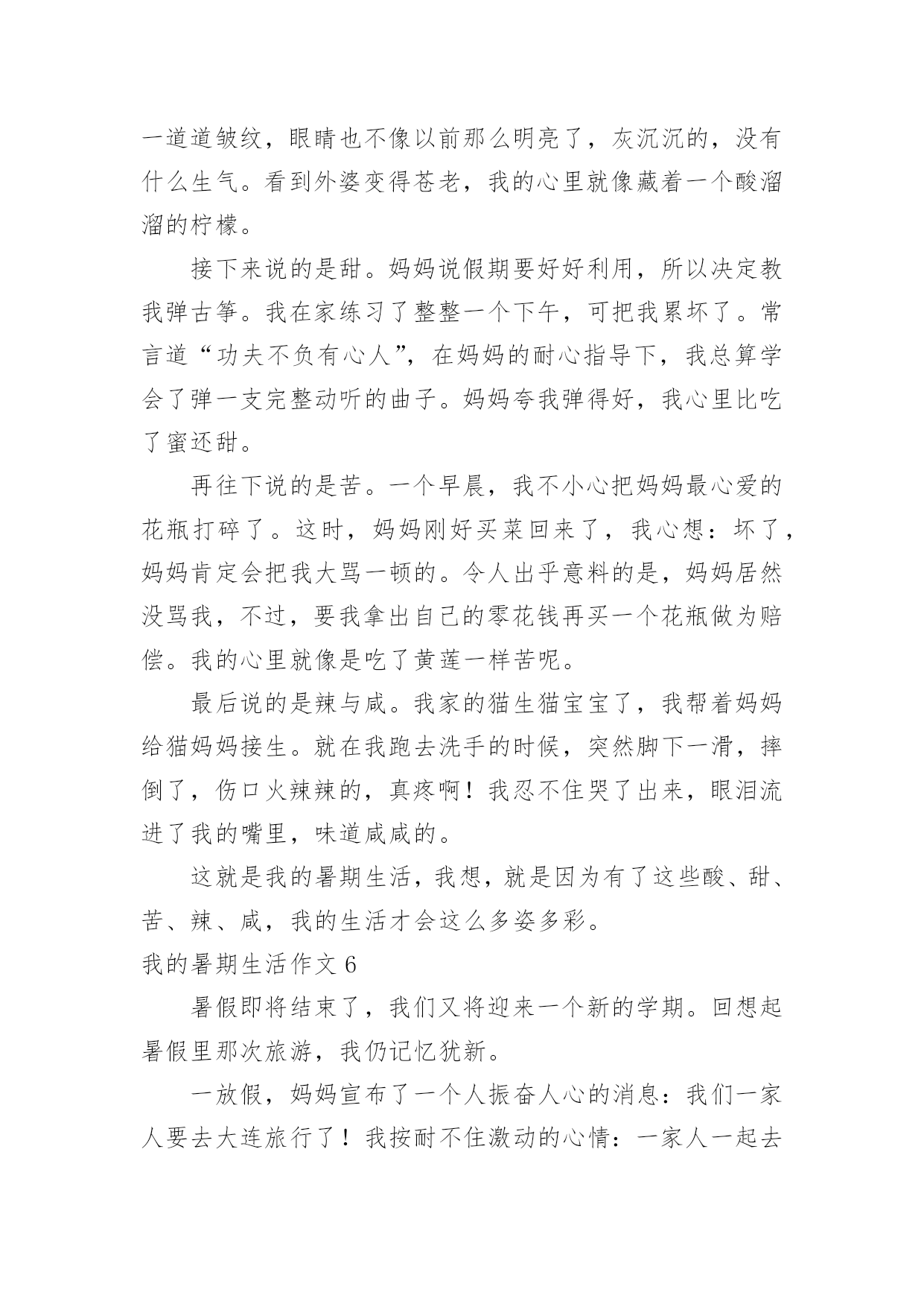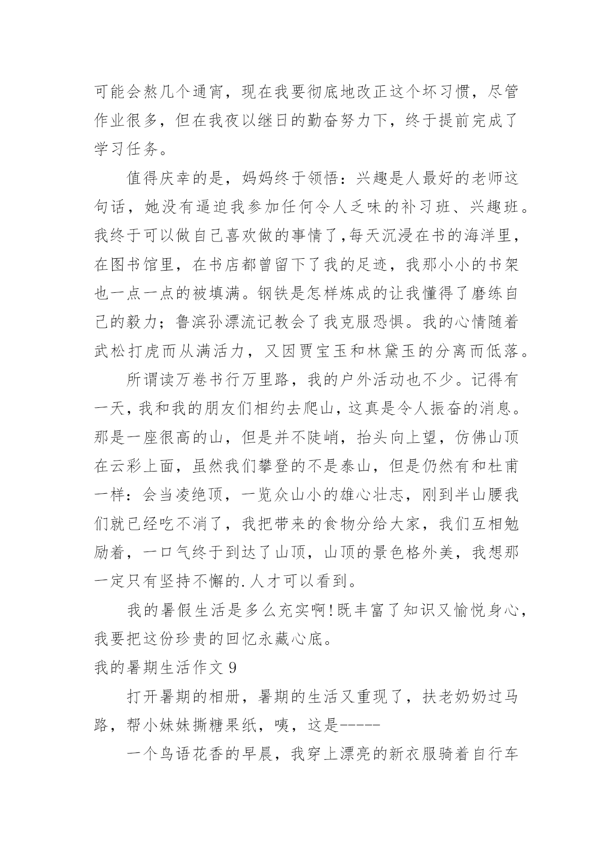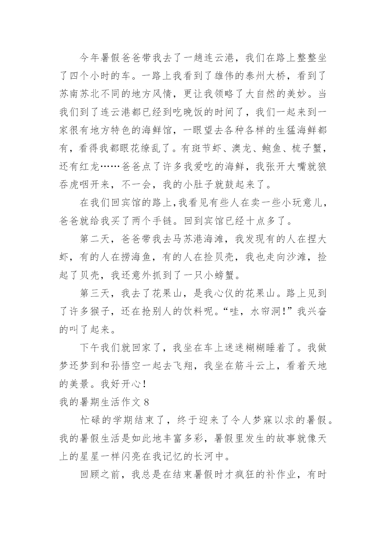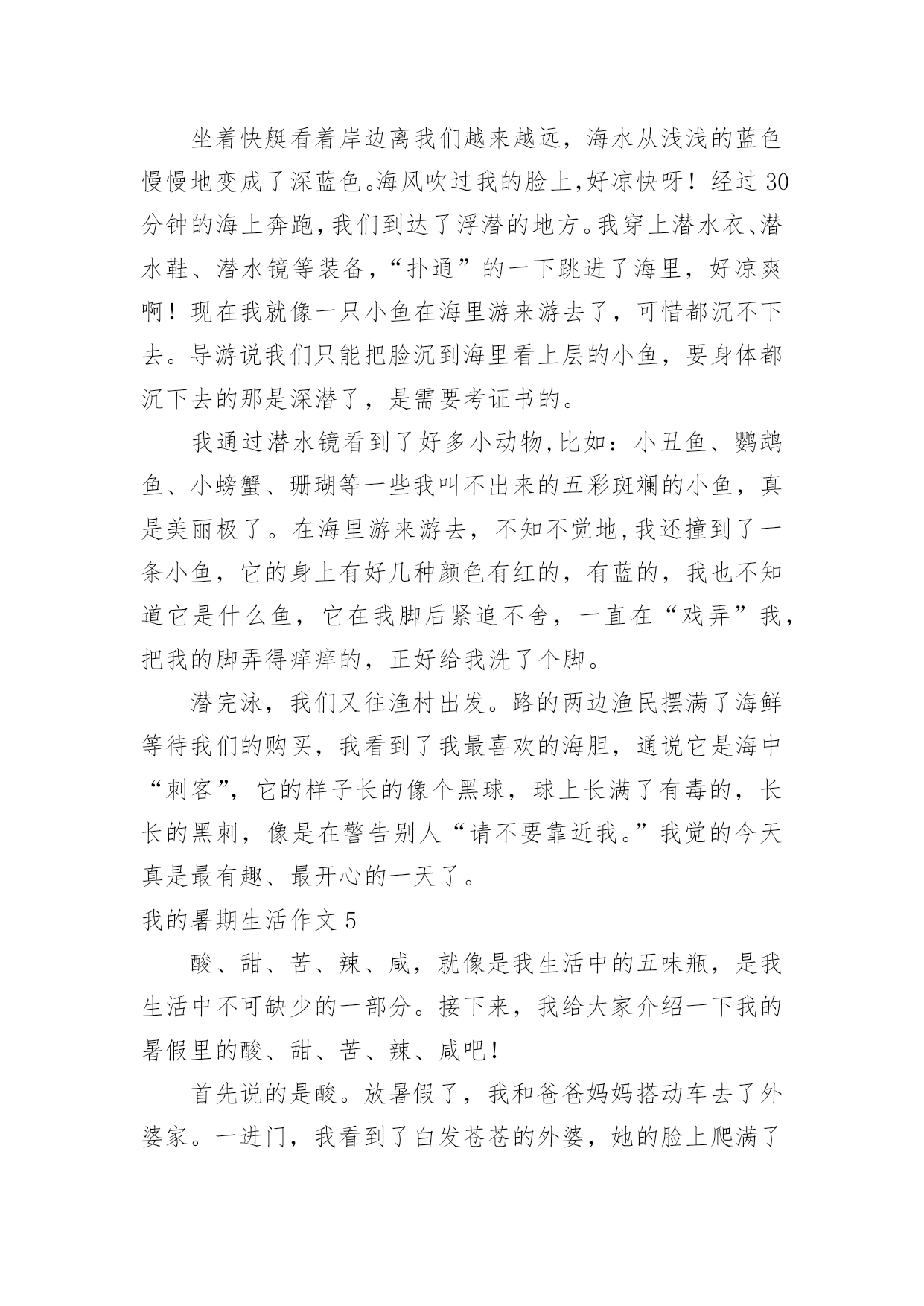 我的暑期生活作文我的暑期生活作文10篇在日常生活或是工作学习中,许多人都有过写作文的经历,对作文都不陌生吧,作文根据体裁的不同可以分为记叙文、说明文、应用文、议论文。相信许多人会觉得作文很难写吧,以下是小编收集整理的我的暑期生活作文,供大家参考借鉴,希望可以帮助到有需要的朋友。我的暑期生活作文1说实话,每一次的假期都是在等待新的“工作”,而等待往往是最漫长的,更何况本就漫长的暑假呢?幸运的是,我找到了可做之事——钓鱼。我会告诉你我钓鱼的过程吗?不,实际也并没有。我要说的是在它之前的过程。这天,我与父亲决定去钓鱼,但我的弟弟坚定地告诉我们,他也要去。如此一来,我的噩梦便开始了。我简单的列举下:早晨,热,弟弟不能去,我们也便作罢。中午,一觉醒来,拉开窗帘,匕首般的阳光刺痛了我的眼,火爆的太阳向世界发泄着它的不爽,却伤了我这钓鱼客的心,百般无奈下,我也只能忍住我“沉痛”的内心,合上双眼,在梦中结束这“残酷”的一天。次日,与往常一般,显得平平淡淡。却令我这个钓鱼客格外兴奋——阴天。于是我们两个大人带着一名小人踏上了征程。半路,天越来越暗,阴郁的仿佛要滴出水来。水?哦,不!这对我这种N流钓鱼客可是极大的打击啊!于是,我暗暗地在心中祈祷上苍千万不要下雨,即使下小些也好。老天或许听到了我的心声,雨还下得很小。我便在心中感谢上苍。也不知是否说错了话,一道惊雷劈下,带着浓浓的天地之威,也许是为我的过多干涉而定罪。随即大雨滂沱,仿佛云中的一位巨人在发泄着他的不满,在这不可抗力因素下,我们征程的“幼苗”不幸夭折了。对此我也唯有一声叹息……今日,我再也按捺不住心中的火热,于午时独自一人前往湖边,一路上心情大好,如获大赦。到达目的地后,风如潮水般涌来,刚打开鱼竿准备上鱼钩时,水面泛起点点波纹。我暗叫一声不好。刹那间,大雨倾盆,豆大的雨点砸的我生疼,我连忙提着渔具跑到一棵柳树下给家人的打电话。最终到家时,我像极了一只落水狗,好不倒霉。天公不待我啊!我的暑期生活作文2暑假就要结束了,回想这个丰富的假期,可真让我难忘呀。在写暑假作业之余,爸爸带我去陕西咸阳。咸阳是著名秦、汉两朝古都,古代的秦王朝就建在这里。是古丝绸之路的第一站。西北的羊肉是很好的,羊肉泡馍是当地著名的小吃之一,美味至极,就是稍微咸了一点点……接着我们全家来到南海之滨——珠海。这是一座美丽的城市,空气清新、海风徐徐,绿草如茵、繁花似锦(^.^),在珠海的几天里,我给外婆拜寿,跟那边许多的表姐弟们玩耍,最令我难忘的还是“真功夫”,这是一家以清蒸为主的饮食餐厅,它摈弃了那些油炸、爆炒等不健康的烹饪方式,发扬了中国传统的、优良的饮食文化。既美味又健康!虽然南京也有“真功夫”的连锁店,但是味道和菜单都远不如正版“真功夫”的优良,我常想,同样的店名,里面食物的味道为什么却相差十万八千里呢?八月份,我们全家又到了青岛,这也是一座海滨城市,这里的海水更蓝,海鲜的味道也更加的鲜美。我不仅乘坐了双层游艇出海,还亲身经历了令人终身难忘的“啤酒节”。这里简直就是人的海洋、美食的海洋、车的海洋、啤酒的海洋。我看到各种各样的啤酒,有绿啤、黑啤、原液啤和黄啤,看得我眼花缭乱,真让我长见识啊!\(^o^)/旅游让我长见识,学本领让我更快乐,我在家里学习做家务,拖地、擦桌子、洗碗、煮饭、做凉拌菜,以后,即便爸妈不在家,我也可以自己照顾好自己了。我还学会了游泳和打乒乓球呢!这个暑期生活实在是太丰富了!我的暑期生活作文3我的暑期生活丰富多彩,除了假期作业以外,还有很多事情,比如:画画、打乒乓球、打羽毛球、练钢笔字、练习滑板车……。偶尔爸爸妈妈还带我去铜川周边的景点逛逛。妈妈说“字”代表每个人的门面,所以说这门功课我做的非常认真;滑板车可以让人掌握平衡,所以也是我每天必修的功课。我很喜欢画画,所以我每天必画一幅画,把我当天生活的点滴都记录到画里,就算是暑期过去了,但每当看到画时,我都非常开心。我也喜欢打乒乓球,因为不仅可以锻炼眼力,提高我的反应能力,而且乒乓球也是我国的国球。我最不喜欢的就是打羽毛球,尤其是在炎热的夏天,因为天气太热了,再加上还要跑来跑去,打不了一会儿我就会满头大汗,满脸通红非常累,可是没办法,妈妈每天吃完晚餐就催我下去打羽毛球,说我有点胖让我减肥,这就是我可爱的妈妈!不过时间一长我也就慢慢习惯了,适应了,我的球技也取得了一点点小成绩哟!说起外出游玩我也是特别兴奋,由于爸爸妈妈暑期一直都在工作,所以临近开学前期,爸爸妈妈才抽出时间带我到铜川周边的小景点逛了逛,白鹿原影城的景色和小吃让我回味无穷;马咀村的涂鸦村庄和儿童城让我历历在目;石林的玻璃栈道让我现在想起来都有点害怕;林皋水库上划船让我回想起小时候爸爸妈妈带我在人民公园划船的时候的样子;福地湖上坐快艇让我心惊胆战,一句话,玩的太开心了。我的暑期生活就是这样子