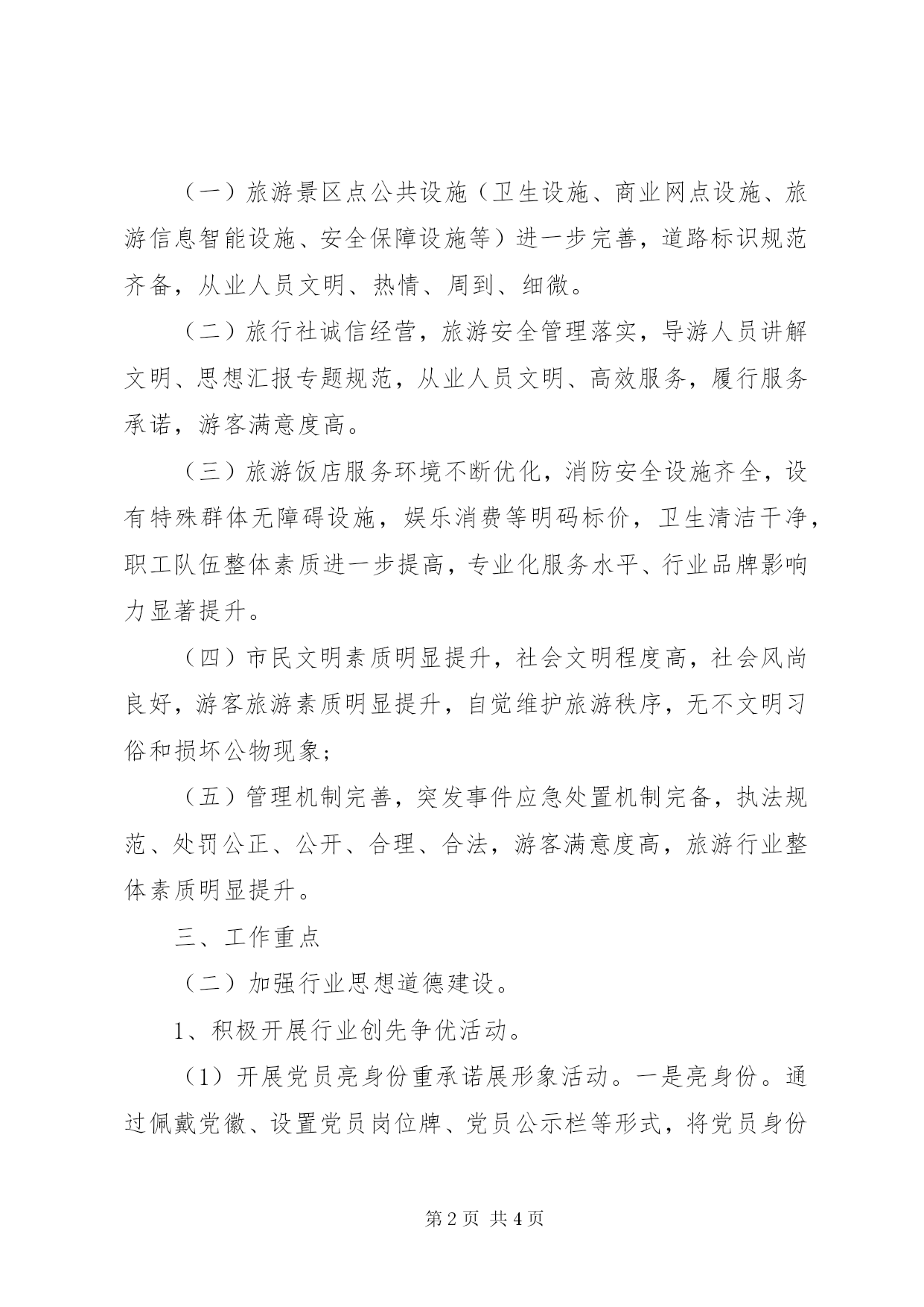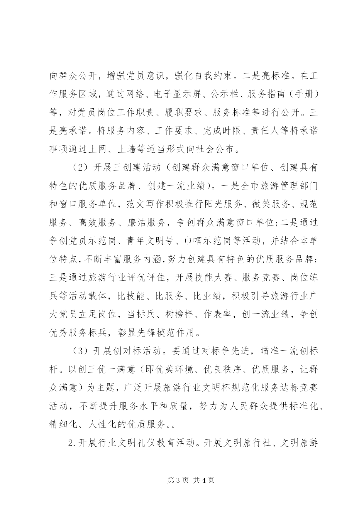 第PAGE\*Arabic\*MERGEFORMAT4页共NUMPAGES\*MERGEFORMAT4页市旅游局文明旅游行动实施方案为深入贯彻落实国家旅游局关于深入开展文明旅游的要求,进一步推进我市文明城市创建工作,提升公民旅游文明素质和城市文明形象,切实解决文明旅游中存在的突出问题,我局决定在全市开展文明旅游行动。结合我市实际,特制定实施方案。一、指导思想以党的十八大、十八届四中、五中、六中全会精神为指导,积极落实《旅游法》和中央文明委《关于进一步加强文明旅游工作的意见》及国家旅游局《关于进一步加强旅游行业文明旅游工作的指导意见》,以培育和践行社会主义核心价值观为主线、以问题为导向,落实游客为本,服务至诚旅游行业核心价值观,按照舆论先行、全民参与、依法治理、整体推进的工作思路,通过宣传教育、文明引导、监督管理等措施,提升公民旅游文明素质和旅游行业文明程度,使旅游行业中不文明行为得到有效治理,在全市形成文明旅游、和谐出行的良好环境,促进我市旅游业健康、文明、有序发展,为创建全省文明城市作出新的贡献。二、工作目标在旅游行业创先争优活动的基础上,加大旅游环境综合治理力度,积极引导旅游从业人员、全市公民和广大游客自觉遵守社会公德、维护旅游市场秩序,革除不文明行为,努力在安丘形成旅游文明出行和谐有序的市场环境。(一)旅游景区点公共设施(卫生设施、商业网点设施、旅游信息智能设施、安全保障设施等)进一步完善,道路标识规范齐备,从业人员文明、热情、周到、细微。(二)旅行社诚信经营,旅游安全管理落实,导游人员讲解文明、思想汇报专题规范,从业人员文明、高效服务,履行服务承诺,游客满意度高。(三)旅游饭店服务环境不断优化,消防安全设施齐全,设有特殊群体无障碍设施,娱乐消费等明码标价,卫生清洁干净,职工队伍整体素质进一步提高,专业化服务水平、行业品牌影响力显著提升。(四)市民文明素质明显提升,社会文明程度高,社会风尚良好,游客旅游素质明显提升,自觉维护旅游秩序,无不文明习俗和损坏公物现象;(五)管理机制完善,突发事件应急处置机制完备,执法规范、处罚公正、公开、合理、合法,游客满意度高,旅游行业整体素质明显提升。三、工作重点(二)加强行业思想道德建设。1、积极开展行业创先争优活动。(1)开展党员亮身份重承诺展形象活动。一是亮身份。通过佩戴党徽、设置党员岗位牌、党员公示栏等形式,将党员身份向群众公开,增强党员意识,强化自我约束。二是亮标准。在工作服务区域,通过网络、电子显示屏、公示栏、服务指南(手册)等,对党员岗位工作职责、履职要求、服务标准等进行公开。三是亮承诺。将服务内容、工作要求、完成时限、责任人等将承诺事项通过上网、上墙等适当形式向社会公布。(2)开展三创建活动(创建群众满意窗口单位、创建具有特色的优质服务品牌、创建一流业绩)。一是全市旅游管理部门和窗口服务单位,范文写作积极推行阳光服务、微笑服务、规范服务、高效服务、廉洁服务,争创群众满意窗口单位;二是通过争创党员示范岗、青年文明号、巾帼示范岗等活动,并结合本单位特点,不断丰富服务内涵,努力创建具有特色的优质服务品牌;三是通过旅游行业评优评佳,开展技能大赛、服务竞赛、岗位练兵等活动载体,比技能、比服务、比业绩,积极引导旅游行业广大党员立足岗位,当标兵、树榜样、作表率,创一流业绩,争创优秀服务标兵,彰显先锋模范作用。(3)开展创对标活动。要通过对标争先进,瞄准一流创标杆。以创三优一满意(即优美环境、优良秩序、优质服务,让群众满意)为主题,广泛开展旅游行业文明杯规范化服务达标竞赛活动,不断提升服务水平和质量,努力为人民群众提供标准化、精细化、人性化的优质服务。。2.开展行业文明礼仪教育活动。开展文明旅行社、文明旅游饭店、文明景区、文明导游员评比活动。以经营条件状况、从业人员管理、范文top100旅游合同、劳动合同签订情况、安全教育等内容构建测评体系评选文明旅行社;以环境卫生、公共设施、餐饮卫生、从业人员等内容构建测评体系评选文明旅游饭店;以旅游交通、安全保障、标识标牌、环境卫生等内容构建测评体系评选文明旅游景区;以组织导游、领队和讲解员等旅游从业人员进行礼仪知识培训,普及文明礼仪教育、旅游氛围等为内容构建测评体系评选文明旅游风景区。3.开展提升公民文明旅游素质行动。(1)开展文明行动,从我做起网上签名活动。让网民共同做出承诺,自觉践行文明旅游理念