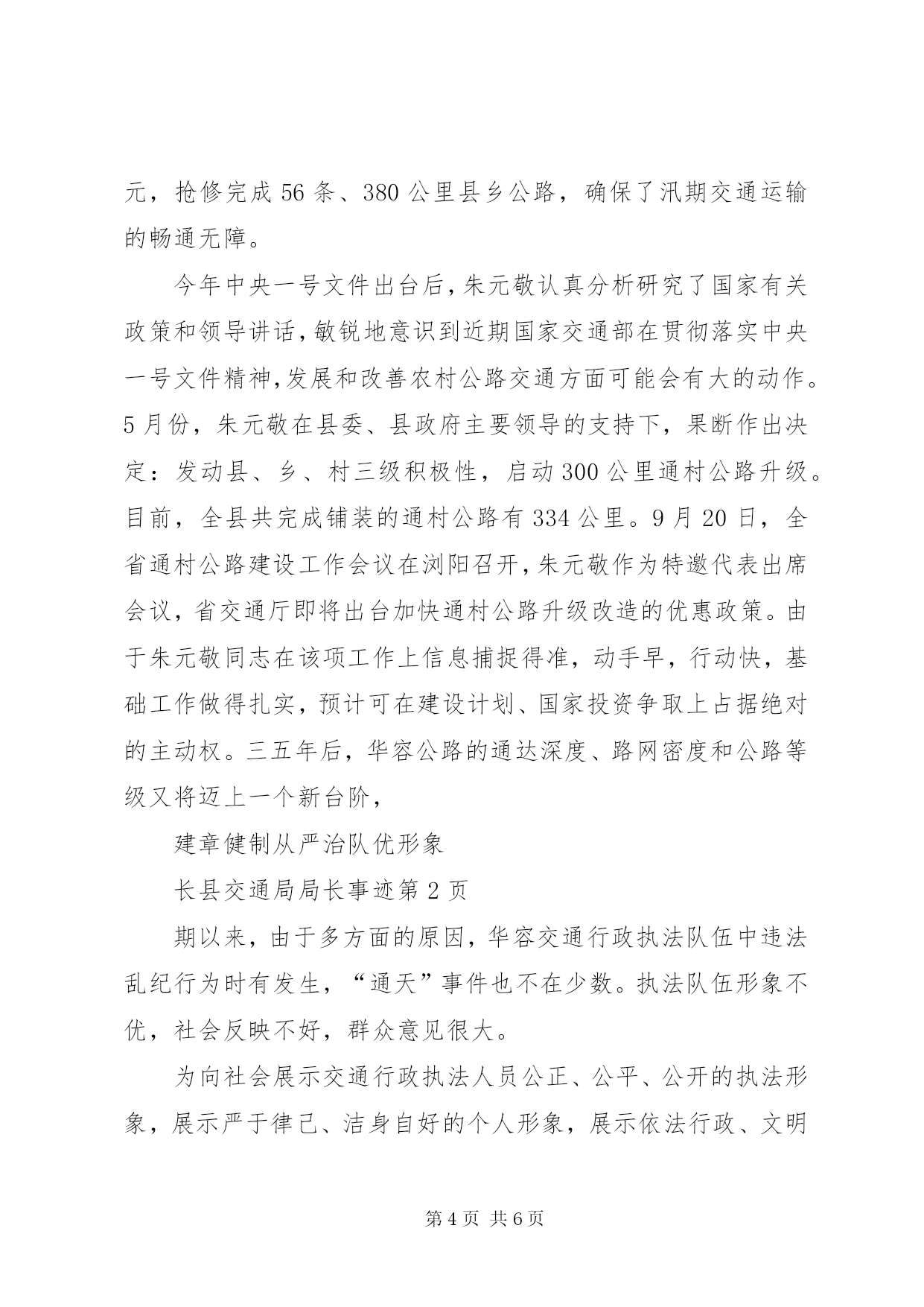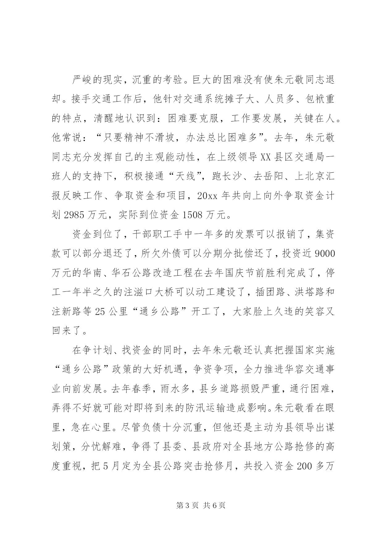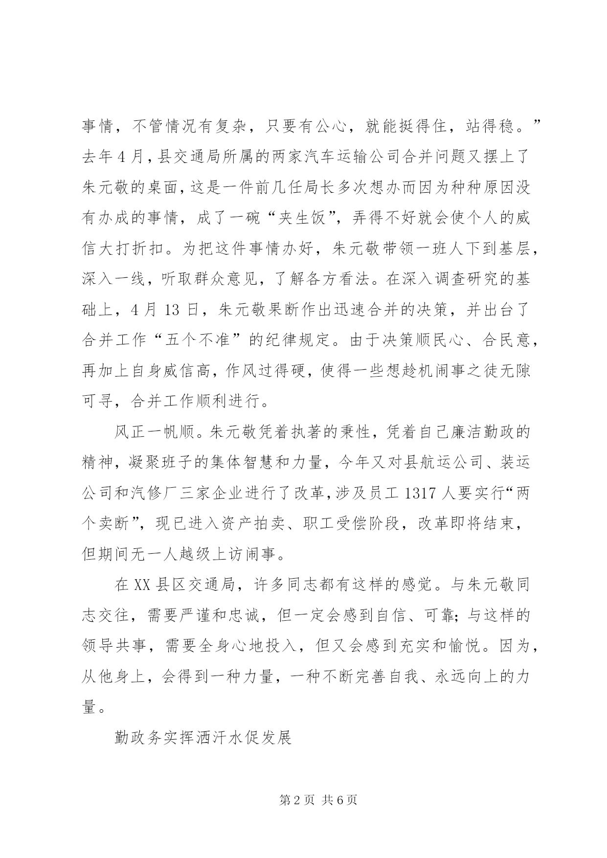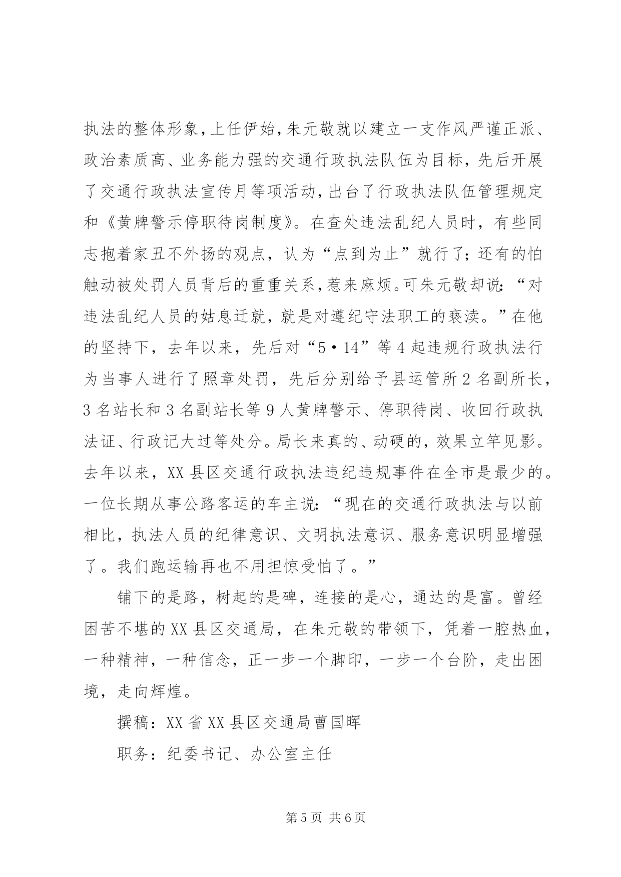 第PAGE\*Arabic\*MERGEFORMAT6页共NUMPAGES\*MERGEFORMAT6页县交通局局长事迹一腔热血铸坦途——记XX县区交通局局长、党委副书记朱元敬20xx年元月,朱元敬走马上XX县区交通局局长、党委副书记时,摆在他面前的是:2859名干部职工人平负债2·14万元,780名在岗人员人平负担2·7名下岗分流、离退休人员的经费支出。局内人心涣散,门外讨债要钱的络绎不绝。面对矛盾和困难,朱元敬时刻铭记着“清正律己、公正待人”的人生信条,用自己无私无畏的胆识和魄力、勤奋忘我的敬业精神和清正廉洁的高尚品格,赢得了干部职工的齐心协力,取得了债主们的理解和支持,开创了交通工作的新局面。严于律己以身作则树标杆作为交通局长,在外人眼里,手握基建工程发包、材料采购、人事安排等“大权”,是一个“肥差”。但在工作中,朱元敬视形象为生命,始终坚持着“立正身子做人,弯下身子做事”的要求。20xx年6月,在新沙洲渡口的接管过程中,他的两名亲戚(原在渡口工作,后调离)想趁机招工进来。当他们满怀信心地找到朱元敬时,没想到被他一口拒绝了。气得这两位亲戚见人就说:“太不讲情面了。”朱元敬上任以来,像这样找他想“沾点光”要工作、要工程的亲戚朋友、老同事、老同学每月都有几批,但他们都是这样乘兴而来,败兴而归。公生明,廉生威。朱元敬常和一班人说。“领导干部做任何事情,不管情况有复杂,只要有公心,就能挺得住,站得稳。”去年4月,县交通局所属的两家汽车运输公司合并问题又摆上了朱元敬的桌面,这是一件前几任局长多次想办而因为种种原因没有办成的事情,成了一碗“夹生饭”,弄得不好就会使个人的威信大打折扣。为把这件事情办好,朱元敬带领一班人下到基层,深入一线,听取群众意见,了解各方看法。在深入调查研究的基础上,4月13日,朱元敬果断作出迅速合并的决策,并出台了合并工作“五个不准”的纪律规定。由于决策顺民心、合民意,再加上自身威信高,作风过得硬,使得一些想趁机闹事之徒无隙可寻,合并工作顺利进行。风正一帆顺。朱元敬凭着执著的秉性,凭着自己廉洁勤政的精神,凝聚班子的集体智慧和力量,今年又对县航运公司、装运公司和汽修厂三家企业进行了改革,涉及员工1317人要实行“两个卖断”,现已进入资产拍卖、职工受偿阶段,改革即将结束,但期间无一人越级上访闹事。在XX县区交通局,许多同志都有这样的感觉。与朱元敬同志交往,需要严谨和忠诚,但一定会感到自信、可靠;与这样的领导共事,需要全身心地投入,但又会感到充实和愉悦。因为,从他身上,会得到一种力量,一种不断完善自我、永远向上的力量。勤政务实挥洒汗水促发展严峻的现实,沉重的考验。巨大的困难没有使朱元敬同志退却。接手交通工作后,他针对交通系统摊子大、人员多、包袱重的特点,清醒地认识到:困难要克服,工作要发展,关键在人。他常说:“只要精神不滑坡,办法总比困难多”。去年,朱元敬同志充分发挥自己的主观能动性,在上级领导XX县区交通局一班人的支持下,积极接通“天线”,跑长沙、去岳阳、上北京汇报反映工作、争取资金和项目,20xx年共向上向外争取资金计划2985万元,实际到位资金1508万元。资金到位了,干部职工手中一年多的发票可以报销了,集资款可以部分退还了,所欠外债可以分期分批偿还了,投资近9000万元的华南、华石公路改造工程在去年国庆节前胜利完成了,停工一年半之久的注滋口大桥可以动工建设了,插团路、洪塔路和注新路等25公里“通乡公路”开工了,大家脸上久违的笑容又回来了。在争计划、找资金的同时,去年朱元敬还认真把握国家实施“通乡公路”政策的大好机遇,争资争项,全力推进华容交通事业向前发展。去年春季,雨水多,县乡道路损毁严重,通行困难,弄得不好就可能对即将到来的防汛运输造成影响。朱元敬看在眼里,急在心里。尽管负债十分沉重,但他还是主动为县领导出谋划策,分忧解难,争得了县委、县政府对全县地方公路抢修的高度重视,把5月定为全县公路突击抢修月,共投入资金200多万元,抢修完成56条、380公里县乡公路,确保了汛期交通运输的畅通无障。今年中央一号文件出台后,朱元敬认真分析研究了国家有关政策和领导讲话,敏锐地意识到近期国家交通部在贯彻落实中央一号文件精神,发展和改善农村公路交通方面可能会有大的动作。5月份,朱元敬在县委、县政府主要领导的支持下,果断作出决定:发动县、乡、村三级积极性,启动300公里通村公路升级。目前,全县共完成铺装的通村公路有334公里。9月20日,全省通村公路建设工作会议在浏阳召开,朱元敬作为特邀代表出席会议,省交通厅即将出台加快通村公路升级改造的优惠政策。由于朱元敬同志在该项工作上信息捕捉得准,动手早,行动快,基础工作做得扎实,预计可在建设计划、国家投资争取上占据绝对的主动权。三五年后,华容公路的通达深度、路