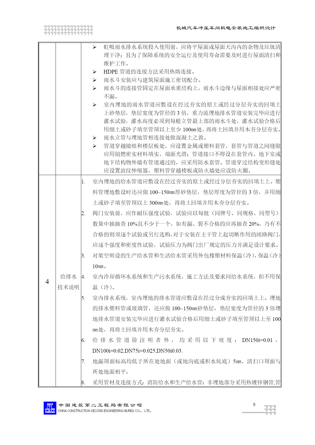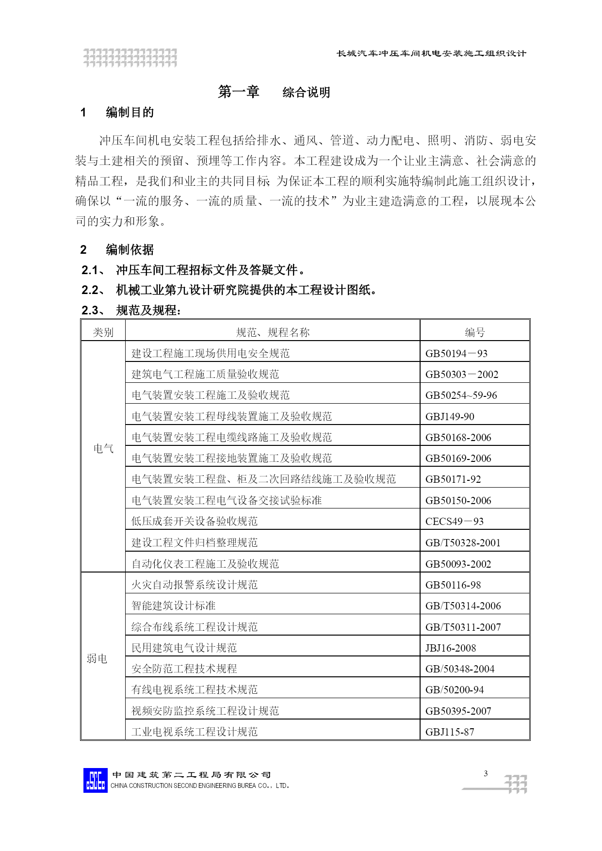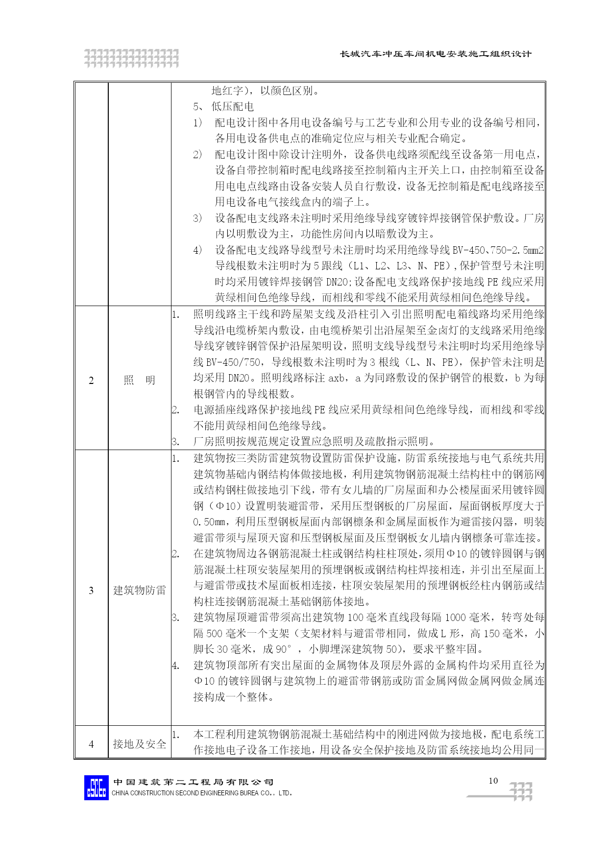 长城汽车冲压车间机电安装施工组织设计PAGEPAGE124中国建筑第二工程局有限公司CHINACONSTRUCTIONSECONDENGINEERINGBUREACO。,LTD。PAGE3TOC\o"1-2"\h\z\uHYPERLINK\l"_Toc244508654"第一章综合说明PAGEREF_Toc244508654\h3HYPERLINK\l"_Toc244508655"1编制目的PAGEREF_Toc244508655\h3HYPERLINK\l"_Toc244508656"2编制依据PAGEREF_Toc244508656\h3HYPERLINK\l"_Toc244508657"3工程总体概述PAGEREF_Toc244508657\h6HYPERLINK\l"_Toc244508658"第二章工程施工重点及难点分析PAGEREF_Toc244508658\h16HYPERLINK\l"_Toc244508659"1设计协调是保证施工顺利进行的重点PAGEREF_Toc244508659\h16HYPERLINK\l"_Toc244508660"2各专业承包商协调难度大PAGEREF_Toc244508660\h16HYPERLINK\l"_Toc244508661"3机电安装复杂PAGEREF_Toc244508661\h16HYPERLINK\l"_Toc244508662"4成品保护PAGEREF_Toc244508662\h16HYPERLINK\l"_Toc244508663"5冬期施工PAGEREF_Toc244508663\h16HYPERLINK\l"_Toc244508664"6应对措施PAGEREF_Toc244508664\h16HYPERLINK\l"_Toc244508665"第三章施工总体部署PAGEREF_Toc244508665\h18HYPERLINK\l"_Toc244508666"1项目总体目标PAGEREF_Toc244508666\h18HYPERLINK\l"_Toc244508667"2项目管理体系与管理制度PAGEREF_Toc244508667\h18HYPERLINK\l"_Toc244508668"3项目管理制度PAGEREF_Toc244508668\h18HYPERLINK\l"_Toc244508669"4工程项目管理组织机构及管理班子主要成员、部门职责PAGEREF_Toc244508669\h20HYPERLINK\l"_Toc244508670"5针对性的施工布署与组织PAGEREF_Toc244508670\h20HYPERLINK\l"_Toc244508671"第四章拟投入施工机械设备及劳动力计划PAGEREF_Toc244508671\h22HYPERLINK\l"_Toc244508672"1机电工程投入施工机械设备情况PAGEREF_Toc244508672\h22HYPERLINK\l"_Toc244508673"2劳动力配置PAGEREF_Toc244508673\h22HYPERLINK\l"_Toc244508674"第五章电气工程PAGEREF_Toc244508674\h23HYPERLINK\l"_Toc244508675"1变压器的安装PAGEREF_Toc244508675\h23HYPERLINK\l"_Toc244508676"2变电室高、低压配电柜安装PAGEREF_Toc244508676\h24HYPERLINK\l"_Toc244508677"3电气管路敷设PAGEREF_Toc244508677\h27HYPERLINK\l"_Toc244508678"4桥架安装PAGEREF_Toc244508678\h32HYPERLINK\l"_Toc244508679"5管内穿线(缆)工程PAGEREF_Toc244508679\h35HYPERLINK\l"_Toc244508680"6电缆敷设PAGEREF_Toc244508680\h38HYPERLINK\l"_Toc24450