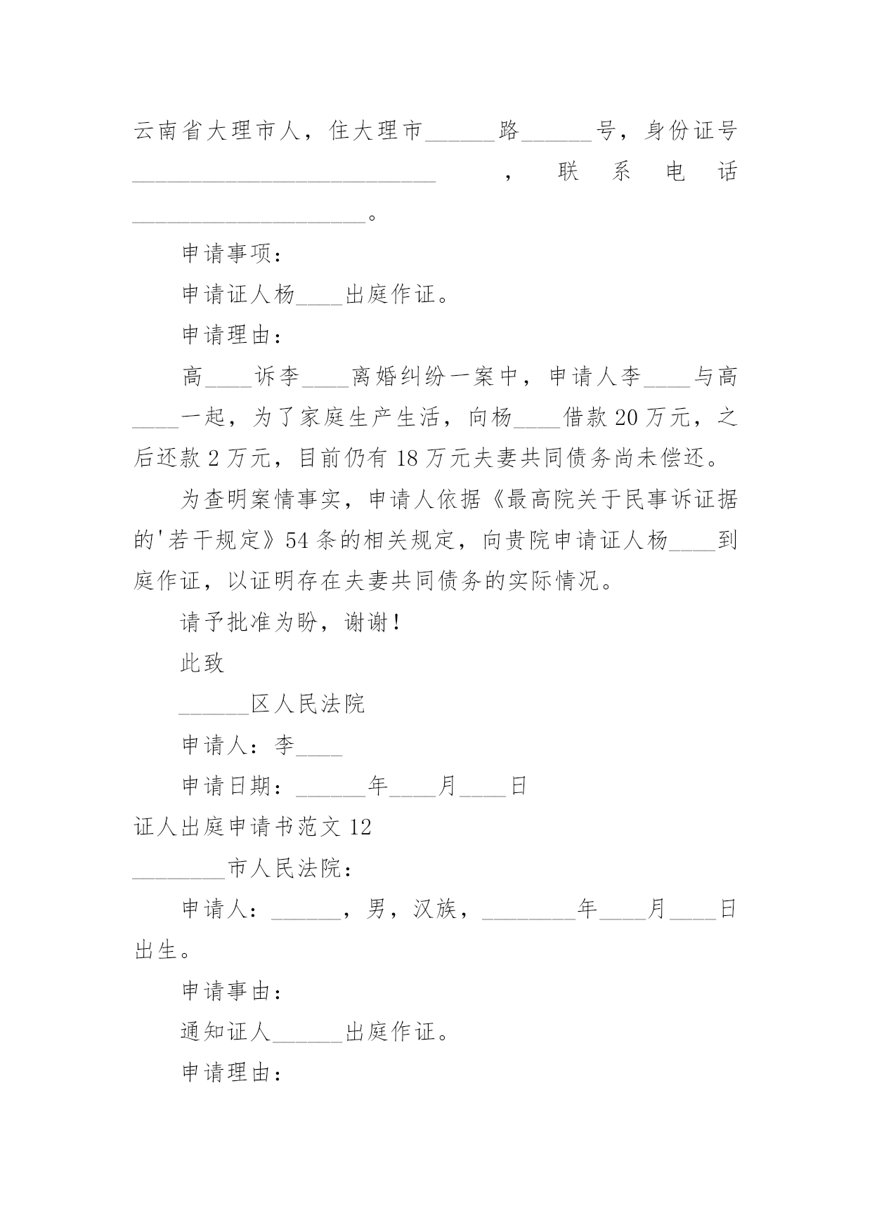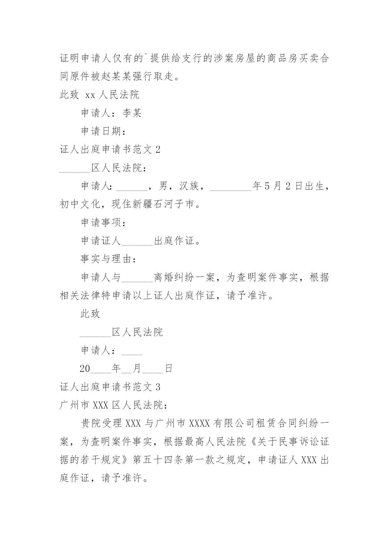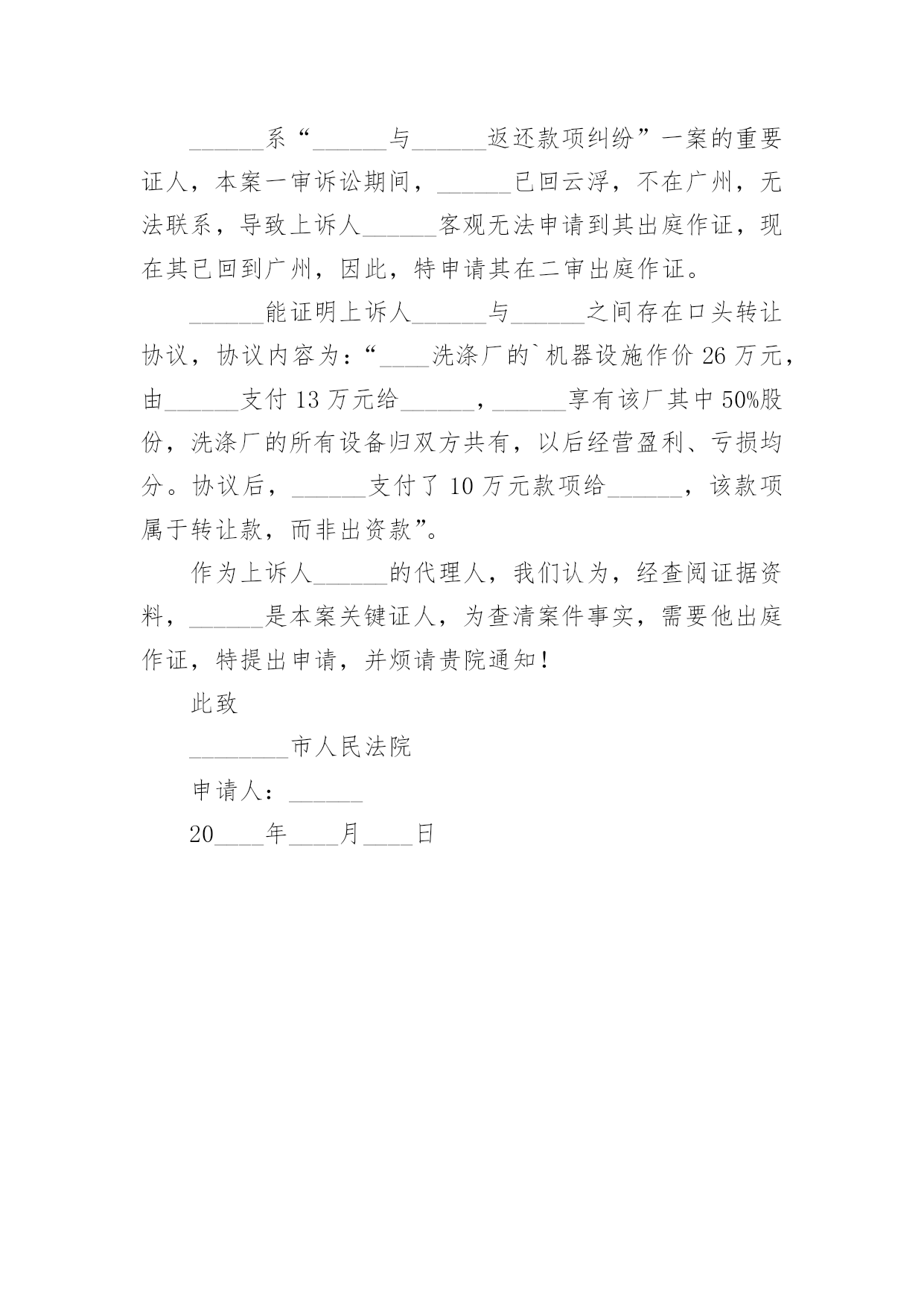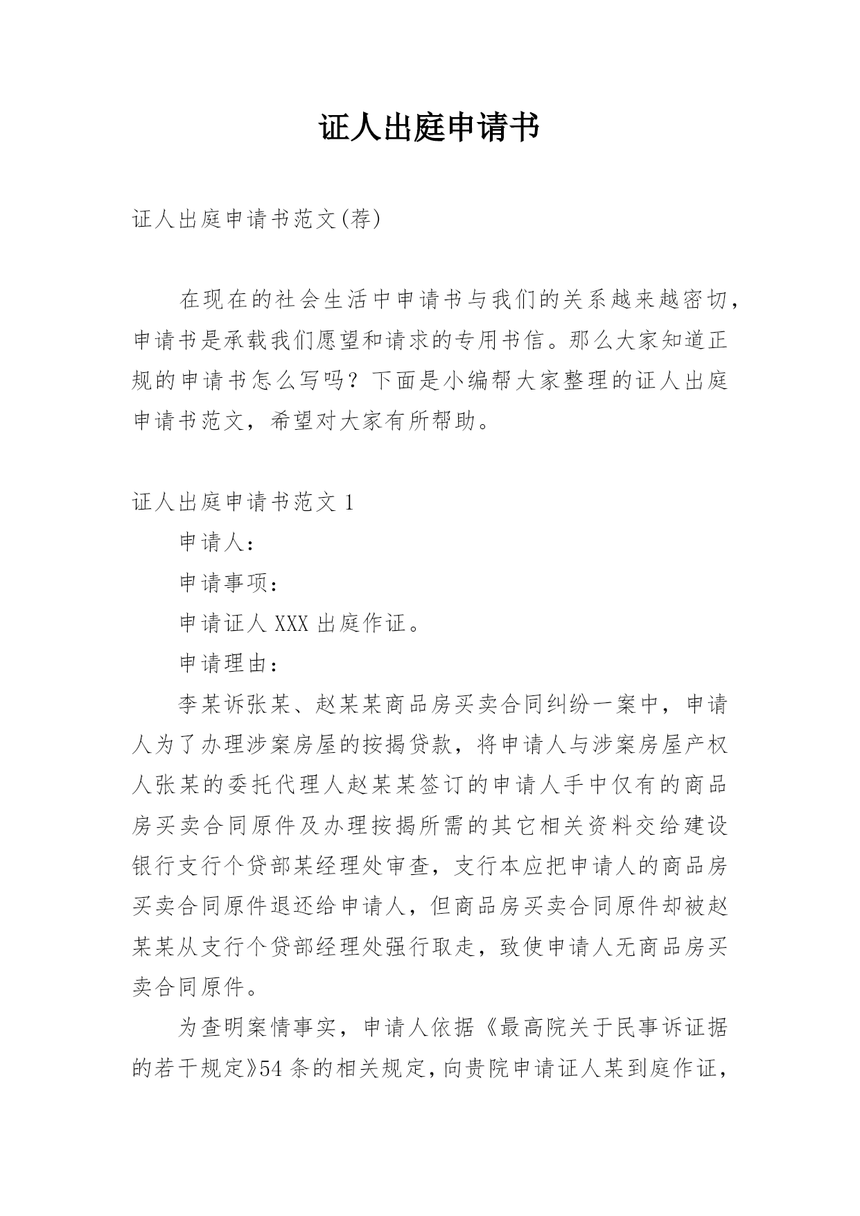 证人出庭申请书证人出庭申请书范文(荐)在现在的社会生活中申请书与我们的关系越来越密切,申请书是承载我们愿望和请求的专用书信。那么大家知道正规的申请书怎么写吗?下面是小编帮大家整理的证人出庭申请书范文,希望对大家有所帮助。证人出庭申请书范文1申请人:申请事项:申请证人XXX出庭作证。申请理由:李某诉张某、赵某某商品房买卖合同纠纷一案中,申请人为了办理涉案房屋的按揭贷款,将申请人与涉案房屋产权人张某的委托代理人赵某某签订的申请人手中仅有的商品房买卖合同原件及办理按揭所需的其它相关资料交给建设银行支行个贷部某经理处审查,支行本应把申请人的商品房买卖合同原件退还给申请人,但商品房买卖合同原件却被赵某某从支行个贷部经理处强行取走,致使申请人无商品房买卖合同原件。为查明案情事实,申请人依据《最高院关于民事诉证据的若干规定》54条的相关规定,向贵院申请证人某到庭作证,证明申请人仅有的`提供给支行的涉案房屋的商品房买卖合同原件被赵某某强行取走。此致xx人民法院申请人:李某申请日期:证人出庭申请书范文2______区人民法院:申请人:______,男,汉族,________年5月2日出生,初中文化,现住新疆石河子市。申请事项:申请证人______出庭作证。事实与理由:申请人与______离婚纠纷一案,为查明案件事实,根据相关法律特申请以上证人出庭作证,请予准许。此致______区人民法院申请人:____20____年__月____日证人出庭申请书范文3广州市XXX区人民法院:贵院受理XXX与广州市XXXX有限公司租赁合同纠纷一案,为查明案件事实,根据最高人民法院《关于民事诉讼证据的若干规定》第五十四条第一款之规定,申请证人XXX出庭作证,请予准许。申请人:xx20xx年xx月xx日证人出庭申请书范文4申请人:______,男,汉族,19____年____月____日出生,现住______________。申请事项:申请证人______出庭作证。事实与理由:申请人与______离婚纠纷一案,为查明案件事实,根据相关法律特申请以上证人出庭作证。请予准许!此致______区人民法院申请人:______20____年____月____日证人出庭申请书范文5申请人:____,联系电话:________案号:____案由:________申请事项:贵会受理申诉人________诉被诉人________仲裁案件。为查清本案事实,维护当事人合法权益,特向贵会申请证人____、____出庭作证,证明如下事实:1、________;2、________申请人(签名或者盖章)申请日期:________年________月________日附证人身份证复印件____份。(劳动争议仲裁申请证人出庭作证用)证人出庭申请书篇2申请人:xxx,女,汉族,xxx年xx月xx日出生,住xx省xx市庐阳区xxx路xxx号x幢xxx室。请求事项:请求贵院依法传唤证人xxx(身份证号:xxx)出庭作证。事实与理由:申请人与xxx买卖合同纠纷案件,贵院已经以(20xx)x民一初字第xxx号案件予以立案。证人xxx了解涉案情况,为查明案件事实,申请人根据《最高人民法院关于民事诉讼证据的若干规定》第五十四条的规定,申请xxx出庭作证,请予以准许。此致xx市庐阳区人民法院申请人:年月日证人出庭申请书范文6广州市xx区人民法院:贵院受理马xx与广州市xx有限公司租赁合同纠纷一案,为查明案件事实,根据最高人民法院《关于民事诉讼证据的若干规定》第五十四条第一款之规定,申请证人XXX出庭作证,请予准许。申请人:xx20xx年xx月xx日证人出庭申请书范文7XXX区人民法院:申请人:xxx,男,汉族,20xx年5月2日出生,初中文化,现住新疆石河子市。申请事项:申请证人xxx出庭作证。事实与理由:申请人与xxx离婚纠纷一案,为查明案件事实,根据相关法律特申请以上证人出庭作证,请予准许。申请人:xx20xx年x月xx日证人出庭申请书范文8申请人:。请求事项请求人民法院依法通知证人______________出庭作证。事实与理由申请人与______纠纷一案,……说明案件事实及申请证人出庭的理由此致人民法院申请人:年月日证人出庭申请书范文9深圳市南山区人民法院:贵院受理王____与冯____离婚纠纷一案,并决定于20____年____月____日开庭审理。为了查明原被告感情彻底破裂、孩子______一直由原告及其父母照顾、夫妻共同债务等事实,原告此前向贵院申请准许______(原告的母亲)和____(被告父母的邻居)出庭作证。为了查明上述事实,原告的`代理律师曾经向______、______、______(原告的小姨)、______(原告的大姨)和______(原告的邻居)等证人进行调查,制作了相应的调查