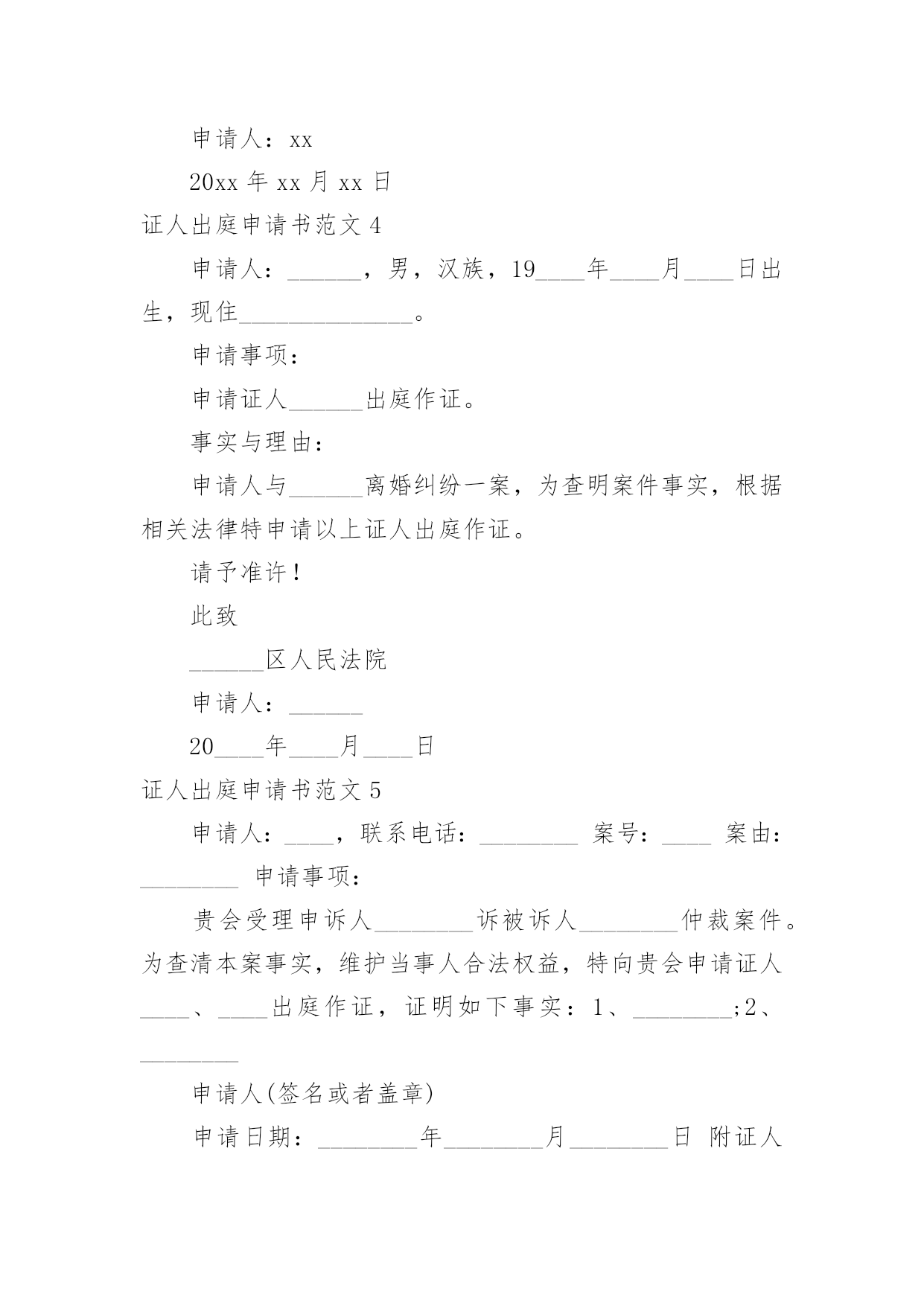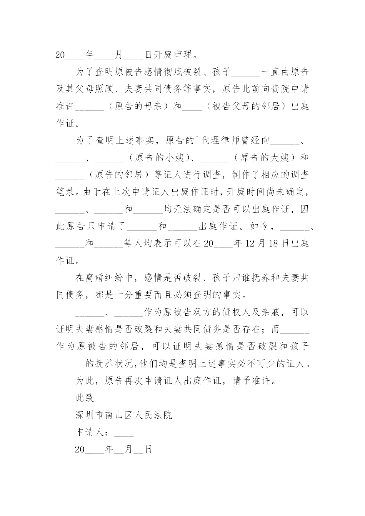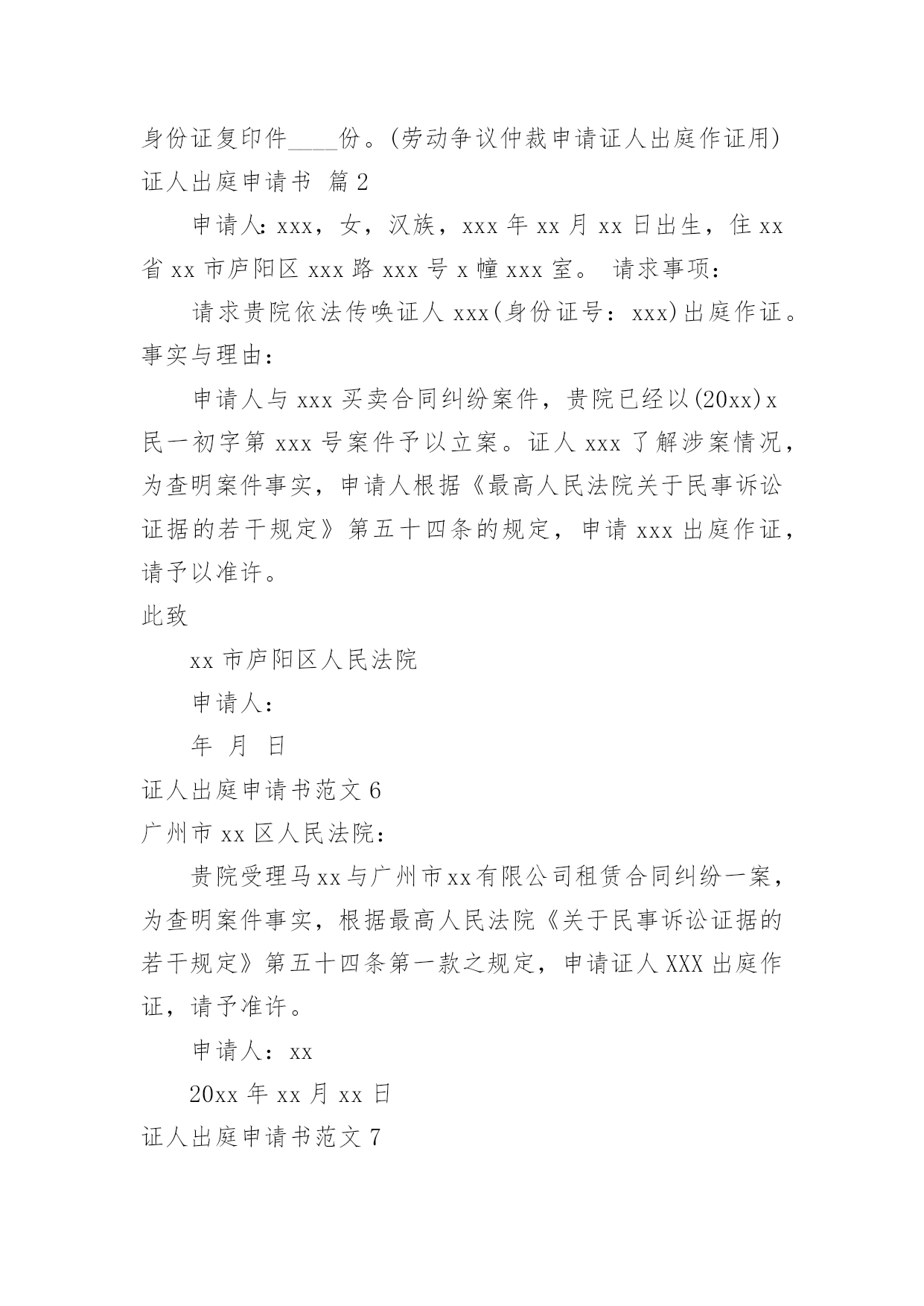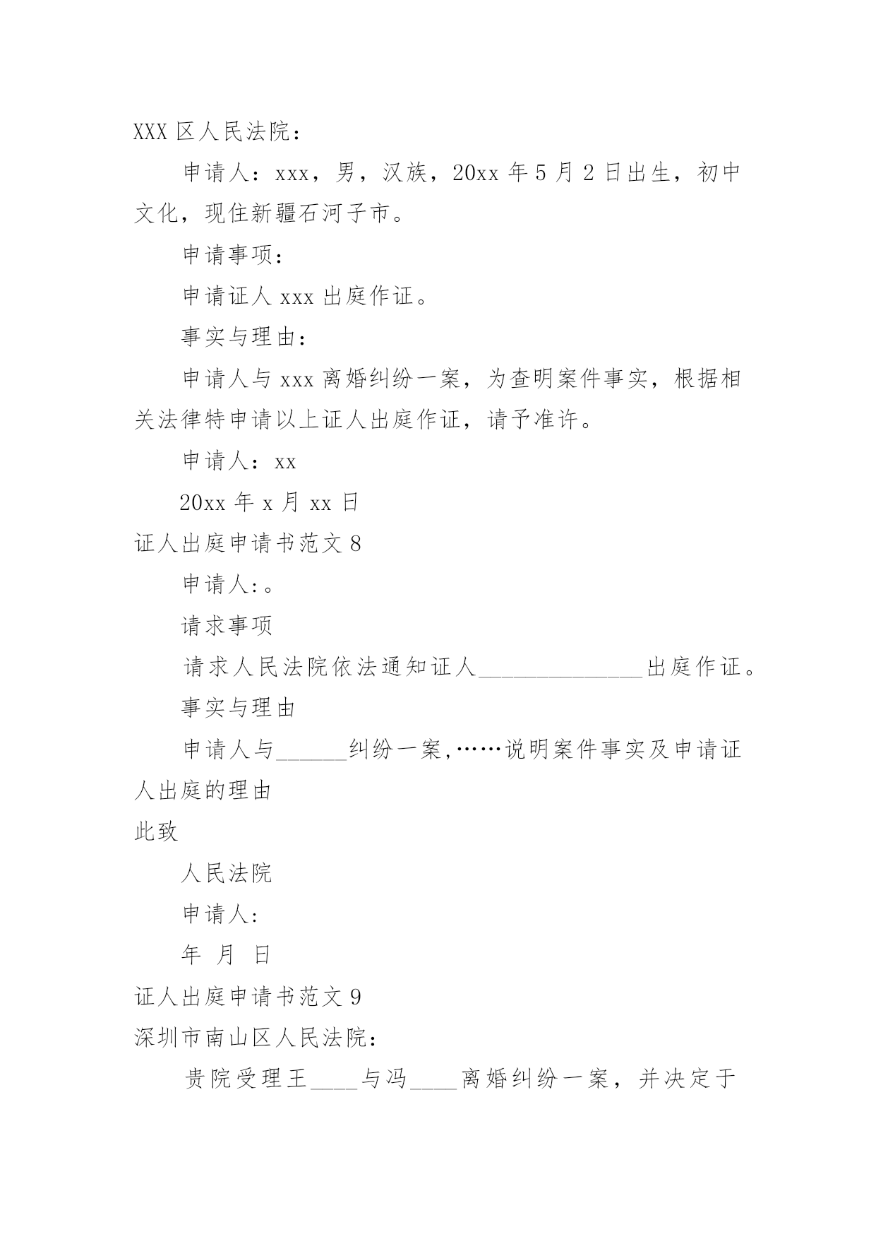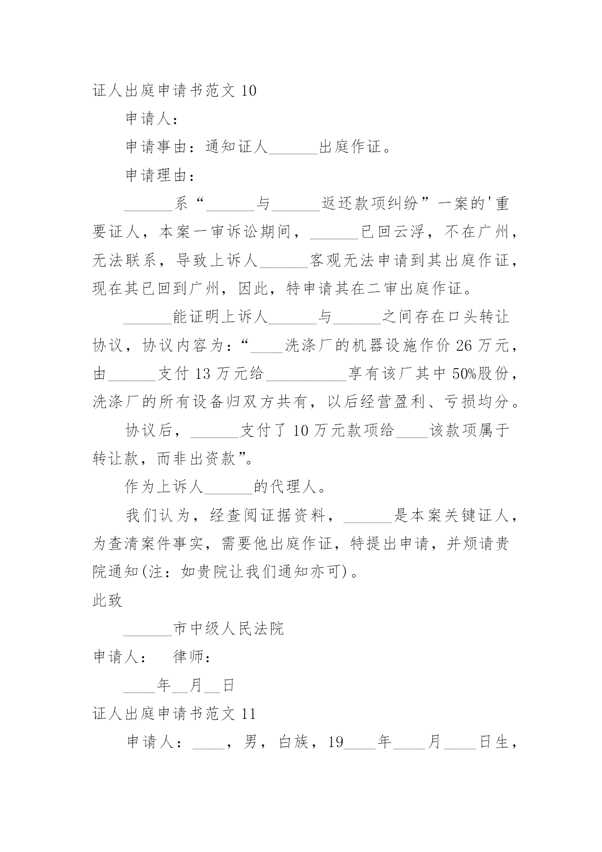 证人出庭申请书证人出庭申请书范文(荐)在现在的社会生活中申请书与我们的关系越来越密切,申请书是承载我们愿望和请求的专用书信。那么大家知道正规的申请书怎么写吗?下面是小编帮大家整理的证人出庭申请书范文,希望对大家有所帮助。证人出庭申请书范文1申请人:申请事项:申请证人XXX出庭作证。申请理由:李某诉张某、赵某某商品房买卖合同纠纷一案中,申请人为了办理涉案房屋的按揭贷款,将申请人与涉案房屋产权人张某的委托代理人赵某某签订的申请人手中仅有的商品房买卖合同原件及办理按揭所需的其它相关资料交给建设银行支行个贷部某经理处审查,支行本应把申请人的商品房买卖合同原件退还给申请人,但商品房买卖合同原件却被赵某某从支行个贷部经理处强行取走,致使申请人无商品房买卖合同原件。为查明案情事实,申请人依据《最高院关于民事诉证据的若干规定》54条的相关规定,向贵院申请证人某到庭作证,证明申请人仅有的`提供给支行的涉案房屋的商品房买卖合同原件被赵某某强行取走。此致xx人民法院申请人:李某申请日期:证人出庭申请书范文2______区人民法院:申请人:______,男,汉族,________年5月2日出生,初中文化,现住新疆石河子市。申请事项:申请证人______出庭作证。事实与理由:申请人与______离婚纠纷一案,为查明案件事实,根据相关法律特申请以上证人出庭作证,请予准许。此致______区人民法院申请人:____20____年__月____日证人出庭申请书范文3广州市XXX区人民法院:贵院受理XXX与广州市XXXX有限公司租赁合同纠纷一案,为查明案件事实,根据最高人民法院《关于民事诉讼证据的若干规定》第五十四条第一款之规定,申请证人XXX出庭作证,请予准许。申请人:xx20xx年xx月xx日证人出庭申请书范文4申请人:______,男,汉族,19____年____月____日出生,现住______________。申请事项:申请证人______出庭作证。事实与理由:申请人与______离婚纠纷一案,为查明案件事实,根据相关法律特申请以上证人出庭作证。请予准许!此致______区人民法院申请人:______20____年____月____日证人出庭申请书范文5申请人:____,联系电话:________案号:____案由:________申请事项:贵会受理申诉人________诉被诉人________仲裁案件。为查清本案事实,维护当事人合法权益,特向贵会申请证人____、____出庭作证,证明如下事实:1、________;2、________申请人(签名或者盖章)申请日期:________年________月________日附证人身份证复印件____份。(劳动争议仲裁申请证人出庭作证用)证人出庭申请书篇2申请人:xxx,女,汉族,xxx年xx月xx日出生,住xx省xx市庐阳区xxx路xxx号x幢xxx室。请求事项:请求贵院依法传唤证人xxx(身份证号:xxx)出庭作证。事实与理由:申请人与xxx买卖合同纠纷案件,贵院已经以(20xx)x民一初字第xxx号案件予以立案。证人xxx了解涉案情况,为查明案件事实,申请人根据《最高人民法院关于民事诉讼证据的若干规定》第五十四条的规定,申请xxx出庭作证,请予以准许。此致xx市庐阳区人民法院申请人:年月日证人出庭申请书范文6广州市xx区人民法院:贵院受理马xx与广州市xx有限公司租赁合同纠纷一案,为查明案件事实,根据最高人民法院《关于民事诉讼证据的若干规定》第五十四条第一款之规定,申请证人XXX出庭作证,请予准许。申请人:xx20xx年xx月xx日证人出庭申请书范文7XXX区人民法院:申请人:xxx,男,汉族,20xx年5月2日出生,初中文化,现住新疆石河子市。申请事项:申请证人xxx出庭作证。事实与理由:申请人与xxx离婚纠纷一案,为查明案件事实,根据相关法律特申请以上证人出庭作证,请予准许。申请人:xx20xx年x月xx日证人出庭申请书范文8申请人:。请求事项请求人民法院依法通知证人______________出庭作证。事实与理由申请人与______纠纷一案,……说明案件事实及申请证人出庭的理由此致人民法院申请人:年月日证人出庭申请书范文9深圳市南山区人民法院:贵院受理王____与冯____离婚纠纷一案,并决定于20____年____月____日开庭审理。为了查明原被告感情彻底破裂、孩子______一直由原告及其父母照顾、夫妻共同债务等事实,原告此前向贵院申请准许______(原告的母亲)和____(被告父母的邻居)出庭作证。为了查明上述事实,原告的`代理律师曾经向______、______、______(原告的小姨)、______(原告的大姨)和______(原告的邻居)等证人进行调查,制作了相应的调查