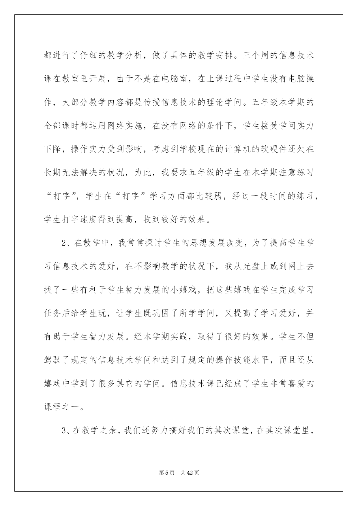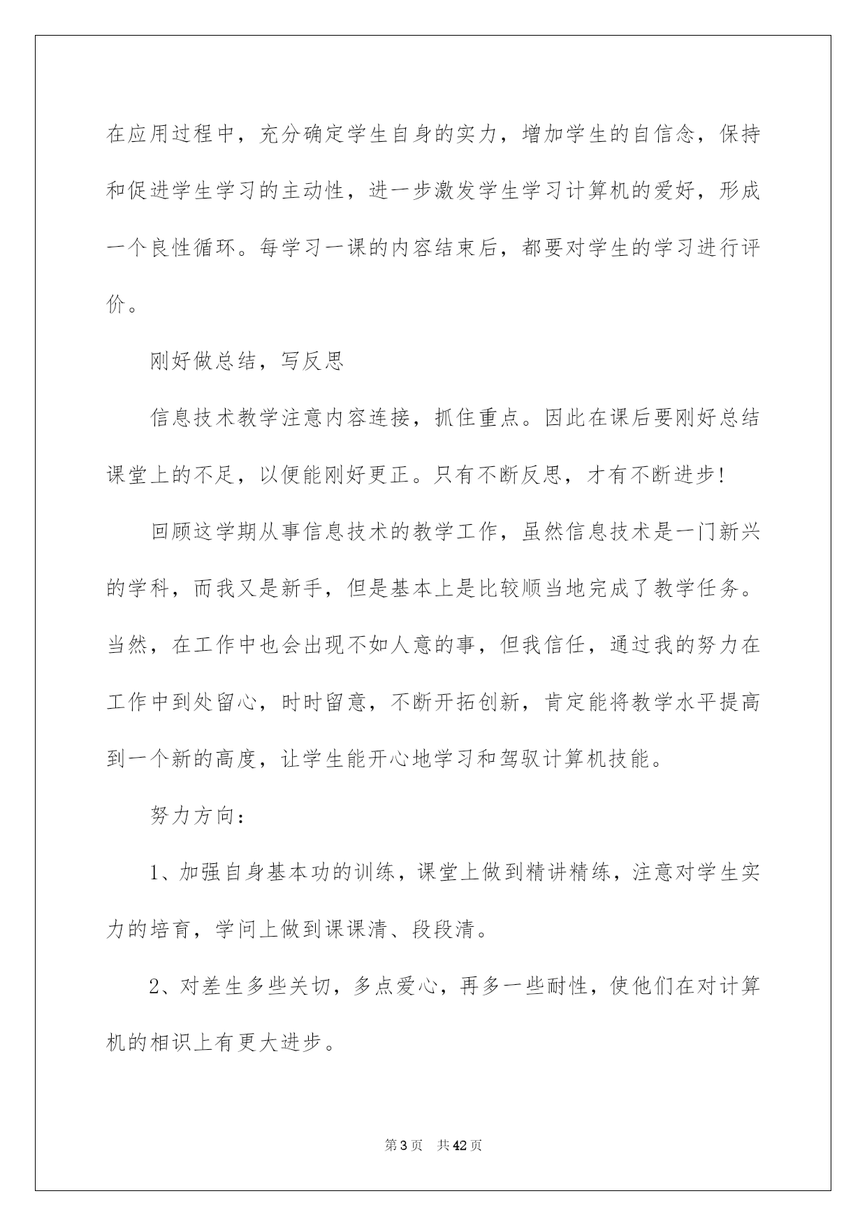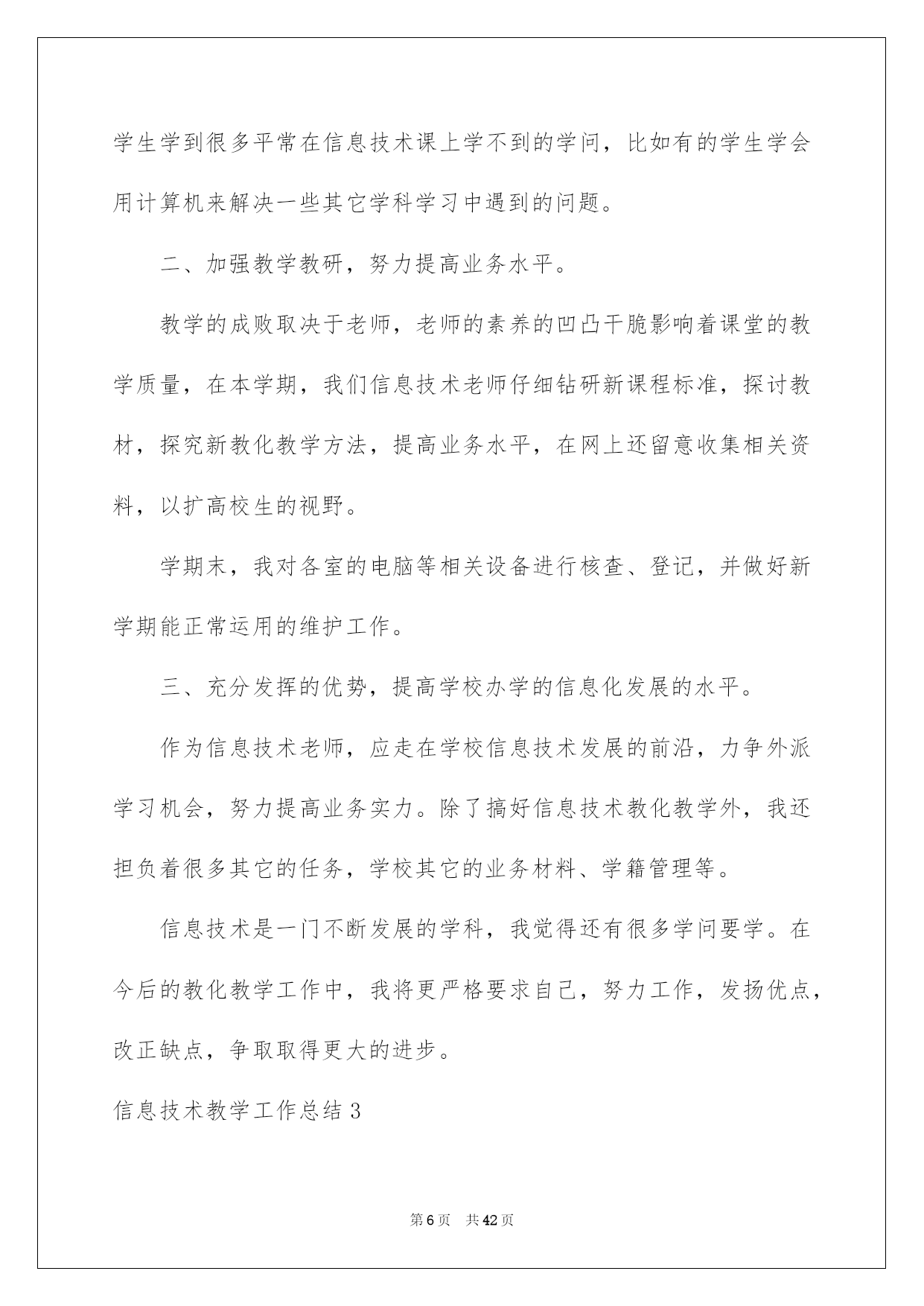 第PAGE\*Arabic\*MERGEFORMAT42页共NUMPAGES\*Arabic\*MERGEFORMAT42页第PAGE\*MERGEFORMAT42页共NUMPAGES\*MERGEFORMAT42页第PAGE\*MERGEFORMAT42页共NUMPAGES\*MERGEFORMAT42页第PAGE\*MERGEFORMAT42页共NUMPAGES\*MERGEFORMAT42页第PAGE\*MERGEFORMAT42页共NUMPAGES\*MERGEFORMAT42页第PAGE\*MERGEFORMAT42页共NUMPAGES\*MERGEFORMAT42页第PAGE\*MERGEFORMAT42页共NUMPAGES\*MERGEFORMAT42页第PAGE\*MERGEFORMAT42页共NUMPAGES\*MERGEFORMAT42页第PAGE\*MERGEFORMAT42页共NUMPAGES\*MERGEFORMAT42页第PAGE\*MERGEFORMAT42页共NUMPAGES\*MERGEFORMAT42页第PAGE\*MERGEFORMAT42页共NUMPAGES\*MERGEFORMAT42页2022信息技术教学工作总结信息技术教学工作总结总结是在某一特定时间段对学习和工作生活或其完成状况,包括取得的成果、存在的问题及得到的阅历和教训加以回顾和分析的书面材料,他能够提升我们的书面表达实力,因此,让我们写一份总结吧。那么我们该怎么去写总结呢?以下是我为大家整理的信息技术教学工作总结,仅供参考,大家一起来看看吧。信息技术教学工作总结1本学期,我担当学校的三、五年级信息技术教学工作。通过教学工作使我深刻地相识到信息技术课程的地位和作用,对信息技术的发展有了正确的相识,它既是基础教化课程改革和发展的须要,又是小学素养教化工程的重要内容。现代社会是信息时代,计算机技术是现20xx小学信息技术教学工作总结20xx小学信息技术教学工作总结代科学技术的基础和核心,是信息社会的主要技术,计算机已经渗透到社会的各个领域,对当代社会产生了重大影响,同时也变更着我们的工作方式、学习方式和生活方式,从而促进人类社会的发展和进步,在当今社会,不驾驭计算机学问和计算机基本技能,是很难在现代信息社会中有效地工作和生活。“计算机的普及要从娃娃抓起”,信息技术教化已成为小学教化中必不行少的科目之一。为了更好的开展小学信息技术教化教学,我深化钻研信息技术教材,查阅大量的书籍,虚心向同行请教,取长补短,不断地提高自己的业务水平。由于客观因素的制约,计算机教室还不能做到一人一机。因此在上机练习中,我们有意识地引导学生相互协作,引导优胜帮助一般学生,一般学生帮助优生,这样培育了学生之间地团结互助地精神,使学生之间地关系更加和谐。现将自己本学期的教学工作作个总结。引入图画,激发学习爱好。三年级的学生对去年学的画图特殊感爱好,而计算机正具有能画画的特点。依据这一特点,可以把计算机新课的学习寓于画画之中,激发学生学习的爱好。在学生深厚的爱好中学习新学问,驾驭新技能。利用学习成果,提高学生的求知欲,在不断地学习中,采纳边学边用的方法,学一点就让学生应用起来,不仅要满意学生的新奇心,还要在应用过程中,充分确定学生自身的实力,增加学生的自信念,保持和促进学生学习的主动性,进一步激发学生学习计算机的爱好,形成一个良性循环。每学习一课的内容结束后,都要对学生的学习进行评价。刚好做总结,写反思信息技术教学注意内容连接,抓住重点。因此在课后要刚好总结课堂上的不足,以便能刚好更正。只有不断反思,才有不断进步!回顾这学期从事信息技术的教学工作,虽然信息技术是一门新兴的学科,而我又是新手,但是基本上是比较顺当地完成了教学任务。当然,在工作中也会出现不如人意的事,但我信任,通过我的努力在工作中到处留心,时时留意,不断开拓创新,肯定能将教学水平提高到一个新的高度,让学生能开心地学习和驾驭计算机技能。努力方向:1、加强自身基本功的训练,课堂上做到精讲精练,注意对学生实力的培育,学问上做到课课清、段段清。2、对差生多些关切,多点爱心,再多一些耐性,使他们在对计算机的相识上有更大进步。3、加强机房纪律和机器运用道德方面的教化,使学生不仅在班级集中留意力学习,在机房上机时也要按规定严格约束自己。4、利用各种方法,训练学生提高、集中留意力。教化工作,是一项常做常新、永无止境的工作。社会在发展,时代在前进,学生的特点和问题也在发生着不断的改变。作为有责任感的教化工作者,必需以高度的敏感性和自觉性,刚好发觉、探讨和解决学生