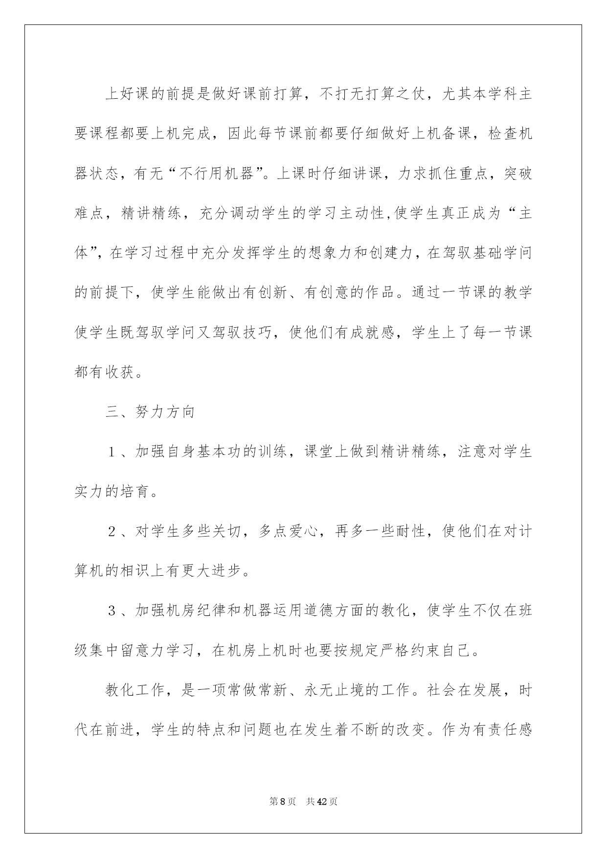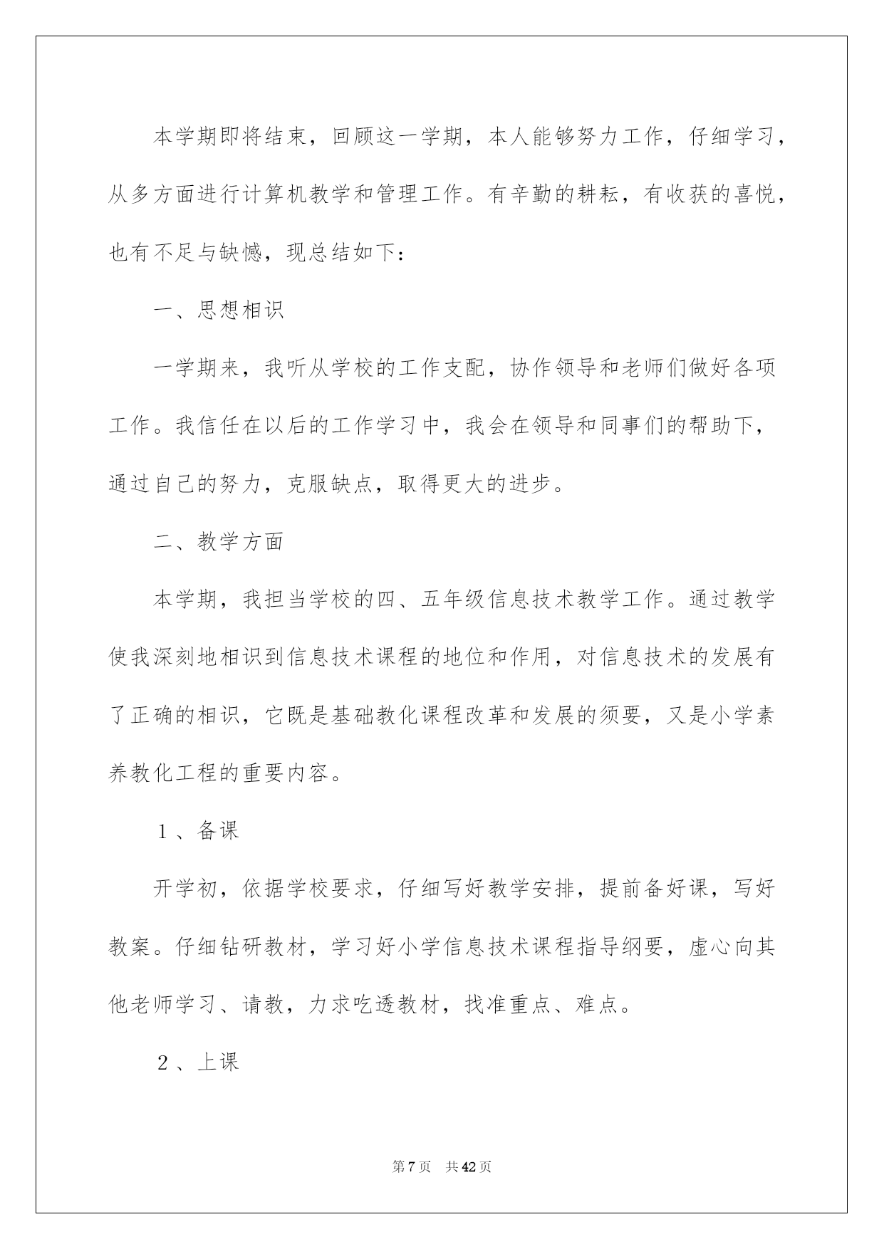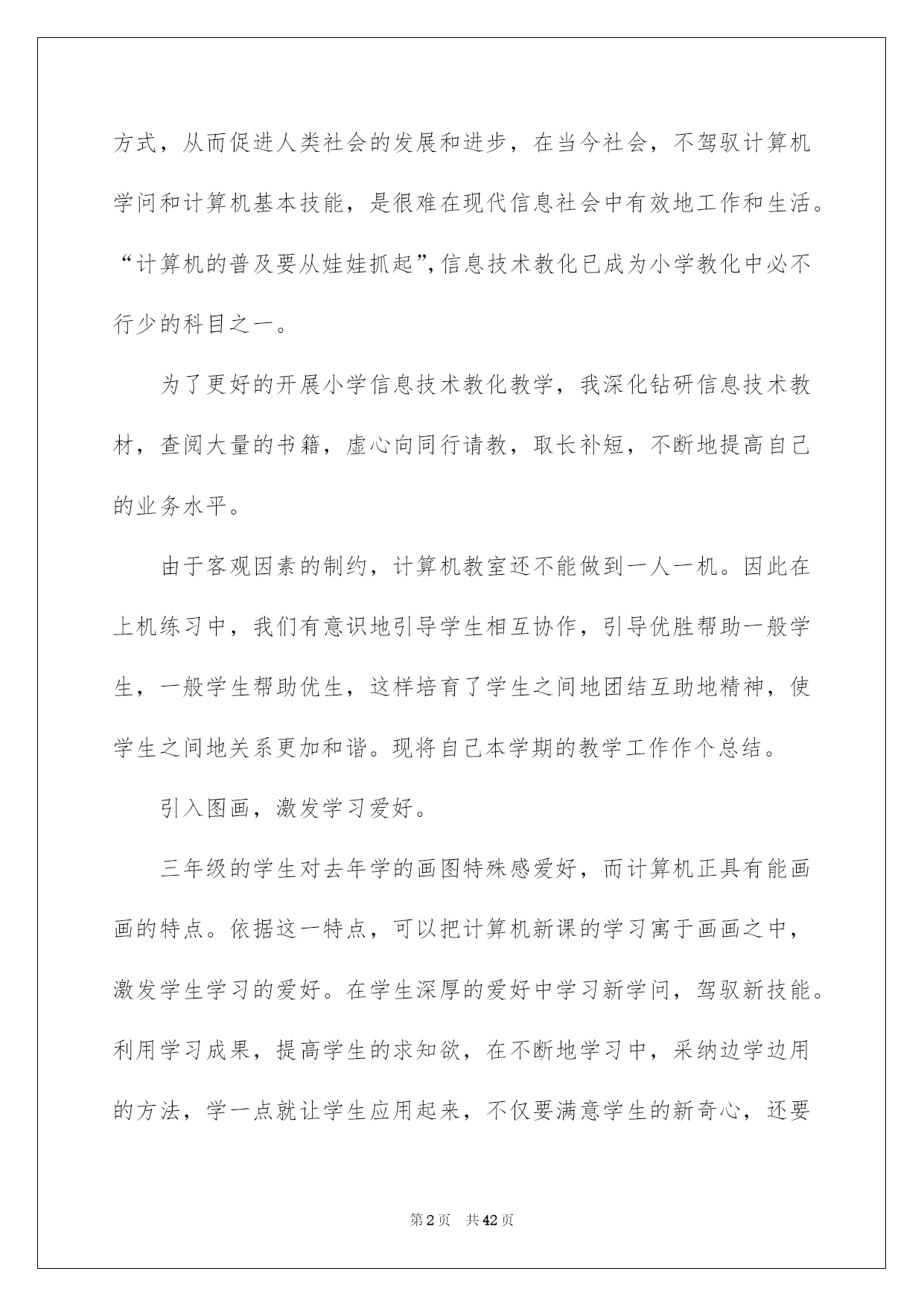 第PAGE\*Arabic\*MERGEFORMAT42页共NUMPAGES\*Arabic\*MERGEFORMAT42页第PAGE\*MERGEFORMAT42页共NUMPAGES\*MERGEFORMAT42页第PAGE\*MERGEFORMAT42页共NUMPAGES\*MERGEFORMAT42页第PAGE\*MERGEFORMAT42页共NUMPAGES\*MERGEFORMAT42页第PAGE\*MERGEFORMAT42页共NUMPAGES\*MERGEFORMAT42页第PAGE\*MERGEFORMAT42页共NUMPAGES\*MERGEFORMAT42页第PAGE\*MERGEFORMAT42页共NUMPAGES\*MERGEFORMAT42页第PAGE\*MERGEFORMAT42页共NUMPAGES\*MERGEFORMAT42页第PAGE\*MERGEFORMAT42页共NUMPAGES\*MERGEFORMAT42页第PAGE\*MERGEFORMAT42页共NUMPAGES\*MERGEFORMAT42页第PAGE\*MERGEFORMAT42页共NUMPAGES\*MERGEFORMAT42页2022信息技术教学工作总结信息技术教学工作总结总结是在某一特定时间段对学习和工作生活或其完成状况,包括取得的成果、存在的问题及得到的阅历和教训加以回顾和分析的书面材料,他能够提升我们的书面表达实力,因此,让我们写一份总结吧。那么我们该怎么去写总结呢?以下是我为大家整理的信息技术教学工作总结,仅供参考,大家一起来看看吧。信息技术教学工作总结1本学期,我担当学校的三、五年级信息技术教学工作。通过教学工作使我深刻地相识到信息技术课程的地位和作用,对信息技术的发展有了正确的相识,它既是基础教化课程改革和发展的须要,又是小学素养教化工程的重要内容。现代社会是信息时代,计算机技术是现20xx小学信息技术教学工作总结20xx小学信息技术教学工作总结代科学技术的基础和核心,是信息社会的主要技术,计算机已经渗透到社会的各个领域,对当代社会产生了重大影响,同时也变更着我们的工作方式、学习方式和生活方式,从而促进人类社会的发展和进步,在当今社会,不驾驭计算机学问和计算机基本技能,是很难在现代信息社会中有效地工作和生活。“计算机的普及要从娃娃抓起”,信息技术教化已成为小学教化中必不行少的科目之一。为了更好的开展小学信息技术教化教学,我深化钻研信息技术教材,查阅大量的书籍,虚心向同行请教,取长补短,不断地提高自己的业务水平。由于客观因素的制约,计算机教室还不能做到一人一机。因此在上机练习中,我们有意识地引导学生相互协作,引导优胜帮助一般学生,一般学生帮助优生,这样培育了学生之间地团结互助地精神,使学生之间地关系更加和谐。现将自己本学期的教学工作作个总结。引入图画,激发学习爱好。三年级的学生对去年学的画图特殊感爱好,而计算机正具有能画画的特点。依据这一特点,可以把计算机新课的学习寓于画画之中,激发学生学习的爱好。在学生深厚的爱好中学习新学问,驾驭新技能。利用学习成果,提高学生的求知欲,在不断地学习中,采纳边学边用的方法,学一点就让学生应用起来,不仅要满意学生的新奇心,还要在应用过程中,充分确定学生自身的实力,增加学生的自信念,保持和促进学生学习的主动性,进一步激发学生学习计算机的爱好,形成一个良性循环。每学习一课的内容结束后,都要对学生的学习进行评价。刚好做总结,写反思信息技术教学注意内容连接,抓住重点。因此在课后要刚好总结课堂上的不足,以便能刚好更正。只有不断反思,才有不断进步!回顾这学期从事信息技术的教学工作,虽然信息技术是一门新兴的学科,而我又是新手,但是基本上是比较顺当地完成了教学任务。当然,在工作中也会出现不如人意的事,但我信任,通过我的努力在工作中到处留心,时时留意,不断开拓创新,肯定能将教学水平提高到一个新的高度,让学生能开心地学习和驾驭计算机技能。努力方向:1、加强自身基本功的训练,课堂上做到精讲精练,注意对学生实力的培育,学问上做到课课清、段段清。2、对差生多些关切,多点爱心,再多一些耐性,使他们在对计算机的相识上有更大进步。3、加强机房纪律和机器运用道德方面的教化,使学生不仅在班级集中留意力学习,在机房上机时也要按规定严格约束自己。4、利用各种方法,训练学生提高、集中留意力。教化工作,是一项常做常新、永无止境的工作。社会在发展,时代在前进,学生的特点和问题也在发生着不断的改变。作为有责任感的教化工作者,必需以高度的敏感性和自觉性,刚好发觉、探讨和解决学生