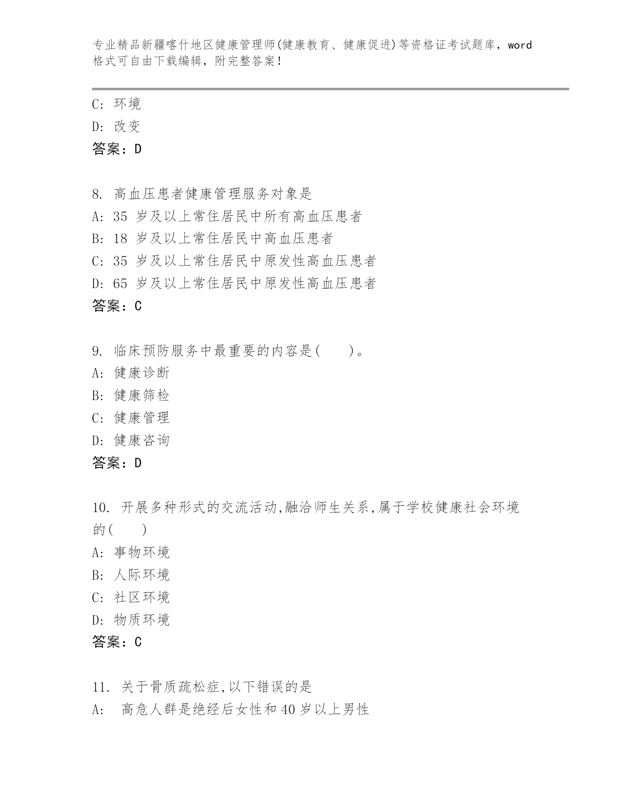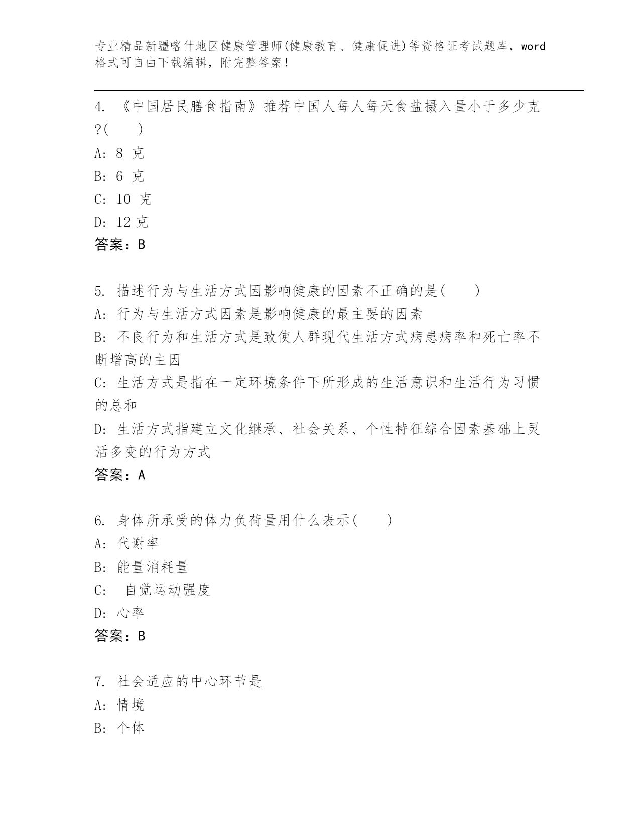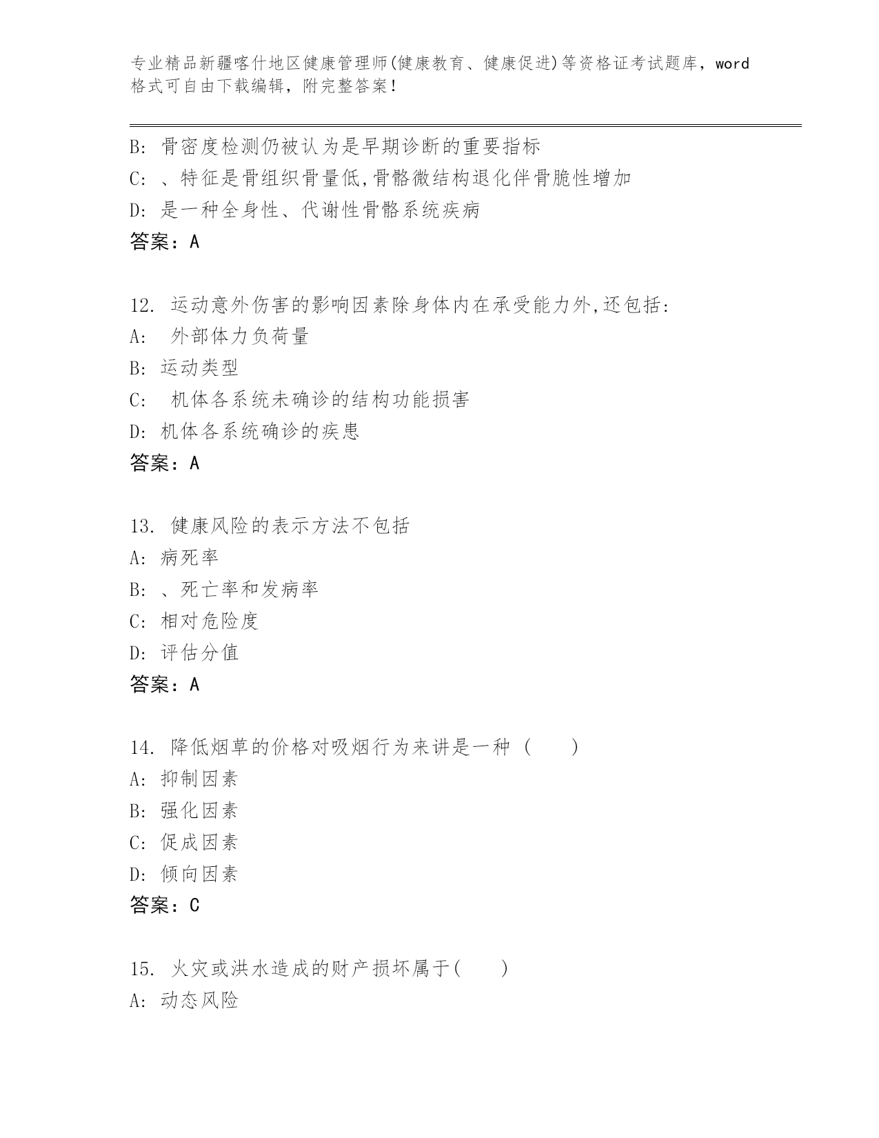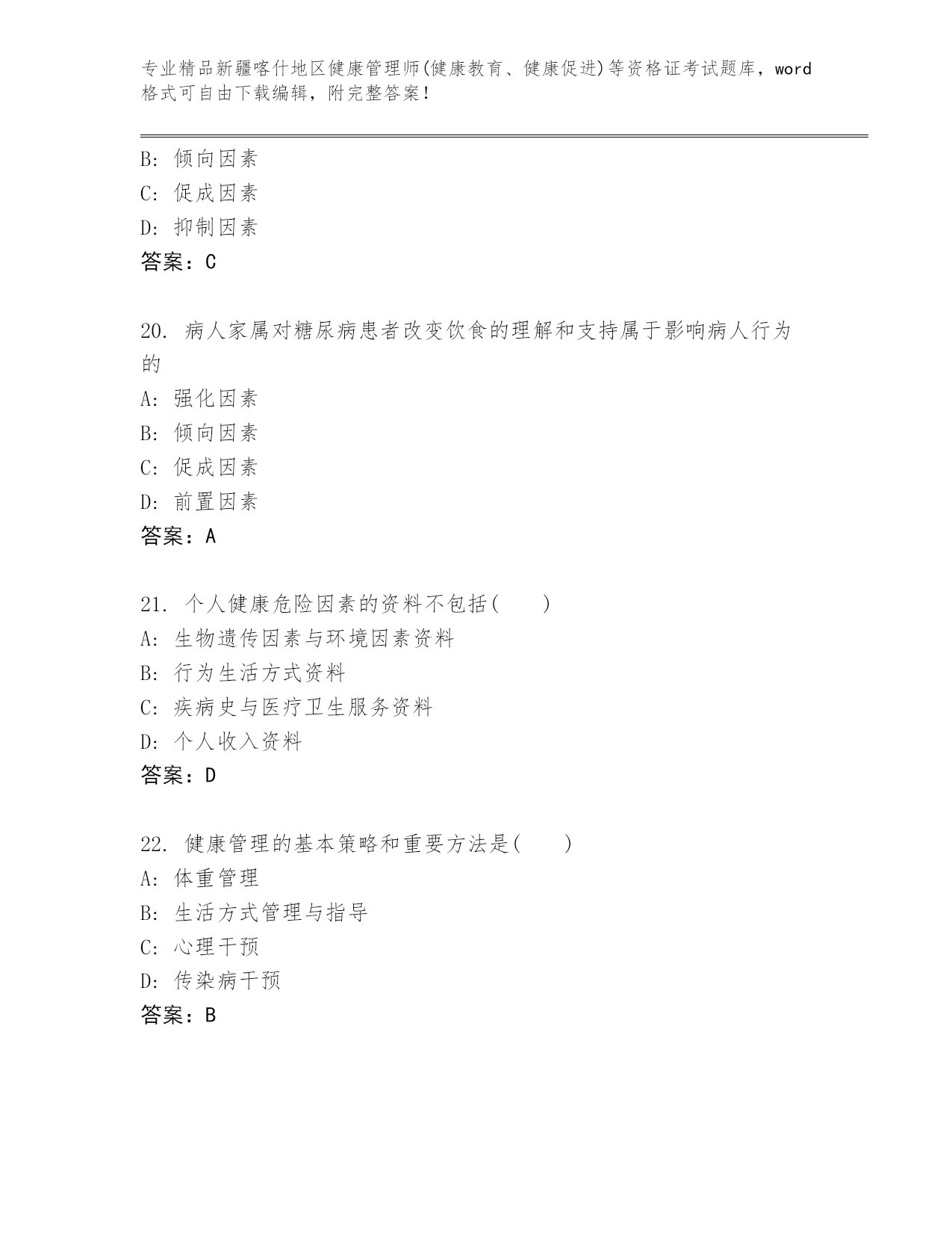 优选新疆喀什地区健康管理师(健康教育、健康促进)等资格证考试完整题库【巩固】