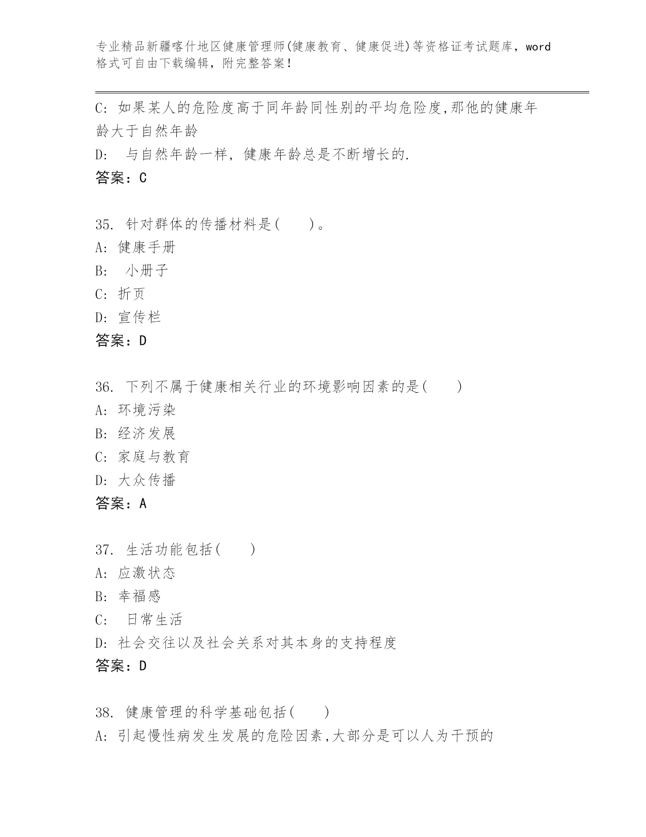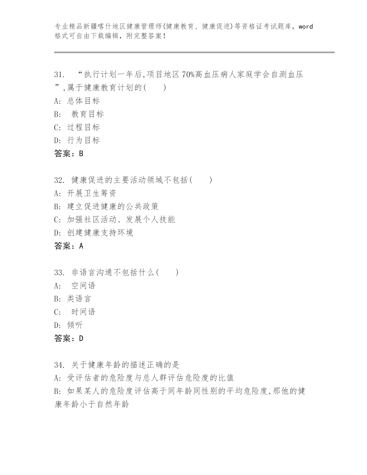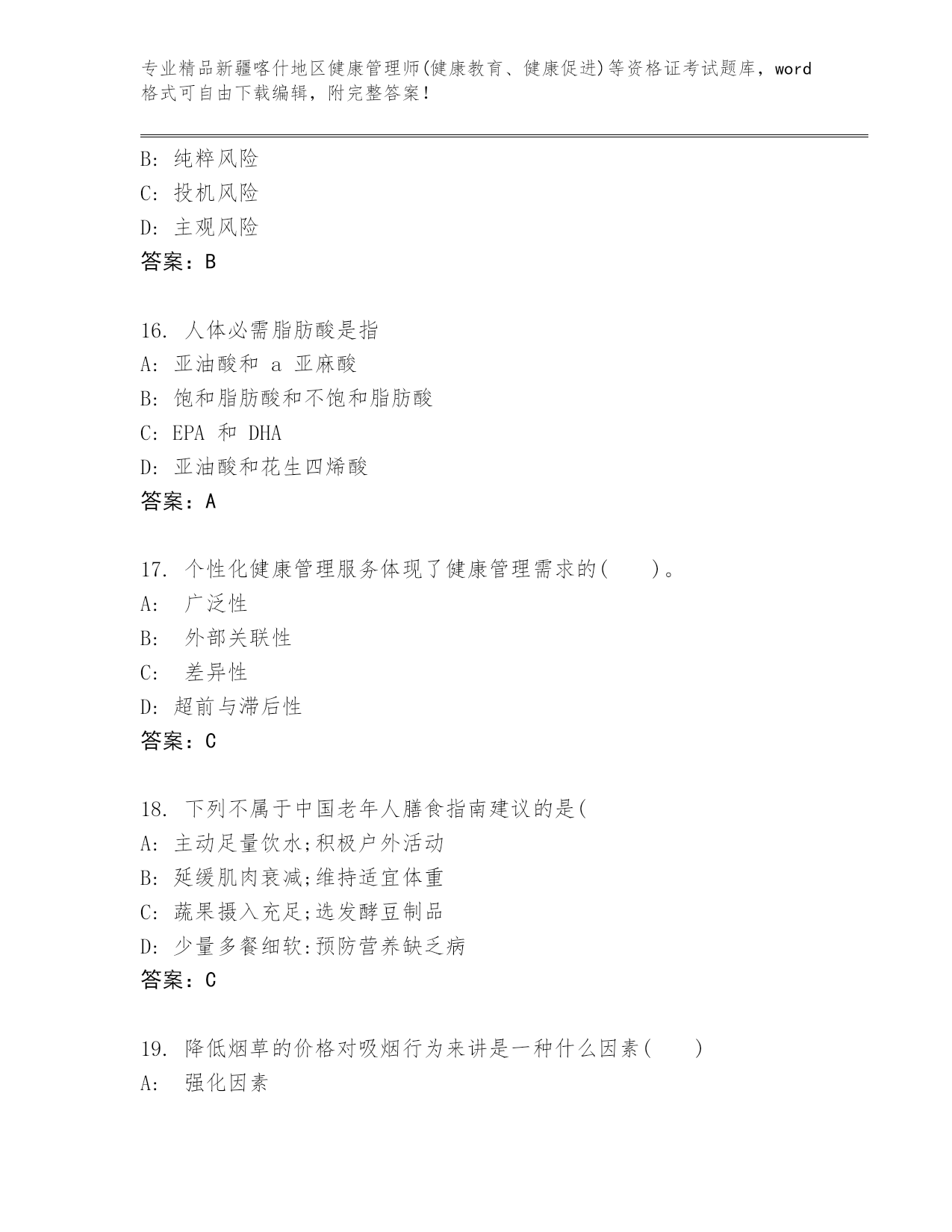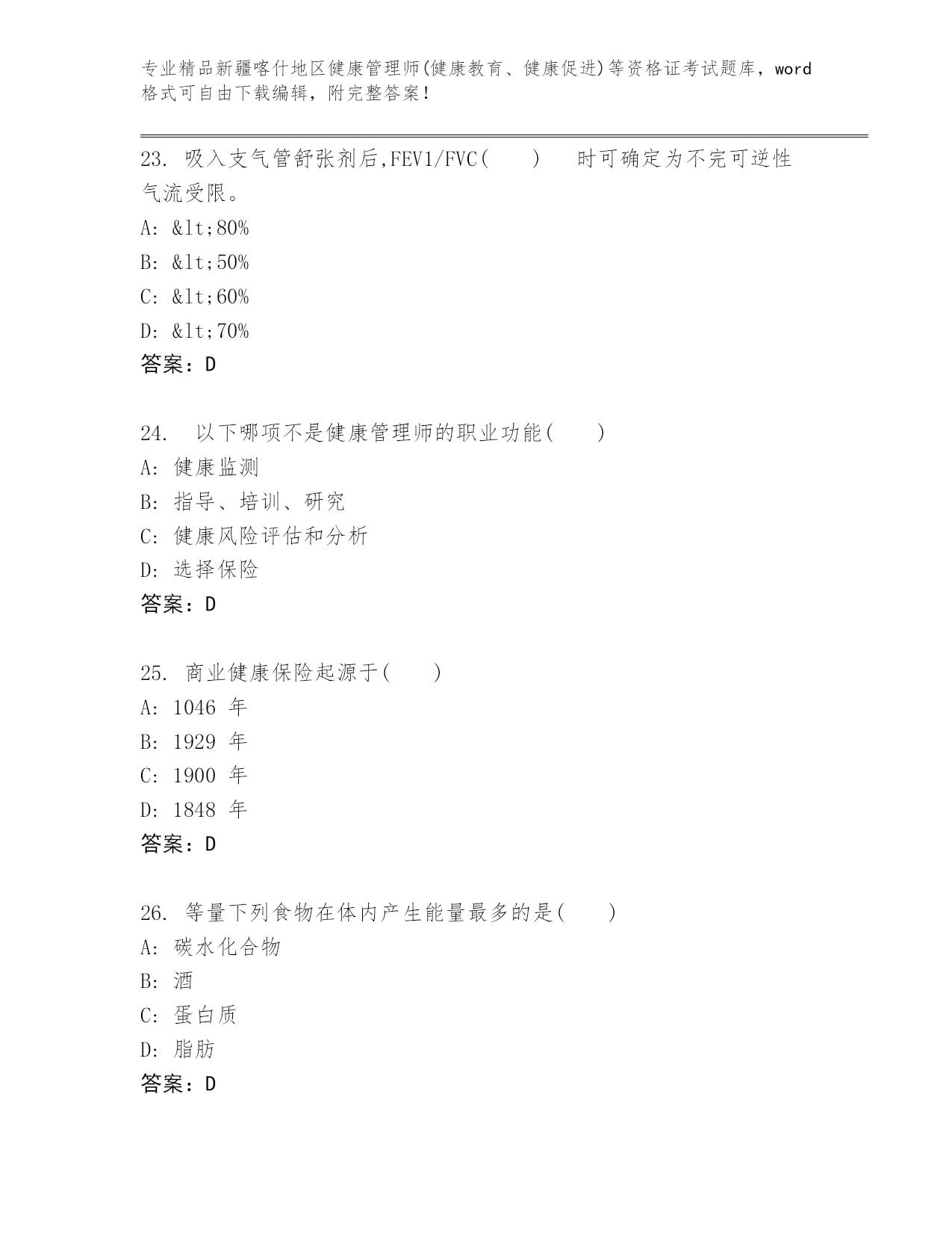 优选新疆喀什地区健康管理师(健康教育、健康促进)等资格证考试完整题库【巩固】