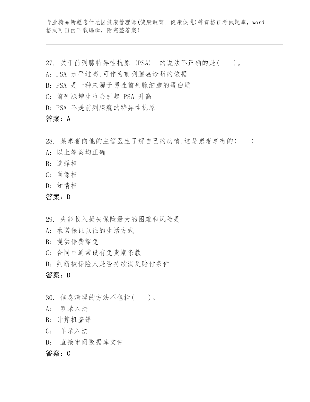 优选新疆喀什地区健康管理师(健康教育、健康促进)等资格证考试完整题库【巩固】.docx