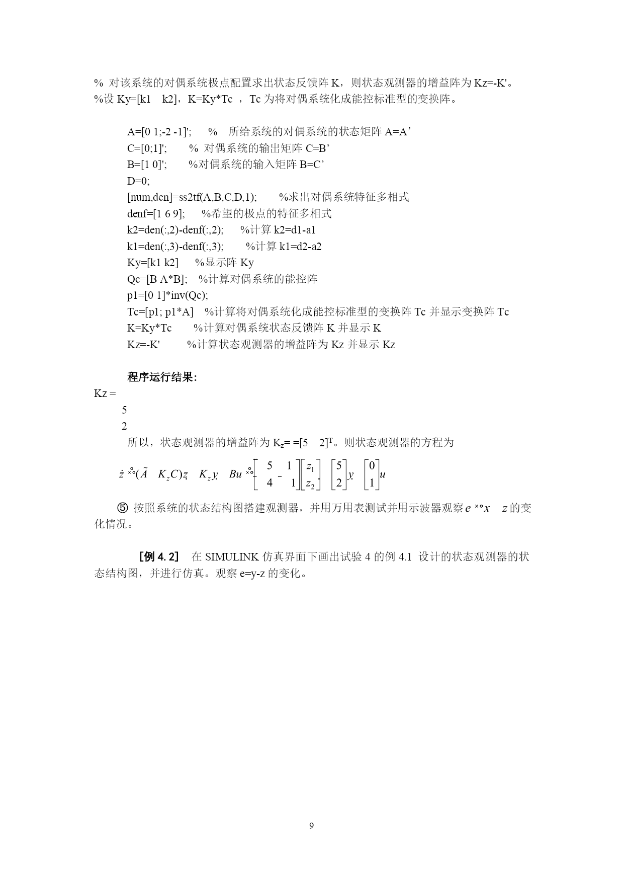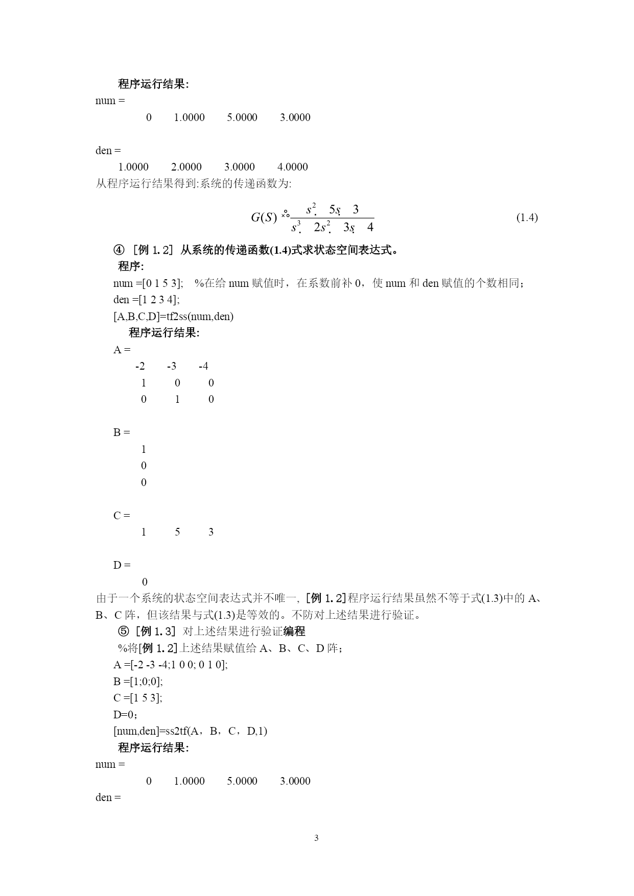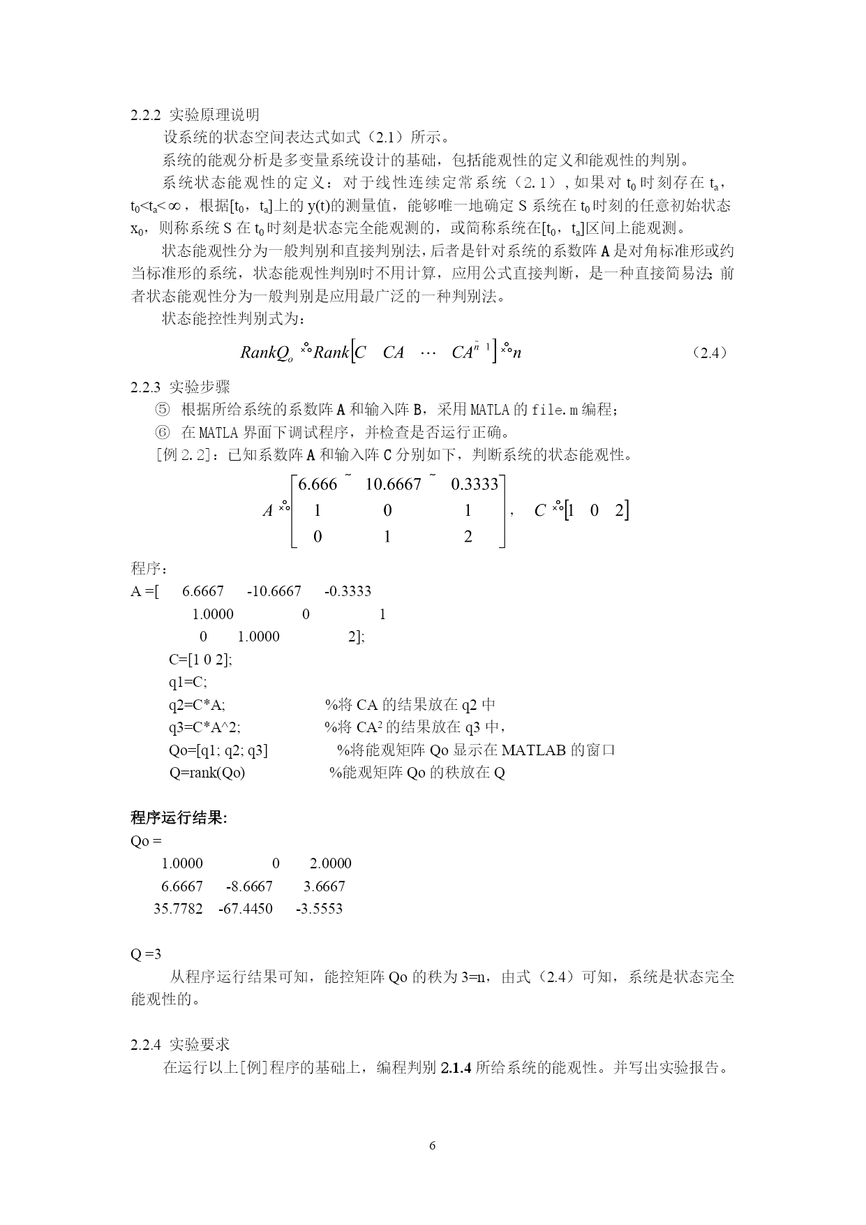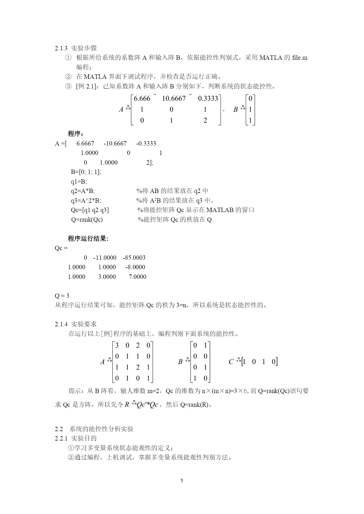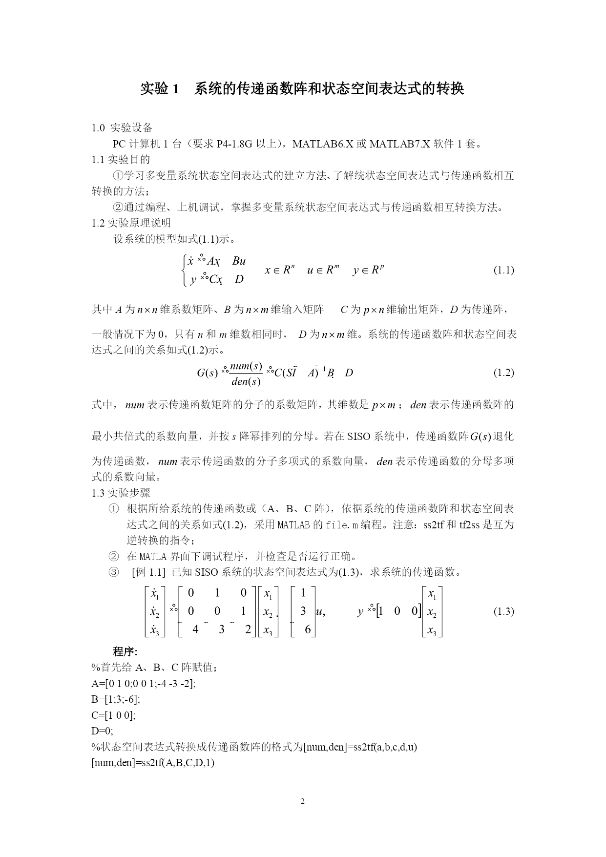 《现代控制理论》实验指导书侯媛彬郭建彪鲁晓晖编西安科技大学电控学院实验1系统的传递函数阵和状态空间表达式的转换1.0实验设备PC计算机1台(要求P4-1.8G以上),MATLAB6.X或MATLAB7.X软件1套。1.1实验目的①学习多变量系统状态空间表达式的建立方法、了解统状态空间表达式与传递函数相互转换的方法;②通过编程、上机调试,掌握多变量系统状态空间表达式与传递函数相互转换方法。1.2实验原理说明设系统的模型如式(1.1)示。(1.1)其中A为维系数矩阵、B为维输入矩阵C为维输出矩阵,D为传递阵,一般情况下为0,只有n和m维数相同时,D为维。系统的传递函数阵和状态空间表达式之间的关系如式(1.2)示。(1.2)式中,表示传递函数矩阵的分子的系数矩阵,其维数是;表示传递函数阵的最小共倍式的系数向量,并按s降幂排列的分母。若在SISO系统中,传递函数阵退化为传递函数,表示传递函数的分子多项式的系数向量,表示传递函数的分母多项式的系数向量。1.3实验步骤根据所给系统的传递函数或(A、B、C阵),依据系统的传递函数阵和状态空间表达式之间的关系如式(1.2),采用MATLAB的file.m编程。注意:ss2tf和tf2ss是互为逆转换的指令;在MATLA界面下调试程序,并检查是否运行正确。[例1.1]已知SISO系统的状态空间表达式为(1.3),求系统的传递函数。(1.3)程序:%首先给A、B、C阵赋值;A=[010;001;-4-3-2];B=[1;3;-6];C=[100];D=0;%状态空间表达式转换成传递函数阵的格式为[num,den]=ss2tf(a,b,c,d,u)[num,den]=ss2tf(A,B,C,D,1)程序运行结果:num=01.00005.00003.0000den=1.00002.00003.00004.0000从程序运行结果得到:系统的传递函数为:(1.4)[例1.2]从系统的传递函数(1.4)式求状态空间表达式。程序:num=[0153];%在给num赋值时,在系数前补0,使num和den赋值的个数相同;den=[1234];[A,B,C,D]=tf2ss(num,den)程序运行结果:A=-2-3-4100010B=100C=153D=0由于一个系统的状态空间表达式并不唯一,[例1.2]程序运行结果虽然不等于式(1.3)中的A、B、C阵,但该结果与式(1.3)是等效的。不防对上述结果进行验证。⑤[例1.3]对上述结果进行验证编程%将[例1.2]上述结果赋值给A、B、C、D阵;A=[-2-3-4;100;010];B=[1;0;0];C=[153];D=0;[num,den]=ss2tf(A,B,C,D,1)程序运行结果:num=01.00005.00003.0000den=1.00002.00003.00004.0000程序运行结果与[例1.1]完全相同,说明从状态空间模型到传递函数之间的相互转换完全正确。[例1.1]所给的系统状态空间模型和[例1.2]的运行结果虽然不同,但两者是等效的。1.4实验要求在运行以上[例]程序的基础上,应用MATLAB对(1.5)系统仿照[例1.2]编程,求系统的A、B、C、阵;然后再仿照[例1.3]进行验证。并写出实验报告。(1.5)提示:num=[0012;0153];实验2多变量系统的能控、能观和稳定性分析2.0实验设备同实验1。2.1系统的能控性分析实验2.1.1实验目的①学习多变量系统状态能控性的定义;②通过用MATLAB编程、上机调试,掌握多变量系统能控性判别和能观性判别方法。2.1.2实验原理说明设系统的状态空间表达式(2.1)系统的能控分析是多变量系统设计的基础,包括能控性的定义和能控性的判别。系统状态能控性的定义的核心是:对于线性连续定常系统(2.1),若存在一个分段连续的输入函数U(t),在有限的时间(t1-t0)内,能把任一给定的初态x(t0)转移至预期的终端x(t1),则称此状态是能控的。若系统所有的状态都是能控的,则称该系统是状态完全能控的。系统输出能控性是指输入函数U(t)加入到系统,在有限的时间(t1-t0)内,能把任一给定的初态x(t0)转移至预期的终态输出y(t1)。能控性判别分为状态能控性判别和输出能控性判别。状态能控性分为一般判别和直接判别法,后者是针对系统的系数阵A是对角标准形或约当标准形的系统,状态能控性判别时不用计算,应用公式直接判断,是一种直接简易法;前者状态能控