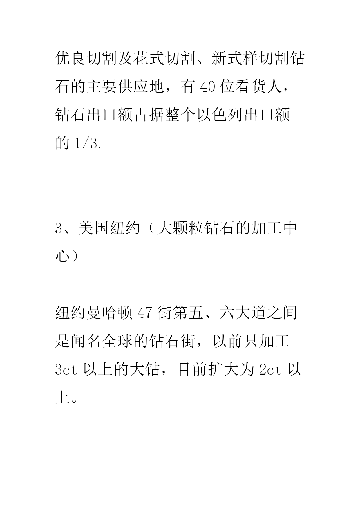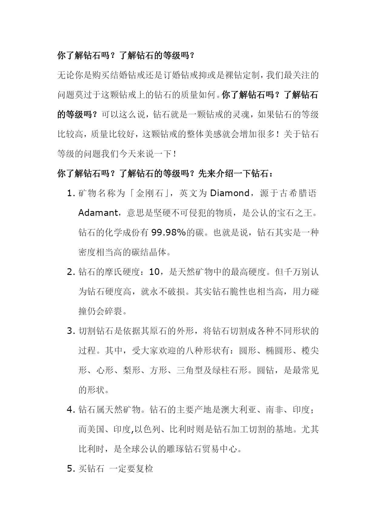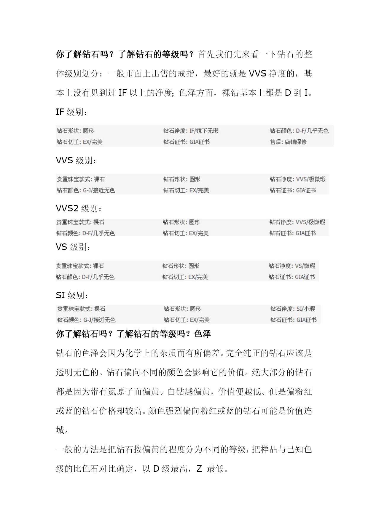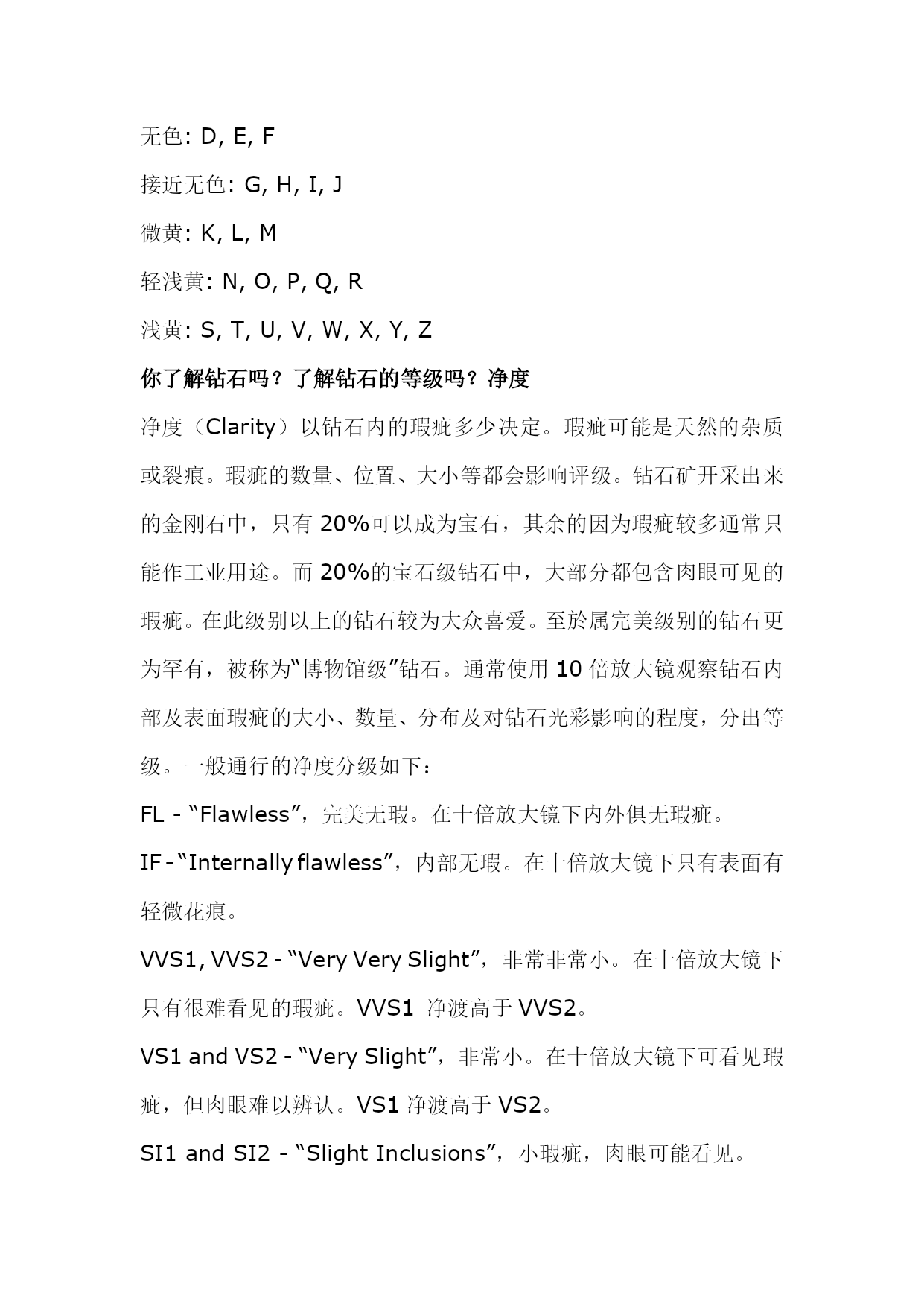 钻石切磨中心(完整版)实用资料(可以直接使用,可编辑完整版实用资料,欢迎下载)世界钻石的主要切磨中心1、比利时安特卫普(精湛钻石加工中心)有“世界钻石之都”的美誉,全世界50%以上的钻石交易在这里进行,一颗钻石如标有“安特卫普切工”,即是完美切工的代名词。2、以色列特拉维夫(精湛小钻加工中心)优良切割及花式切割、新式样切割钻石的主要供应地,有40位看货人,钻石出口额占据整个以色列出口额的1/3.3、美国纽约(大颗粒钻石的加工中心)纽约曼哈顿47街第五、六大道之间是闻名全球的钻石街,以前只加工3ct以上的大钻,目前扩大为2ct以上。4、印度孟买(小颗粒钻石加工中心)以加工小钻为主,相对而言,“印度切割”不及其他国家,有29位看货人。80位切割工人,平均每年加工10亿颗以上。5其他地区曼谷:80年代初才开始建立第一座钻石切割厂,以加工1-10分子钻为主。苏联:苏联车工除了角度、比率均在极好的范围内,抛光也极好。另外,和泰国、苏联一样中国正在发展成为重要的加工切割中心。世界钻石主要产出国、切磨中心分布图你了解钻石吗?了解钻石的等级吗?无论你是购买结婚钻戒还是订婚钻戒抑或是裸钻定制,我们最关注的问题莫过于这颗钻戒上的钻石的质量如何。你了解钻石吗?了解钻石的等级吗?可以这么说,钻石就是一颗钻戒的灵魂,如果钻石的等级比较高,质量比较好,这颗钻戒的整体美感就会增加很多!关于钻石等级的问题我们今天来说一下!你了解钻石吗?了解钻石的等级吗?先来介绍一下钻石:矿物名称为「金刚石」,英文为Diamond,源于古希腊语Adamant,意思是坚硬不可侵犯的物质,是公认的宝石之王。钻石的化学成份有99.98%的碳。也就是说,钻石其实是一种密度相当高的碳结晶体。钻石的摩氏硬度:10,是天然矿物中的最高硬度。但千万别认为钻石硬度高,就永不破损。其实钻石脆性也相当高,用力碰撞仍会碎裂。切割钻石是依据其原石的外形,将钻石切割成各种不同形状的过程。其中,受大家欢迎的八种形状有:圆形、椭圆形、榄尖形、心形、梨形、方形、三角型及绿柱石形。圆钻,是最常见的形状。钻石属天然矿物。钻石的主要产地是澳大利亚、南非、印度;而美国、印度,以色列、比利时则是钻石加工切割的基地。尤其比利时,是全球公认的雕琢钻石贸易中心。买钻石一定要复检你了解钻石吗?了解钻石的等级吗?首先我们先来看一下钻石的整体级别划分:一般市面上出售的戒指,最好的就是VVS净度的,基本上没有见到过IF以上的净度;色泽方面,裸钻基本上都是D到I。IF级别:VVS级别:VVS2级别:VS级别:SI级别:你了解钻石吗?了解钻石的等级吗?色泽钻石的色泽会因为化学上的杂质而有所偏差。完全纯正的钻石应该是透明无色的。钻石偏向不同的颜色会影响它的价值。绝大部分的钻石都是因为带有氮原子而偏黄。白钻越偏黄,价值便越低。但是偏粉红或蓝的钻石价格却较高。颜色强烈偏向粉红或蓝的钻石可能是价值连城。一般的方法是把钻石按偏黄的程度分为不同的等级,把样品与已知色级的比色石对比确定,以D级最高,Z最低。无色:D,E,F接近无色:G,H,I,J微黄:K,L,M轻浅黄:N,O,P,Q,R浅黄:S,T,U,V,W,X,Y,Z你了解钻石吗?了解钻石的等级吗?净度净度(Clarity)以钻石内的瑕疵多少决定。瑕疵可能是天然的杂质或裂痕。瑕疵的数量、位置、大小等都会影响评级。钻石矿开采出来的金刚石中,只有20%可以成为宝石,其余的因为瑕疵较多通常只能作工业用途。而20%的宝石级钻石中,大部分都包含肉眼可见的瑕疵。在此级别以上的钻石较为大众喜爱。至於属完美级别的钻石更为罕有,被称为“博物馆级”钻石。通常使用10倍放大镜观察钻石内部及表面瑕疵的大小、数量、分布及对钻石光彩影响的程度,分出等级。一般通行的净度分级如下:FL-“Flawless”,完美无瑕。在十倍放大镜下内外俱无瑕疵。IF-“Internallyflawless”,内部无瑕。在十倍放大镜下只有表面有轻微花痕。VVS1,VVS2-“VeryVerySlight”,非常非常小。在十倍放大镜下只有很难看见的瑕疵。VVS1净渡高于VVS2。VS1andVS2-“VerySlight”,非常小。在十倍放大镜下可看见瑕疵,但肉眼难以辨认。VS1净渡高于VS2。SI1andSI2-“SlightInclusions”,小瑕疵,肉眼可能看见。I1,I2andI3-“Imperfect”,有瑕疵,可以被肉眼看见。现代科技之下,有些钻石的瑕疵是可以修补的。不过修补过的钻石的价值会稍低。你了解钻石吗?了解钻石的等级吗?切割切割指金刚石是如何从原先开采的石矿中切割成宝石。切割往往是最能影响钻石的品量及价值的一个指标,但是它却没有单一的分