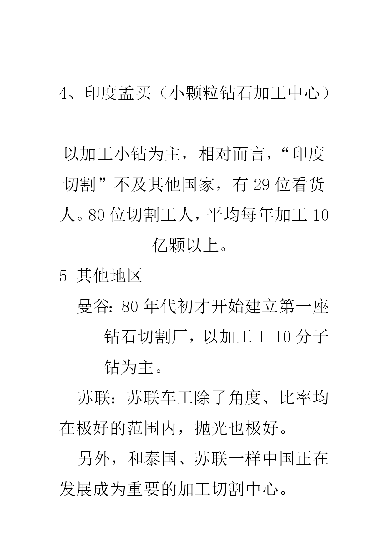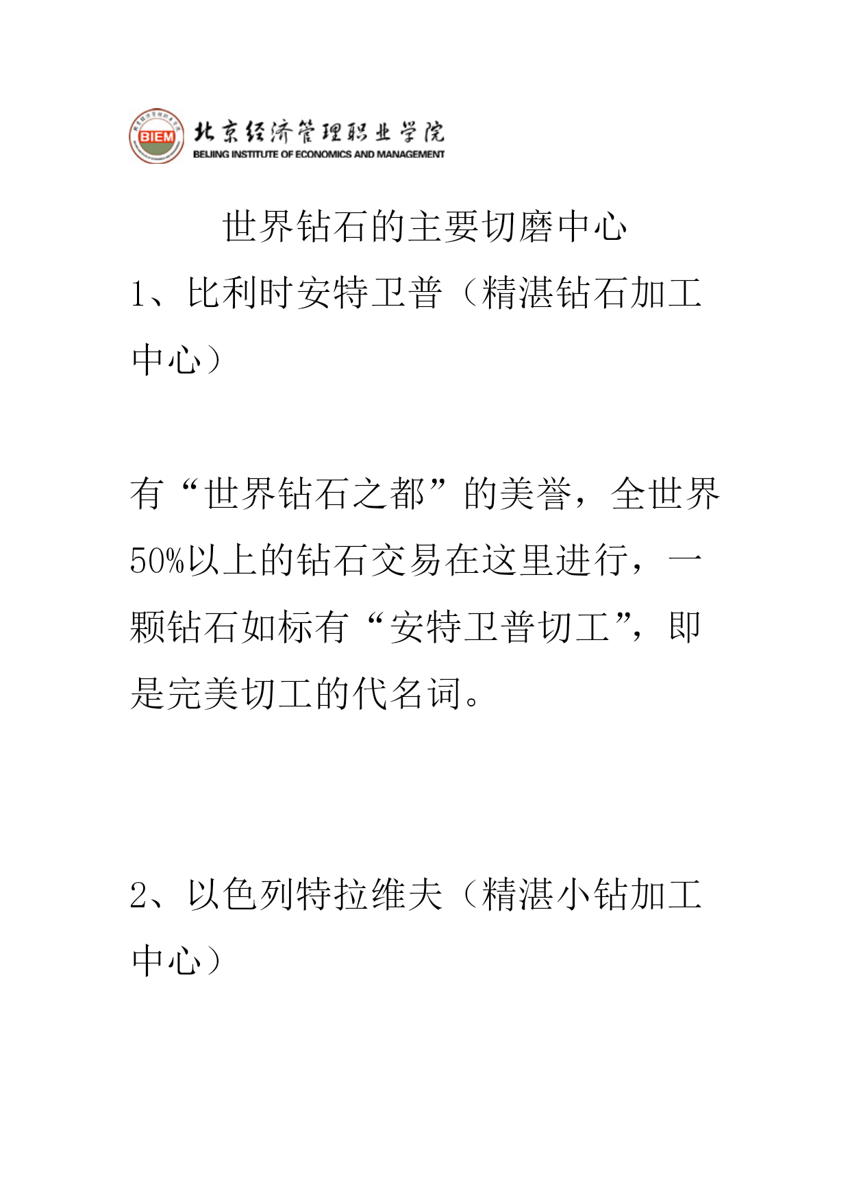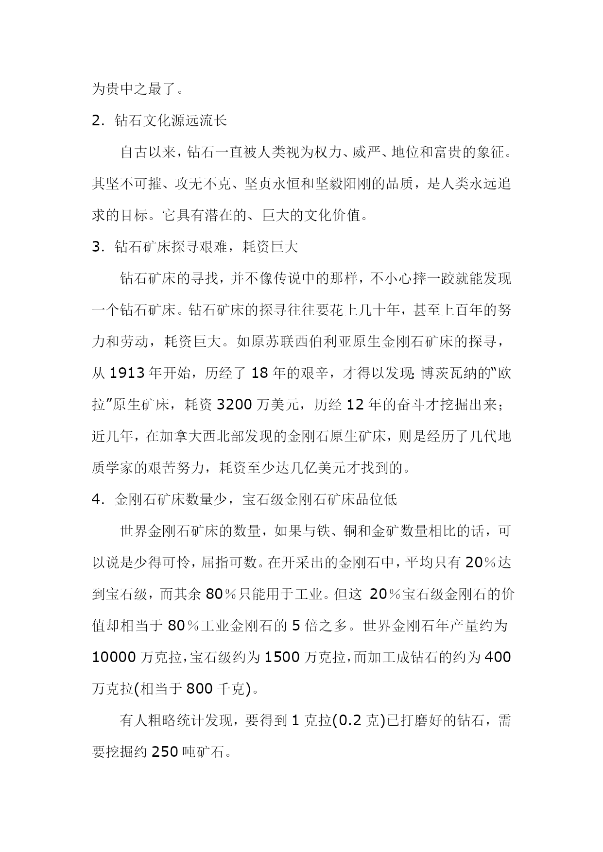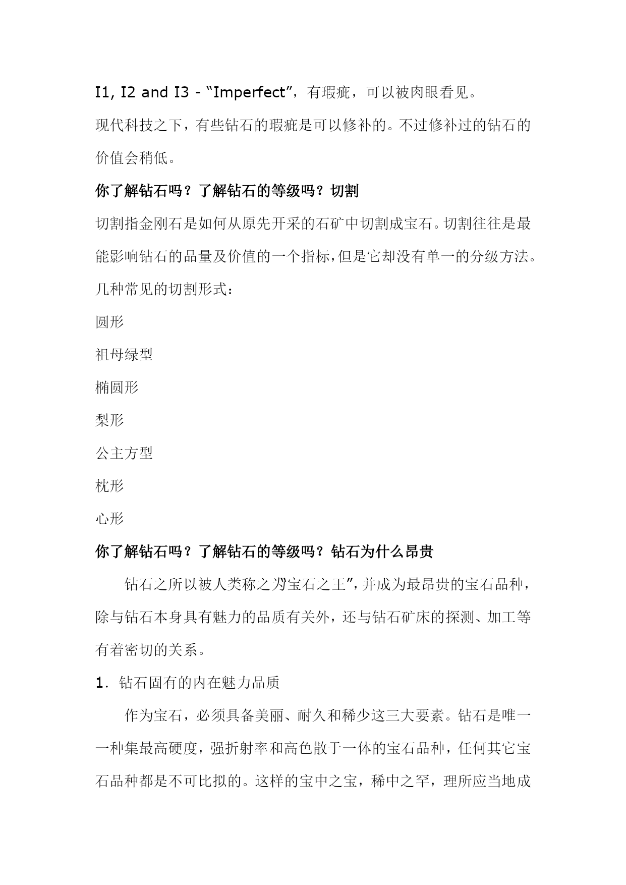 钻石切磨中心(完整版)实用资料(可以直接使用,可编辑完整版实用资料,欢迎下载)世界钻石的主要切磨中心1、比利时安特卫普(精湛钻石加工中心)有“世界钻石之都”的美誉,全世界50%以上的钻石交易在这里进行,一颗钻石如标有“安特卫普切工”,即是完美切工的代名词。2、以色列特拉维夫(精湛小钻加工中心)优良切割及花式切割、新式样切割钻石的主要供应地,有40位看货人,钻石出口额占据整个以色列出口额的1/3.3、美国纽约(大颗粒钻石的加工中心)纽约曼哈顿47街第五、六大道之间是闻名全球的钻石街,以前只加工3ct以上的大钻,目前扩大为2ct以上。4、印度孟买(小颗粒钻石加工中心)以加工小钻为主,相对而言,“印度切割”不及其他国家,有29位看货人。80位切割工人,平均每年加工10亿颗以上。5其他地区曼谷:80年代初才开始建立第一座钻石切割厂,以加工1-10分子钻为主。苏联:苏联车工除了角度、比率均在极好的范围内,抛光也极好。另外,和泰国、苏联一样中国正在发展成为重要的加工切割中心。世界钻石主要产出国、切磨中心分布图你了解钻石吗?了解钻石的等级吗?无论你是购买结婚钻戒还是订婚钻戒抑或是裸钻定制,我们最关注的问题莫过于这颗钻戒上的钻石的质量如何。你了解钻石吗?了解钻石的等级吗?可以这么说,钻石就是一颗钻戒的灵魂,如果钻石的等级比较高,质量比较好,这颗钻戒的整体美感就会增加很多!关于钻石等级的问题我们今天来说一下!你了解钻石吗?了解钻石的等级吗?先来介绍一下钻石:矿物名称为「金刚石」,英文为Diamond,源于古希腊语Adamant,意思是坚硬不可侵犯的物质,是公认的宝石之王。钻石的化学成份有99.98%的碳。也就是说,钻石其实是一种密度相当高的碳结晶体。钻石的摩氏硬度:10,是天然矿物中的最高硬度。但千万别认为钻石硬度高,就永不破损。其实钻石脆性也相当高,用力碰撞仍会碎裂。切割钻石是依据其原石的外形,将钻石切割成各种不同形状的过程。其中,受大家欢迎的八种形状有:圆形、椭圆形、榄尖形、心形、梨形、方形、三角型及绿柱石形。圆钻,是最常见的形状。钻石属天然矿物。钻石的主要产地是澳大利亚、南非、印度;而美国、印度,以色列、比利时则是钻石加工切割的基地。尤其比利时,是全球公认的雕琢钻石贸易中心。买钻石一定要复检你了解钻石吗?了解钻石的等级吗?首先我们先来看一下钻石的整体级别划分:一般市面上出售的戒指,最好的就是VVS净度的,基本上没有见到过IF以上的净度;色泽方面,裸钻基本上都是D到I。IF级别:VVS级别:VVS2级别:VS级别:SI级别:你了解钻石吗?了解钻石的等级吗?色泽钻石的色泽会因为化学上的杂质而有所偏差。完全纯正的钻石应该是透明无色的。钻石偏向不同的颜色会影响它的价值。绝大部分的钻石都是因为带有氮原子而偏黄。白钻越偏黄,价值便越低。但是偏粉红或蓝的钻石价格却较高。颜色强烈偏向粉红或蓝的钻石可能是价值连城。一般的方法是把钻石按偏黄的程度分为不同的等级,把样品与已知色级的比色石对比确定,以D级最高,Z最低。无色:D,E,F接近无色:G,H,I,J微黄:K,L,M轻浅黄:N,O,P,Q,R浅黄:S,T,U,V,W,X,Y,Z你了解钻石吗?了解钻石的等级吗?净度净度(Clarity)以钻石内的瑕疵多少决定。瑕疵可能是天然的杂质或裂痕。瑕疵的数量、位置、大小等都会影响评级。钻石矿开采出来的金刚石中,只有20%可以成为宝石,其余的因为瑕疵较多通常只能作工业用途。而20%的宝石级钻石中,大部分都包含肉眼可见的瑕疵。在此级别以上的钻石较为大众喜爱。至於属完美级别的钻石更为罕有,被称为“博物馆级”钻石。通常使用10倍放大镜观察钻石内部及表面瑕疵的大小、数量、分布及对钻石光彩影响的程度,分出等级。一般通行的净度分级如下:FL-“Flawless”,完美无瑕。在十倍放大镜下内外俱无瑕疵。IF-“Internallyflawless”,内部无瑕。在十倍放大镜下只有表面有轻微花痕。VVS1,VVS2-“VeryVerySlight”,非常非常小。在十倍放大镜下只有很难看见的瑕疵。VVS1净渡高于VVS2。VS1andVS2-“VerySlight”,非常小。在十倍放大镜下可看见瑕疵,但肉眼难以辨认。VS1净渡高于VS2。SI1andSI2-“SlightInclusions”,小瑕疵,肉眼可能看见。I1,I2andI3-“Imperfect”,有瑕疵,可以被肉眼看见。现代科技之下,有些钻石的瑕疵是可以修补的。不过修补过的钻石的价值会稍低。你了解钻石吗?了解钻石的等级吗?切割切割指金刚石是如何从原先开采的石矿中切割成宝石。切割往往是最能影响钻石的品量及价值的一个指标,但是它却没有单一的分