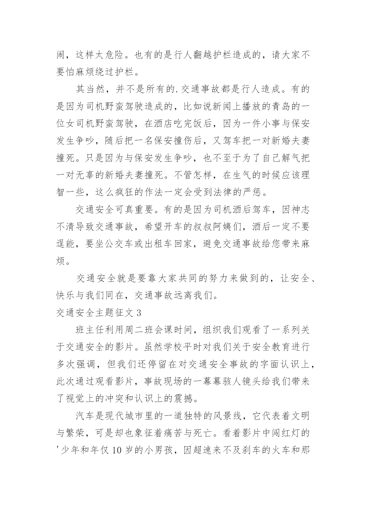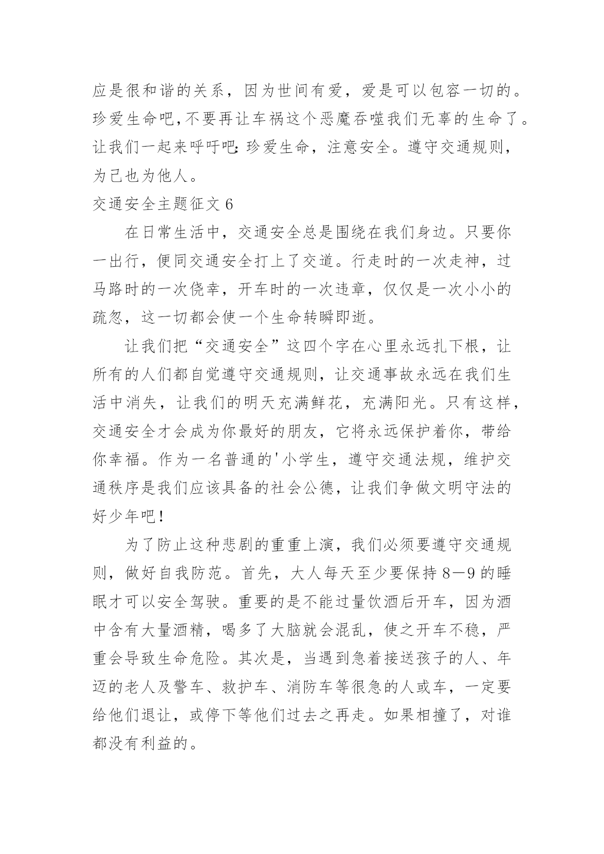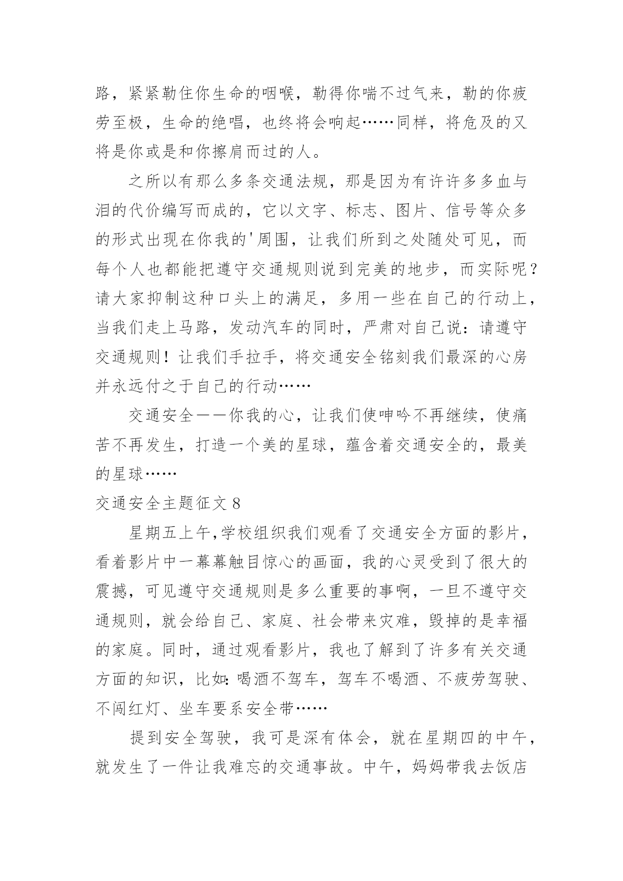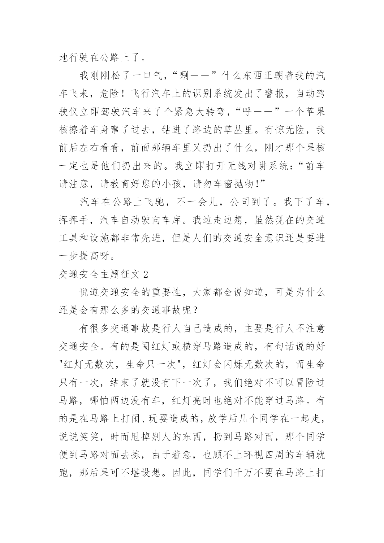 交通安全主题征文交通安全主题征文在学习、工作或生活中,大家或多或少都会接触过征文吧,征文具有标题醒目,让人一目了然的特点。你所见过的征文是什么样的呢?以下是小编为大家整理的交通安全主题征文,希望能够帮助到大家。交通安全主题征文120xx年的一天早晨,我从睡梦中醒来。啊,明媚的阳光照亮了我的床铺,又是一个好天气。今天,我要到800公里外的公司参加一个重要会议,可不能迟到。吃过早饭,我穿戴整齐,走出家门,挥一挥手,一辆飞行汽车就降落在我家门前。这辆飞行汽车有着绿色的车身,宽阔的车门,明亮的车灯,最特别的,是它的顶上有一个大大的螺旋桨。这辆车是最先进的声控无人驾驶机车,安装了语音识别系统,我舒舒服服地坐下来,轻轻说了一声:“启动飞行模式,开往公司”,话音刚落,螺旋桨轰鸣起来,汽车滑翔了一段,“呜――呜――呜――”飞上了蓝天。哇,周围都是大大小小各式各样的.飞行汽车,今天的空中大道可真拥挤呀。眼看着“天路”上的车越来越多,前方似乎发生了堵车,这可怎么办?我探出头往底下一看,哈,陆路上倒是不挤,我灵机一动,对着汽车上的麦克风说:“启动陆地模式!”飞行汽车听话地缓缓下降,不一会儿,已经平稳地行驶在公路上了。我刚刚松了一口气,“唰――”什么东西正朝着我的汽车飞来,危险!飞行汽车上的识别系统发出了警报,自动驾驶仪立即驾驶汽车来了个紧急大转弯,“呼――”一个苹果核擦着车身窜了过去,钻进了路边的草丛里。有惊无险,我前后左右看看,前面那辆车里又扔出了什么,刚才那个果核一定也是他们扔出来的。我立即打开无线对讲系统:“前车请注意,请教育好您的小孩,请勿车窗抛物!”汽车在公路上飞驰,不一会儿,公司到了。我下了车,挥挥手,汽车自动驶向车库。我边走边想,虽然现在的交通工具和设施都非常先进,但是人们的交通安全意识还是要进一步提高呀。交通安全主题征文2说道交通安全的重要性,大家都会说知道,可是为什么还是会有那么多的交通事故呢?有很多交通事故是行人自己造成的,主要是行人不注意交通安全。有的是闯红灯或横穿马路造成的,有句话说的好"红灯无数次,生命只一次",红灯会闪烁无数次的,而生命只有一次,结束了就没有下一次了,我们绝对不可以冒险过马路,哪怕两边没有车,红灯亮时也绝对不能穿过马路。有的是在马路上打闹、玩耍造成的,放学后几个同学在一起走,说说笑笑,时而甩掉别人的东西,扔到马路对面,那个同学便到马路对面去拣,由于着急,也顾不上环视四周的车辆就跑,那后果可不堪设想。因此,同学们千万不要在马路上打闹,这样太危险。也有的是行人翻越护栏造成的,请大家不要怕麻烦绕过护栏。其当然,并不是所有的.交通事故都是行人造成。有的是因为司机野蛮驾驶造成的,比如说新闻上播放的青岛的一位女司机野蛮驾驶,在酒店吃完饭后,因为一件小事与保安发生争吵,随后把一名保安撞伤后,又驾车把一对新婚夫妻撞死。只是因为与保安发生争吵,也不至于为了自己解气把一对无辜的新婚夫妻撞死。不管怎样,在生气的时候应该理智一些,这么疯狂的作法一定会受到法律的严惩。交通安全可真重要。有的是因为司机酒后驾车,因神志不清导致交通事故,希望开车的叔叔阿姨们,酒后一定不要逞能,要坐公交车或出租车回家,避免交通事故给您带来麻烦。交通安全就是要靠大家共同的努力来做到的,让安全、快乐与我们同在,交通事故远离我们。交通安全主题征文3班主任利用周二班会课时间,组织我们观看了一系列关于交通安全的影片。虽然学校平时对我们关于安全教育进行多次强调,但我们还停留在对交通安全事故的字面认识上,此次通过观看影片,事故现场的一幕幕骇人镜头给我们带来了视觉上的冲突和认识上的震撼。汽车是现代城市里的一道独特的风景线,它代表着文明与繁荣,可是却也象征着痛苦与死亡。看着影片中闯红灯的'少年和年仅10岁的小男孩,因超速来不及刹车的火车和那辆从桥上翻到山谷里的客车,以及那对因车祸而没来得及走进结婚礼堂的新人,生命在瞬间消失,死者家人痛不欲生,白发人送黑发人,幸福从此有了无法弥补的缺陷,我们个个目瞪口呆,为这些早逝的生命而哀叹,对那些不守交通规则的人发出强烈的谴责之声。通过影片,我们认识到生命真的很脆弱,转瞬即逝,每个人都应该在开车时尽量放慢速度,宁让三分,不争一秒,不要为了耍酷飙车,不宜酒后驾车,不宜疲劳驾驶,更不能再开车时讲电话,遵守交通规则,一点小的失误会造成无法挽回的损失,造成巨大的遗憾,多给自己留一份意,多给自己一双眼睛,也许生命就不会选择暂停了,毕竟生命只有一次,值得好好把握和珍惜。交通意识的淡薄和对交通法的漠视是造成交通事故的最大原因,生命诚可贵,安全责任大。安全工作每天都是一个新的开始,都是一个新的起点,为了社会的发展,为了个人的安全,为了家庭的幸福,让我们从个人做起,从小事做起,把安全工作作为每天的头等大事来抓,认真做到“交通安全,从我做起”。交通安全