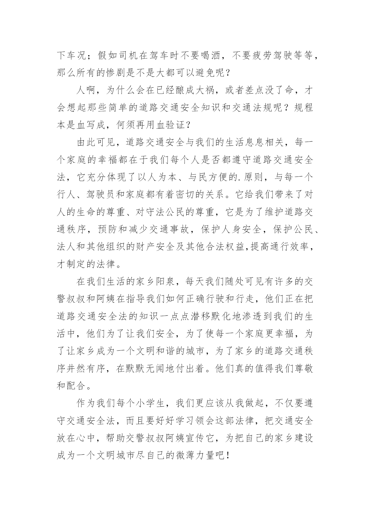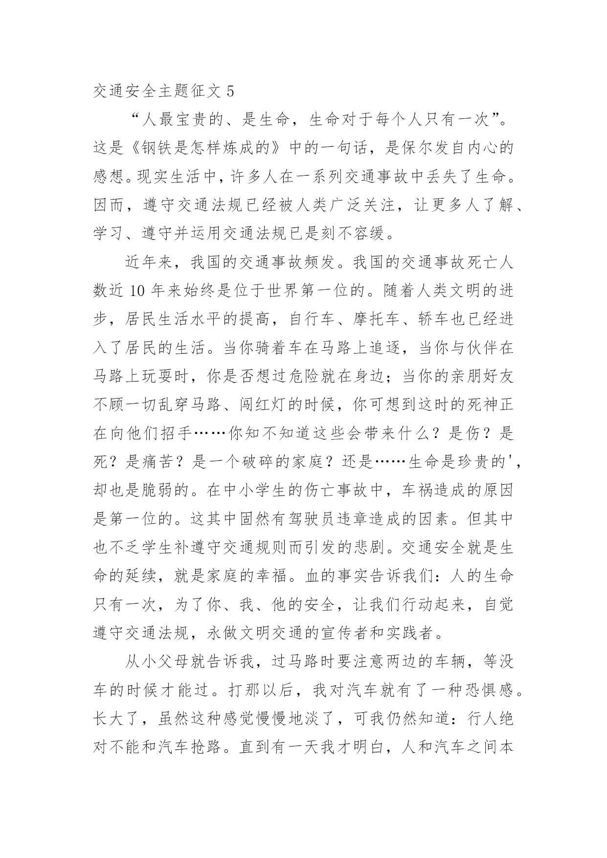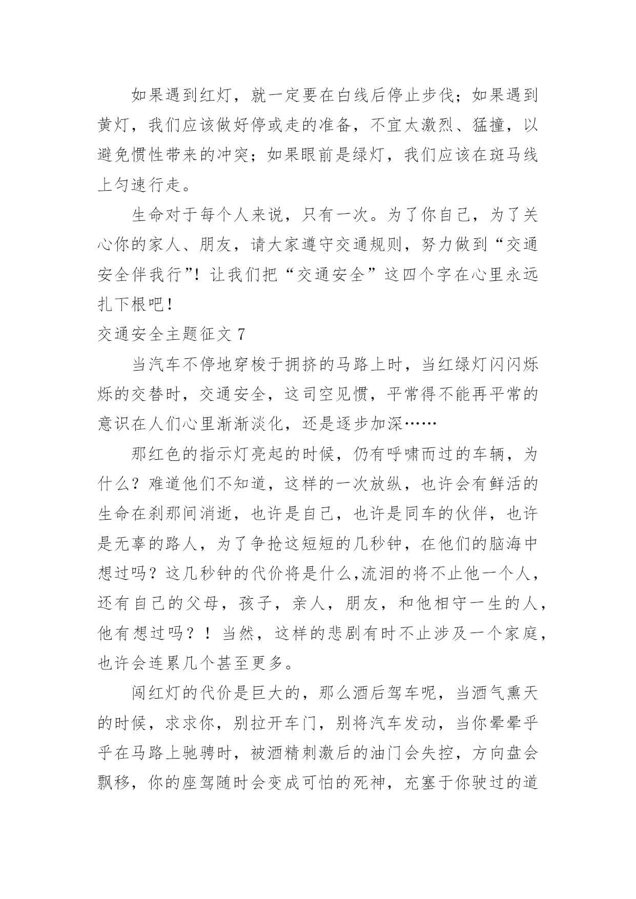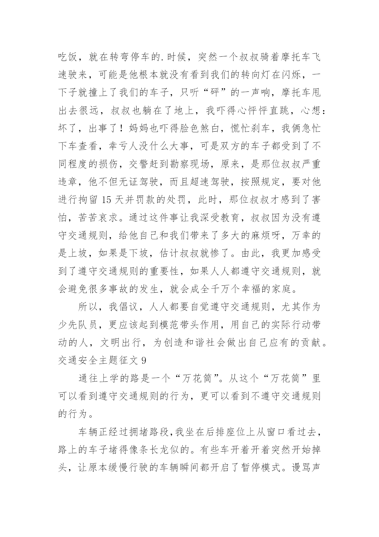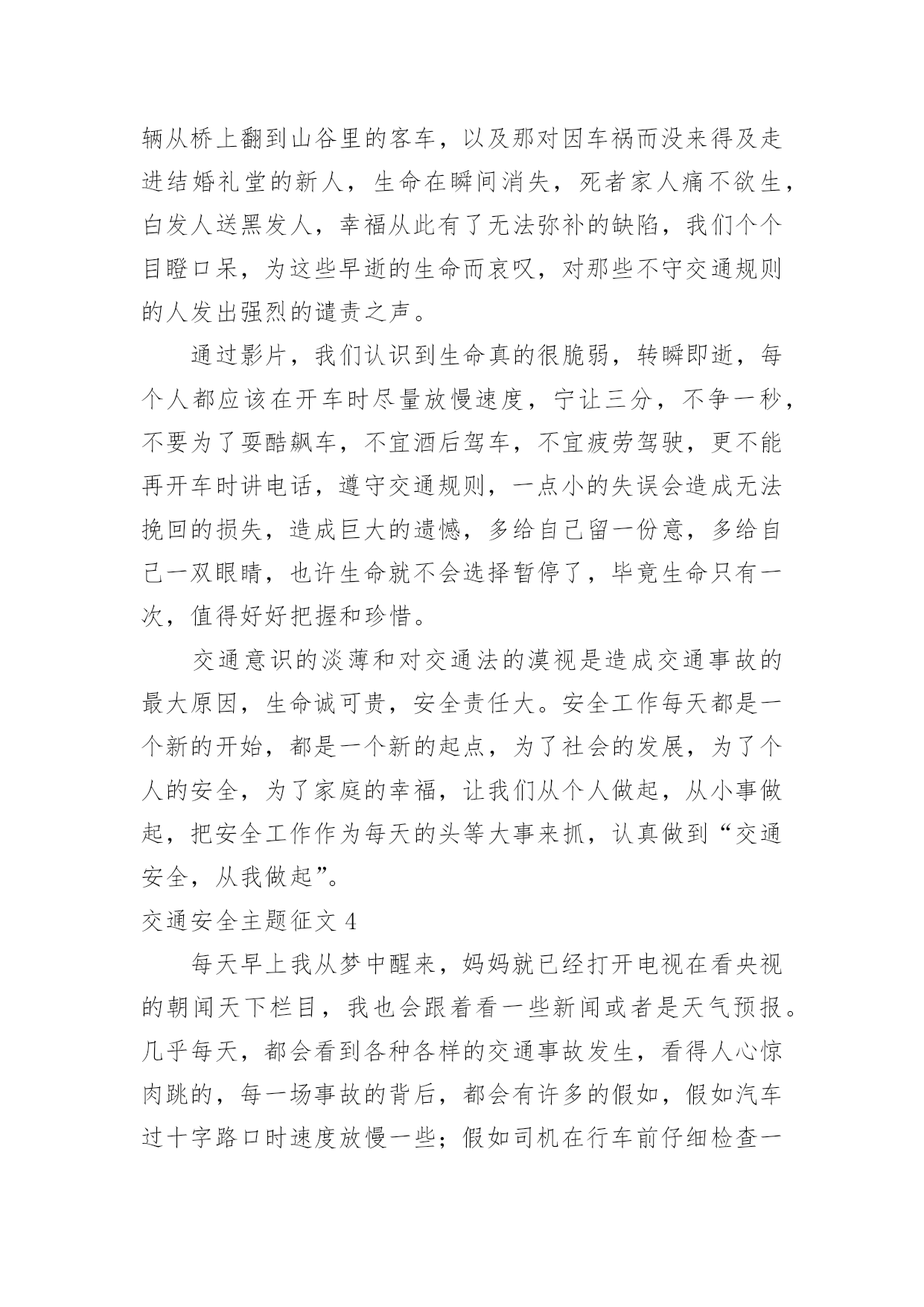 交通安全主题征文交通安全主题征文在学习、工作或生活中,大家或多或少都会接触过征文吧,征文具有标题醒目,让人一目了然的特点。你所见过的征文是什么样的呢?以下是小编为大家整理的交通安全主题征文,希望能够帮助到大家。交通安全主题征文120xx年的一天早晨,我从睡梦中醒来。啊,明媚的阳光照亮了我的床铺,又是一个好天气。今天,我要到800公里外的公司参加一个重要会议,可不能迟到。吃过早饭,我穿戴整齐,走出家门,挥一挥手,一辆飞行汽车就降落在我家门前。这辆飞行汽车有着绿色的车身,宽阔的车门,明亮的车灯,最特别的,是它的顶上有一个大大的螺旋桨。这辆车是最先进的声控无人驾驶机车,安装了语音识别系统,我舒舒服服地坐下来,轻轻说了一声:“启动飞行模式,开往公司”,话音刚落,螺旋桨轰鸣起来,汽车滑翔了一段,“呜――呜――呜――”飞上了蓝天。哇,周围都是大大小小各式各样的.飞行汽车,今天的空中大道可真拥挤呀。眼看着“天路”上的车越来越多,前方似乎发生了堵车,这可怎么办?我探出头往底下一看,哈,陆路上倒是不挤,我灵机一动,对着汽车上的麦克风说:“启动陆地模式!”飞行汽车听话地缓缓下降,不一会儿,已经平稳地行驶在公路上了。我刚刚松了一口气,“唰――”什么东西正朝着我的汽车飞来,危险!飞行汽车上的识别系统发出了警报,自动驾驶仪立即驾驶汽车来了个紧急大转弯,“呼――”一个苹果核擦着车身窜了过去,钻进了路边的草丛里。有惊无险,我前后左右看看,前面那辆车里又扔出了什么,刚才那个果核一定也是他们扔出来的。我立即打开无线对讲系统:“前车请注意,请教育好您的小孩,请勿车窗抛物!”汽车在公路上飞驰,不一会儿,公司到了。我下了车,挥挥手,汽车自动驶向车库。我边走边想,虽然现在的交通工具和设施都非常先进,但是人们的交通安全意识还是要进一步提高呀。交通安全主题征文2说道交通安全的重要性,大家都会说知道,可是为什么还是会有那么多的交通事故呢?有很多交通事故是行人自己造成的,主要是行人不注意交通安全。有的是闯红灯或横穿马路造成的,有句话说的好"红灯无数次,生命只一次",红灯会闪烁无数次的,而生命只有一次,结束了就没有下一次了,我们绝对不可以冒险过马路,哪怕两边没有车,红灯亮时也绝对不能穿过马路。有的是在马路上打闹、玩耍造成的,放学后几个同学在一起走,说说笑笑,时而甩掉别人的东西,扔到马路对面,那个同学便到马路对面去拣,由于着急,也顾不上环视四周的车辆就跑,那后果可不堪设想。因此,同学们千万不要在马路上打闹,这样太危险。也有的是行人翻越护栏造成的,请大家不要怕麻烦绕过护栏。其当然,并不是所有的.交通事故都是行人造成。有的是因为司机野蛮驾驶造成的,比如说新闻上播放的青岛的一位女司机野蛮驾驶,在酒店吃完饭后,因为一件小事与保安发生争吵,随后把一名保安撞伤后,又驾车把一对新婚夫妻撞死。只是因为与保安发生争吵,也不至于为了自己解气把一对无辜的新婚夫妻撞死。不管怎样,在生气的时候应该理智一些,这么疯狂的作法一定会受到法律的严惩。交通安全可真重要。有的是因为司机酒后驾车,因神志不清导致交通事故,希望开车的叔叔阿姨们,酒后一定不要逞能,要坐公交车或出租车回家,避免交通事故给您带来麻烦。交通安全就是要靠大家共同的努力来做到的,让安全、快乐与我们同在,交通事故远离我们。交通安全主题征文3班主任利用周二班会课时间,组织我们观看了一系列关于交通安全的影片。虽然学校平时对我们关于安全教育进行多次强调,但我们还停留在对交通安全事故的字面认识上,此次通过观看影片,事故现场的一幕幕骇人镜头给我们带来了视觉上的冲突和认识上的震撼。汽车是现代城市里的一道独特的风景线,它代表着文明与繁荣,可是却也象征着痛苦与死亡。看着影片中闯红灯的'少年和年仅10岁的小男孩,因超速来不及刹车的火车和那辆从桥上翻到山谷里的客车,以及那对因车祸而没来得及走进结婚礼堂的新人,生命在瞬间消失,死者家人痛不欲生,白发人送黑发人,幸福从此有了无法弥补的缺陷,我们个个目瞪口呆,为这些早逝的生命而哀叹,对那些不守交通规则的人发出强烈的谴责之声。通过影片,我们认识到生命真的很脆弱,转瞬即逝,每个人都应该在开车时尽量放慢速度,宁让三分,不争一秒,不要为了耍酷飙车,不宜酒后驾车,不宜疲劳驾驶,更不能再开车时讲电话,遵守交通规则,一点小的失误会造成无法挽回的损失,造成巨大的遗憾,多给自己留一份意,多给自己一双眼睛,也许生命就不会选择暂停了,毕竟生命只有一次,值得好好把握和珍惜。交通意识的淡薄和对交通法的漠视是造成交通事故的最大原因,生命诚可贵,安全责任大。安全工作每天都是一个新的开始,都是一个新的起点,为了社会的发展,为了个人的安全,为了家庭的幸福,让我们从个人做起,从小事做起,把安全工作作为每天的头等大事来抓,认真做到“交通安全,从我做起”。交通安全