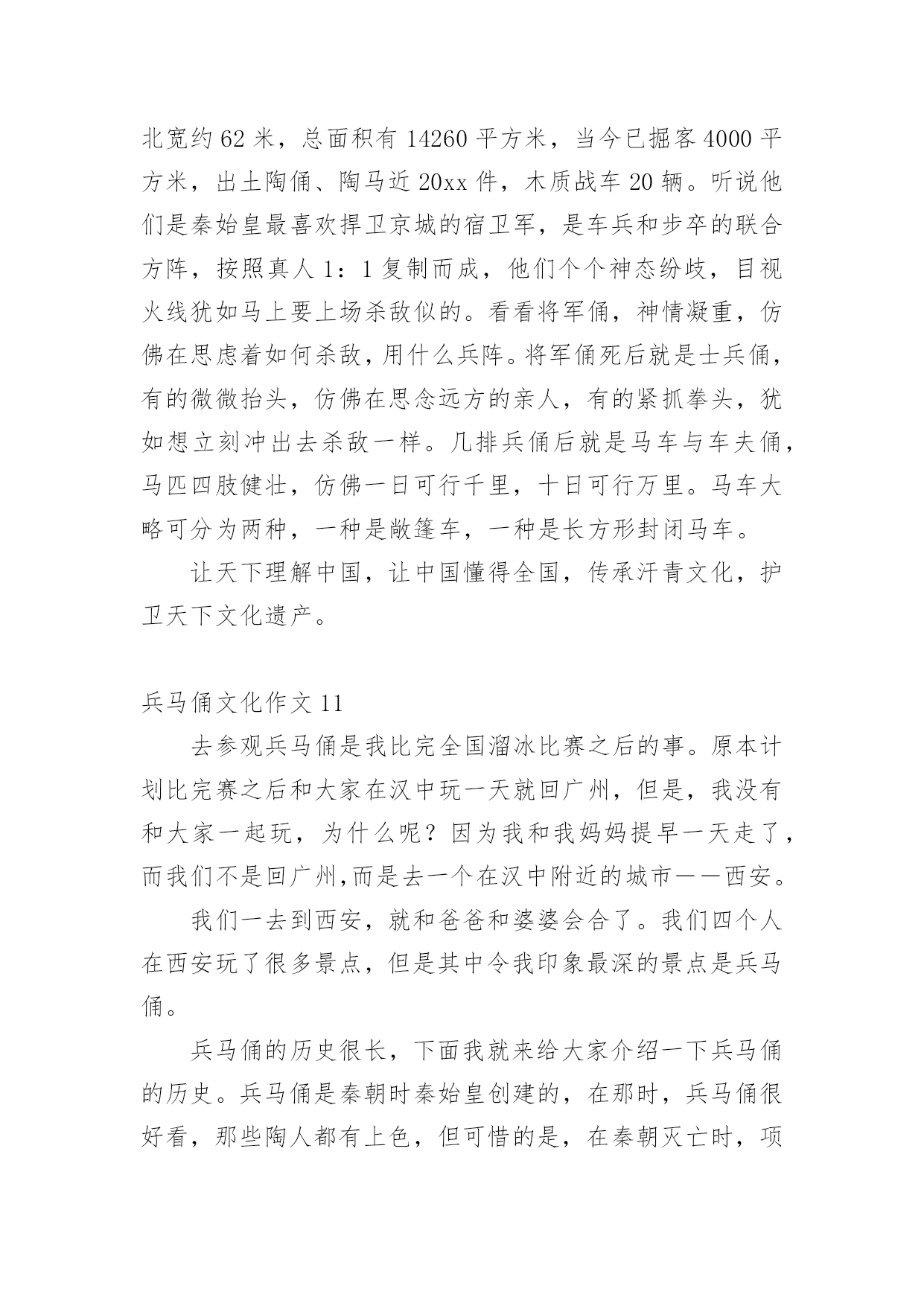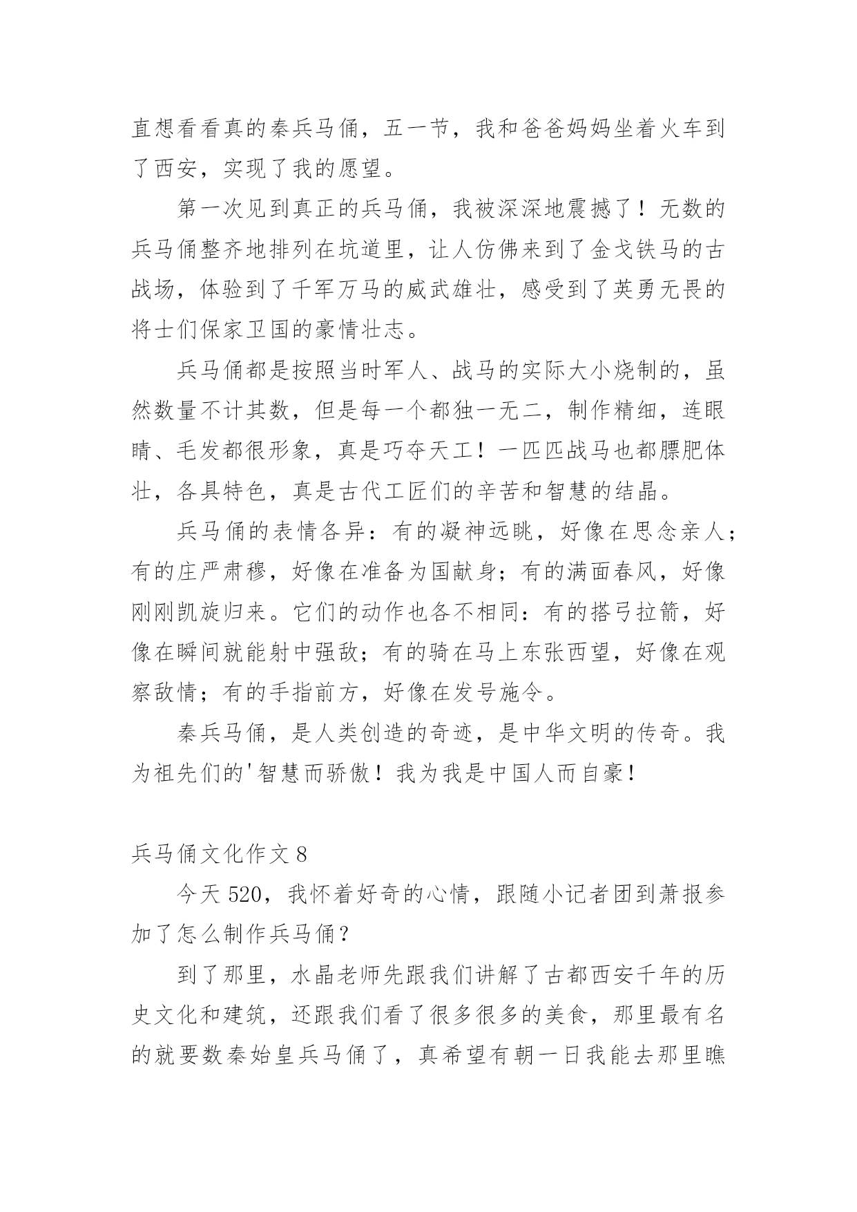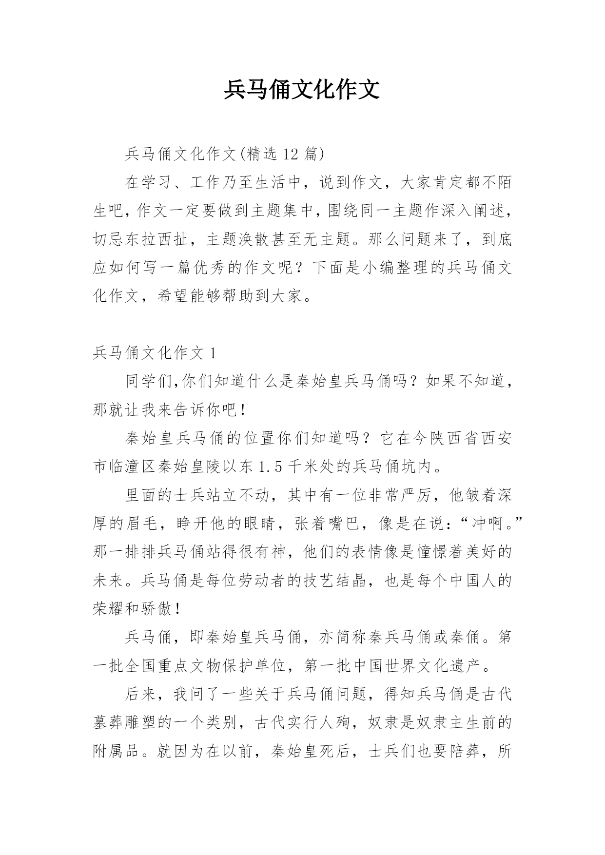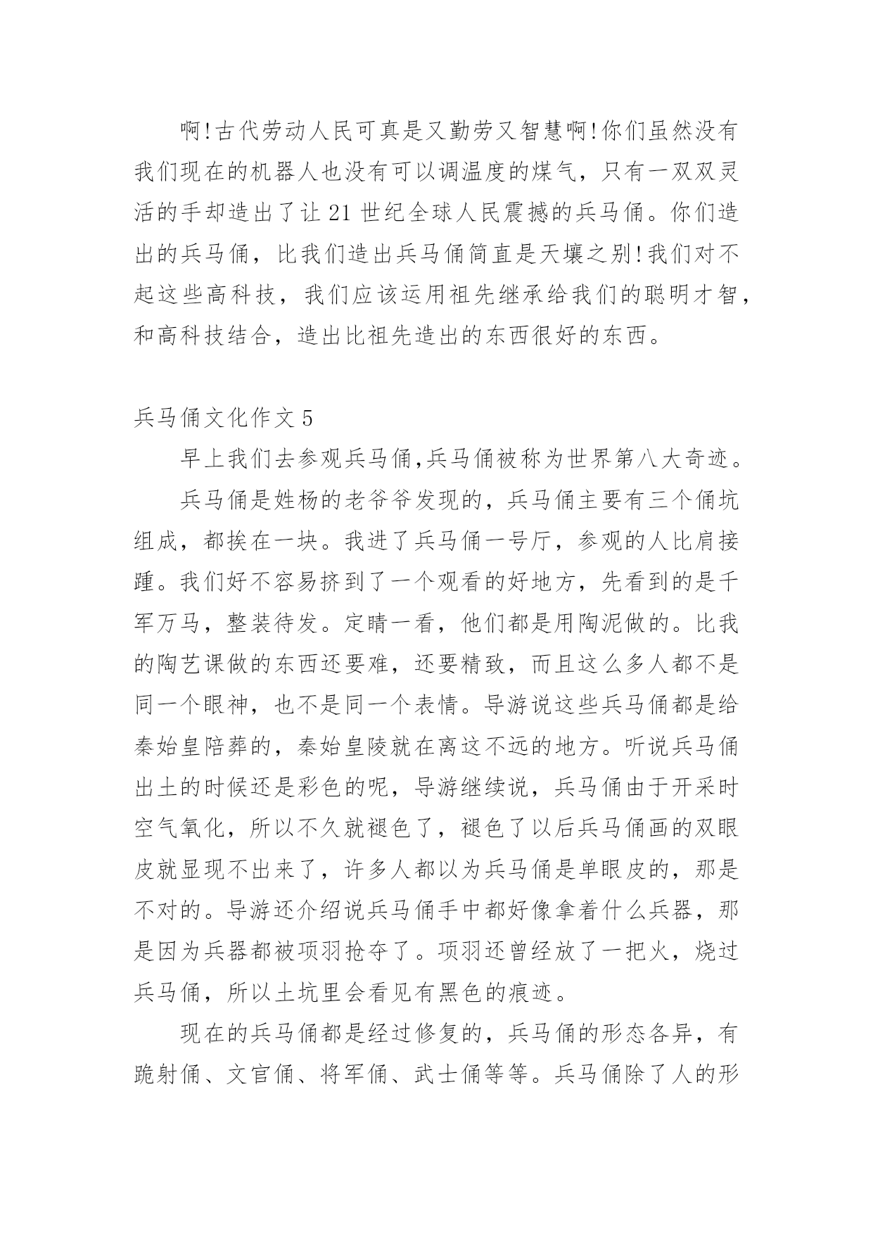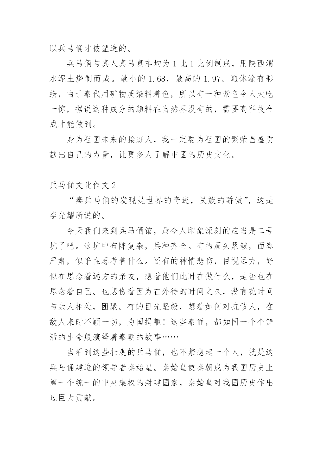 兵马俑文化作文兵马俑文化作文(精选12篇)在学习、工作乃至生活中,说到作文,大家肯定都不陌生吧,作文一定要做到主题集中,围绕同一主题作深入阐述,切忌东拉西扯,主题涣散甚至无主题。那么问题来了,到底应如何写一篇优秀的作文呢?下面是小编整理的兵马俑文化作文,希望能够帮助到大家。兵马俑文化作文1同学们,你们知道什么是秦始皇兵马俑吗?如果不知道,那就让我来告诉你吧!秦始皇兵马俑的位置你们知道吗?它在今陕西省西安市临潼区秦始皇陵以东1.5千米处的兵马俑坑内。里面的士兵站立不动,其中有一位非常严厉,他皱着深厚的眉毛,睁开他的眼睛,张着嘴巴,像是在说:“冲啊。”那一排排兵马俑站得很有神,他们的表情像是憧憬着美好的未来。兵马俑是每位劳动者的技艺结晶,也是每个中国人的荣耀和骄傲!兵马俑,即秦始皇兵马俑,亦简称秦兵马俑或秦俑。第一批全国重点文物保护单位,第一批中国世界文化遗产。后来,我问了一些关于兵马俑问题,得知兵马俑是古代墓葬雕塑的一个类别,古代实行人殉,奴隶是奴隶主生前的附属品。就因为在以前,秦始皇死后,士兵们也要陪葬,所以兵马俑才被塑造的。兵马俑与真人真马真车均为1比1比例制成,用陕西渭水泥土烧制而成。最小的1.68,最高的1.97。通体涂有彩绘,由于秦代用矿物质染料着色,所以有一种紫色令人大吃一惊,据说这种成分的颜料在自然界没有的,需要高科技合成才能做到。身为祖国未来的接班人,我一定要为祖国的繁荣昌盛贡献出自己的力量,让更多人了解中国的历史文化。兵马俑文化作文2“秦兵马俑的发现是世界的奇迹,民族的骄傲”,这是李光耀所说的。今天我们来到兵马俑馆,最令人印象深刻的应当是二号坑了吧。这坑中布阵复杂,兵种齐全。有的眉头紧皱,面容严肃,似乎在思考着什么。还有的神情悲伤,目视远方,好似在思念着远方的亲友,想着他们此时在做什么,是否也在思念着自己。也悲伤着因为在外待的时间之久,没有花时间与亲人相处,团聚。有的目光坚毅,想着如何对抗敌人,在敌人来时不顾一切,为国捐躯!这些秦俑,都如同一个个鲜活的生命般演绎着秦朝的故事……当看到这些壮观的兵马俑,也不禁想起一个人,就是这兵马俑建造的领导者秦始皇。秦始皇使秦朝成为我国历史上第一个统一的中央集权的封建国家,秦始皇对我国历史作出过巨大贡献。但同时他也有昏庸的一面。他广建宫殿陵墓,浪费了大量人力、物力、财力,影响了人民正常的生产和生活;使人民生活在水深火热之中,多少的人民被强迫拉去修建陵墓,并由于条件的艰苦许多人都再也没有机会回去看看亲人,去重见外面的世界。阳光照射下来,秦俑闪闪发光,他们的眼神坚毅,似乎在诉说着一个不为人知的故事……兵马俑文化作文37月22日的上午,我和爸爸一起到西安兵马俑博物馆参观。我们首先请了一个导游,那个导游讲得太快了,大部分我都没听明白。但是我还是听懂了我觉得最有趣的两个:“签名”和“一号坑”。给我签名的人是个姓杨的老爷爷。他是发现兵马俑的第一个人。听说,他在村南打井,没有打到水,而意外地打到了一些破碎的陶俑和古代青铜兵器,于是他马上告诉了文物管理部门,管理部门的领导马上派人来挖掘,挖了许多,但是还有一些不能挖出来。刚刚挖出来是彩色的,被太阳一晒,就变成了灰色。一直要等到研究出来一种防止退颜色的技术才能再挖。杨爷爷在我买的《梦幻的军团》书上的第一页签名。杨爷爷从来没有上过学,又是怎样给我签名的呢?而他为什么字写得那么好呢?原来,他以前都是用印指头来签名的,可是,一次有一个人说:“现在世界都这么发达了,可你的签名还是印手指头,那多没意思啊!”于是有人教会了他签名,他签名的时候好像画画一样,是一笔写成的。现在我该讲一号坑了,那里面的兵马俑跟真人差不多,是用泥土烧成的。这些兵都是来保护皇帝的坟墓的,而且这些士兵千姿百态,有的拿刀,有的拿枪;有的蹲着,有的站着……看了兵马俑博物馆,我感觉到了我们中国历史是那么的美丽。兵马俑文化作文4我去过无数人赞叹的兰亭,去过水平如镜的西湖,但在我印象最深刻的却是西安的兵马俑。来到兵马俑,只见外面是一片小树林。我们在经过这一片树林的时候,蝉唱得异常的响,仿佛在为我们歌唱大自然之歌,里面的小溪在为这首大自然之歌伴奏。中午,我们终于到了兵马俑一号坑。兵马俑一个个惟妙惟肖。我在想,古人没有高科技就能造出这样的兵马俑,每个脸部表情都不一样,我们中国人的科技不是在进步,而是在退步!中午,我们又从兵马俑一号坑到了放战车的地方,第一架战车后面就像我们平常坐的黄包车。第二架战车和第一架战车的前面都有一个东西,那个东西上面有刺,上面又有把为了让战马不跑出去的东西。这个不知名的东西,让战马不会离太远,也不会让战马离太近。啊!古代劳动人民可真是又勤劳又智慧啊!你们虽然没有我们现在的机器人也没有可以调温度的煤气,只有一双双灵活的手却造出了让21世纪全球人民震撼的兵马俑。你们造出的兵马