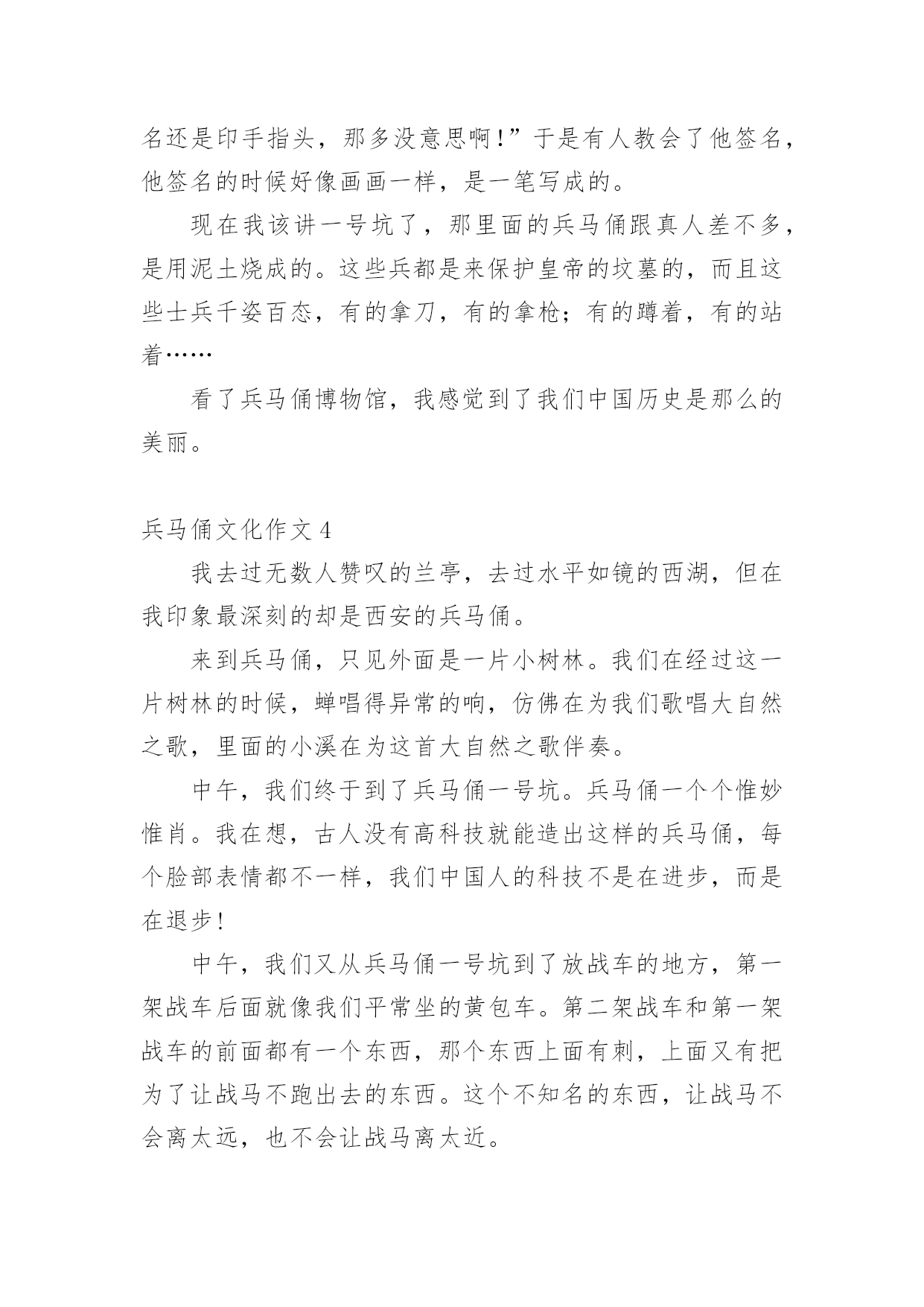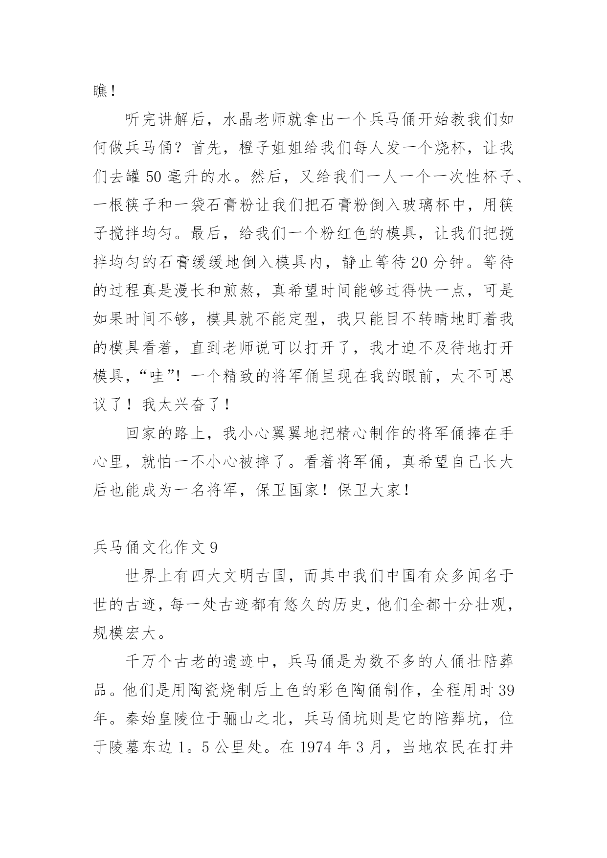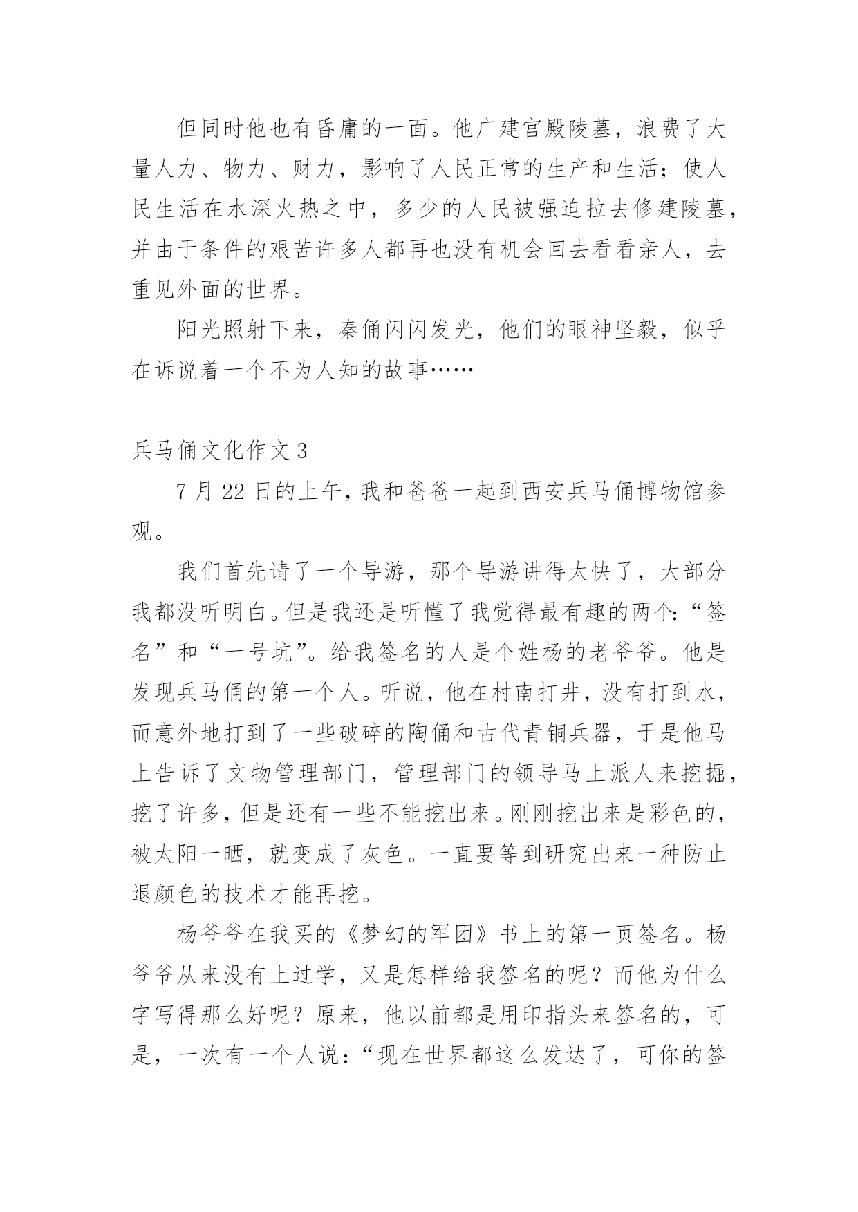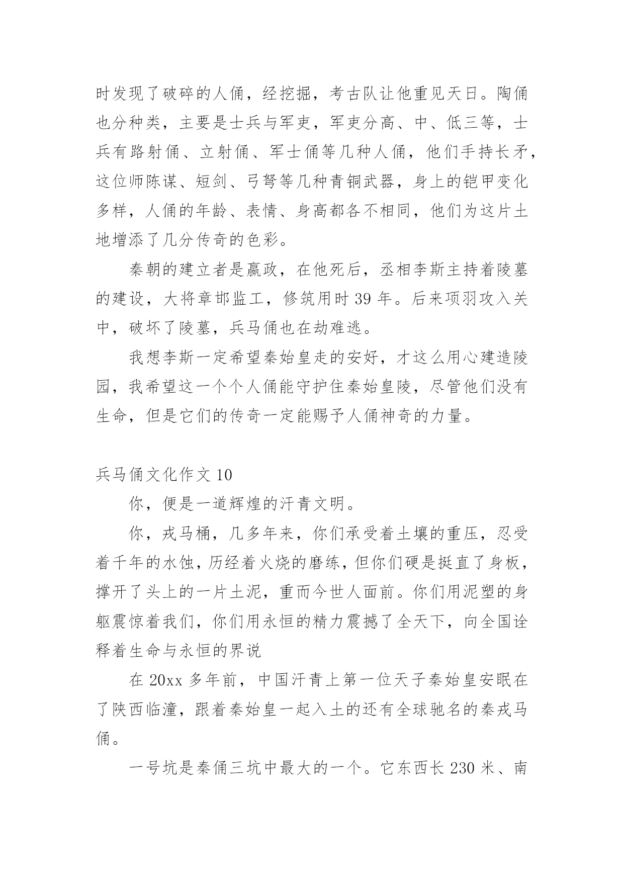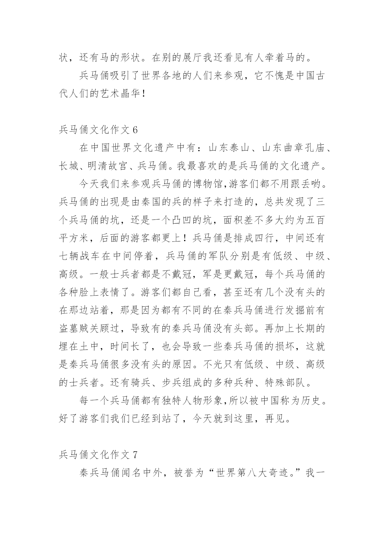 兵马俑文化作文兵马俑文化作文(精选12篇)在学习、工作乃至生活中,说到作文,大家肯定都不陌生吧,作文一定要做到主题集中,围绕同一主题作深入阐述,切忌东拉西扯,主题涣散甚至无主题。那么问题来了,到底应如何写一篇优秀的作文呢?下面是小编整理的兵马俑文化作文,希望能够帮助到大家。兵马俑文化作文1同学们,你们知道什么是秦始皇兵马俑吗?如果不知道,那就让我来告诉你吧!秦始皇兵马俑的位置你们知道吗?它在今陕西省西安市临潼区秦始皇陵以东1.5千米处的兵马俑坑内。里面的士兵站立不动,其中有一位非常严厉,他皱着深厚的眉毛,睁开他的眼睛,张着嘴巴,像是在说:“冲啊。”那一排排兵马俑站得很有神,他们的表情像是憧憬着美好的未来。兵马俑是每位劳动者的技艺结晶,也是每个中国人的荣耀和骄傲!兵马俑,即秦始皇兵马俑,亦简称秦兵马俑或秦俑。第一批全国重点文物保护单位,第一批中国世界文化遗产。后来,我问了一些关于兵马俑问题,得知兵马俑是古代墓葬雕塑的一个类别,古代实行人殉,奴隶是奴隶主生前的附属品。就因为在以前,秦始皇死后,士兵们也要陪葬,所以兵马俑才被塑造的。兵马俑与真人真马真车均为1比1比例制成,用陕西渭水泥土烧制而成。最小的1.68,最高的1.97。通体涂有彩绘,由于秦代用矿物质染料着色,所以有一种紫色令人大吃一惊,据说这种成分的颜料在自然界没有的,需要高科技合成才能做到。身为祖国未来的接班人,我一定要为祖国的繁荣昌盛贡献出自己的力量,让更多人了解中国的历史文化。兵马俑文化作文2“秦兵马俑的发现是世界的奇迹,民族的骄傲”,这是李光耀所说的。今天我们来到兵马俑馆,最令人印象深刻的应当是二号坑了吧。这坑中布阵复杂,兵种齐全。有的眉头紧皱,面容严肃,似乎在思考着什么。还有的神情悲伤,目视远方,好似在思念着远方的亲友,想着他们此时在做什么,是否也在思念着自己。也悲伤着因为在外待的时间之久,没有花时间与亲人相处,团聚。有的目光坚毅,想着如何对抗敌人,在敌人来时不顾一切,为国捐躯!这些秦俑,都如同一个个鲜活的生命般演绎着秦朝的故事……当看到这些壮观的兵马俑,也不禁想起一个人,就是这兵马俑建造的领导者秦始皇。秦始皇使秦朝成为我国历史上第一个统一的中央集权的封建国家,秦始皇对我国历史作出过巨大贡献。但同时他也有昏庸的一面。他广建宫殿陵墓,浪费了大量人力、物力、财力,影响了人民正常的生产和生活;使人民生活在水深火热之中,多少的人民被强迫拉去修建陵墓,并由于条件的艰苦许多人都再也没有机会回去看看亲人,去重见外面的世界。阳光照射下来,秦俑闪闪发光,他们的眼神坚毅,似乎在诉说着一个不为人知的故事……兵马俑文化作文37月22日的上午,我和爸爸一起到西安兵马俑博物馆参观。我们首先请了一个导游,那个导游讲得太快了,大部分我都没听明白。但是我还是听懂了我觉得最有趣的两个:“签名”和“一号坑”。给我签名的人是个姓杨的老爷爷。他是发现兵马俑的第一个人。听说,他在村南打井,没有打到水,而意外地打到了一些破碎的陶俑和古代青铜兵器,于是他马上告诉了文物管理部门,管理部门的领导马上派人来挖掘,挖了许多,但是还有一些不能挖出来。刚刚挖出来是彩色的,被太阳一晒,就变成了灰色。一直要等到研究出来一种防止退颜色的技术才能再挖。杨爷爷在我买的《梦幻的军团》书上的第一页签名。杨爷爷从来没有上过学,又是怎样给我签名的呢?而他为什么字写得那么好呢?原来,他以前都是用印指头来签名的,可是,一次有一个人说:“现在世界都这么发达了,可你的签名还是印手指头,那多没意思啊!”于是有人教会了他签名,他签名的时候好像画画一样,是一笔写成的。现在我该讲一号坑了,那里面的兵马俑跟真人差不多,是用泥土烧成的。这些兵都是来保护皇帝的坟墓的,而且这些士兵千姿百态,有的拿刀,有的拿枪;有的蹲着,有的站着……看了兵马俑博物馆,我感觉到了我们中国历史是那么的美丽。兵马俑文化作文4我去过无数人赞叹的兰亭,去过水平如镜的西湖,但在我印象最深刻的却是西安的兵马俑。来到兵马俑,只见外面是一片小树林。我们在经过这一片树林的时候,蝉唱得异常的响,仿佛在为我们歌唱大自然之歌,里面的小溪在为这首大自然之歌伴奏。中午,我们终于到了兵马俑一号坑。兵马俑一个个惟妙惟肖。我在想,古人没有高科技就能造出这样的兵马俑,每个脸部表情都不一样,我们中国人的科技不是在进步,而是在退步!中午,我们又从兵马俑一号坑到了放战车的地方,第一架战车后面就像我们平常坐的黄包车。第二架战车和第一架战车的前面都有一个东西,那个东西上面有刺,上面又有把为了让战马不跑出去的东西。这个不知名的东西,让战马不会离太远,也不会让战马离太近。啊!古代劳动人民可真是又勤劳又智慧啊!你们虽然没有我们现在的机器人也没有可以调温度的煤气,只有一双双灵活的手却造出了让21世纪全球人民震撼的兵马俑。你们造出的兵马