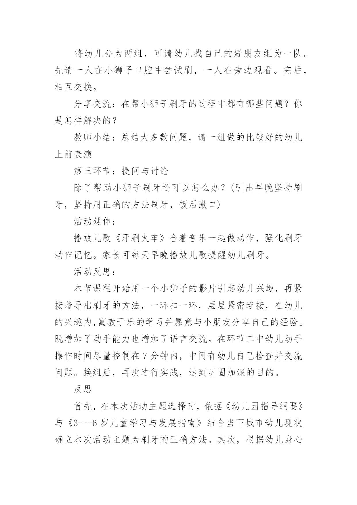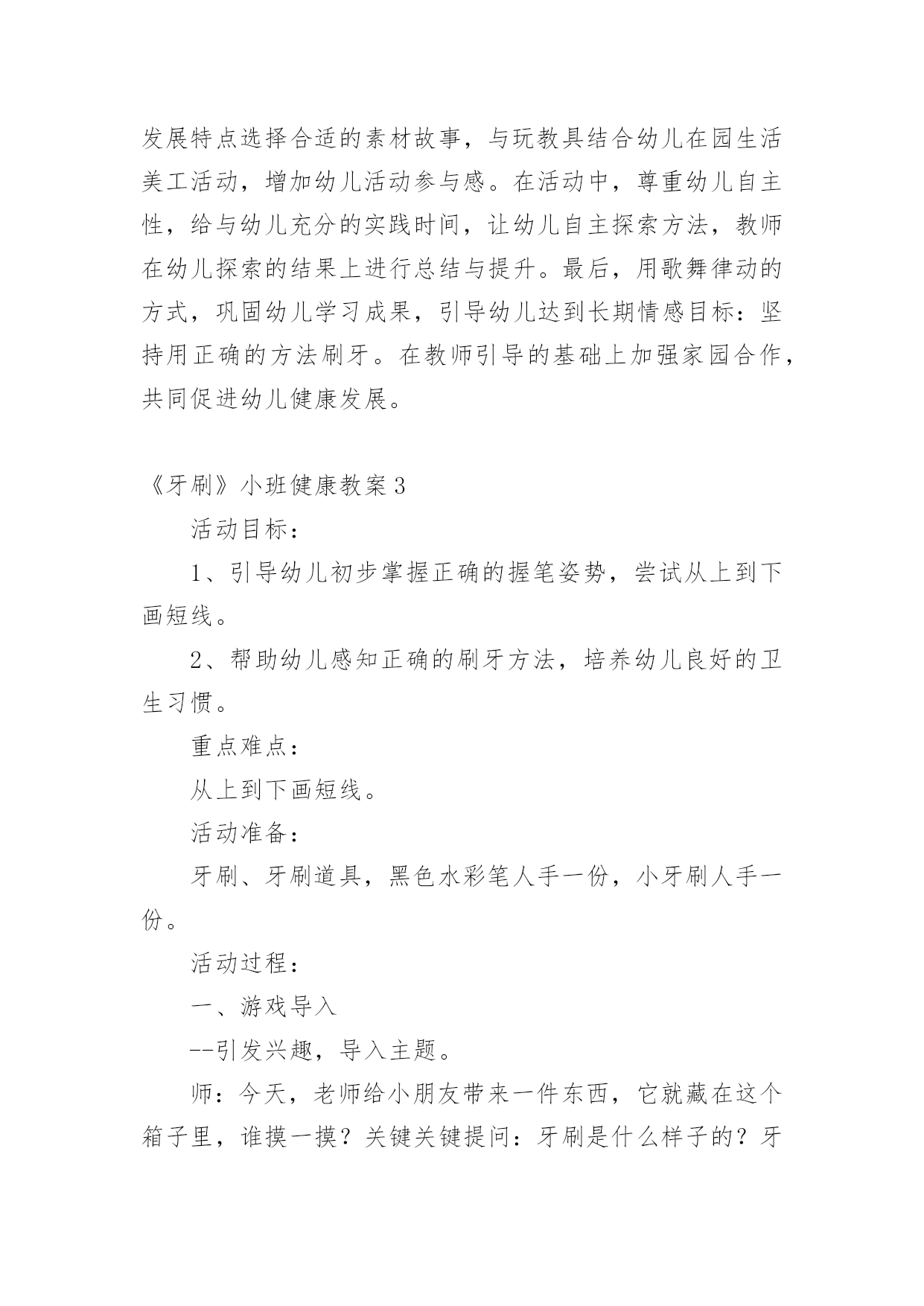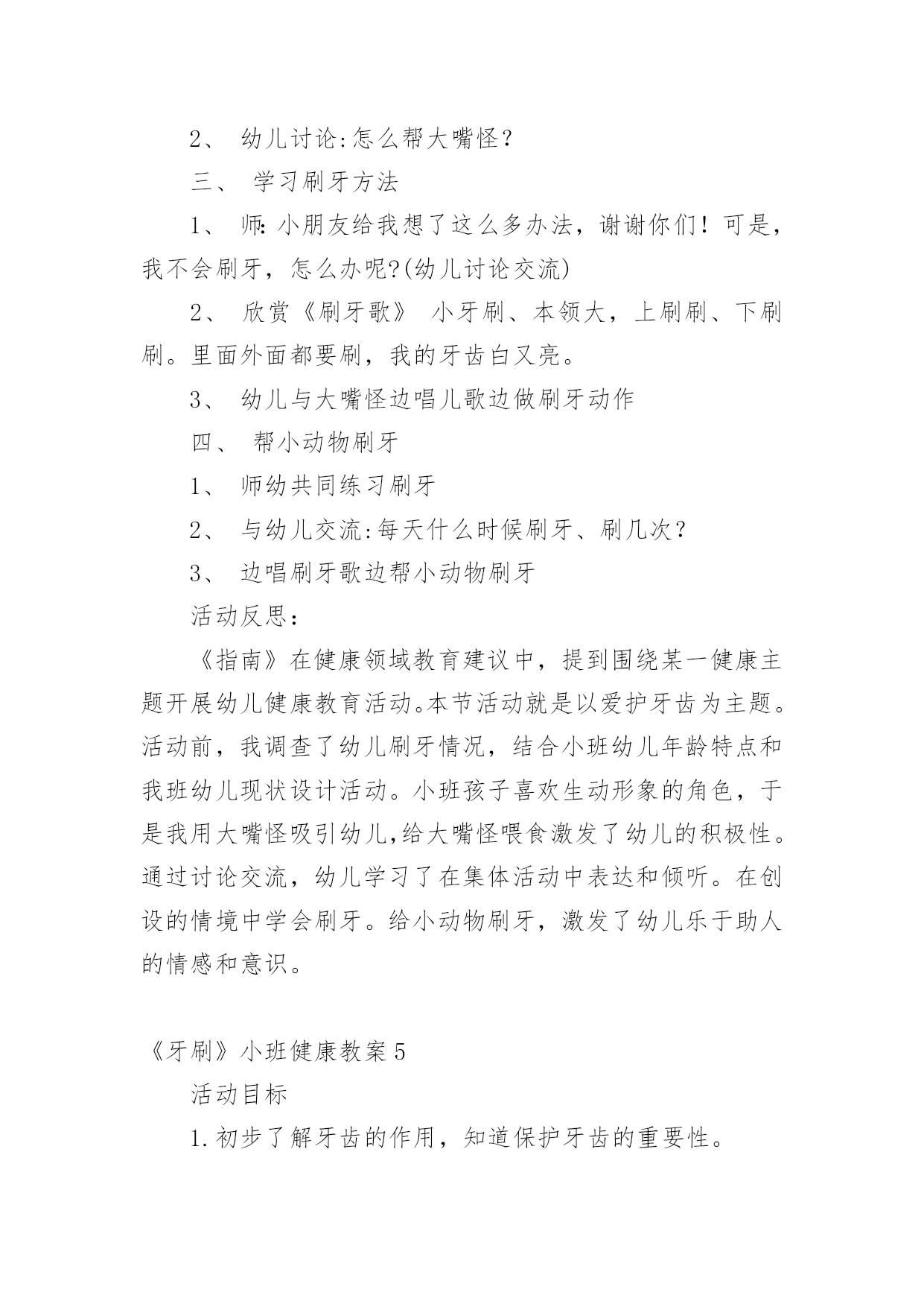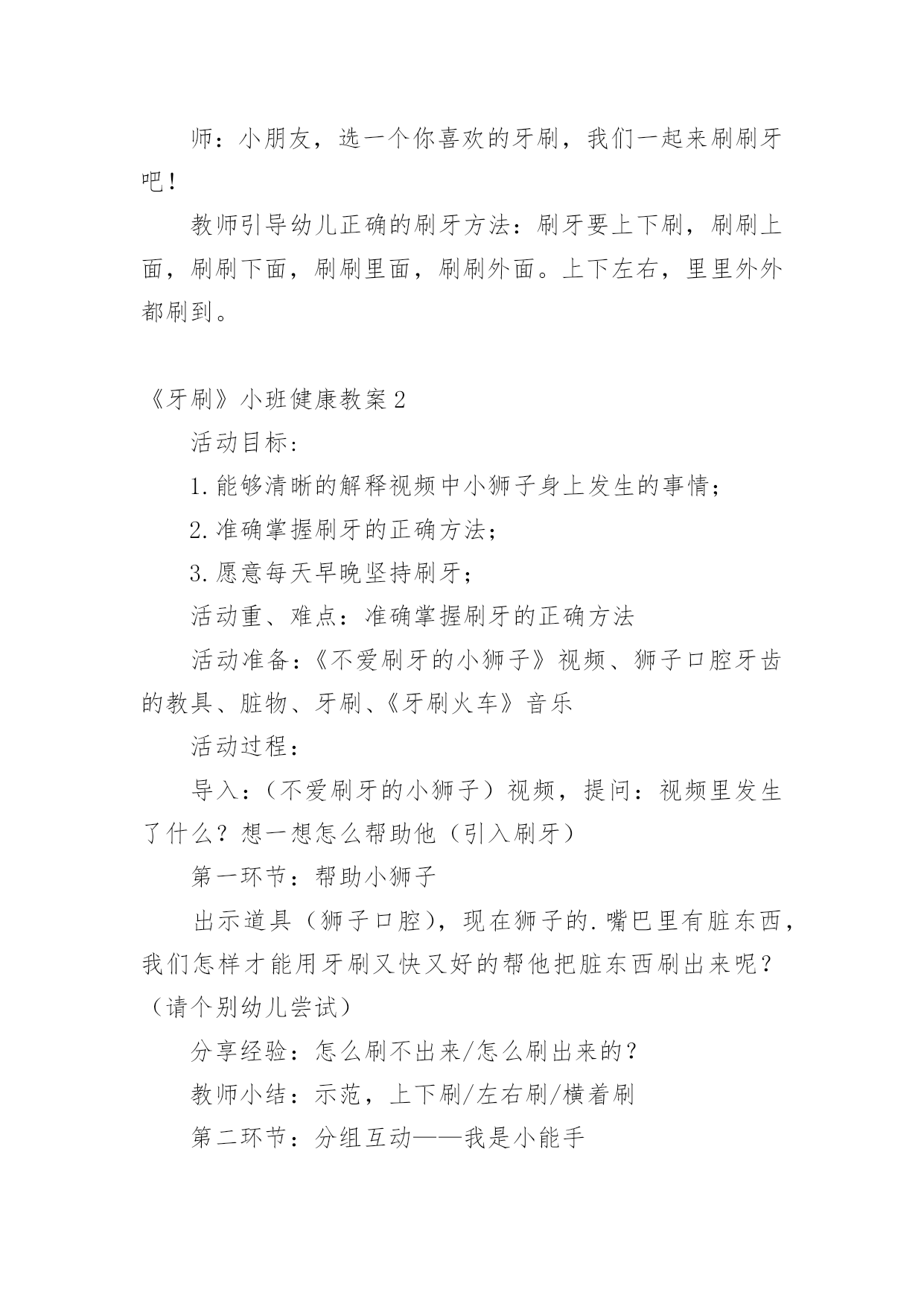 《牙刷》小班健康教案作为一位杰出的老师,很有必要精心设计一份教案,教案有助于学生理解并掌握系统的知识。如何把教案做到重点突出呢?以下是小编整理的《牙刷》小班健康教案,希望能够帮助到大家。《牙刷》小班健康教案1活动名称:牙刷设计思路:从小养成良好的个人卫生习惯,对孩子一生的口腔卫生和个人生活习惯都会有很大的影响和改变。小班大多孩子在家都有了早上刷牙的习惯,但对于晚上睡前刷牙以及正确的刷牙方法了解的并不多。于是,我在《小宝宝》主题下设计了本次活动,在富有情境的`"牙刷一家"的故事中,让孩子们感知正确的刷牙方法,养成良好的个人卫生习惯。活动目标:1、引导幼儿初步掌握正确的握笔姿势,尝试从上到下画短线。2、帮助幼儿感知正确的刷牙方法,培养幼儿良好的卫生习惯。重难点:从上到下画短线。活动准备:牙刷、牙刷道具,黑色水彩笔人手一份,小牙刷人手一份。活动过程:一、游戏导入--引发兴趣,导入主题。师:今天,老师给小朋友带来一件东西,它就藏在这个箱子里,谁摸一摸?关键关键提问:牙刷是什么样子的?牙刷是用来干什么的?我们都在什么时候刷牙?小结:我们每天早晨起床后,晚上睡觉前都要用牙刷刷牙,把牙刷得干干净净,这样,我们的小牙齿就不会长蛀虫,就不会疼。二、示范操作、添画刷毛--初步掌握正确的握笔姿势,尝试从上到下画短线。师:今天,有位客人来我们这儿做客了,我们一起欢迎它们吧。出示牙刷爸爸、牙刷妈妈:大家好,我是牙刷爸爸!大家好,我是牙刷妈妈!关键提问:你们看牙刷爸爸和牙刷妈妈有什么不同?牙刷妈妈为什么哭呢?我们想个什么办法来帮助牙刷妈妈呢?示范:小朋友认真看老师怎样给牙刷妈妈画上刷毛的。示范讲解画法:笔宝宝握握紧,从上往下画,一根挨一根。引导语:小刷毛,排好队。一根挨一根,排得真整齐。幼儿操作三、交流分享--帮助幼儿感知正确的刷牙方法,培养幼儿良好的卫生习惯。师:小朋友,选一个你喜欢的牙刷,我们一起来刷刷牙吧!教师引导幼儿正确的刷牙方法:刷牙要上下刷,刷刷上面,刷刷下面,刷刷里面,刷刷外面。上下左右,里里外外都刷到。《牙刷》小班健康教案2活动目标:1.能够清晰的解释视频中小狮子身上发生的事情;2.准确掌握刷牙的正确方法;3.愿意每天早晚坚持刷牙;活动重、难点:准确掌握刷牙的正确方法活动准备:《不爱刷牙的小狮子》视频、狮子口腔牙齿的教具、脏物、牙刷、《牙刷火车》音乐活动过程:导入:(不爱刷牙的小狮子)视频,提问:视频里发生了什么?想一想怎么帮助他(引入刷牙)第一环节:帮助小狮子出示道具(狮子口腔),现在狮子的.嘴巴里有脏东西,我们怎样才能用牙刷又快又好的帮他把脏东西刷出来呢?(请个别幼儿尝试)分享经验:怎么刷不出来/怎么刷出来的?教师小结:示范,上下刷/左右刷/横着刷第二环节:分组互动——我是小能手将幼儿分为两组,可请幼儿找自己的好朋友组为一队。先请一人在小狮子口腔中尝试刷,一人在旁边观看。完后,相互交换。分享交流:在帮小狮子刷牙的过程中都有哪些问题?你是怎样解决的?教师小结:总结大多数问题,请一组做的比较好的幼儿上前表演第三环节:提问与讨论除了帮助小狮子刷牙还可以怎么办?(引出早晚坚持刷牙,坚持用正确的方法刷牙,饭后漱口)活动延伸:播放儿歌《牙刷火车》合着音乐一起做动作,强化刷牙动作记忆。家长可每天早晚播放儿歌提醒幼儿刷牙。活动反思:本节课程开始用一个小狮子的影片引起幼儿兴趣,再紧接着导出刷牙的方法,一环扣一环,层层紧密连接,在幼儿的兴趣内,寓教于乐的学习并愿意与小朋友分享自己的经验。既增加了动手能力也增加了语言交流。在环节二中幼儿动手操作时间尽量控制在7分钟内,中间有幼儿自己检查并交流问题。换组后,再次进行实践,达到巩固加深的目的。反思首先,在本次活动主题选择时,依据《幼儿园指导纲要》与《3---6岁儿童学习与发展指南》结合当下城市幼儿现状确立本次活动主题为刷牙的正确方法。其次,根据幼儿身心发展特点选择合适的素材故事,与玩教具结合幼儿在园生活美工活动,增加幼儿活动参与感。在活动中,尊重幼儿自主性,给与幼儿充分的实践时间,让幼儿自主探索方法,教师在幼儿探索的结果上进行总结与提升。最后,用歌舞律动的方式,巩固幼儿学习成果,引导幼儿达到长期情感目标:坚持用正确的方法刷牙。在教师引导的基础上加强家园合作,共同促进幼儿健康发展。《牙刷》小班健康教案3活动目标:1、引导幼儿初步掌握正确的握笔姿势,尝试从上到下画短线。2、帮助幼儿感知正确的刷牙方法,培养幼儿良好的卫生习惯。重点难点:从上到下画短线。活动准备:牙刷、牙刷道具,黑色水彩笔人手一份,小牙刷人手一份。活动过程:一、游戏导入--引发兴趣,导入主题。师:今天,老师给小朋友带来一件东西,它就藏在这个箱子里,谁摸一摸?关键关键提问:牙刷是什么样子的?牙刷是用来干什么的?我们都在什么时候刷牙?小结:我们每天早晨