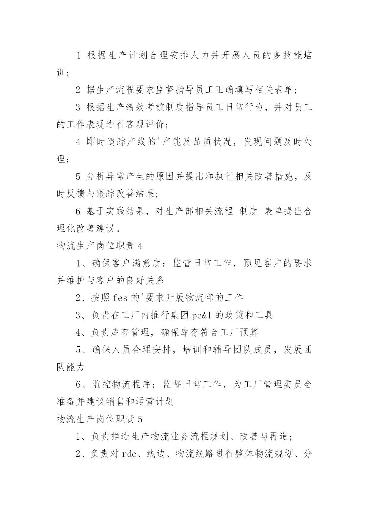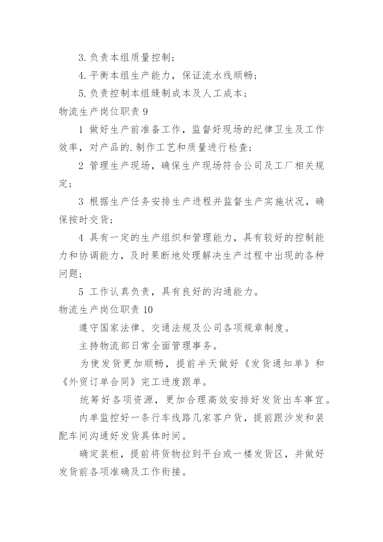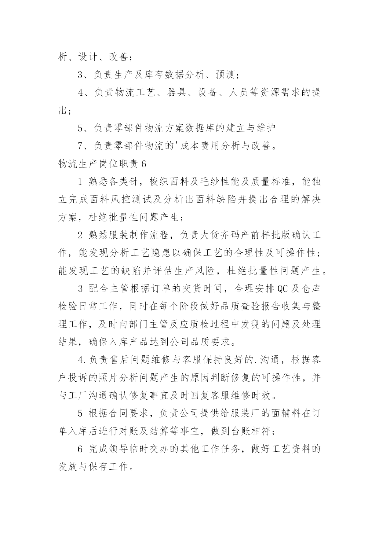 物流生产岗位职责物流生产岗位职责现如今,岗位职责的使用频率逐渐增多,制定岗位职责有助于提高内部竞争活力,提高工作效率。我敢肯定,大部分人都对制定岗位职责很是头疼的,以下是小编为大家收集的物流生产岗位职责,欢迎大家分享。物流生产岗位职责11.员工日常管理,新员工技能培训;2.主导车间5S,协助生产流程改善;3.根据工作任务安排小组生产计划,确保符合交货时间表,保证产品质量;4.公司相关资质协助办理;5.其它上司安排的工作。物流生产岗位职责21主持班早会例会,正确传达上级指示文件;2按车间下达的生产指标组织生产任务的'实施并向上级报告生产完成情况;3根据生产需要进行现场指导巡视监督检查本工段生产线各项工作;4根据生产订单情况。合理的调配生产线操作工人;5完成上级领导安排的其他工作。物流生产岗位职责31根据生产计划合理安排人力并开展人员的多技能培训;2据生产流程要求监督指导员工正确填写相关表单;3根据生产绩效考核制度指导员工日常行为,并对员工的工作表现进行客观评价;4即时追踪产线的'产能及品质状况,发现问题及时处理;5分析异常产生的原因并提出和执行相关改善措施,及时反馈与跟踪改善结果;6基于实践结果,对生产部相关流程制度表单提出合理化改善建议。物流生产岗位职责41、确保客户满意度:监管日常工作,预见客户的要求并维护与客户的良好关系2、按照fes的'要求开展物流部的工作3、负责在工厂内推行集团pc&l的政策和工具4、负责库存管理,确保库存符合工厂预算5、确保人员合理安排,培训和辅导团队成员,发展团队能力6、监控物流程序:监督日常工作,为工厂管理委员会准备并建议销售和运营计划物流生产岗位职责51、负责推进生产物流业务流程规划、改善与再造;2、负责对rdc、线边、物流线路进行整体物流规划、分析、设计、改善;3、负责生产及库存数据分析、预测;4、负责物流工艺、器具、设备、人员等资源需求的提出;5、负责零部件物流方案数据库的建立与维护7、负责零部件物流的'成本费用分析与改善。物流生产岗位职责61熟悉各类针,梭织面料及毛纱性能及质量标准,能独立完成面料风控测试及分析出面料缺陷并提出合理的解决方案,杜绝批量性问题产生;2熟悉服装制作流程,负责大货齐码产前样批版确认工作,能发现分析工艺隐患以确保工艺的合理性及可操作性;能发现工艺的缺陷并评估生产风险,杜绝批量性问题产生。3配合主管根据订单的交货时间,合理安排QC及仓库检验日常工作,同时在每个阶段做好品质查验报告收集与整理工作,及时向部门主管反应质检过程中发现的问题及处理结果,确保入库产品达到公司品质要求。4.负责售后问题维修与客服保持良好的.沟通,根据客户投诉的照片分析问题产生的原因判断修复的可操作性,并与工厂沟通确认修复事宜及时回复客服维修时效。5根据合同要求,负责公司提供给服装厂的面辅料在订单入库后进行对账及结算等事宜,做到台账相符;6完成领导临时交办的其他工作任务,做好工艺资料的发放与保存工作。7熟练运用EXCELWPS等办公软件进行各种数据分析资料汇编。8责任心强,做事细致;执行力强,有上进心;吃苦耐劳,学习能力强;物流生产岗位职责71、负责分公司全面生产管理,保证准时交货。2、严格按产量考核,对于消极怠工员工、操作能力极差员工,及时给予警告和解聘。3、培养和提升班长的业务能力和管理水平,监督各生产班组生产情况,真实填报各项表单。4、负责生产现场综合管理,制定车间现场管理标准,执行公司5s管理标准,杜绝现场生产各种违规现象,确保生产有序进行。5、严格执行工艺纪律,确保产品质量;参与产品质量的可追溯性管理并贯彻落实。6、配合工程技术人员进行新产品对接工作,持续改进和提高老产品质量。7、根据工艺文件,调整生产节拍,保持生产处于xxx状态。8、控制生产成本,确保生产中部出现批量质量事故。物流生产岗位职责81.根据生产计划安排产线员工工作,再计划内时间保质保量完成生产任务;2.负责指导产线员工工作,解决缝制过程中出现的问题;3.负责本组质量控制;4.平衡本组生产能力,保证流水线顺畅;5.负责控制本组缝制成本及人工成本;物流生产岗位职责91做好生产前准备工作,监督好现场的纪律卫生及工作效率,对产品的.制作工艺和质量进行检查;2管理生产现场,确保生产现场符合公司及工厂相关规定;3根据生产任务安排生产进程并监督生产实施状况,确保按时交货;4具有一定的生产组织和管理能力,具有较好的控制能力和协调能力,及时果断地处理解决生产过程中出现的各种问题;5工作认真负责,具有良好的沟通能力。物流生产岗位职责10遵守国家法律、交通法规及公司各项规章制度。主持物流部日常全面管理事务。为使发货更加顺畅,提前半天做好《发货通知单》和《外贸订单合同》完工进度跟单。统筹好各项资源,更加合理高效安排好发货出车事宜。内单监控好一条