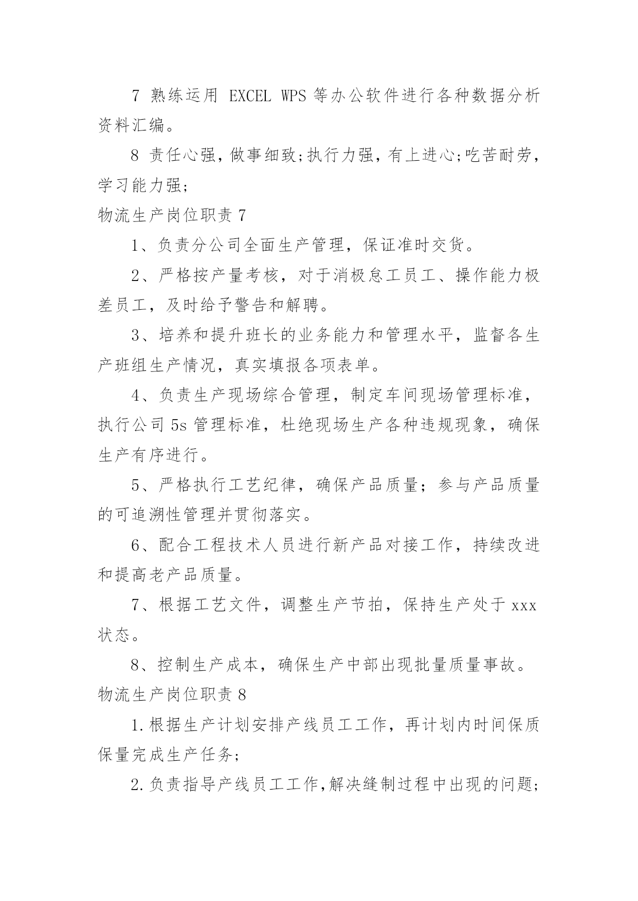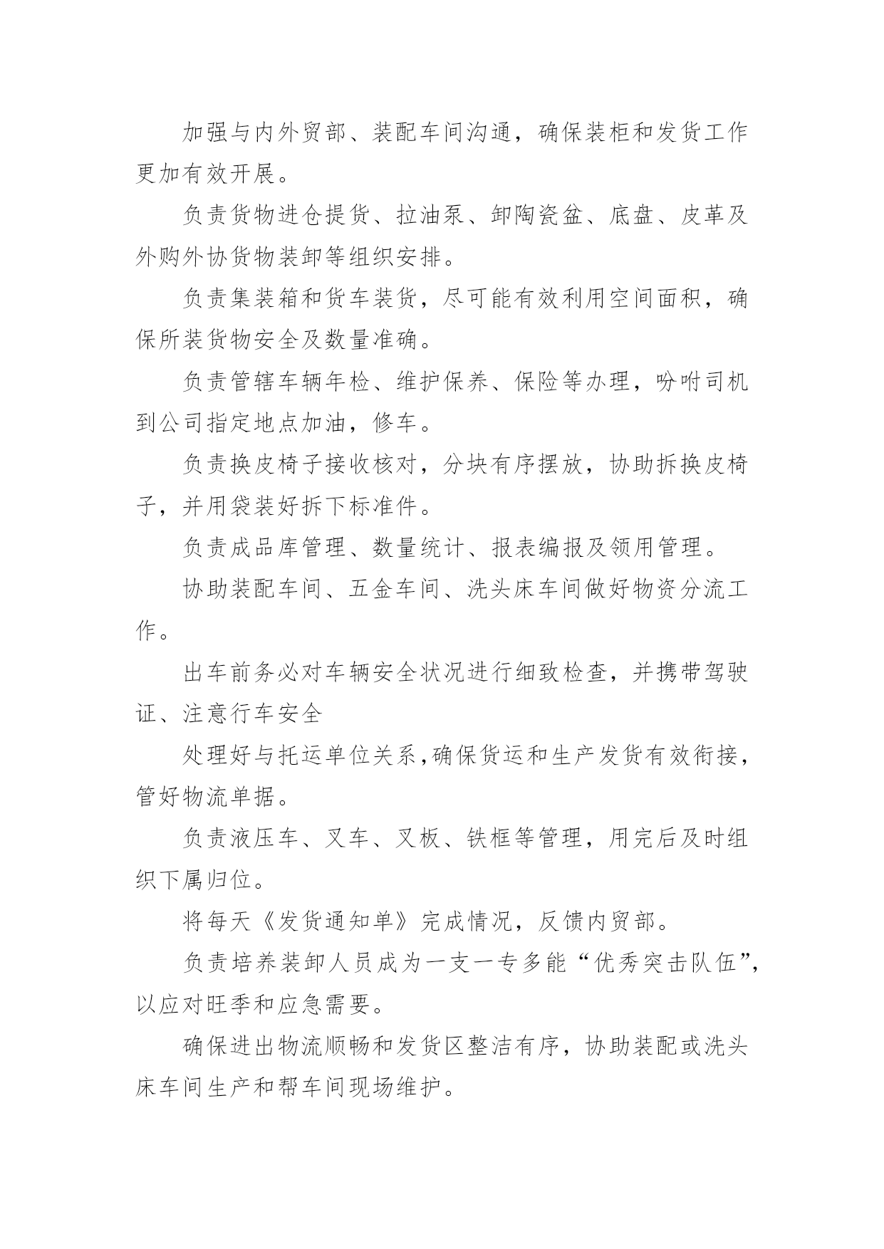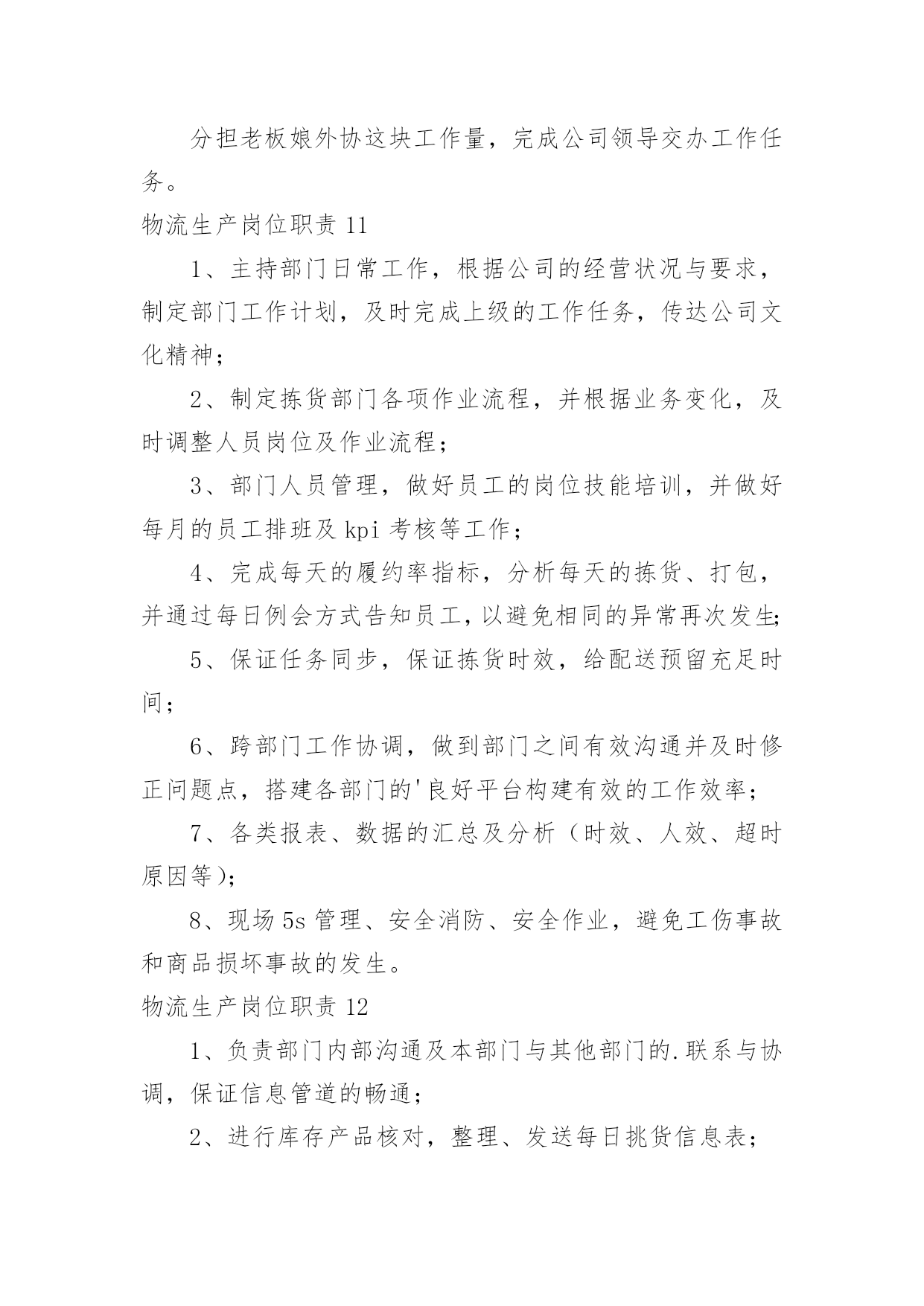 物流生产岗位职责物流生产岗位职责现如今,岗位职责的使用频率逐渐增多,制定岗位职责有助于提高内部竞争活力,提高工作效率。我敢肯定,大部分人都对制定岗位职责很是头疼的,以下是小编为大家收集的物流生产岗位职责,欢迎大家分享。物流生产岗位职责11.员工日常管理,新员工技能培训;2.主导车间5S,协助生产流程改善;3.根据工作任务安排小组生产计划,确保符合交货时间表,保证产品质量;4.公司相关资质协助办理;5.其它上司安排的工作。物流生产岗位职责21主持班早会例会,正确传达上级指示文件;2按车间下达的生产指标组织生产任务的'实施并向上级报告生产完成情况;3根据生产需要进行现场指导巡视监督检查本工段生产线各项工作;4根据生产订单情况。合理的调配生产线操作工人;5完成上级领导安排的其他工作。物流生产岗位职责31根据生产计划合理安排人力并开展人员的多技能培训;2据生产流程要求监督指导员工正确填写相关表单;3根据生产绩效考核制度指导员工日常行为,并对员工的工作表现进行客观评价;4即时追踪产线的'产能及品质状况,发现问题及时处理;5分析异常产生的原因并提出和执行相关改善措施,及时反馈与跟踪改善结果;6基于实践结果,对生产部相关流程制度表单提出合理化改善建议。物流生产岗位职责41、确保客户满意度:监管日常工作,预见客户的要求并维护与客户的良好关系2、按照fes的'要求开展物流部的工作3、负责在工厂内推行集团pc&l的政策和工具4、负责库存管理,确保库存符合工厂预算5、确保人员合理安排,培训和辅导团队成员,发展团队能力6、监控物流程序:监督日常工作,为工厂管理委员会准备并建议销售和运营计划物流生产岗位职责51、负责推进生产物流业务流程规划、改善与再造;2、负责对rdc、线边、物流线路进行整体物流规划、分析、设计、改善;3、负责生产及库存数据分析、预测;4、负责物流工艺、器具、设备、人员等资源需求的提出;5、负责零部件物流方案数据库的建立与维护7、负责零部件物流的'成本费用分析与改善。物流生产岗位职责61熟悉各类针,梭织面料及毛纱性能及质量标准,能独立完成面料风控测试及分析出面料缺陷并提出合理的解决方案,杜绝批量性问题产生;2熟悉服装制作流程,负责大货齐码产前样批版确认工作,能发现分析工艺隐患以确保工艺的合理性及可操作性;能发现工艺的缺陷并评估生产风险,杜绝批量性问题产生。3配合主管根据订单的交货时间,合理安排QC及仓库检验日常工作,同时在每个阶段做好品质查验报告收集与整理工作,及时向部门主管反应质检过程中发现的问题及处理结果,确保入库产品达到公司品质要求。4.负责售后问题维修与客服保持良好的.沟通,根据客户投诉的照片分析问题产生的原因判断修复的可操作性,并与工厂沟通确认修复事宜及时回复客服维修时效。5根据合同要求,负责公司提供给服装厂的面辅料在订单入库后进行对账及结算等事宜,做到台账相符;6完成领导临时交办的其他工作任务,做好工艺资料的发放与保存工作。7熟练运用EXCELWPS等办公软件进行各种数据分析资料汇编。8责任心强,做事细致;执行力强,有上进心;吃苦耐劳,学习能力强;物流生产岗位职责71、负责分公司全面生产管理,保证准时交货。2、严格按产量考核,对于消极怠工员工、操作能力极差员工,及时给予警告和解聘。3、培养和提升班长的业务能力和管理水平,监督各生产班组生产情况,真实填报各项表单。4、负责生产现场综合管理,制定车间现场管理标准,执行公司5s管理标准,杜绝现场生产各种违规现象,确保生产有序进行。5、严格执行工艺纪律,确保产品质量;参与产品质量的可追溯性管理并贯彻落实。6、配合工程技术人员进行新产品对接工作,持续改进和提高老产品质量。7、根据工艺文件,调整生产节拍,保持生产处于xxx状态。8、控制生产成本,确保生产中部出现批量质量事故。物流生产岗位职责81.根据生产计划安排产线员工工作,再计划内时间保质保量完成生产任务;2.负责指导产线员工工作,解决缝制过程中出现的问题;3.负责本组质量控制;4.平衡本组生产能力,保证流水线顺畅;5.负责控制本组缝制成本及人工成本;物流生产岗位职责91做好生产前准备工作,监督好现场的纪律卫生及工作效率,对产品的.制作工艺和质量进行检查;2管理生产现场,确保生产现场符合公司及工厂相关规定;3根据生产任务安排生产进程并监督生产实施状况,确保按时交货;4具有一定的生产组织和管理能力,具有较好的控制能力和协调能力,及时果断地处理解决生产过程中出现的各种问题;5工作认真负责,具有良好的沟通能力。物流生产岗位职责10遵守国家法律、交通法规及公司各项规章制度。主持物流部日常全面管理事务。为使发货更加顺畅,提前半天做好《发货通知单》和《外贸订单合同》完工进度跟单。统筹好各项资源,更加合理高效安排好发货出车事宜。内单监控好一条