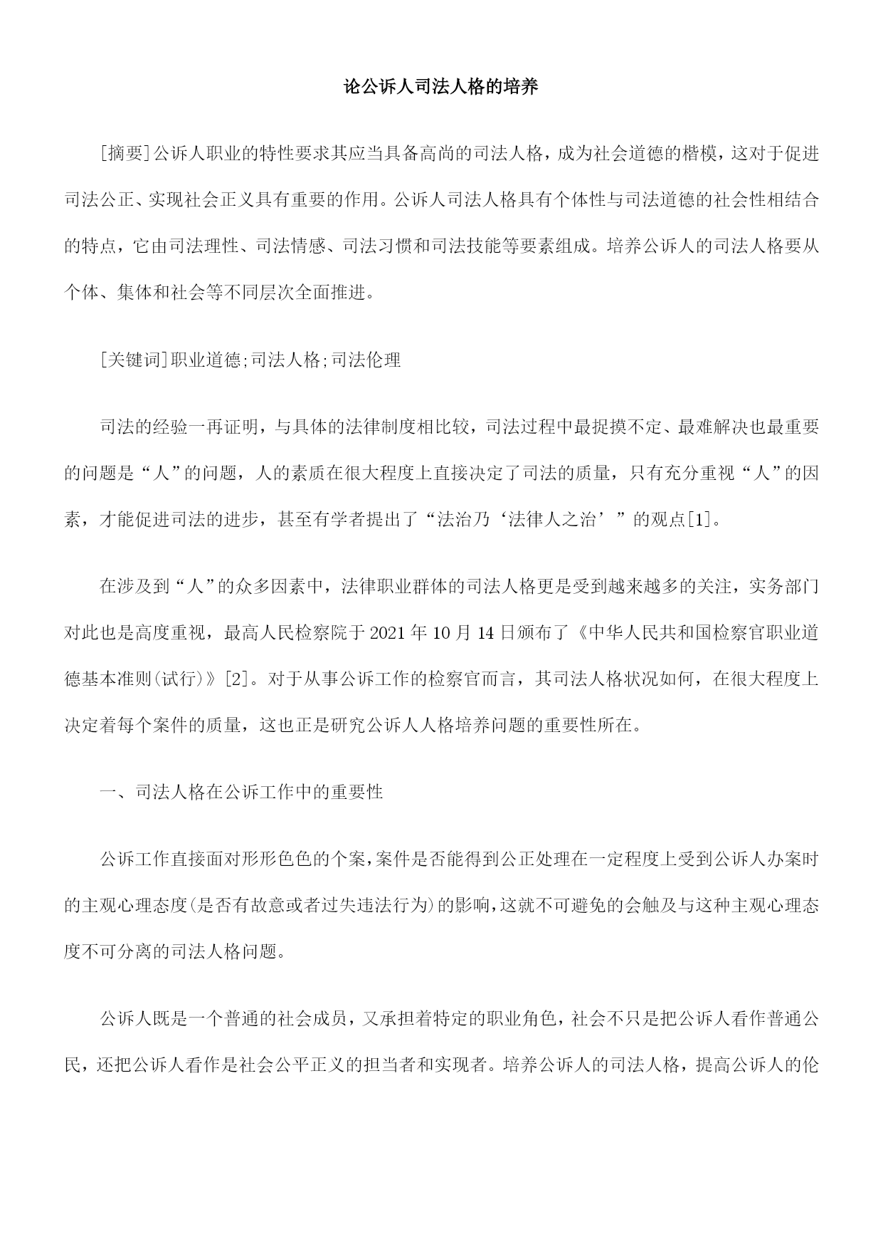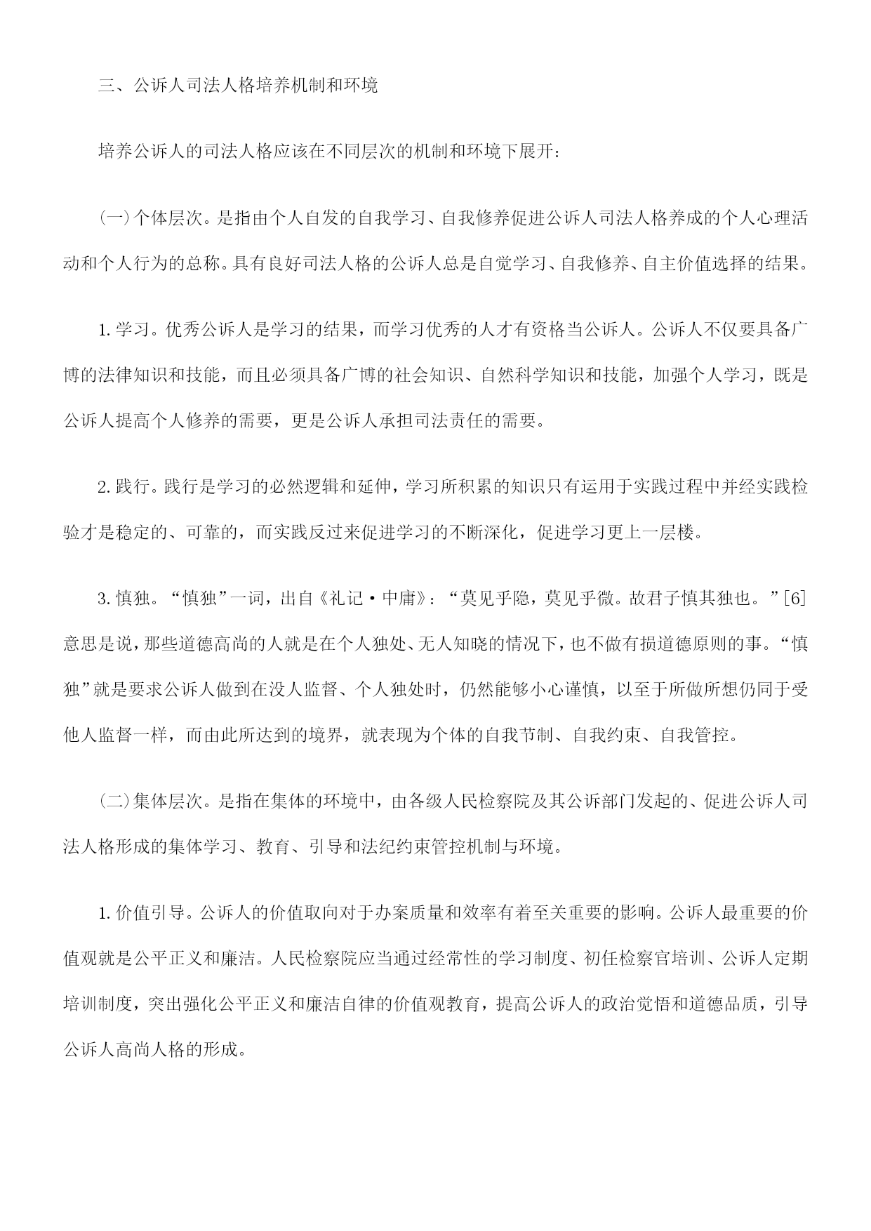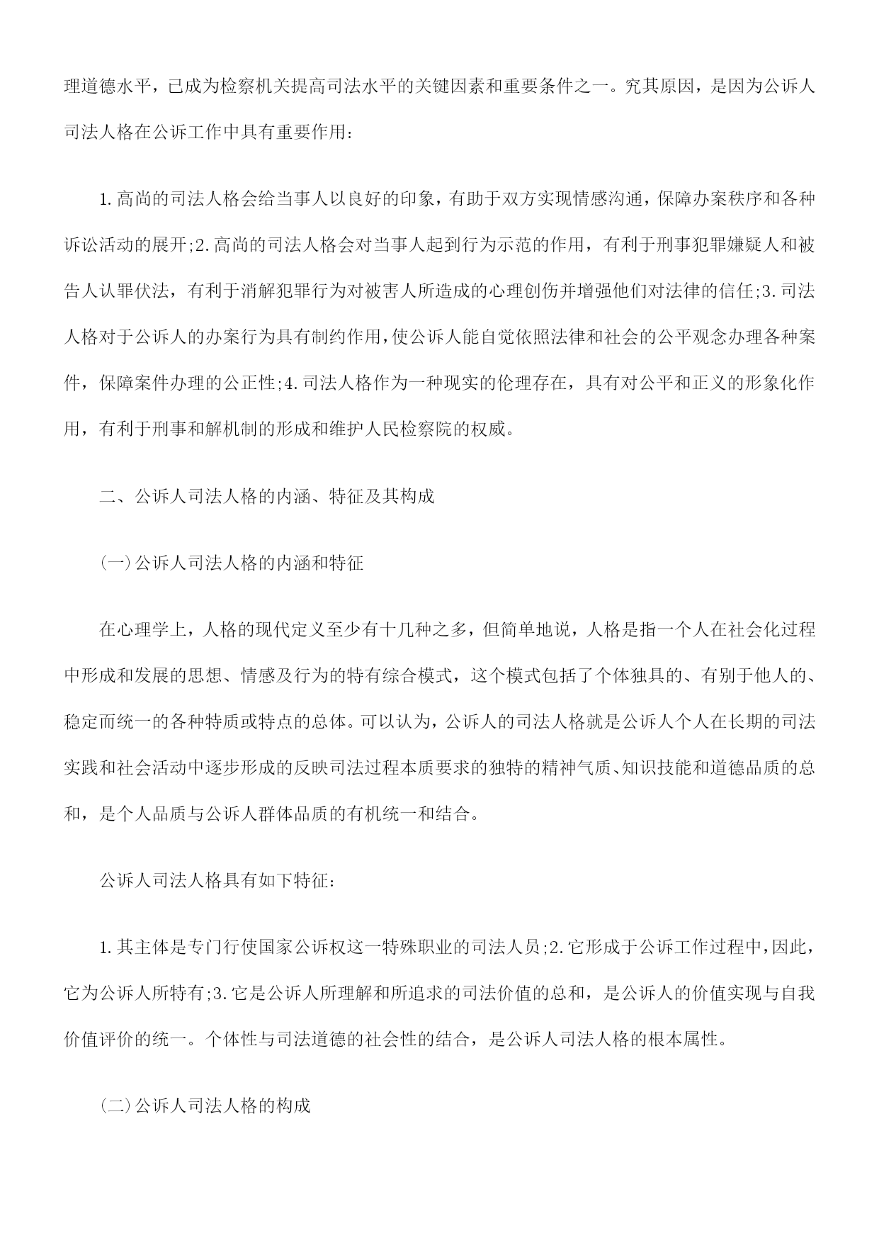论公诉人司法人格的培养(完整版)实用资料(可以直接使用,可编辑完整版实用资料,欢迎下载)论公诉人司法人格的培养[摘要]公诉人职业的特性要求其应当具备高尚的司法人格,成为社会道德的楷模,这对于促进司法公正、实现社会正义具有重要的作用。公诉人司法人格具有个体性与司法道德的社会性相结合的特点,它由司法理性、司法情感、司法习惯和司法技能等要素组成。培养公诉人的司法人格要从个体、集体和社会等不同层次全面推进。[关键词]职业道德;司法人格;司法伦理司法的经验一再证明,与具体的法律制度相比较,司法过程中最捉摸不定、最难解决也最重要的问题是“人”的问题,人的素质在很大程度上直接决定了司法的质量,只有充分重视“人”的因素,才能促进司法的进步,甚至有学者提出了“法治乃‘法律人之治’”的观点[1]。在涉及到“人”的众多因素中,法律职业群体的司法人格更是受到越来越多的关注,实务部门对此也是高度重视,最高人民检察院于2021年10月14日颁布了《中华人民共和国检察官职业道德基本准则(试行)》[2]。对于从事公诉工作的检察官而言,其司法人格状况如何,在很大程度上决定着每个案件的质量,这也正是研究公诉人人格培养问题的重要性所在。一、司法人格在公诉工作中的重要性公诉工作直接面对形形色色的个案,案件是否能得到公正处理在一定程度上受到公诉人办案时的主观心理态度(是否有故意或者过失违法行为)的影响,这就不可避免的会触及与这种主观心理态度不可分离的司法人格问题。公诉人既是一个普通的社会成员,又承担着特定的职业角色,社会不只是把公诉人看作普通公民,还把公诉人看作是社会公平正义的担当者和实现者。培养公诉人的司法人格,提高公诉人的伦理道德水平,已成为检察机关提高司法水平的关键因素和重要条件之一。究其原因,是因为公诉人司法人格在公诉工作中具有重要作用:1.高尚的司法人格会给当事人以良好的印象,有助于双方实现情感沟通,保障办案秩序和各种诉讼活动的展开;2.高尚的司法人格会对当事人起到行为示范的作用,有利于刑事犯罪嫌疑人和被告人认罪伏法,有利于消解犯罪行为对被害人所造成的心理创伤并增强他们对法律的信任;3.司法人格对于公诉人的办案行为具有制约作用,使公诉人能自觉依照法律和社会的公平观念办理各种案件,保障案件办理的公正性;4.司法人格作为一种现实的伦理存在,具有对公平和正义的形象化作用,有利于刑事和解机制的形成和维护人民检察院的权威。二、公诉人司法人格的内涵、特征及其构成(一)公诉人司法人格的内涵和特征在心理学上,人格的现代定义至少有十几种之多,但简单地说,人格是指一个人在社会化过程中形成和发展的思想、情感及行为的特有综合模式,这个模式包括了个体独具的、有别于他人的、稳定而统一的各种特质或特点的总体。可以认为,公诉人的司法人格就是公诉人个人在长期的司法实践和社会活动中逐步形成的反映司法过程本质要求的独特的精神气质、知识技能和道德品质的总和,是个人品质与公诉人群体品质的有机统一和结合。公诉人司法人格具有如下特征:1.其主体是专门行使国家公诉权这一特殊职业的司法人员;2.它形成于公诉工作过程中,因此,它为公诉人所特有;3.它是公诉人所理解和所追求的司法价值的总和,是公诉人的价值实现与自我价值评价的统一。个体性与司法道德的社会性的结合,是公诉人司法人格的根本属性。(二)公诉人司法人格的构成公诉人司法人格的具体标准主要反映在《最高人民检察院检察官职业道德基本准则》的规定中,它由不同层次的要素所构成:1.司法理性。司法理性是公诉人最卓越的品格。司法理性的作用,对于个案的裁判而言就在于将普遍性的规范与案件的特殊性因素结合起来,形成一个既能够体现法律的规范性要求,同时能够包容案件特殊性因素的令人信服和接受的结论。对于宏观层面的法治而言则在于通过一整套形式化的程序技术,将实质理性所包含的各种互相竞争的价值主张与形式理性所要求的稳定性、可预见性和持续性协调起来,从而化解法律形式理性与实质理性之间的紧张关系,使多元的社会价值、公民的个人自由和社会的有序发展在法律的调整中得以协调[3]。2.司法情感。司法的运行必须符合公众的文化价值观。司法理性与司法情感并不是当然对立的,相反,它应当反映社会公众普遍共同的精神、情感和意识,只有这样,公众才能对司法产生一种神圣的情感。在司法的运行与公众情感相违背的情形下,就会伤害公众情感,必将遭到公众的抵制。这种观念的冲突要求公诉人在司法过程中,不能机械地适用法条,就案办案,而不考虑社会基本价值观念和公众对社会正义的一般要求,否则作出的处理结果就不会得到公众的认同[4]。3.司法技能。司法技能是指公诉人运用法律专业知识、既定规范、操作规程处理案件的能力,是在审查案件过程中将静态知识转化为动态结果的方式方法,是由已知事实和规范得出新