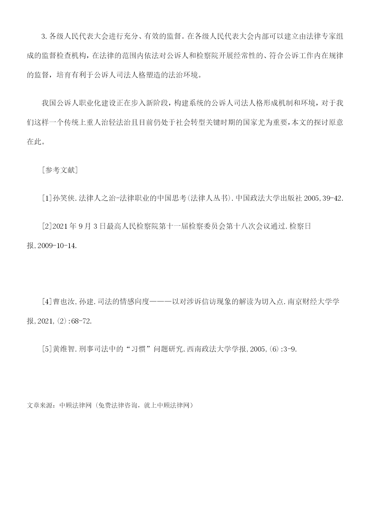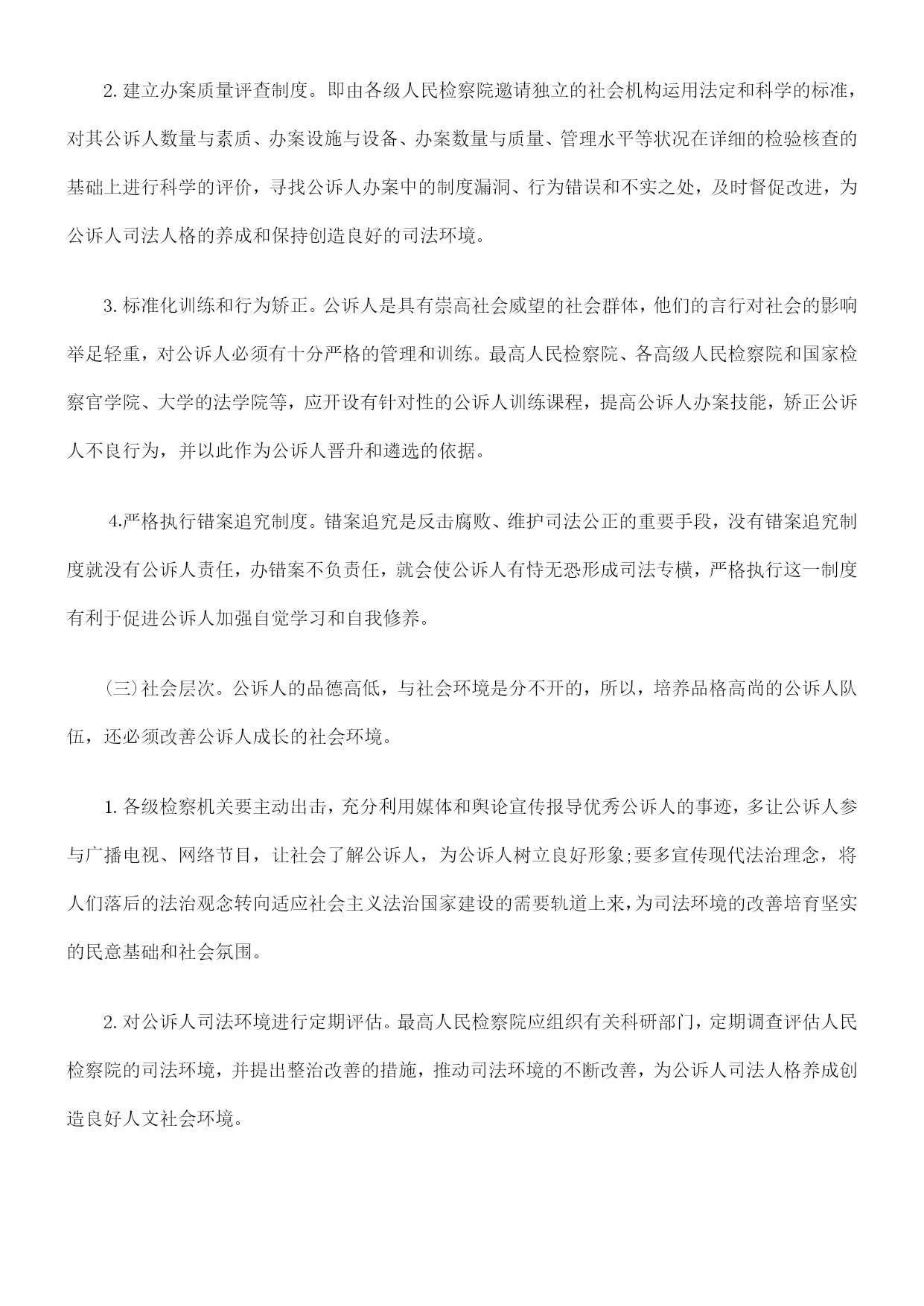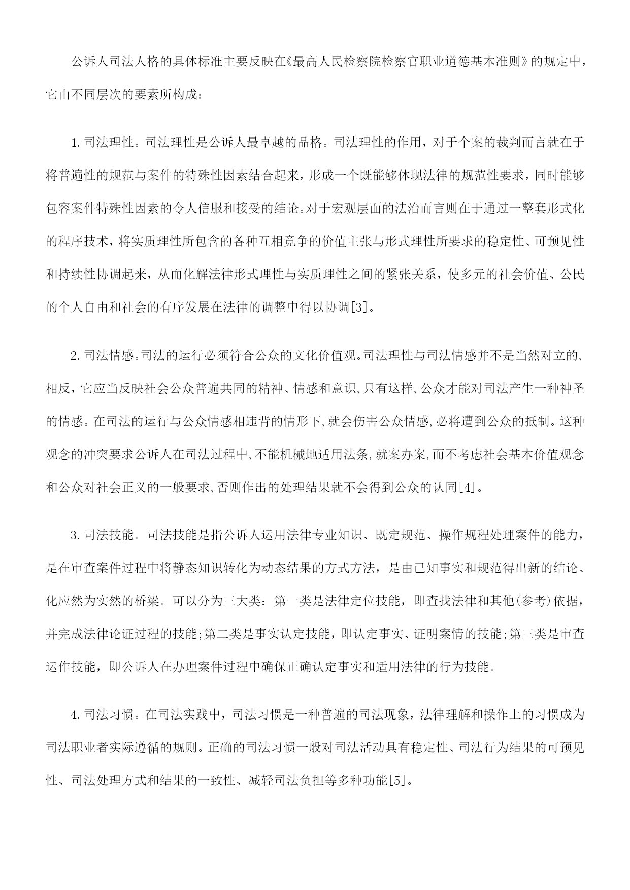 论公诉人司法人格的培养(完整版)实用资料(可以直接使用,可编辑完整版实用资料,欢迎下载)论公诉人司法人格的培养[摘要]公诉人职业的特性要求其应当具备高尚的司法人格,成为社会道德的楷模,这对于促进司法公正、实现社会正义具有重要的作用。公诉人司法人格具有个体性与司法道德的社会性相结合的特点,它由司法理性、司法情感、司法习惯和司法技能等要素组成。培养公诉人的司法人格要从个体、集体和社会等不同层次全面推进。[关键词]职业道德;司法人格;司法伦理司法的经验一再证明,与具体的法律制度相比较,司法过程中最捉摸不定、最难解决也最重要的问题是“人”的问题,人的素质在很大程度上直接决定了司法的质量,只有充分重视“人”的因素,才能促进司法的进步,甚至有学者提出了“法治乃‘法律人之治’”的观点[1]。在涉及到“人”的众多因素中,法律职业群体的司法人格更是受到越来越多的关注,实务部门对此也是高度重视,最高人民检察院于2021年10月14日颁布了《中华人民共和国检察官职业道德基本准则(试行)》[2]。对于从事公诉工作的检察官而言,其司法人格状况如何,在很大程度上决定着每个案件的质量,这也正是研究公诉人人格培养问题的重要性所在。一、司法人格在公诉工作中的重要性公诉工作直接面对形形色色的个案,案件是否能得到公正处理在一定程度上受到公诉人办案时的主观心理态度(是否有故意或者过失违法行为)的影响,这就不可避免的会触及与这种主观心理态度不可分离的司法人格问题。公诉人既是一个普通的社会成员,又承担着特定的职业角色,社会不只是把公诉人看作普通公民,还把公诉人看作是社会公平正义的担当者和实现者。培养公诉人的司法人格,提高公诉人的伦理道德水平,已成为检察机关提高司法水平的关键因素和重要条件之一。究其原因,是因为公诉人司法人格在公诉工作中具有重要作用:1.高尚的司法人格会给当事人以良好的印象,有助于双方实现情感沟通,保障办案秩序和各种诉讼活动的展开;2.高尚的司法人格会对当事人起到行为示范的作用,有利于刑事犯罪嫌疑人和被告人认罪伏法,有利于消解犯罪行为对被害人所造成的心理创伤并增强他们对法律的信任;3.司法人格对于公诉人的办案行为具有制约作用,使公诉人能自觉依照法律和社会的公平观念办理各种案件,保障案件办理的公正性;4.司法人格作为一种现实的伦理存在,具有对公平和正义的形象化作用,有利于刑事和解机制的形成和维护人民检察院的权威。二、公诉人司法人格的内涵、特征及其构成(一)公诉人司法人格的内涵和特征在心理学上,人格的现代定义至少有十几种之多,但简单地说,人格是指一个人在社会化过程中形成和发展的思想、情感及行为的特有综合模式,这个模式包括了个体独具的、有别于他人的、稳定而统一的各种特质或特点的总体。可以认为,公诉人的司法人格就是公诉人个人在长期的司法实践和社会活动中逐步形成的反映司法过程本质要求的独特的精神气质、知识技能和道德品质的总和,是个人品质与公诉人群体品质的有机统一和结合。公诉人司法人格具有如下特征:1.其主体是专门行使国家公诉权这一特殊职业的司法人员;2.它形成于公诉工作过程中,因此,它为公诉人所特有;3.它是公诉人所理解和所追求的司法价值的总和,是公诉人的价值实现与自我价值评价的统一。个体性与司法道德的社会性的结合,是公诉人司法人格的根本属性。(二)公诉人司法人格的构成公诉人司法人格的具体标准主要反映在《最高人民检察院检察官职业道德基本准则》的规定中,它由不同层次的要素所构成:1.司法理性。司法理性是公诉人最卓越的品格。司法理性的作用,对于个案的裁判而言就在于将普遍性的规范与案件的特殊性因素结合起来,形成一个既能够体现法律的规范性要求,同时能够包容案件特殊性因素的令人信服和接受的结论。对于宏观层面的法治而言则在于通过一整套形式化的程序技术,将实质理性所包含的各种互相竞争的价值主张与形式理性所要求的稳定性、可预见性和持续性协调起来,从而化解法律形式理性与实质理性之间的紧张关系,使多元的社会价值、公民的个人自由和社会的有序发展在法律的调整中得以协调[3]。2.司法情感。司法的运行必须符合公众的文化价值观。司法理性与司法情感并不是当然对立的,相反,它应当反映社会公众普遍共同的精神、情感和意识,只有这样,公众才能对司法产生一种神圣的情感。在司法的运行与公众情感相违背的情形下,就会伤害公众情感,必将遭到公众的抵制。这种观念的冲突要求公诉人在司法过程中,不能机械地适用法条,就案办案,而不考虑社会基本价值观念和公众对社会正义的一般要求,否则作出的处理结果就不会得到公众的认同[4]。3.司法技能。司法技能是指公诉人运用法律专业知识、既定规范、操作规程处理案件的能力,是在审查案件过程中将静态知识转化为动态结果的方式方法,是由已知事实和规范得出新
