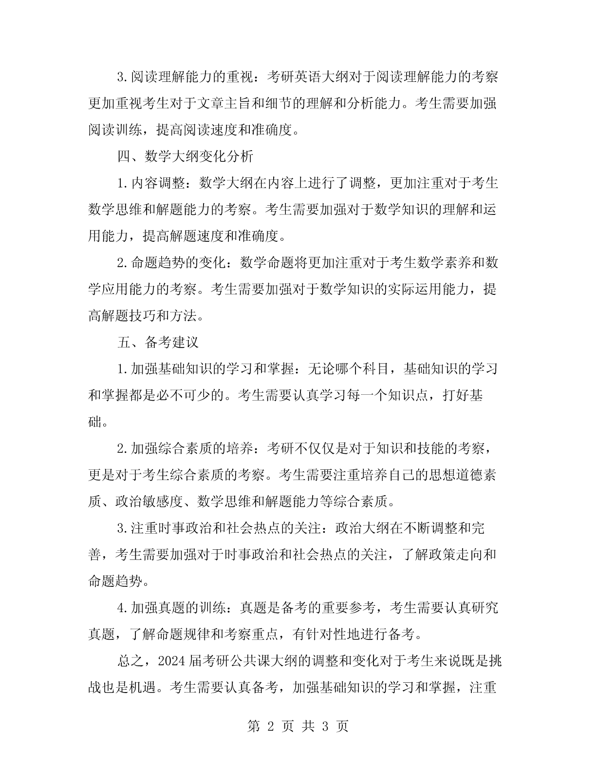 2024届考研公共课大纲随着社会的发展,越来越多的年轻人选择参加研究生考试,提升自己的学术水平和职业发展。而考研公共课大纲作为研究生入学考试的重要参考依据,其变化和调整自然备受关注。本文将就2024届考研公共课大纲进行详细解读和分析。一、考研公共课大纲概述考研公共课大纲包括政治、英语、数学等多个科目,是研究生入学考试的重要参考标准。近年来,考研公共课大纲在不断调整和完善,以适应社会发展和考生需求。二、政治大纲变化分析1.政治理论考试内容的变化:与往年相比,政治理论考试内容更加注重考生对于时事政治和社会热点问题的理解和分析能力。这要求考生不仅要掌握基本理论知识,还要具备敏锐的观察力和分析能力。2.命题趋势的变化:政治理论考试将更加注重对于考生思想道德素质和政治敏感度的考察。考生需要关注国家政策和社会热点,加强对于马克思主义理论的学习和理解。三、英语大纲变化分析1.词汇要求的提高:近年来,考研英语大纲对于词汇量的要求不断增加,考生需要更加努力记忆单词,提高词汇量。2.语法知识的调整:考研英语大纲对于语法知识的考察更加注重实用性,更加贴近实际应用场景。考生需要加强对于语法知识的理解和运用能力。3.阅读理解能力的重视:考研英语大纲对于阅读理解能力的考察更加重视考生对于文章主旨和细节的理解和分析能力。考生需要加强阅读训练,提高阅读速度和准确度。四、数学大纲变化分析1.内容调整:数学大纲在内容上进行了调整,更加注重对于考生数学思维和解题能力的考察。考生需要加强对于数学知识的理解和运用能力,提高解题速度和准确度。2.命题趋势的变化:数学命题将更加注重对于考生数学素养和数学应用能力的考察。考生需要加强对于数学知识的实际运用能力,提高解题技巧和方法。五、备考建议1.加强基础知识的学习和掌握:无论哪个科目,基础知识的学习和掌握都是必不可少的。考生需要认真学习每一个知识点,打好基础。2.加强综合素质的培养:考研不仅仅是对于知识和技能的考察,更是对于考生综合素质的考察。考生需要注重培养自己的思想道德素质、政治敏感度、数学思维和解题能力等综合素质。3.注重时事政治和社会热点的关注:政治大纲在不断调整和完善,考生需要加强对于时事政治和社会热点的关注,了解政策走向和命题趋势。4.加强真题的训练:真题是备考的重要参考,考生需要认真研究真题,了解命题规律和考察重点,有针对性地进行备考。总之,2024届考研公共课大纲的调整和变化对于考生来说既是挑战也是机遇。考生需要认真备考,加强基础知识的学习和掌握,注重综合素质的培养和提高,才能顺利通过研究生入学考试,实现自己的职业梦想。