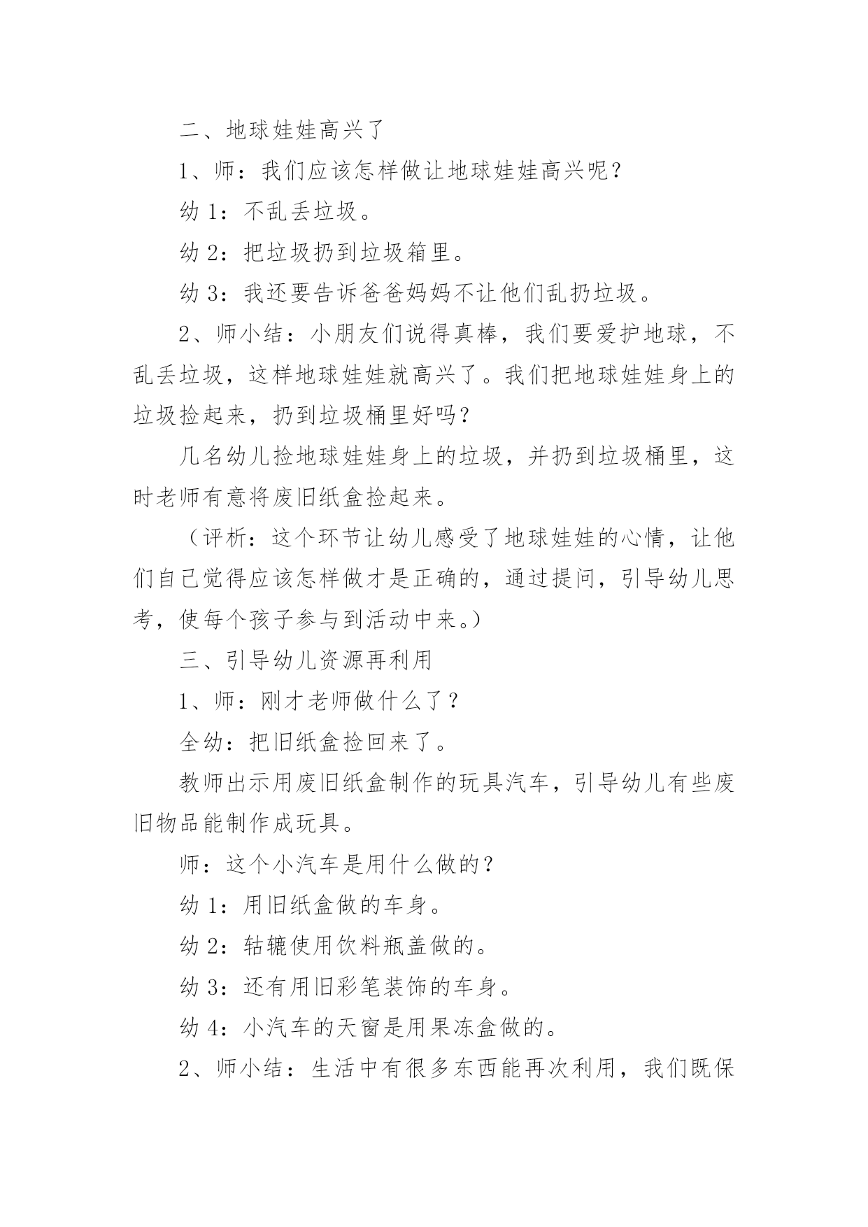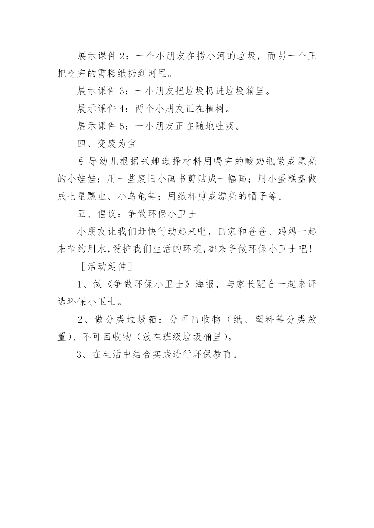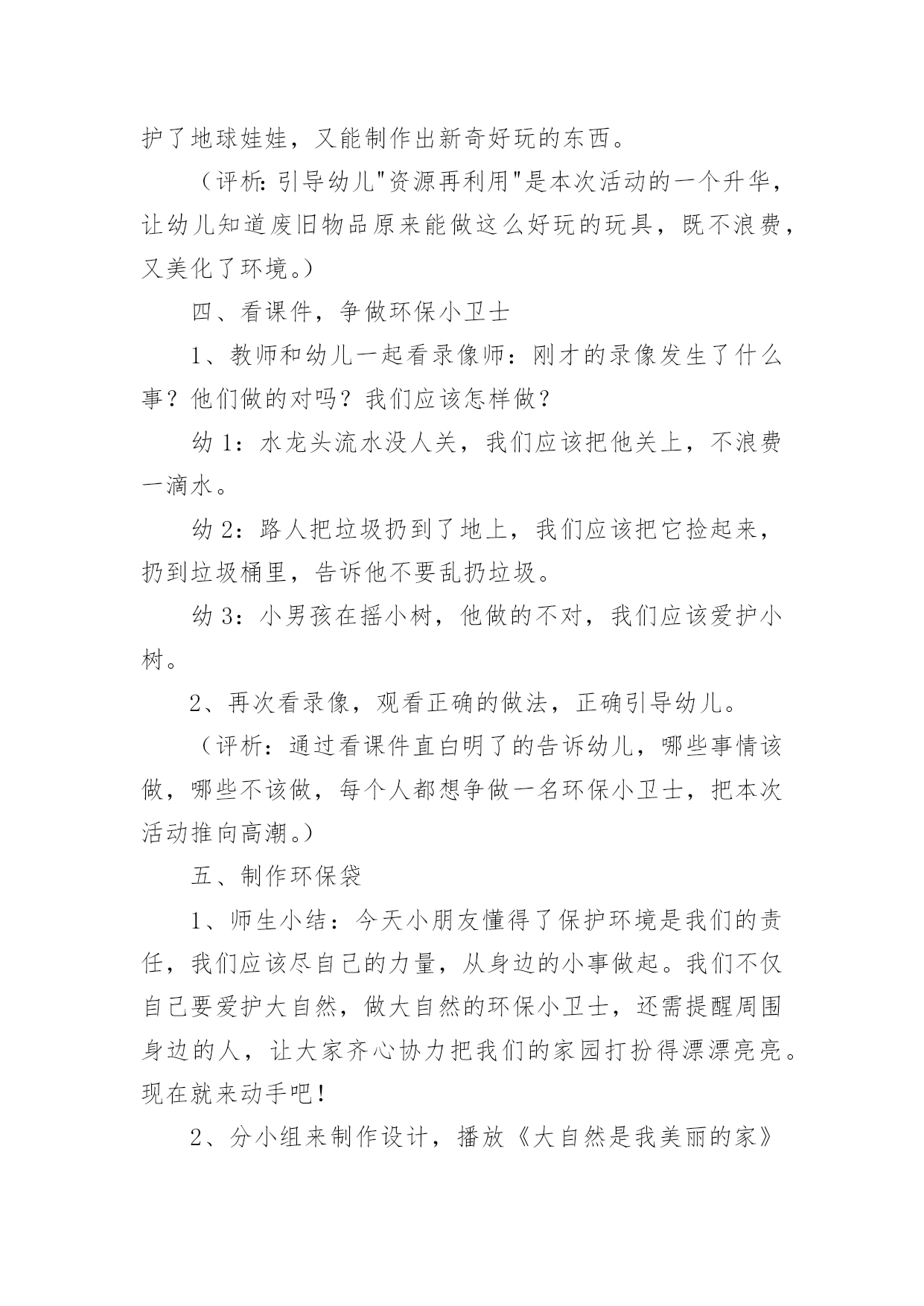 幼儿园教案:争做环保小卫士作为一位优秀的人民教师,常常要写一份优秀的教案,教案是备课向课堂教学转化的关节点。那么你有了解过教案吗?以下是小编帮大家整理的幼儿园教案:争做环保小卫士,仅供参考,欢迎大家阅读。幼儿园教案:争做环保小卫士1活动目标:1、知道爱护地球,保护地球的重要性,懂得保护环境要从身边做起。2、发现生活中一些能再利用的资源,知道节约资源,避免浪费。活动准备:1、自制地球娃娃的外衣一件,衣服上粘有烟头、纸屑、纸盒、塑料袋等垃圾。2、用废旧材料做的玩具小汽车3、纸袋、油画棒、即时贴若干4、音乐《大自然是我美丽的家》5、课件幼儿已有知识和经验:我园的办园理念是"在绿色生活中健康成长",我们提倡"低碳环保"要从幼儿抓起,从生活中的点点滴滴做起。平时,我园的孩子们就把家里的一些废旧物品带到幼儿园来,如:饮料瓶、各种纸盒、花生皮、玉米皮等。老师们将其变废为宝,家长和孩子们看到后都很赞赏,老师启发孩子,孩子带动家长,家长以身作则,整个循环过程对我园开展"低碳"工作起到了很大的帮助。为了更好地让幼儿进一步了解保护环境的重要性,我设计了此活动。活动实录:一、观看情景表演,引入主题1、教师扮演地球娃娃出现在幼儿面前,表演难过的"地球娃娃"。师:小朋友们,你们看地球娃娃怎么了?幼1:地球娃娃很难过。幼2:她很不好受。幼3:地球娃娃很伤心。幼4:她很委屈。幼5:地球娃娃满身都是垃圾。2、幼儿讨论,知道爱护地球的重要性师:地球娃娃为什么伤心难过?幼1:因为她身上有烟头、碎纸、塑料袋。幼2:他身上都是烟灰、烟头、纸屑、纸盒。幼3:因为她身上都是垃圾,太脏了。师小结:小朋友们,这么多的垃圾扔到地球上难怪地球娃娃会难过,我们应该爱护地球娃娃。(评析:开始部分引入,由教师装扮成地球娃娃,形象生动,充分调动了孩子们的`积极性。)二、地球娃娃高兴了1、师:我们应该怎样做让地球娃娃高兴呢?幼1:不乱丢垃圾。幼2:把垃圾扔到垃圾箱里。幼3:我还要告诉爸爸妈妈不让他们乱扔垃圾。2、师小结:小朋友们说得真棒,我们要爱护地球,不乱丢垃圾,这样地球娃娃就高兴了。我们把地球娃娃身上的垃圾捡起来,扔到垃圾桶里好吗?几名幼儿捡地球娃娃身上的垃圾,并扔到垃圾桶里,这时老师有意将废旧纸盒捡起来。(评析:这个环节让幼儿感受了地球娃娃的心情,让他们自己觉得应该怎样做才是正确的,通过提问,引导幼儿思考,使每个孩子参与到活动中来。)三、引导幼儿资源再利用1、师:刚才老师做什么了?全幼:把旧纸盒捡回来了。教师出示用废旧纸盒制作的玩具汽车,引导幼儿有些废旧物品能制作成玩具。师:这个小汽车是用什么做的?幼1:用旧纸盒做的车身。幼2:轱辘使用饮料瓶盖做的。幼3:还有用旧彩笔装饰的车身。幼4:小汽车的天窗是用果冻盒做的。2、师小结:生活中有很多东西能再次利用,我们既保护了地球娃娃,又能制作出新奇好玩的东西。(评析:引导幼儿"资源再利用"是本次活动的一个升华,让幼儿知道废旧物品原来能做这么好玩的玩具,既不浪费,又美化了环境。)四、看课件,争做环保小卫士1、教师和幼儿一起看录像师:刚才的录像发生了什么事?他们做的对吗?我们应该怎样做?幼1:水龙头流水没人关,我们应该把他关上,不浪费一滴水。幼2:路人把垃圾扔到了地上,我们应该把它捡起来,扔到垃圾桶里,告诉他不要乱扔垃圾。幼3:小男孩在摇小树,他做的不对,我们应该爱护小树。2、再次看录像,观看正确的做法,正确引导幼儿。(评析:通过看课件直白明了的告诉幼儿,哪些事情该做,哪些不该做,每个人都想争做一名环保小卫士,把本次活动推向高潮。)五、制作环保袋1、师生小结:今天小朋友懂得了保护环境是我们的责任,我们应该尽自己的力量,从身边的小事做起。我们不仅自己要爱护大自然,做大自然的环保小卫士,还需提醒周围身边的人,让大家齐心协力把我们的家园打扮得漂漂亮亮。现在就来动手吧!2、分小组来制作设计,播放《大自然是我美丽的家》音乐。设计环保袋(在提供的环保袋上可以贴、画、等装饰)。幼儿操作,教师巡视,指导。幼儿园教案:争做环保小卫士2[活动目标]1、引导幼儿懂得节约用水的原因,共同探讨节约用水的方法。2、引导幼儿懂得爱护自己的生活环境,节约用纸,购买环保物品,少用一次性东西等,争做环保小卫士。[活动准备]一次性筷子、牙刷、塑料袋、快餐盒等;烟尘污染的图片4张;判断对错图片5张;酸奶瓶、废旧小画书、纸杯、小蛋糕盘若干;即时贴;各色油光纸;剪刀[活动过程]一、保护水资源1、(看课件:我们的生活离不开水)引导幼儿了解水的用处。引导讨论:水都有什么用处?我们生活中哪些事情需要水?小结:水的用处很大,人和动物植物都离不开水,如果不喝水就会渴死。水可以用来洗衣做饭、洗脸等,我们的生活还有许多工厂的生产都离不开水。可是我国是严重缺水的国家,有的地方都连喝的水都不够了,如果我们