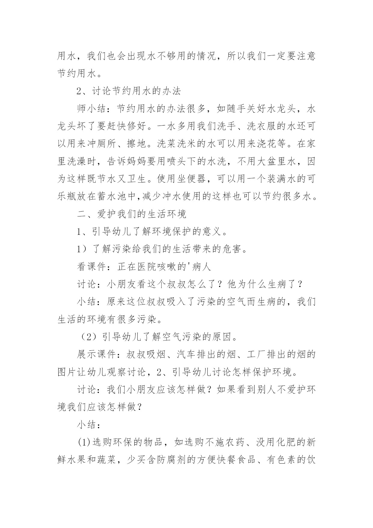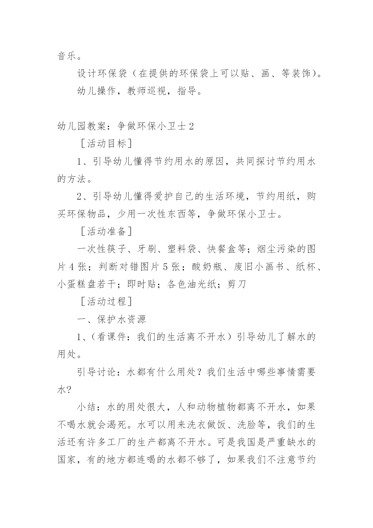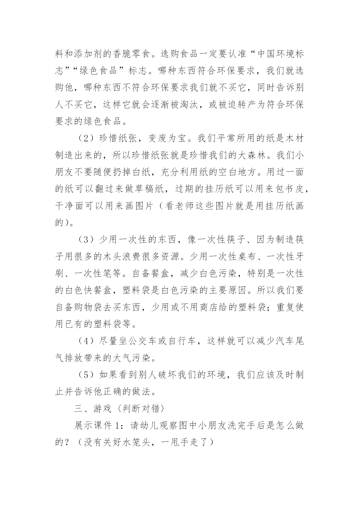 幼儿园教案:争做环保小卫士作为一位优秀的人民教师,常常要写一份优秀的教案,教案是备课向课堂教学转化的关节点。那么你有了解过教案吗?以下是小编帮大家整理的幼儿园教案:争做环保小卫士,仅供参考,欢迎大家阅读。幼儿园教案:争做环保小卫士1活动目标:1、知道爱护地球,保护地球的重要性,懂得保护环境要从身边做起。2、发现生活中一些能再利用的资源,知道节约资源,避免浪费。活动准备:1、自制地球娃娃的外衣一件,衣服上粘有烟头、纸屑、纸盒、塑料袋等垃圾。2、用废旧材料做的玩具小汽车3、纸袋、油画棒、即时贴若干4、音乐《大自然是我美丽的家》5、课件幼儿已有知识和经验:我园的办园理念是"在绿色生活中健康成长",我们提倡"低碳环保"要从幼儿抓起,从生活中的点点滴滴做起。平时,我园的孩子们就把家里的一些废旧物品带到幼儿园来,如:饮料瓶、各种纸盒、花生皮、玉米皮等。老师们将其变废为宝,家长和孩子们看到后都很赞赏,老师启发孩子,孩子带动家长,家长以身作则,整个循环过程对我园开展"低碳"工作起到了很大的帮助。为了更好地让幼儿进一步了解保护环境的重要性,我设计了此活动。活动实录:一、观看情景表演,引入主题1、教师扮演地球娃娃出现在幼儿面前,表演难过的"地球娃娃"。师:小朋友们,你们看地球娃娃怎么了?幼1:地球娃娃很难过。幼2:她很不好受。幼3:地球娃娃很伤心。幼4:她很委屈。幼5:地球娃娃满身都是垃圾。2、幼儿讨论,知道爱护地球的重要性师:地球娃娃为什么伤心难过?幼1:因为她身上有烟头、碎纸、塑料袋。幼2:他身上都是烟灰、烟头、纸屑、纸盒。幼3:因为她身上都是垃圾,太脏了。师小结:小朋友们,这么多的垃圾扔到地球上难怪地球娃娃会难过,我们应该爱护地球娃娃。(评析:开始部分引入,由教师装扮成地球娃娃,形象生动,充分调动了孩子们的`积极性。)二、地球娃娃高兴了1、师:我们应该怎样做让地球娃娃高兴呢?幼1:不乱丢垃圾。幼2:把垃圾扔到垃圾箱里。幼3:我还要告诉爸爸妈妈不让他们乱扔垃圾。2、师小结:小朋友们说得真棒,我们要爱护地球,不乱丢垃圾,这样地球娃娃就高兴了。我们把地球娃娃身上的垃圾捡起来,扔到垃圾桶里好吗?几名幼儿捡地球娃娃身上的垃圾,并扔到垃圾桶里,这时老师有意将废旧纸盒捡起来。(评析:这个环节让幼儿感受了地球娃娃的心情,让他们自己觉得应该怎样做才是正确的,通过提问,引导幼儿思考,使每个孩子参与到活动中来。)三、引导幼儿资源再利用1、师:刚才老师做什么了?全幼:把旧纸盒捡回来了。教师出示用废旧纸盒制作的玩具汽车,引导幼儿有些废旧物品能制作成玩具。师:这个小汽车是用什么做的?幼1:用旧纸盒做的车身。幼2:轱辘使用饮料瓶盖做的。幼3:还有用旧彩笔装饰的车身。幼4:小汽车的天窗是用果冻盒做的。2、师小结:生活中有很多东西能再次利用,我们既保护了地球娃娃,又能制作出新奇好玩的东西。(评析:引导幼儿"资源再利用"是本次活动的一个升华,让幼儿知道废旧物品原来能做这么好玩的玩具,既不浪费,又美化了环境。)四、看课件,争做环保小卫士1、教师和幼儿一起看录像师:刚才的录像发生了什么事?他们做的对吗?我们应该怎样做?幼1:水龙头流水没人关,我们应该把他关上,不浪费一滴水。幼2:路人把垃圾扔到了地上,我们应该把它捡起来,扔到垃圾桶里,告诉他不要乱扔垃圾。幼3:小男孩在摇小树,他做的不对,我们应该爱护小树。2、再次看录像,观看正确的做法,正确引导幼儿。(评析:通过看课件直白明了的告诉幼儿,哪些事情该做,哪些不该做,每个人都想争做一名环保小卫士,把本次活动推向高潮。)五、制作环保袋1、师生小结:今天小朋友懂得了保护环境是我们的责任,我们应该尽自己的力量,从身边的小事做起。我们不仅自己要爱护大自然,做大自然的环保小卫士,还需提醒周围身边的人,让大家齐心协力把我们的家园打扮得漂漂亮亮。现在就来动手吧!2、分小组来制作设计,播放《大自然是我美丽的家》音乐。设计环保袋(在提供的环保袋上可以贴、画、等装饰)。幼儿操作,教师巡视,指导。幼儿园教案:争做环保小卫士2[活动目标]1、引导幼儿懂得节约用水的原因,共同探讨节约用水的方法。2、引导幼儿懂得爱护自己的生活环境,节约用纸,购买环保物品,少用一次性东西等,争做环保小卫士。[活动准备]一次性筷子、牙刷、塑料袋、快餐盒等;烟尘污染的图片4张;判断对错图片5张;酸奶瓶、废旧小画书、纸杯、小蛋糕盘若干;即时贴;各色油光纸;剪刀[活动过程]一、保护水资源1、(看课件:我们的生活离不开水)引导幼儿了解水的用处。引导讨论:水都有什么用处?我们生活中哪些事情需要水?小结:水的用处很大,人和动物植物都离不开水,如果不喝水就会渴死。水可以用来洗衣做饭、洗脸等,我们的生活还有许多工厂的生产都离不开水。可是我国是严重缺水的国家,有的地方都连喝的水都不够了,如果我们