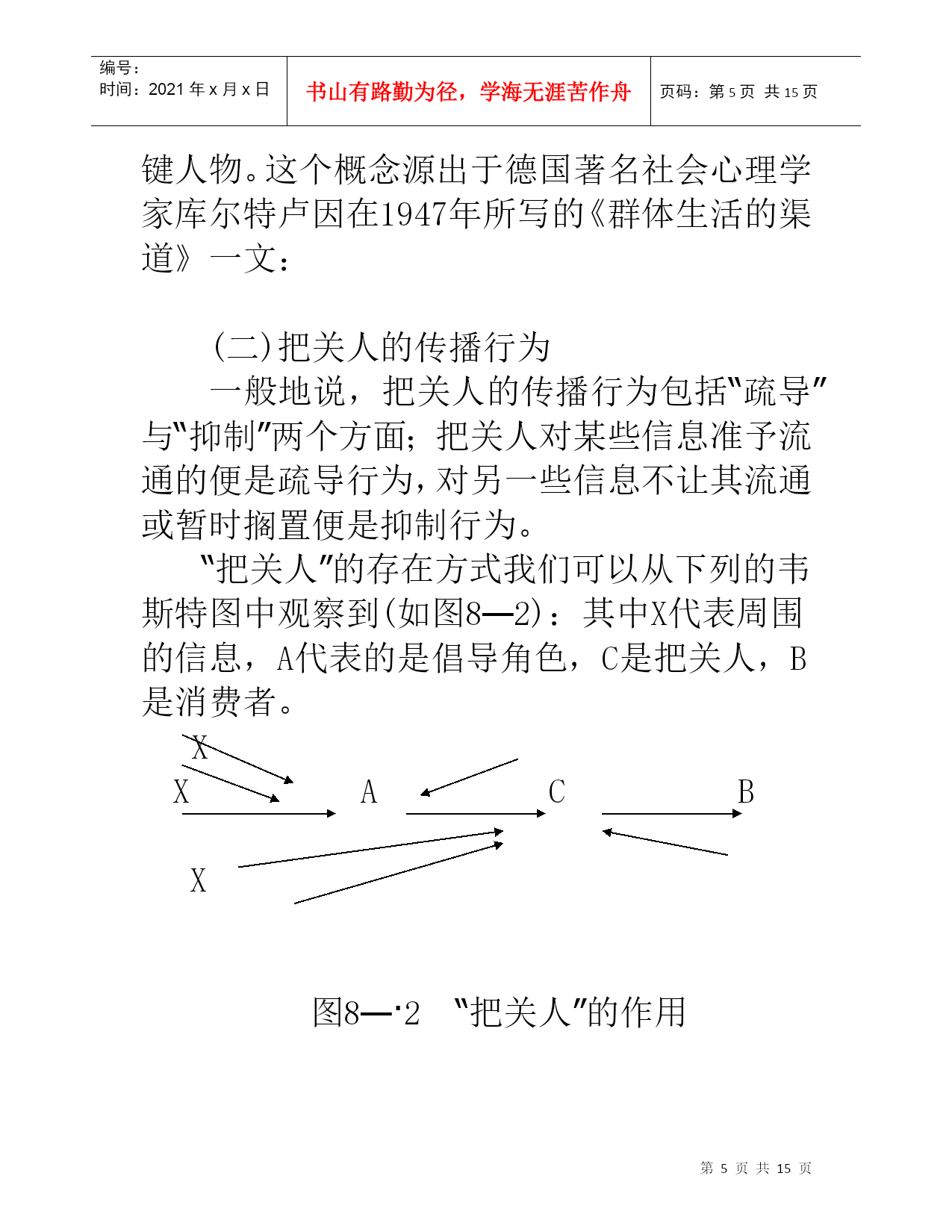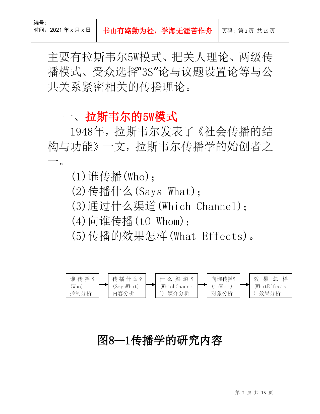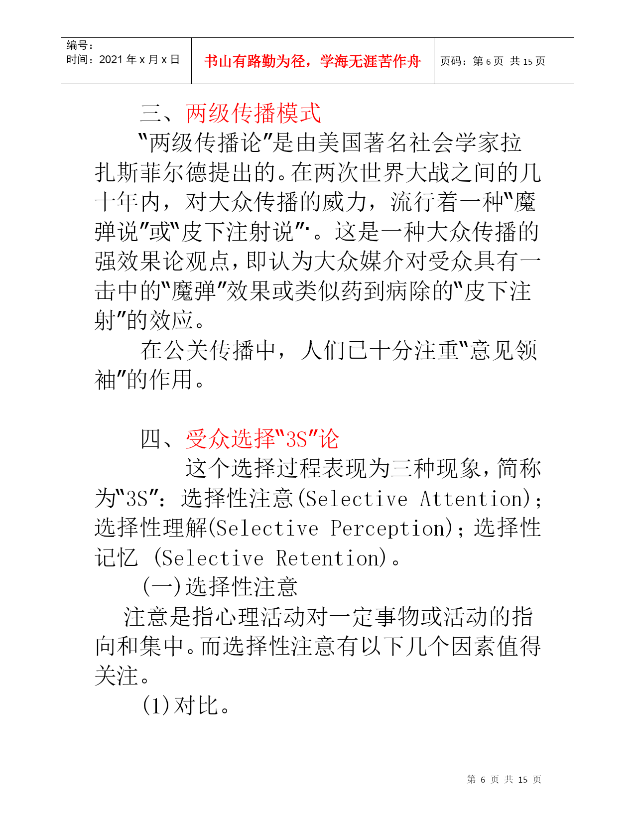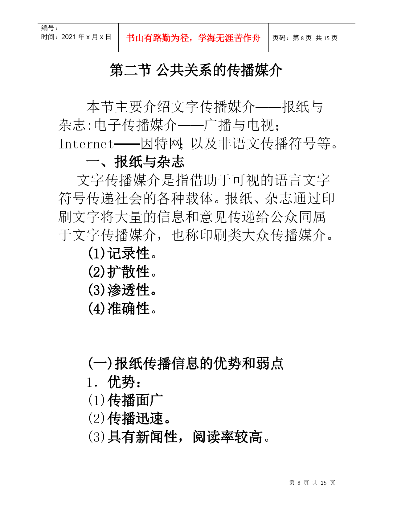 编号:时间:2021年x月x日书山有路勤为径,学海无涯苦作舟页码:第PAGE15页共NUMPAGES15页第PAGE\*MERGEFORMAT15页共NUMPAGES\*MERGEFORMAT15页HYPERLINK"xxxx/"公共关系传播模式与媒介学习目的和要求通过本章的学习,了解一些主要的传播模式与相关理论,如5W模式、把关人理论、两级传播模式、受众选择“3S”论、议题设置论等;同时,掌握一些主要的传播媒介知识,如文字大众传媒、电子大众传媒、国际互联网等,了解公共关系的基本手段。学习方法以基本概念的识记为基础,了解和领会公共关系的传播模式与相关理论,掌握公共关系所涉及到的主要传播媒介和方式,并能在实践中进行具体的操作和运用。学习内容第一节公共关系传播模式与理论本节主要介绍公共关系的传播模式与理论。主要有拉斯韦尔5W模式、把关人理论、两级传播模式、受众选择“3S”论与议题设置论等与公共关系紧密相关的传播理论。一、拉斯韦尔的5W模式1948年,拉斯韦尔发表了《社会传播的结构与功能》一文,拉斯韦尔传播学的始创者之一。(1)谁传播(Who);(2)传播什么(SaysWhat);(3)通过什么渠道(WhichChannel);(4)向谁传播(tOWhom);(5)传播的效果怎样(WhatEffects)。谁传播?(Who)控制分析传播什么?(SaysWhat)内容分析什么渠道?(WhichChannel)媒介分析向谁传播?(toWhom)对象分析效果怎样(WhatEffects)效果分析图8—1传播学的研究内容效果怎样(withWhatEffects)效果分析谁传播?(Who)控制分析组织向谁传播?(toWhom)对象分析公众什么渠道?(WhichChannel)媒介分析媒介选择传播什么?(SaysWhat)内容分析公关信息公关传播过程分析拉斯韦尔所提出的研究对象的五大部分视为传播研究的基本范畴。1.传播的控制分析传播的控制分析主要包括:传播的法规与政策;传播者的社会控制和自我控制;传播者对传播的影响;传播者的社会责任。2.传播的内容分析传播的内容分析主要包括:传播的分类;传播的符号:传播的宣传方法等。3.传播的媒介分析传播的媒介分析主要包括:传播的媒介环境;传播的媒介特点等。4.传播的对象分析传播的对象分析主要包括:传播对象的心理;传播对象的劝服等。5.传播的效果分析传播的效果分析主要包括:传播的效果类型;影响传播效果的因素;测定传播效果的定量方法等。二、把关人理论(一)把关人的概念“把关人”又称“守门人”(GateKeeper),它是指在信息传播过程中,对信息的提供、制作、编辑和报导能够采取“疏导”与“抑制’’行为的关键人物。这个概念源出于德国著名社会心理学家库尔特卢因在1947年所写的《群体生活的渠道》一文:(二)把关人的传播行为一般地说,把关人的传播行为包括“疏导”与“抑制”两个方面;把关人对某些信息准予流通的便是疏导行为,对另一些信息不让其流通或暂时搁置便是抑制行为。“把关人”的存在方式我们可以从下列的韦斯特图中观察到(如图8—2):其中X代表周围的信息,A代表的是倡导角色,C是把关人,B是消费者。XXACBX图8—·2“把关人”的作用三、两级传播模式“两级传播论”是由美国著名社会学家拉扎斯菲尔德提出的。在两次世界大战之间的几十年内,对大众传播的威力,流行着一种“魔弹说”或“皮下注射说”·。这是一种大众传播的强效果论观点,即认为大众媒介对受众具有一击中的“魔弹”效果或类似药到病除的“皮下注射”的效应。在公关传播中,人们已十分注重“意见领袖”的作用。四、受众选择“3S”论这个选择过程表现为三种现象,简称为“3S”:选择性注意(SelectiveAttention);选择性理解(SelectivePerception);选择性记忆(SelectiveRetention)。(一)选择性注意注意是指心理活动对一定事物或活动的指向和集中。而选择性注意有以下几个因素值得关注。(1)对比。(2)强度。(3)位置(4)重复。(5)变化。(二)选择性理解选择性理解,是指不同的人对于同一信息作出不同的意义解释和理解。影响受传者的选择性理解的心理因素包括需要、态度和情绪三个方面。(1)需要。(2)态度:(3)情绪:(三)选择性记忆记忆是一定时期内神经联系的形成和巩固。选择性记忆,可以分为三个阶段:(1)输入。(2)储存。(3)输出。公共关系的传播媒介本节主要介绍文
