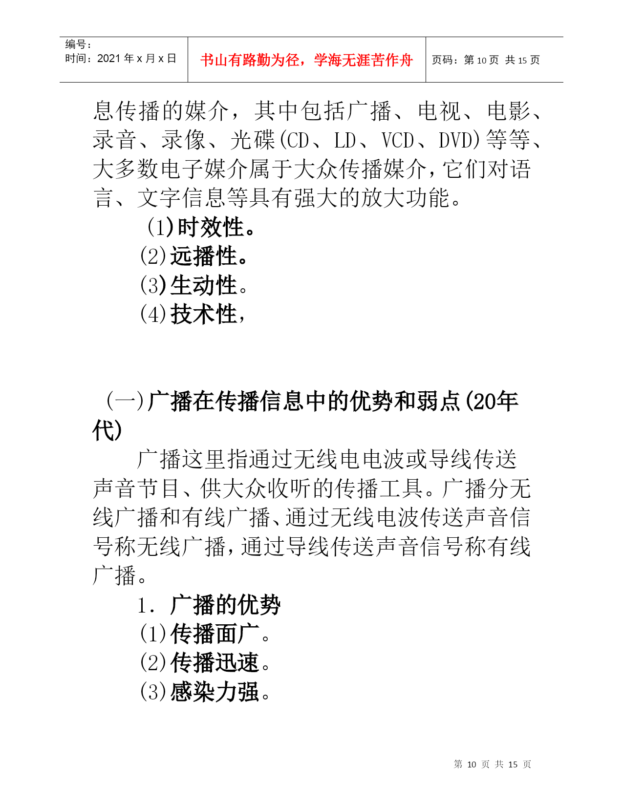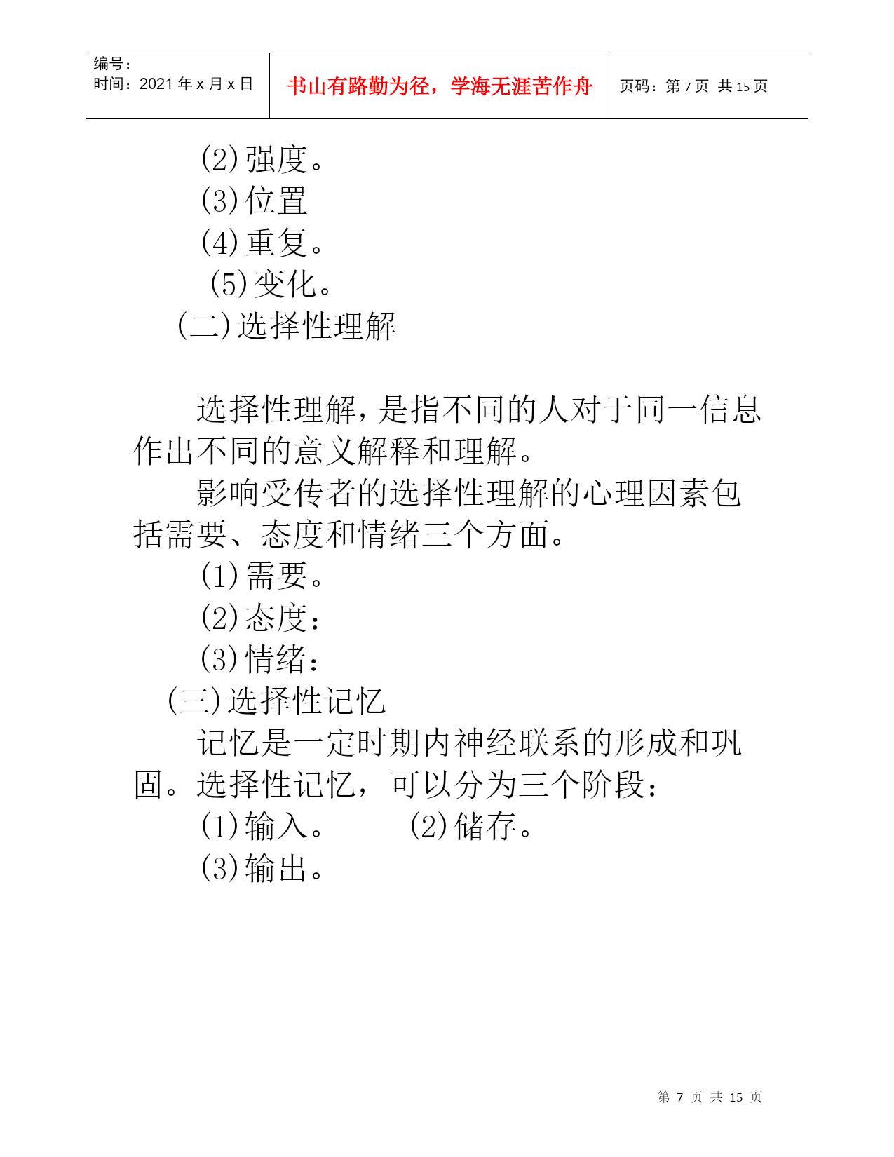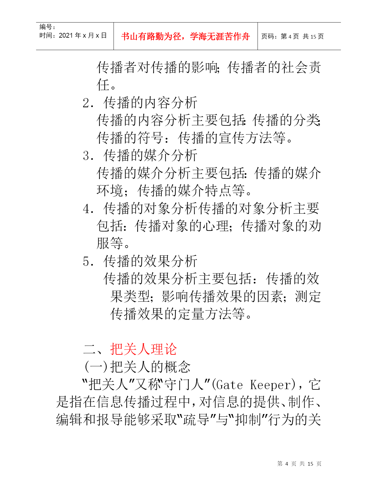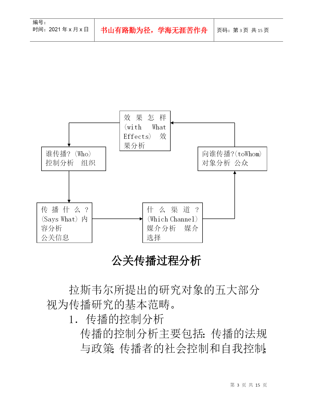 编号:时间:2021年x月x日书山有路勤为径,学海无涯苦作舟页码:第PAGE15页共NUMPAGES15页第PAGE\*MERGEFORMAT15页共NUMPAGES\*MERGEFORMAT15页HYPERLINK"xxxx/"公共关系传播模式与媒介学习目的和要求通过本章的学习,了解一些主要的传播模式与相关理论,如5W模式、把关人理论、两级传播模式、受众选择“3S”论、议题设置论等;同时,掌握一些主要的传播媒介知识,如文字大众传媒、电子大众传媒、国际互联网等,了解公共关系的基本手段。学习方法以基本概念的识记为基础,了解和领会公共关系的传播模式与相关理论,掌握公共关系所涉及到的主要传播媒介和方式,并能在实践中进行具体的操作和运用。学习内容第一节公共关系传播模式与理论本节主要介绍公共关系的传播模式与理论。主要有拉斯韦尔5W模式、把关人理论、两级传播模式、受众选择“3S”论与议题设置论等与公共关系紧密相关的传播理论。一、拉斯韦尔的5W模式1948年,拉斯韦尔发表了《社会传播的结构与功能》一文,拉斯韦尔传播学的始创者之一。(1)谁传播(Who);(2)传播什么(SaysWhat);(3)通过什么渠道(WhichChannel);(4)向谁传播(tOWhom);(5)传播的效果怎样(WhatEffects)。谁传播?(Who)控制分析传播什么?(SaysWhat)内容分析什么渠道?(WhichChannel)媒介分析向谁传播?(toWhom)对象分析效果怎样(WhatEffects)效果分析图8—1传播学的研究内容效果怎样(withWhatEffects)效果分析谁传播?(Who)控制分析组织向谁传播?(toWhom)对象分析公众什么渠道?(WhichChannel)媒介分析媒介选择传播什么?(SaysWhat)内容分析公关信息公关传播过程分析拉斯韦尔所提出的研究对象的五大部分视为传播研究的基本范畴。1.传播的控制分析传播的控制分析主要包括:传播的法规与政策;传播者的社会控制和自我控制;传播者对传播的影响;传播者的社会责任。2.传播的内容分析传播的内容分析主要包括:传播的分类;传播的符号:传播的宣传方法等。3.传播的媒介分析传播的媒介分析主要包括:传播的媒介环境;传播的媒介特点等。4.传播的对象分析传播的对象分析主要包括:传播对象的心理;传播对象的劝服等。5.传播的效果分析传播的效果分析主要包括:传播的效果类型;影响传播效果的因素;测定传播效果的定量方法等。二、把关人理论(一)把关人的概念“把关人”又称“守门人”(GateKeeper),它是指在信息传播过程中,对信息的提供、制作、编辑和报导能够采取“疏导”与“抑制’’行为的关键人物。这个概念源出于德国著名社会心理学家库尔特卢因在1947年所写的《群体生活的渠道》一文:(二)把关人的传播行为一般地说,把关人的传播行为包括“疏导”与“抑制”两个方面;把关人对某些信息准予流通的便是疏导行为,对另一些信息不让其流通或暂时搁置便是抑制行为。“把关人”的存在方式我们可以从下列的韦斯特图中观察到(如图8—2):其中X代表周围的信息,A代表的是倡导角色,C是把关人,B是消费者。XXACBX图8—·2“把关人”的作用三、两级传播模式“两级传播论”是由美国著名社会学家拉扎斯菲尔德提出的。在两次世界大战之间的几十年内,对大众传播的威力,流行着一种“魔弹说”或“皮下注射说”·。这是一种大众传播的强效果论观点,即认为大众媒介对受众具有一击中的“魔弹”效果或类似药到病除的“皮下注射”的效应。在公关传播中,人们已十分注重“意见领袖”的作用。四、受众选择“3S”论这个选择过程表现为三种现象,简称为“3S”:选择性注意(SelectiveAttention);选择性理解(SelectivePerception);选择性记忆(SelectiveRetention)。(一)选择性注意注意是指心理活动对一定事物或活动的指向和集中。而选择性注意有以下几个因素值得关注。(1)对比。(2)强度。(3)位置(4)重复。(5)变化。(二)选择性理解选择性理解,是指不同的人对于同一信息作出不同的意义解释和理解。影响受传者的选择性理解的心理因素包括需要、态度和情绪三个方面。(1)需要。(2)态度:(3)情绪:(三)选择性记忆记忆是一定时期内神经联系的形成和巩固。选择性记忆,可以分为三个阶段:(1)输入。(2)储存。(3)输出。公共关系的传播媒介本节主要介绍文