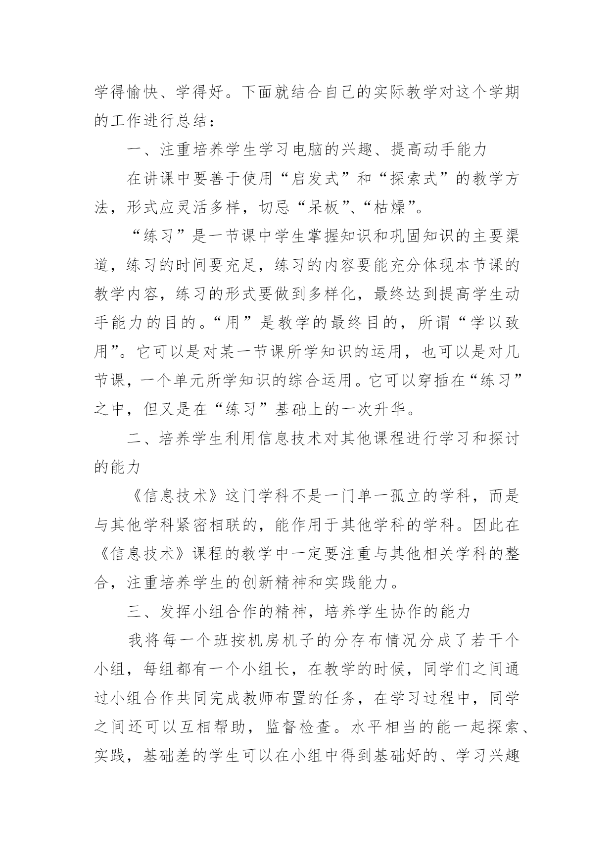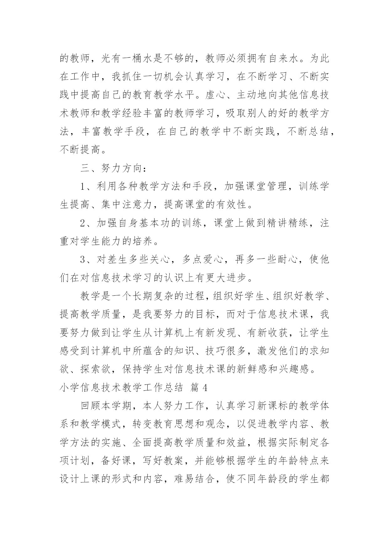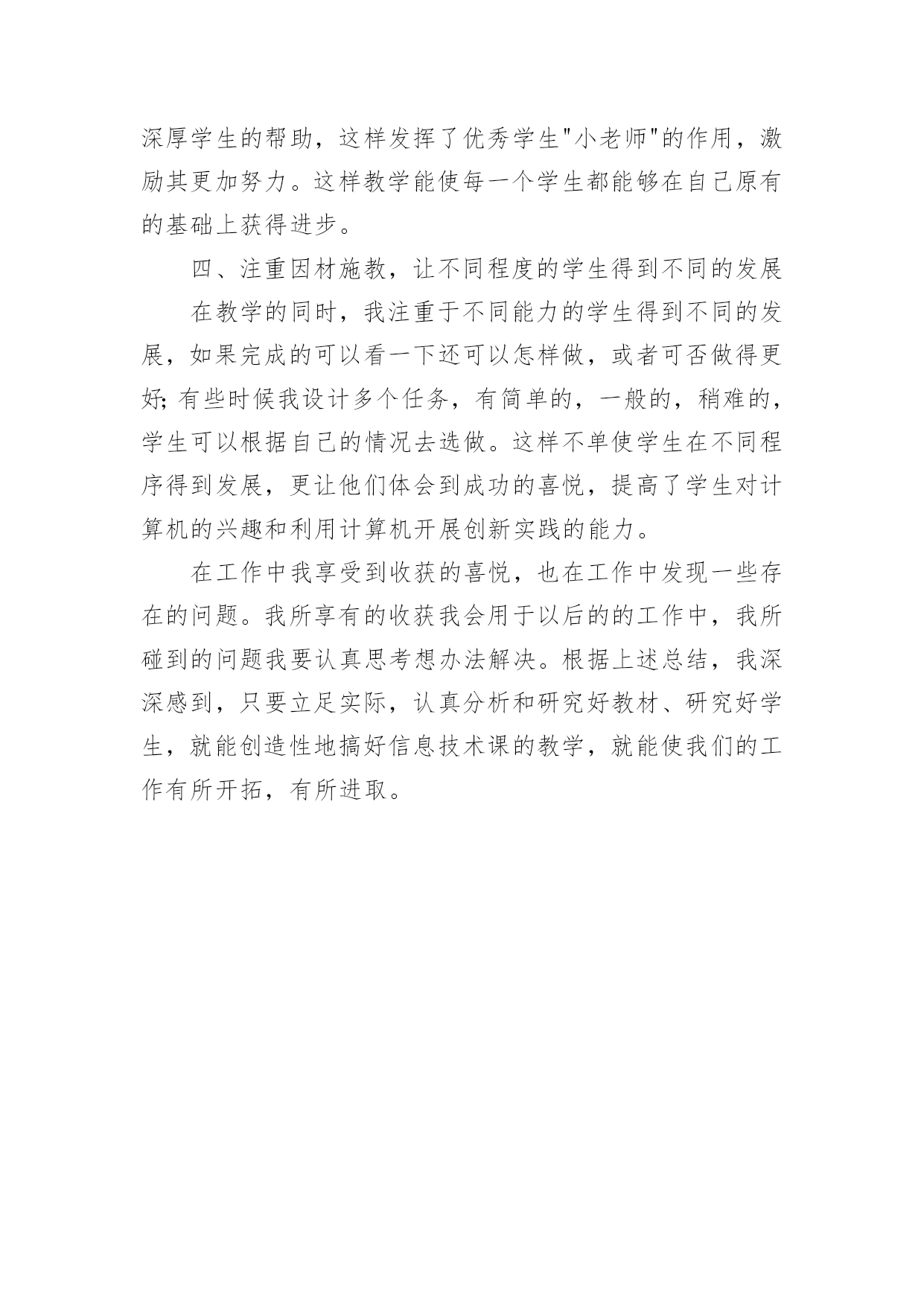 小学信息技术教学工作总结小学信息技术教学工作总结四篇在日常生活或是工作学习中,大家都尝试过写信吧,借助书信人们可以传递思想、交流信息。那么你有了解过书信吗?下面是小编为大家整理的小学信息技术教学工作总结4篇,希望能够帮助到大家。小学信息技术教学工作总结篇1一、结合计算机的硬件实际,开展好常规教学。1、分析教材。开学初,根据教学计划模块安排,对具体的教学内容都进行了认真的教学分析,思考在现有计算机软硬件的实际情况下如何实施教学,收效很好。2、激发兴趣。在教学中,为了提高学生学习信息技术的兴趣,在不影响教学的情况下,从光盘上或到网上去找了一些有利于学生智力发展的小游戏,把这些游戏穿插在教育教学过程中,让学生既巩固了所学知识,又提高了学习兴趣,并有助于学生智力发展。经本期实践,取得了很好的效果。学生不但掌握了规定的信息技术知识和达到了规定的操作技能水平,而且还从游戏中学到了许多其它的知识。信息技术课已经成了学生十分喜欢的课程之一。3、兴趣小组。在正常地教学之余,学校成立兴趣信息技术小组,利用兴趣小组活动,学生学到许多平时在信息技术课上学不到的知识,比如有的学生学会制作携画,有的学生学会了电子报刊制作,用计算机来解决一些其它学科学习中遇到的问题。二、加强教学教研,努力提高业务水平。教学的成败取决于教师,教师的素质的高低直接影响着课堂的教学质量,在本学期,在教学之余,加强了对业务的钻研。在本学期,我认真钻研新课程标准,研究教材,探索新教育教学方法,提高业务水平,在网上还注意收集相关资料,以扩大学生的视野。三、充分发挥优势,提高学校办学的信息化发展的水平。作为信息技术教师,应走在学校信息技术发展的前沿,除了搞好信息技术教育教学外,我们还担负着许多其它的任务。学校其它学科公开课的课件制作。另外,学校机房、各室和教师用计算机等,计算机的维护和维修基本上都由我来完成。信息技术是一门不断发展的学科,展望学校的发展和学科的发展,我觉得还有许多知识要学,还有许多事情要做。在今后的教育教学工作中,我将更严格要求自己,努力工作,发扬优点,改正缺点,开拓前进,争取取得更大的进步。小学信息技术教学工作总结篇2一、学生分析:三年级的学生经过一学期的学习,在学习上,学生间差距不大,差距体现在学习习惯上,由于个别学生长期自由散漫,不听老师劝告,甚至教育。尤其是三年四班,学习习惯特差,一些学生不爱学习,并且好斗,经常打架,对学习成绩没有概念,无论优秀与不及格,都与他无关似的,对成绩可以说是不闻不问。五年级发展较均衡,只是全班之后,班额更大了,不便于困难生的辅导。六年级跟开学时预料的一样,学生发生了很大的变大,优生减少,差生增多,学生处在从少年向青年的过渡期,生理和心理都在悄悄发生变化,出现了不爱学习、顽固、自心为是、贪玩等不良现象,尤其是我们这些“副科”,学生更是不以为然,这就使我们的教学更难顺利进行。汲取了前一个六年级的经验,加强了与学生间的交流,本学期与六年级学生相处还比较愉快。二、根据各年级情况调整教学内容和方法。1、三年级本学期注重学习习惯的培养,如:课前排队、课前预习、听课认真、小组协作……开学初,对学生进行网络室管理教育,选拔组长,了解学生,异质分组,注重学生鼠标正常操作、键盘指法的正确运用。经过一学期的努力,大部分学生养成了良好的上机习惯,键盘录入字母速度较快。但对个别学生了解不够深入,师生间缺少交流,学生积极性高,但学习却上不来,还有甚者,根本不动手,懒得很。2、由于本期网络室搬迁,耽误了一些教学时间,就对教学内容作了适当的删减,主要学习了word表格和邮件发送,期末考试内容就是每一位学生给我发一封邮件,学生通过邮件谈了自己在学习上的一些收获,以及对老师的美好祝愿,确实让我很感动,增进了师生间的情感。唯一遗憾的是我没有一一回信,确实时间不够,每天收邮件都要花很多时间。3、六年级的教材重点放在ppt的确超级链接。要求学生完成三个幻灯片:世界上的四大河流、数学复习课件、古诗欣赏。根据完成情况给学生评定期末成绩。其中收集了一些优秀作品。三、参与科研、教研。参与了市级科研课题《提高小学信息技术课堂教学效益的策略研究》、省级科研课题《在信息技术教学中培养学生组织能力的研究》的研究。另积极参加各级组织的教研学习,认真参与评课,用心领悟其他老师的优点,吸取对教学有帮助的知识。四、网络室的维护,为教学提供了硬件保障。在本期的工作中,有得也有失,打算在下期的.工作中,针对问题,逐一完善。小学信息技术教学工作总结篇3不知不觉中一个学期就结束了,回顾这个学期所从事的信息技术教学工作,基本上是比较顺利地完成任务。我所享有的收获,我会用于下个学期的工作中,我所碰到的问题我会认真思考,想办法解决。在这个学期中,本人能在保持原有良好工作态度的基础上,不断进步,不断进取,不断学