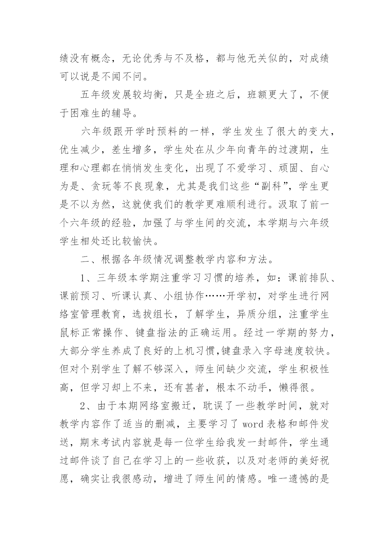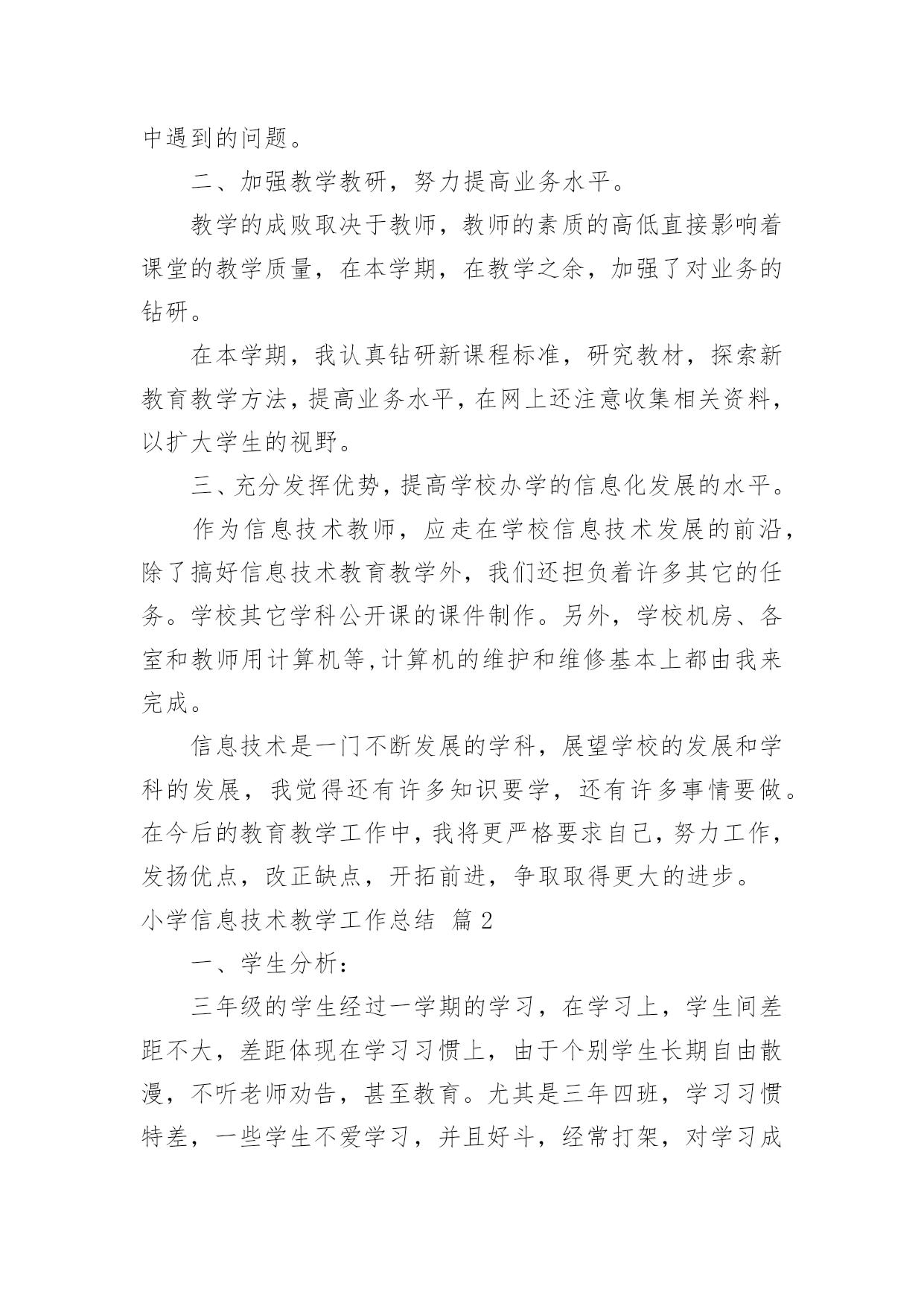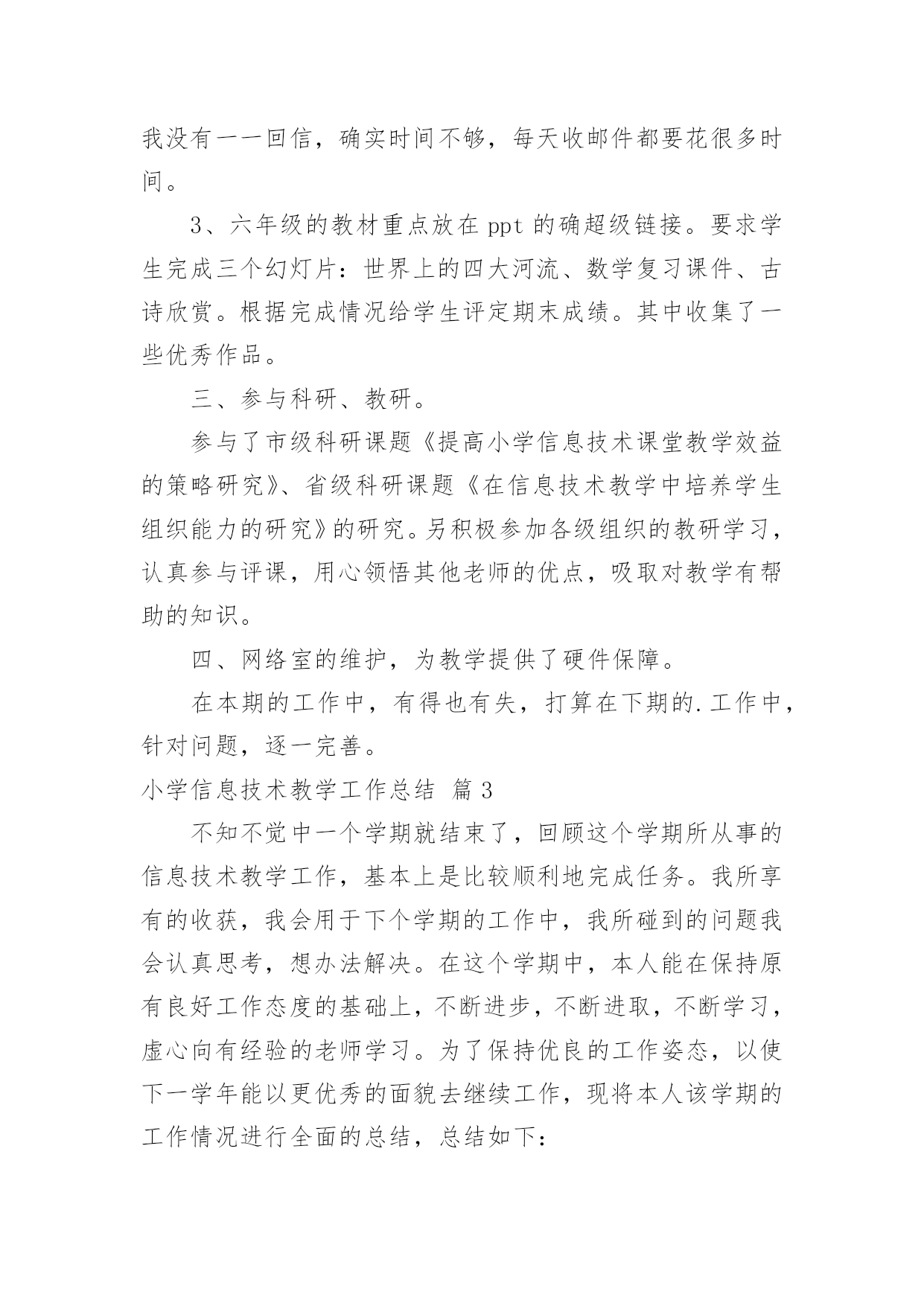小学信息技术教学工作总结小学信息技术教学工作总结四篇在日常生活或是工作学习中,大家都尝试过写信吧,借助书信人们可以传递思想、交流信息。那么你有了解过书信吗?下面是小编为大家整理的小学信息技术教学工作总结4篇,希望能够帮助到大家。小学信息技术教学工作总结篇1一、结合计算机的硬件实际,开展好常规教学。1、分析教材。开学初,根据教学计划模块安排,对具体的教学内容都进行了认真的教学分析,思考在现有计算机软硬件的实际情况下如何实施教学,收效很好。2、激发兴趣。在教学中,为了提高学生学习信息技术的兴趣,在不影响教学的情况下,从光盘上或到网上去找了一些有利于学生智力发展的小游戏,把这些游戏穿插在教育教学过程中,让学生既巩固了所学知识,又提高了学习兴趣,并有助于学生智力发展。经本期实践,取得了很好的效果。学生不但掌握了规定的信息技术知识和达到了规定的操作技能水平,而且还从游戏中学到了许多其它的知识。信息技术课已经成了学生十分喜欢的课程之一。3、兴趣小组。在正常地教学之余,学校成立兴趣信息技术小组,利用兴趣小组活动,学生学到许多平时在信息技术课上学不到的知识,比如有的学生学会制作携画,有的学生学会了电子报刊制作,用计算机来解决一些其它学科学习中遇到的问题。二、加强教学教研,努力提高业务水平。教学的成败取决于教师,教师的素质的高低直接影响着课堂的教学质量,在本学期,在教学之余,加强了对业务的钻研。在本学期,我认真钻研新课程标准,研究教材,探索新教育教学方法,提高业务水平,在网上还注意收集相关资料,以扩大学生的视野。三、充分发挥优势,提高学校办学的信息化发展的水平。作为信息技术教师,应走在学校信息技术发展的前沿,除了搞好信息技术教育教学外,我们还担负着许多其它的任务。学校其它学科公开课的课件制作。另外,学校机房、各室和教师用计算机等,计算机的维护和维修基本上都由我来完成。信息技术是一门不断发展的学科,展望学校的发展和学科的发展,我觉得还有许多知识要学,还有许多事情要做。在今后的教育教学工作中,我将更严格要求自己,努力工作,发扬优点,改正缺点,开拓前进,争取取得更大的进步。小学信息技术教学工作总结篇2一、学生分析:三年级的学生经过一学期的学习,在学习上,学生间差距不大,差距体现在学习习惯上,由于个别学生长期自由散漫,不听老师劝告,甚至教育。尤其是三年四班,学习习惯特差,一些学生不爱学习,并且好斗,经常打架,对学习成绩没有概念,无论优秀与不及格,都与他无关似的,对成绩可以说是不闻不问。五年级发展较均衡,只是全班之后,班额更大了,不便于困难生的辅导。六年级跟开学时预料的一样,学生发生了很大的变大,优生减少,差生增多,学生处在从少年向青年的过渡期,生理和心理都在悄悄发生变化,出现了不爱学习、顽固、自心为是、贪玩等不良现象,尤其是我们这些“副科”,学生更是不以为然,这就使我们的教学更难顺利进行。汲取了前一个六年级的经验,加强了与学生间的交流,本学期与六年级学生相处还比较愉快。二、根据各年级情况调整教学内容和方法。1、三年级本学期注重学习习惯的培养,如:课前排队、课前预习、听课认真、小组协作……开学初,对学生进行网络室管理教育,选拔组长,了解学生,异质分组,注重学生鼠标正常操作、键盘指法的正确运用。经过一学期的努力,大部分学生养成了良好的上机习惯,键盘录入字母速度较快。但对个别学生了解不够深入,师生间缺少交流,学生积极性高,但学习却上不来,还有甚者,根本不动手,懒得很。2、由于本期网络室搬迁,耽误了一些教学时间,就对教学内容作了适当的删减,主要学习了word表格和邮件发送,期末考试内容就是每一位学生给我发一封邮件,学生通过邮件谈了自己在学习上的一些收获,以及对老师的美好祝愿,确实让我很感动,增进了师生间的情感。唯一遗憾的是我没有一一回信,确实时间不够,每天收邮件都要花很多时间。3、六年级的教材重点放在ppt的确超级链接。要求学生完成三个幻灯片:世界上的四大河流、数学复习课件、古诗欣赏。根据完成情况给学生评定期末成绩。其中收集了一些优秀作品。三、参与科研、教研。参与了市级科研课题《提高小学信息技术课堂教学效益的策略研究》、省级科研课题《在信息技术教学中培养学生组织能力的研究》的研究。另积极参加各级组织的教研学习,认真参与评课,用心领悟其他老师的优点,吸取对教学有帮助的知识。四、网络室的维护,为教学提供了硬件保障。在本期的工作中,有得也有失,打算在下期的.工作中,针对问题,逐一完善。小学信息技术教学工作总结篇3不知不觉中一个学期就结束了,回顾这个学期所从事的信息技术教学工作,基本上是比较顺利地完成任务。我所享有的收获,我会用于下个学期的工作中,我所碰到的问题我会认真思考,想办法解决。在这个学期中,本人能在保持原有良好工作态度的基础上,不断进步,不断进取,不断学