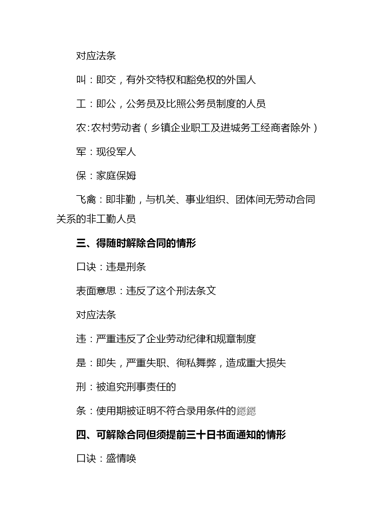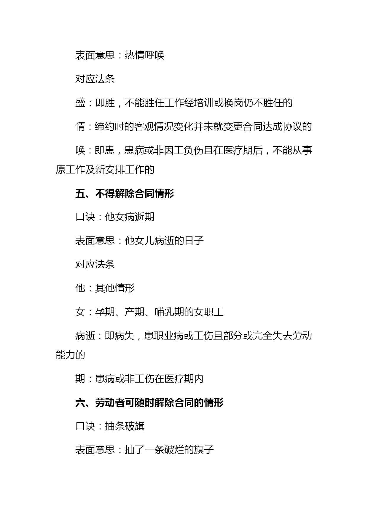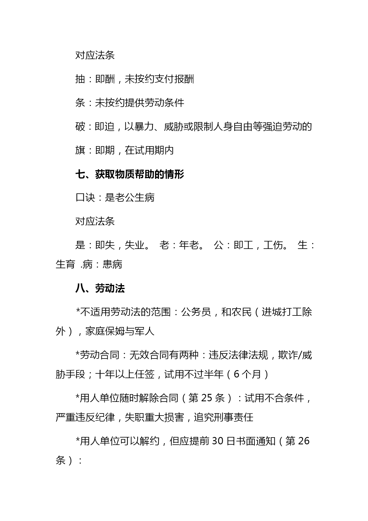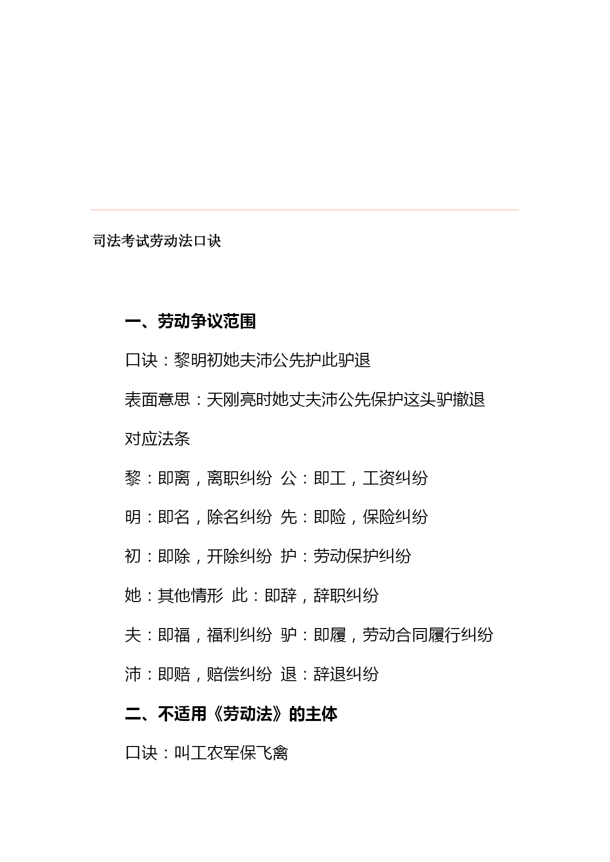 司法考试劳动法口诀汇编(完整版)资料(可以直接使用,可编辑优秀版资料,欢迎下载)司法考试劳动法口诀一、劳动争议范围口诀:黎明初她夫沛公先护此驴退表面意思:天刚亮时她丈夫沛公先保护这头驴撤退对应法条黎:即离,离职纠纷公:即工,工资纠纷明:即名,除名纠纷先:即险,保险纠纷初:即除,开除纠纷护:劳动保护纠纷她:其他情形此:即辞,辞职纠纷夫:即福,福利纠纷驴:即履,劳动合同履行纠纷沛:即赔,赔偿纠纷退:辞退纠纷二、不适用《劳动法》的主体口诀:叫工农军保飞禽对应法条叫:即交,有外交特权和豁免权的外国人工:即公,公务员及比照公务员制度的人员农:农村劳动者(乡镇企业职工及进城务工经商者除外)军:现役军人保:家庭保姆飞禽:即非勤,与机关、事业组织、团体间无劳动合同关系的非工勤人员三、得随时解除合同的情形口诀:违是刑条表面意思:违反了这个刑法条文对应法条违:严重违反了企业劳动纪律和规章制度是:即失,严重失职、徇私舞弊,造成重大损失刑:被追究刑事责任的条:使用期被证明不符合录用条件的四、可解除合同但须提前三十日书面通知的情形口诀:盛情唤表面意思:热情呼唤对应法条盛:即胜,不能胜任工作经培训或换岗仍不胜任的情:缔约时的客观情况变化并未就变更合同达成协议的唤:即患,患病或非因工负伤且在医疗期后,不能从事原工作及新安排工作的五、不得解除合同情形口诀:他女病逝期表面意思:他女儿病逝的日子对应法条他:其他情形女:孕期、产期、哺乳期的女职工病逝:即病失,患职业病或工伤且部分或完全失去劳动能力的期:患病或非工伤在医疗期内六、劳动者可随时解除合同的情形口诀:抽条破旗表面意思:抽了一条破烂的旗子对应法条抽:即酬,未按约支付报酬条:未按约提供劳动条件破:即迫,以暴力、威胁或限制人身自由等强迫劳动的旗:即期,在试用期内七、获取物质帮助的情形口诀:是老公生病对应法条是:即失,失业。老:年老。公:即工,工伤。生:生育.病:患病八、劳动法*不适用劳动法的范围:公务员,和农民(进城打工除外),家庭保姆与军人*劳动合同:无效合同有两种:违反法律法规,欺诈/威胁手段;十年以上任签,试用不过半年(6个月)*用人单位随时解除合同(第25条):试用不合条件,严重违反纪律,失职重大损害,追究刑事责任*用人单位可以解约,但应提前30日书面通知(第26条):医疗期满不能干,培训调整不胜任,客观情况大变化,履行/变更不可能*用人单位不能解除劳动合同(第29条):丧失劳动力,病伤医疗期,女工孕产哺*劳动者随时解约的情形(第32条):试用期内,强迫劳动,报酬/条件,不按合同*加班规定:日不超8h,周不过44h,加班一般日不超1h,特殊日不超3h,月不超36h2021劳动法复习笔记劳动法的概念和调整对象(次重点)3分第一节劳动法的概念1.狭义上的劳动法(识记)即法典式的劳动法,是指全国人大常委会1994年7月5日通过1995年1月1日实施的《劳动法》。2.广义上的劳动法(识记)是指调整劳动关系以及与劳动关系有密切联系的其他关系的法律规范的总和。3.劳动法中劳动的特征(领会)劳动法上的劳动是人们在争取与实现劳动权过程中、有偿性的、双方具有管理与被管理关系的劳动。区别于无偿性义务劳动4.劳动法的渊源(领会)(08年7月论)宪法;法律(劳动法、工会法、矿山安全法);行政法规(国务院制定。中华人民共和国劳动保险条例、女职工劳动保护规定、禁止使用童工规定、失业保险条例);部门规章(劳动和社会保障部。私营企业劳动管理暂行规定、企业经济性裁减人员规定);其他法律规范中有关劳动问题的规定(如经济法中。如乡村集体所有制企业条例);地方性法规和经济特区法规;地方规章;国际法律文件;国际惯例;法律解释5.为什么说《中华人民共和国劳动法》是狭义的劳动法?1.该法是由最高立法机关颁布的法律;2.统一适用于全国(香港、澳门特别行政区及台湾地区除外);3.内容包括涉及劳动关系以及与劳动关系有密切联系的各个方面,是一部全面而系统的法律。6.劳动法调整对象(识记)是劳动关系及与劳动关系有密切联系的其他社会关系。在这两类社会关系中,劳动关系是我国劳动法调整的主要对象。7.劳动法调整的劳动关系(识记)是指在运用劳动能力、实现社会劳动过程中,劳动者与用人单位之间的社会劳动关系。8.劳动关系的特征和种类(领)1劳动关系是在社会劳动过程中所发生的关系。2劳动关系的主体双方,一方是劳动者,另一方是劳动使用者(或用人单位)。3劳动关系主体在维护各自经济利益的过程中,双方的地位是平等的。4.劳动关系主体双方存在管理和被管理关系。9