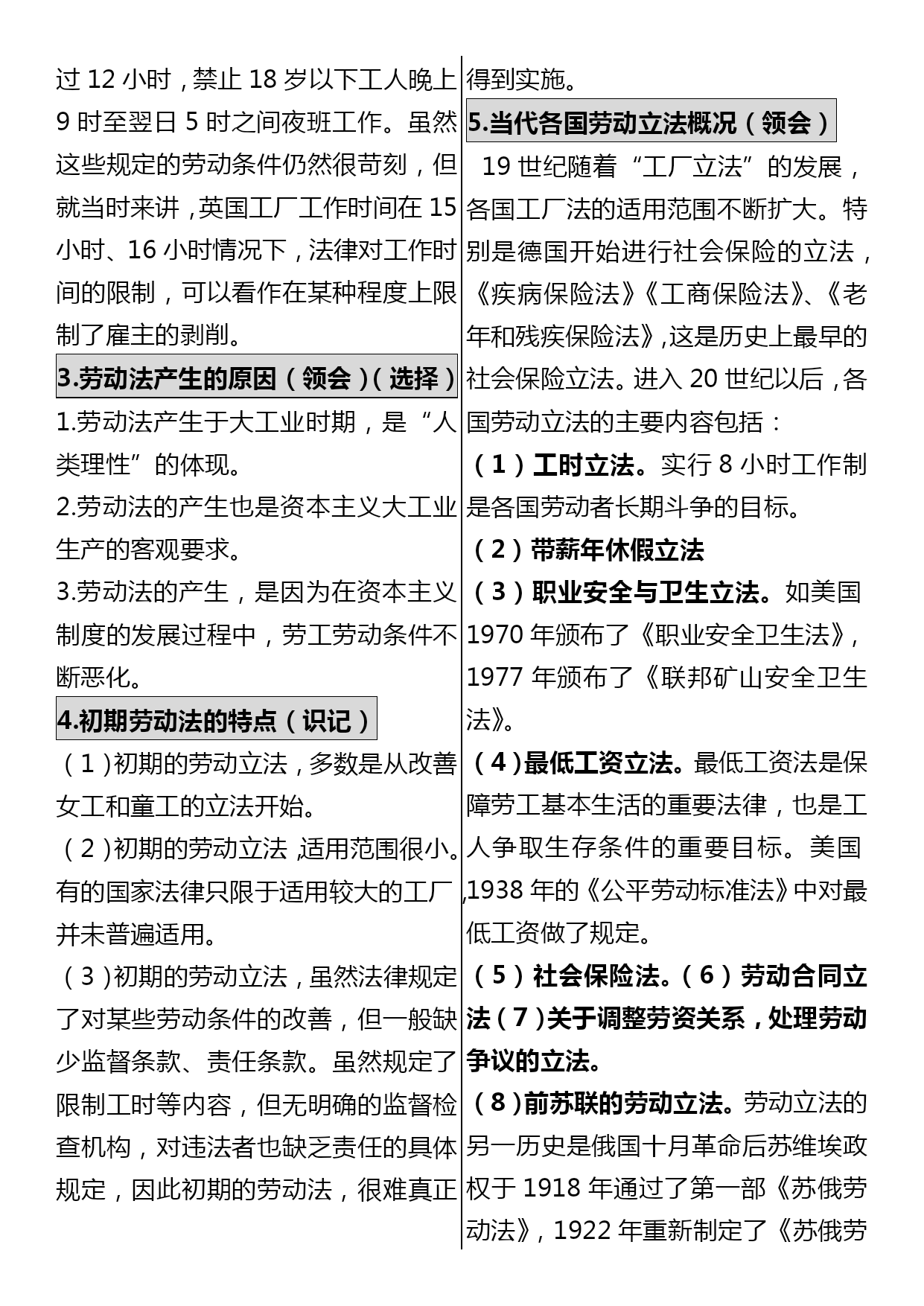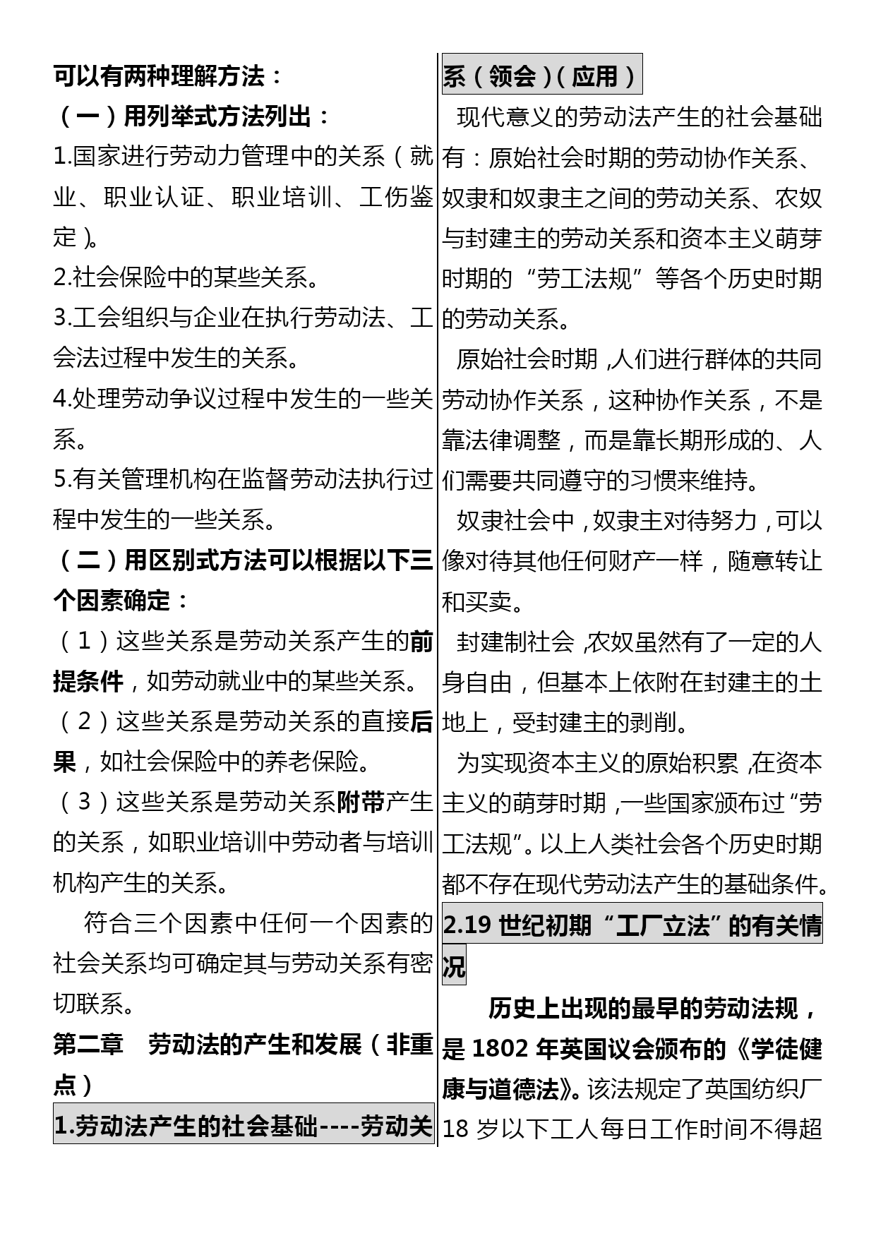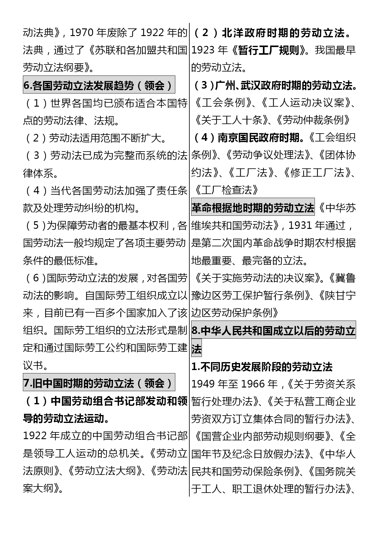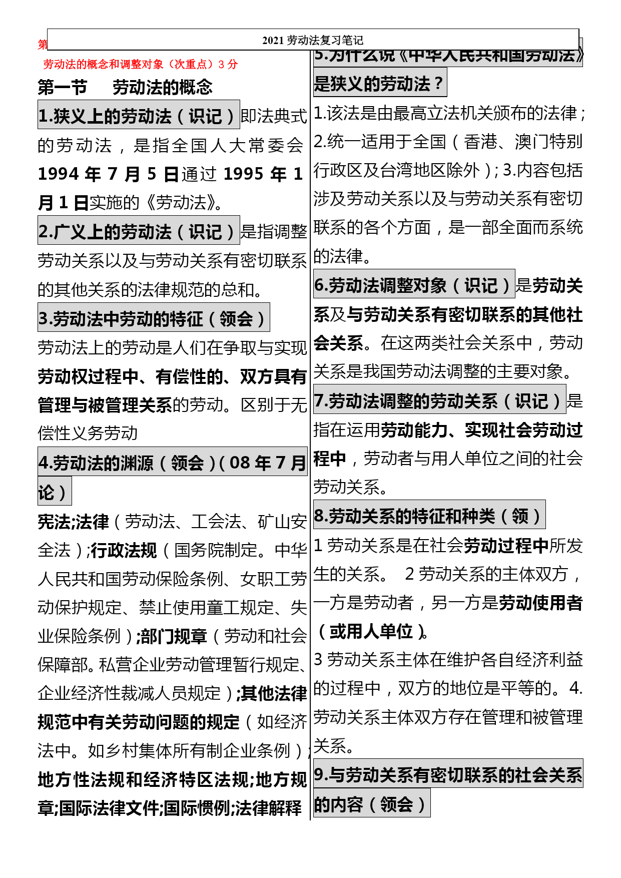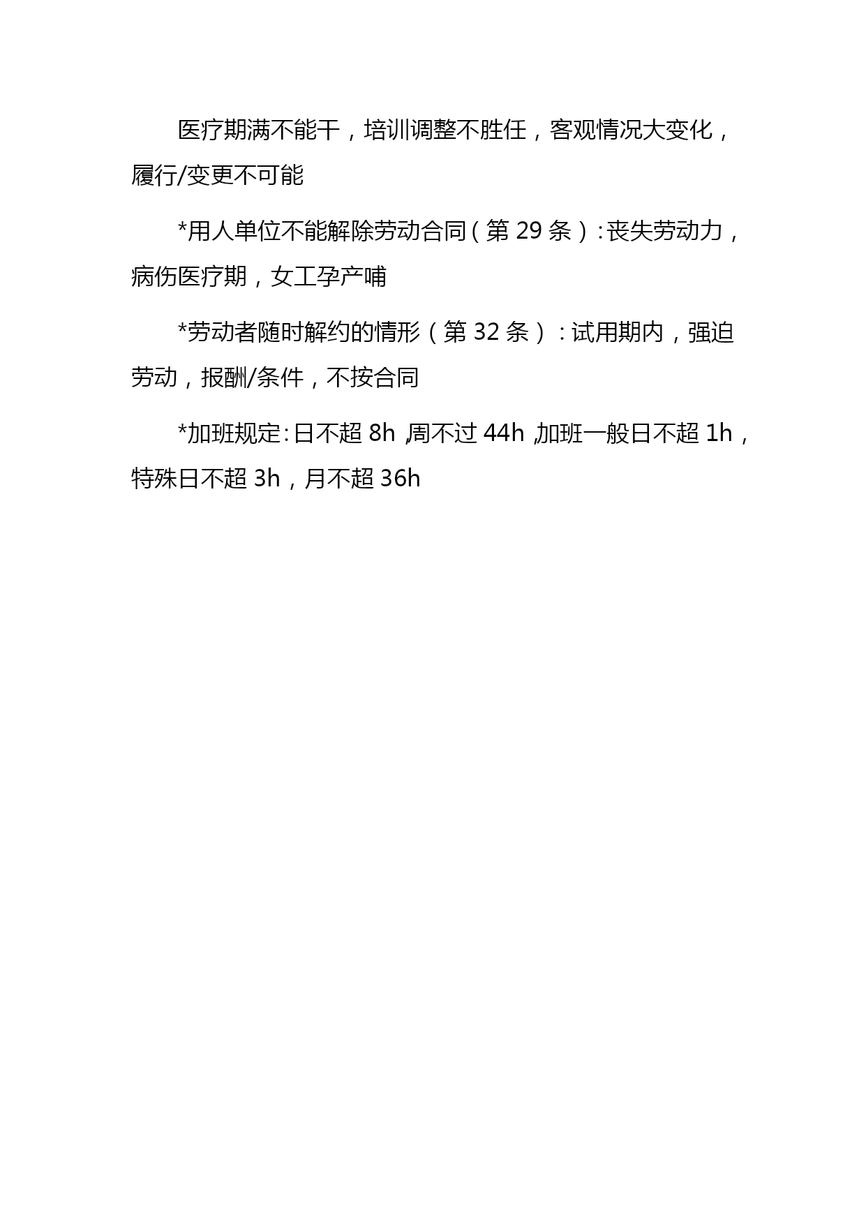 司法考试劳动法口诀汇编(完整版)资料(可以直接使用,可编辑优秀版资料,欢迎下载)司法考试劳动法口诀一、劳动争议范围口诀:黎明初她夫沛公先护此驴退表面意思:天刚亮时她丈夫沛公先保护这头驴撤退对应法条黎:即离,离职纠纷公:即工,工资纠纷明:即名,除名纠纷先:即险,保险纠纷初:即除,开除纠纷护:劳动保护纠纷她:其他情形此:即辞,辞职纠纷夫:即福,福利纠纷驴:即履,劳动合同履行纠纷沛:即赔,赔偿纠纷退:辞退纠纷二、不适用《劳动法》的主体口诀:叫工农军保飞禽对应法条叫:即交,有外交特权和豁免权的外国人工:即公,公务员及比照公务员制度的人员农:农村劳动者(乡镇企业职工及进城务工经商者除外)军:现役军人保:家庭保姆飞禽:即非勤,与机关、事业组织、团体间无劳动合同关系的非工勤人员三、得随时解除合同的情形口诀:违是刑条表面意思:违反了这个刑法条文对应法条违:严重违反了企业劳动纪律和规章制度是:即失,严重失职、徇私舞弊,造成重大损失刑:被追究刑事责任的条:使用期被证明不符合录用条件的四、可解除合同但须提前三十日书面通知的情形口诀:盛情唤表面意思:热情呼唤对应法条盛:即胜,不能胜任工作经培训或换岗仍不胜任的情:缔约时的客观情况变化并未就变更合同达成协议的唤:即患,患病或非因工负伤且在医疗期后,不能从事原工作及新安排工作的五、不得解除合同情形口诀:他女病逝期表面意思:他女儿病逝的日子对应法条他:其他情形女:孕期、产期、哺乳期的女职工病逝:即病失,患职业病或工伤且部分或完全失去劳动能力的期:患病或非工伤在医疗期内六、劳动者可随时解除合同的情形口诀:抽条破旗表面意思:抽了一条破烂的旗子对应法条抽:即酬,未按约支付报酬条:未按约提供劳动条件破:即迫,以暴力、威胁或限制人身自由等强迫劳动的旗:即期,在试用期内七、获取物质帮助的情形口诀:是老公生病对应法条是:即失,失业。老:年老。公:即工,工伤。生:生育.病:患病八、劳动法*不适用劳动法的范围:公务员,和农民(进城打工除外),家庭保姆与军人*劳动合同:无效合同有两种:违反法律法规,欺诈/威胁手段;十年以上任签,试用不过半年(6个月)*用人单位随时解除合同(第25条):试用不合条件,严重违反纪律,失职重大损害,追究刑事责任*用人单位可以解约,但应提前30日书面通知(第26条):医疗期满不能干,培训调整不胜任,客观情况大变化,履行/变更不可能*用人单位不能解除劳动合同(第29条):丧失劳动力,病伤医疗期,女工孕产哺*劳动者随时解约的情形(第32条):试用期内,强迫劳动,报酬/条件,不按合同*加班规定:日不超8h,周不过44h,加班一般日不超1h,特殊日不超3h,月不超36h2021劳动法复习笔记劳动法的概念和调整对象(次重点)3分第一节劳动法的概念1.狭义上的劳动法(识记)即法典式的劳动法,是指全国人大常委会1994年7月5日通过1995年1月1日实施的《劳动法》。2.广义上的劳动法(识记)是指调整劳动关系以及与劳动关系有密切联系的其他关系的法律规范的总和。3.劳动法中劳动的特征(领会)劳动法上的劳动是人们在争取与实现劳动权过程中、有偿性的、双方具有管理与被管理关系的劳动。区别于无偿性义务劳动4.劳动法的渊源(领会)(08年7月论)宪法;法律(劳动法、工会法、矿山安全法);行政法规(国务院制定。中华人民共和国劳动保险条例、女职工劳动保护规定、禁止使用童工规定、失业保险条例);部门规章(劳动和社会保障部。私营企业劳动管理暂行规定、企业经济性裁减人员规定);其他法律规范中有关劳动问题的规定(如经济法中。如乡村集体所有制企业条例);地方性法规和经济特区法规;地方规章;国际法律文件;国际惯例;法律解释5.为什么说《中华人民共和国劳动法》是狭义的劳动法?1.该法是由最高立法机关颁布的法律;2.统一适用于全国(香港、澳门特别行政区及台湾地区除外);3.内容包括涉及劳动关系以及与劳动关系有密切联系的各个方面,是一部全面而系统的法律。6.劳动法调整对象(识记)是劳动关系及与劳动关系有密切联系的其他社会关系。在这两类社会关系中,劳动关系是我国劳动法调整的主要对象。7.劳动法调整的劳动关系(识记)是指在运用劳动能力、实现社会劳动过程中,劳动者与用人单位之间的社会劳动关系。8.劳动关系的特征和种类(领)1劳动关系是在社会劳动过程中所发生的关系。2劳动关系的主体双方,一方是劳动者,另一方是劳动使用者(或用人单位)。3劳动关系主体在维护各自经济利益的过程中,双方的地位是平等的。4.劳动关系主体双方存在管理和被管理关系。9