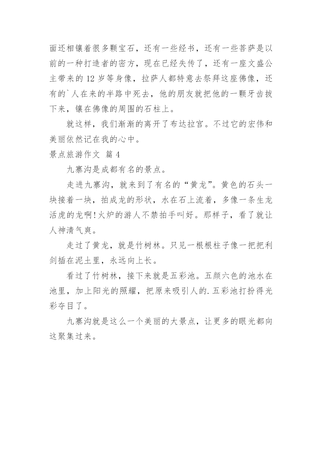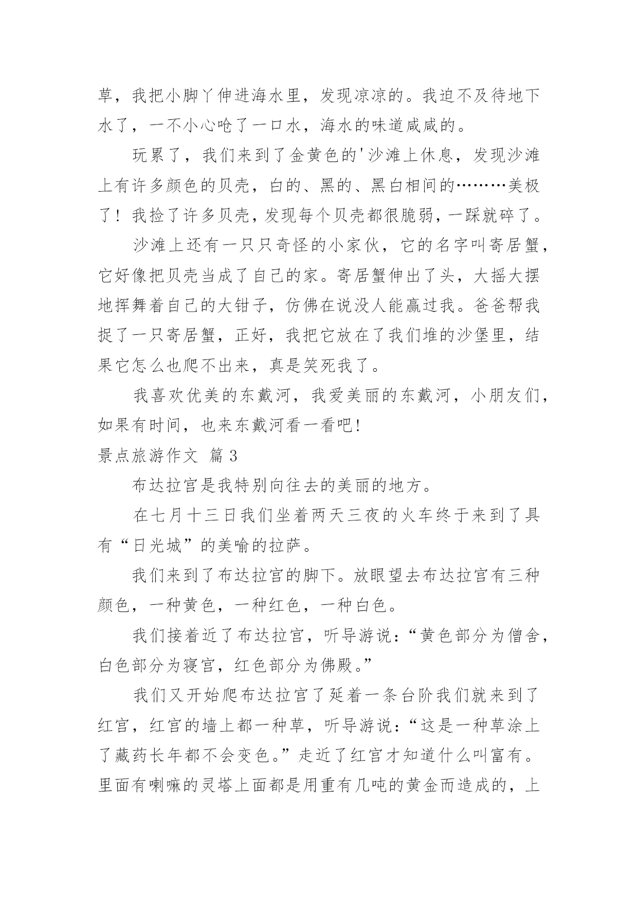 景点旅游作文【精华】景点旅游作文4篇在我们平凡的日常里,大家都跟作文打过交道吧,作文是由文字组成,经过人的思想考虑,通过语言组织来表达一个主题意义的文体。那么一般作文是怎么写的呢?以下是小编帮大家整理的景点旅游作文4篇,仅供参考,希望能够帮助到大家。景点旅游作文篇1今天,我们和爸爸、妈妈还有外公一起开车到蒲江石象湖游玩。石象湖有大片大片的草地和满山的树。抬眼望去,青葱翠绿。五颜六色的花开在路两旁,山坡上有玫瑰花、虞美人、花菱草花和我叫不出名字的各种小花,红的、黄的、橙的、紫的、蓝的.。色彩缤纷,满山遍野,真是美极了。因为地震,大坝损坏,所以我们没能乘船游湖。我们沿着湖滨路步行就像到了天然氧吧里,空气清新。走着走着,看不见前面的路,感觉像迷路了,但是爸爸说:车到山前必有路,我又重新鼓起勇气,坚持到底,终于走到了大路上。我度过了愉快的一天。景点旅游作文篇2暑假,爸爸,妈妈带着我去了东戴河,东戴河可真美啊!刚到东戴河,我们就来到了海边,我被眼前的海面吸引住了,海面面风平浪静,犹如一面镜子。海水里有绿色的海草,我把小脚丫伸进海水里,发现凉凉的。我迫不及待地下水了,一不小心呛了一口水,海水的味道咸咸的。玩累了,我们来到了金黄色的'沙滩上休息,发现沙滩上有许多颜色的贝壳,白的、黑的、黑白相间的………美极了!我捡了许多贝壳,发现每个贝壳都很脆弱,一踩就碎了。沙滩上还有一只只奇怪的小家伙,它的名字叫寄居蟹,它好像把贝壳当成了自己的家。寄居蟹伸出了头,大摇大摆地挥舞着自己的大钳子,仿佛在说没人能赢过我。爸爸帮我捉了一只寄居蟹,正好,我把它放在了我们堆的沙堡里,结果它怎么也爬不出来,真是笑死我了。我喜欢优美的东戴河,我爱美丽的东戴河,小朋友们,如果有时间,也来东戴河看一看吧!景点旅游作文篇3布达拉宫是我特别向往去的美丽的地方。在七月十三日我们坐着两天三夜的火车终于来到了具有“日光城”的美喻的拉萨。我们来到了布达拉宫的脚下。放眼望去布达拉宫有三种颜色,一种黄色,一种红色,一种白色。我们接着近了布达拉宫,听导游说:“黄色部分为僧舍,白色部分为寝宫,红色部分为佛殿。”我们又开始爬布达拉宫了延着一条台阶我们就来到了红宫,红宫的墙上都一种草,听导游说:“这是一种草涂上了藏药长年都不会变色。”走近了红宫才知道什么叫富有。里面有喇嘛的灵塔上面都是用重有几吨的黄金而造成的,上面还相镶着很多颗宝石,还有一些经书,还有一些菩萨是以前的一种打造者的密方,现在已经失传了,还有一座文盛公主带来的12岁等身像,拉萨人都特意去祭拜这座佛像,还有的`人在来的半路中死去,他的朋友就把他的一颗牙齿拔下来,镶在佛像的周围的石柱上。就这样,我们渐渐的离开了布达拉宫。不过它的宏伟和美丽依然记在我的心中。景点旅游作文篇4九寨沟是成都有名的景点。走进九寨沟,就来到了有名的“黄龙”。黄色的石头一块接着一块,拍成龙的形状,水在石上流着,多像一条生龙活虎的龙啊!火炉的游人不禁拍手叫好。那样子,看了就让人神清气爽。走过了黄龙,就是竹树林。只见一根根柱子像一把把利剑插在泥土里,永远向上长。看过了竹树林,接下来就是五彩池。五颜六色的池水在池里,加上阳光的照耀,把原来吸引人的.五彩池打扮得光彩夺目了。九寨沟就是这么一个美丽的大景点,让更多的眼光都向这聚集过来。