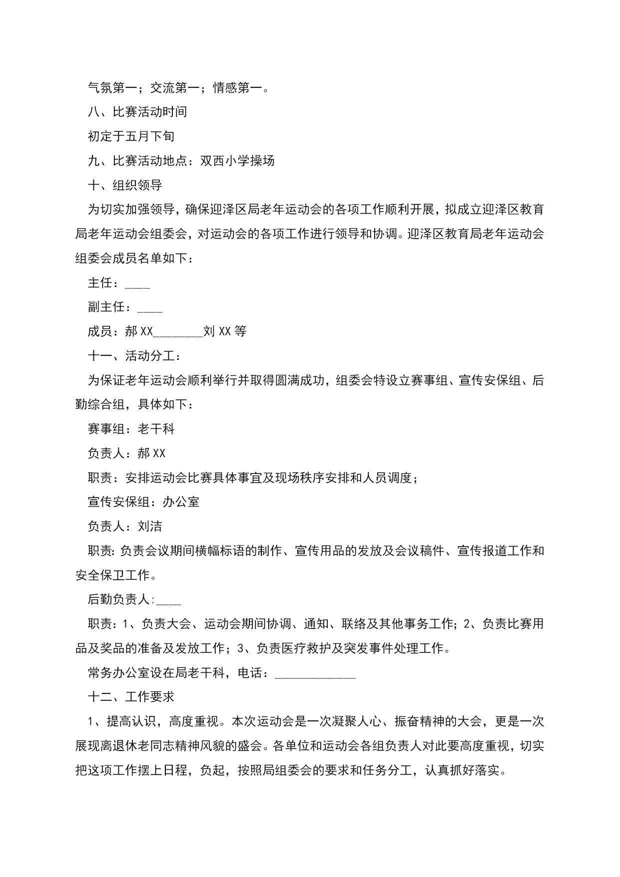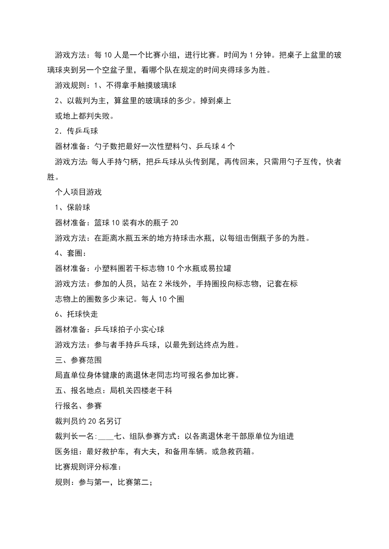 老年趣味运动会策划2014趣味运动会一、活动名称2014运动会二、活动时间9月16日上午9:00至11:30。三、活动地点三楼聚艺厅四、参赛对象全体工作人员五、比赛项目踢毽子、夹弹子、投掷套圈、保龄球、投掷飞镖、呼啦圈六、比赛规程一踢毽子比赛前选手试好毽子做好准备,手持键子做好准备。裁判员法令后计时,计数裁判也同时开始计数。6人一组进行比赛,评出前三名获得优胜奖。二夹弹子用筷子夹弹子,6人一组,按照夹弹子数量前三名获得奖品。三投掷套圈每人可以连续套5次,累计得分最高者前3名获奖。四投掷飞镖每人可以连续投掷飞镖10次,按投掷到中心区域次数计算,投掷到中心区域最多次的分别获得前三名。五呼啦圈用筷子夹弹子,5人一组,时间为2分钟,看谁转的圈多,按照圈数评出前三名获奖。八、奖项设置:参与奖三等奖二等奖一等奖九、比赛筹备一、人员安排1、活动总负责:活动筹备组:后勤保障:人员组织:2、现场协调:3、各比赛项目负责人踢毽子:夹弹子:投掷套圈:投掷飞镖:呼啦圈:4、奖品领取处1人:5、秩序维护:二、材料购买及准备一比赛器材购买1、毽子10个2、筷子8双弹子6碗3、投掷套圈道具日托所有4、投掷飞镖套组5、呼啦圈6个二奖品参与奖档次:30份一等奖:5份二等奖:5份三等奖:5份美特康智能居家养老服务中心8月15日目录一、活动背景二、活动目的三、活动名称四、活动主题五、活动时间六、活动地点七、活动人员及安排八、活动准备九、活动流程十、活动经费十一、注意事项附:人员联系表计分表物资表一、活动背景:中秋节是中国传统节日,也是家家户户都特别重视的一个节日。中秋节是家人团圆的日子,也是人们寄托思念的节日。每个人都会老,通过此次活动给社区的老人们献上我们的爱心,呼吁更多人去关注老年人,敬老爱老,让他们时时刻刻能够感受到美特康的温暖,更感受到政府对老年人的重视!二、活动目的:通过与社区居民欢度中秋,与居民共同融入一个大家庭,真正的走进居民中,不仅给社区居民一个很好的热闹的机会,更是深入民众了解人们需求更好开展后续工作的时机。三、活动名称:中秋大联欢四、活动主题:和谐北坦济世安民夕阳别样红六、活动地点聚贤北区社会组织孵化中心二楼七、活动准备:物资准备:面粉60斤,肉10斤,蔬菜20斤,鸡蛋5斤,擀面杖8个,面板6个,盆12个,电锅3个,刀6把,饮水机一个,食用油2.5L,食用盐2包,酱油2瓶,花椒粉2两,矿泉水3桶。八、活动人员及安排:社区老人100人照相人员:2人____等后勤人员:2人服务中心把老人分成6组,每组选出一名负责人,负责领取物料。九、活动流程一、前期准备1.9月2日上午8点30分在聚贤北区的社会组织孵化中心二楼签到。2.活动于9点准时开始二、活动开展11.照相留念在活动即将结束时,老人、社区工作人员及志愿者共同合影留念三、后期工作1.清理会场。其分配人员与布置会场人员分配一致2.清点物资。由各部负责人根据物资表清点物资十、活动经费表趣味运动会一、活动背景:春节是中国传统节日,也是家家户户都特别重视的一个节日。春节是家人团圆的日子,也是人们寄托思念的节日。每个人都会老,通过此次活动给社区的老人们献上我们的爱心,呼吁更多人去关注老年人,敬老爱老,让他们时时刻刻能够感受到美特康的温暖,更感受到政府对老年人的重视!二、活动目的:通过与社区居民欢度春节,与居民共同融入一个大家庭,真正的走进居民中,不仅给社区居民一个很好的热闹的机会,更是深入民众了解人们需求更好开展后续工作的时机。三、活动名称:春节前大联欢四、活动主题:展览路朝阳庵社区活动室七、活动准备:物资准备:面粉60斤,肉10斤,蔬菜20斤,鸡蛋5斤,擀面杖8个,面板6个,盆12个,电锅3个,刀6把,饮水机一个,食用油2.5L,食用盐2包,酱油2瓶,花椒粉2两,矿泉水3桶。八、活动人员及安排:社区老人50人照相人员:2人____等后勤人员:2人志愿者把老人分成6组,每组选出一名负责人,负责领取物料。九、活动流程一、前期准备1.9月2日上午8点30分在朝阳XX门前签到2.活动于9点准时开始二、活动开展11.照相留念在活动即将结束时,老人、社区工作人员及志愿者共同合影留念三、后期工作1.清理会场。其分配人员与布置会场人员分配一致2.清点物资。由各部负责人根据物资表清点物资十、活动经费表一、比赛目的1、陶冶情操、愉悦精神、交流思想、锻炼身体2、丰富老年人晚年的精神文化娱乐生活3、增进了老年人之间交流与了解4、通过本次活动呼吁社会上更多人加入我们的行列,共同关注老年人的身体和精神状况二、参赛对象社区内的所有能够参加下列活动的老年人三、参加人数计划组织五支参赛队伍,每一队共10人四、活动主题我健康,我快乐,我运动五、比赛场地社区活动中心六、活动时间5月1日星期日七、活动变化因为比赛是在室外进行,受天气影响较