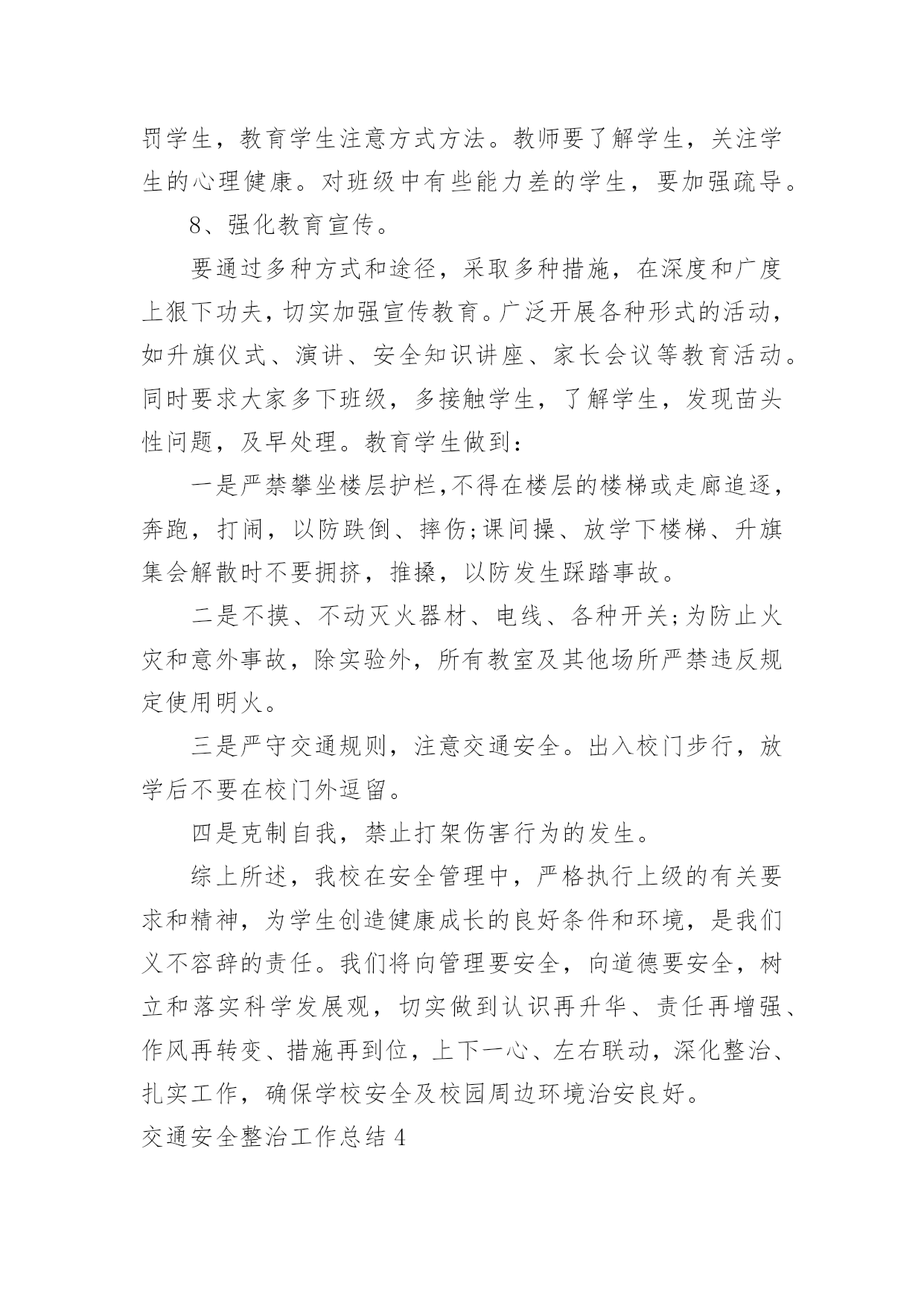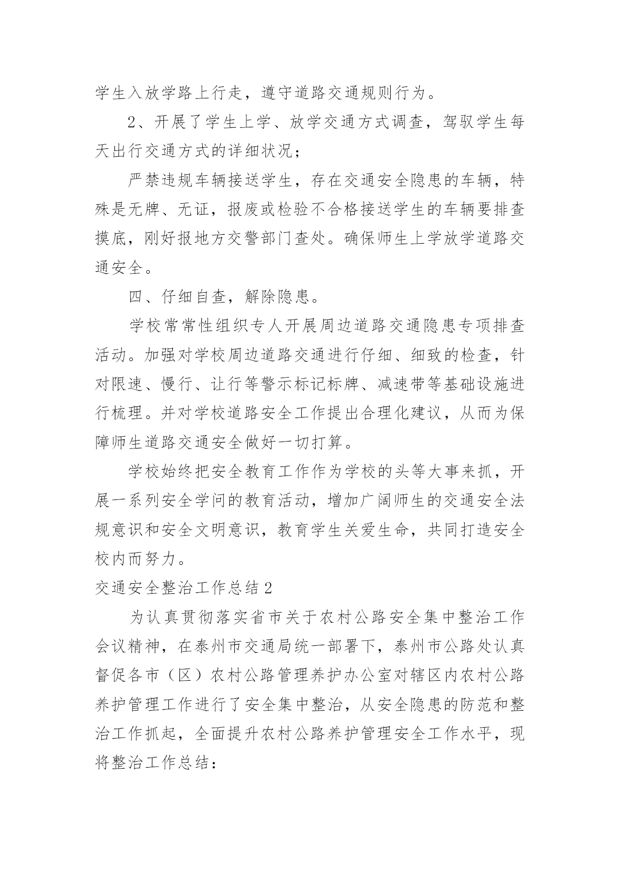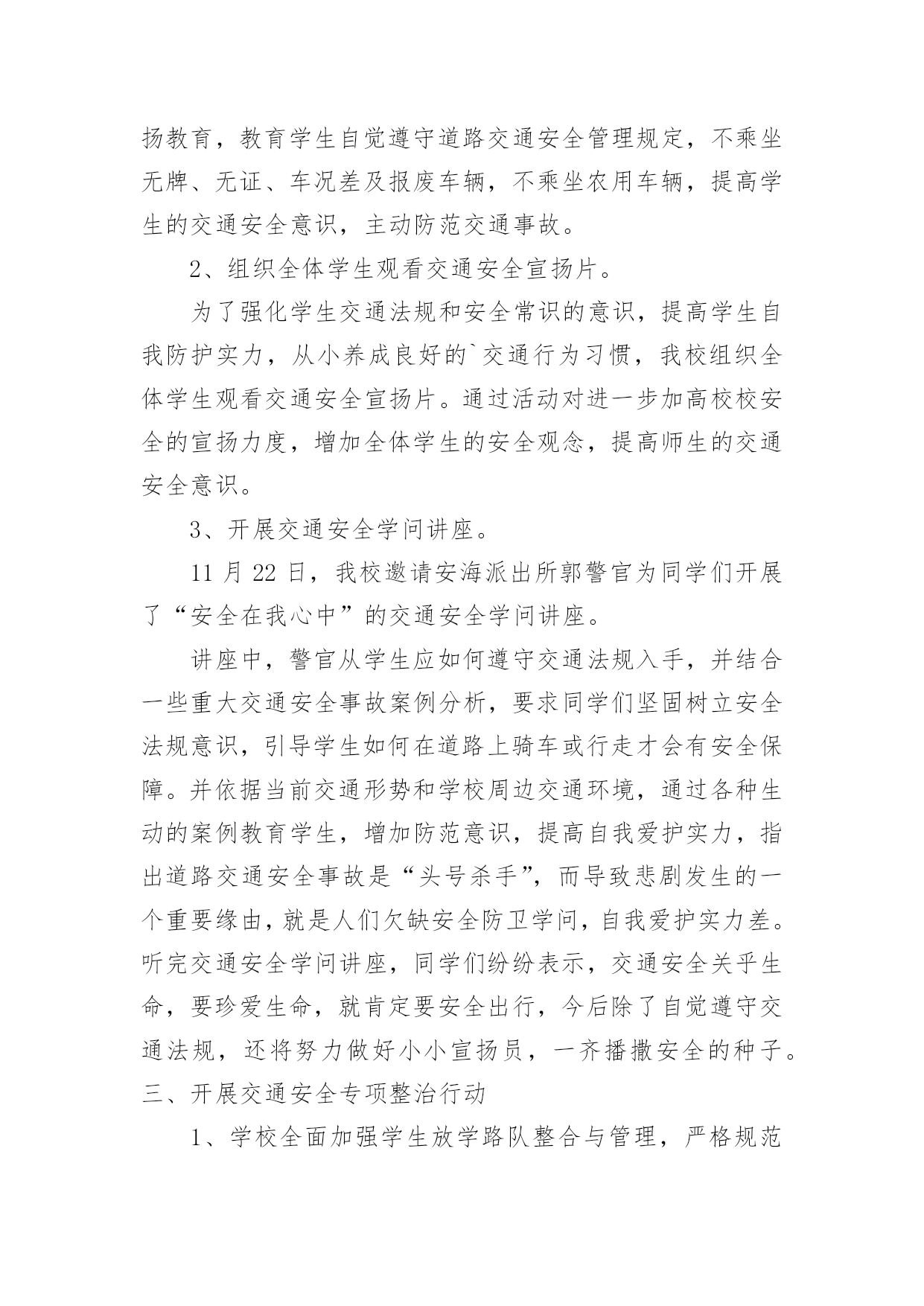 交通安全整治工作总结交通安全整治工作总结总结是对某一阶段的工作、学习或思想中的经验或情况进行分析研究的书面材料,它能使我们及时找出错误并改正,因此我们要做好归纳,写好总结。那么总结要注意有什么内容呢?下面是小编收集整理的交通安全整治工作总结,欢迎大家借鉴与参考,希望对大家有所帮助。交通安全整治工作总结1为了强化学生交通法规和安全常识的意识,提高学生自我防护实力,从小养成良好的交通行为习惯学校高度重视,开展一系列活动,在活动中,不断加强学生道路交通安全宣扬教育,强化学校师生及家长的道路交通安全和乘车安全意识,自觉抵制交通违法违规行为。现将活动开展小结如下:一、营造宣扬教育氛围学校悬挂有关道路交通安全的宣扬标语横幅、宣扬内容进行更新和完善。充分利用校讯通平台、社区广播等开展交通安全常态化宣扬,播放交通安全宣扬标语和安全提示语,努力营造深厚的校内氛围。二、加强宣扬教育,强化师生交通安全意识1、利用国旗下的讲话利用国旗下的讲话等形式对学生集中开展交通安全宣扬教育,教育学生自觉遵守道路交通安全管理规定,不乘坐无牌、无证、车况差及报废车辆,不乘坐农用车辆,提高学生的交通安全意识,主动防范交通事故。2、组织全体学生观看交通安全宣扬片。为了强化学生交通法规和安全常识的意识,提高学生自我防护实力,从小养成良好的`交通行为习惯,我校组织全体学生观看交通安全宣扬片。通过活动对进一步加高校校安全的宣扬力度,增加全体学生的安全观念,提高师生的交通安全意识。3、开展交通安全学问讲座。11月22日,我校邀请安海派出所郭警官为同学们开展了“安全在我心中”的交通安全学问讲座。讲座中,警官从学生应如何遵守交通法规入手,并结合一些重大交通安全事故案例分析,要求同学们坚固树立安全法规意识,引导学生如何在道路上骑车或行走才会有安全保障。并依据当前交通形势和学校周边交通环境,通过各种生动的案例教育学生,增加防范意识,提高自我爱护实力,指出道路交通安全事故是“头号杀手”,而导致悲剧发生的一个重要缘由,就是人们欠缺安全防卫学问,自我爱护实力差。听完交通安全学问讲座,同学们纷纷表示,交通安全关乎生命,要珍爱生命,就肯定要安全出行,今后除了自觉遵守交通法规,还将努力做好小小宣扬员,一齐播撒安全的种子。三、开展交通安全专项整治行动1、学校全面加强学生放学路队整合与管理,严格规范学生入放学路上行走,遵守道路交通规则行为。2、开展了学生上学、放学交通方式调查,驾驭学生每天出行交通方式的详细状况;严禁违规车辆接送学生,存在交通安全隐患的车辆,特殊是无牌、无证,报废或检验不合格接送学生的车辆要排查摸底,刚好报地方交警部门查处。确保师生上学放学道路交通安全。四、仔细自查,解除隐患。学校常常性组织专人开展周边道路交通隐患专项排查活动。加强对学校周边道路交通进行仔细、细致的检查,针对限速、慢行、让行等警示标记标牌、减速带等基础设施进行梳理。并对学校道路安全工作提出合理化建议,从而为保障师生道路交通安全做好一切打算。学校始终把安全教育工作作为学校的头等大事来抓,开展一系列安全学问的教育活动,增加广阔师生的交通安全法规意识和安全文明意识,教育学生关爱生命,共同打造安全校内而努力。交通安全整治工作总结2为认真贯彻落实省市关于农村公路安全集中整治工作会议精神,在泰州市交通局统一部署下,泰州市公路处认真督促各市(区)农村公路管理养护办公室对辖区内农村公路养护管理工作进行了安全集中整治,从安全隐患的防范和整治工作抓起,全面提升农村公路养护管理安全工作水平,现将整治工作总结:一、高度重视,周密部署,全面开展农村公路管理养护安全整治工作xx年7月底,公路处将《江苏省农村道路交通安全集中整治工作方案》转发至各县区,对涉及到农村公路养护管理工作的整治重点、目标、工作措施、时间阶段和人员组织提出了要求。并要求各市(区)认真制定安全集中整治的实施方案,坚持科学发展观,以杜绝农村公路养护管理中存在的安全隐患、保障广大人民群众的出行安全为出发点,全面开展农村公路管理养护安全集中整治工作。二、精心组织,狠抓落实,稳步推进农村公路管理养护安全整治工作1.认真落实隐患排查整改制度。对全市农村公路进行定期检查和不定期抽查,发现问题,迅速整改,及时将各类事故隐患消除在萌芽状态。2.突出隐患排查治理。集中力量、深入扎实地开展农村道路交通安全集中整治,督促各市(区)组织力量调查各自辖区内的.农村公路,对需要进行小修保养工程的立即全面实施;对危桥现象认真落实交通事故隐患报告制度和隐患排查制度,对存在重大交通事故隐患的进行拆除;对路面出现的坑槽等破损路面进行修补,恢复正常通行;对道路的交叉口、急弯、村庄密集区、危桥处等处缺损标志进行补缺完善,对缺损的路面标线也进行补缺完善。迅速落实整改措施,及时将各类事故隐患消除在萌芽状态。3、努力构