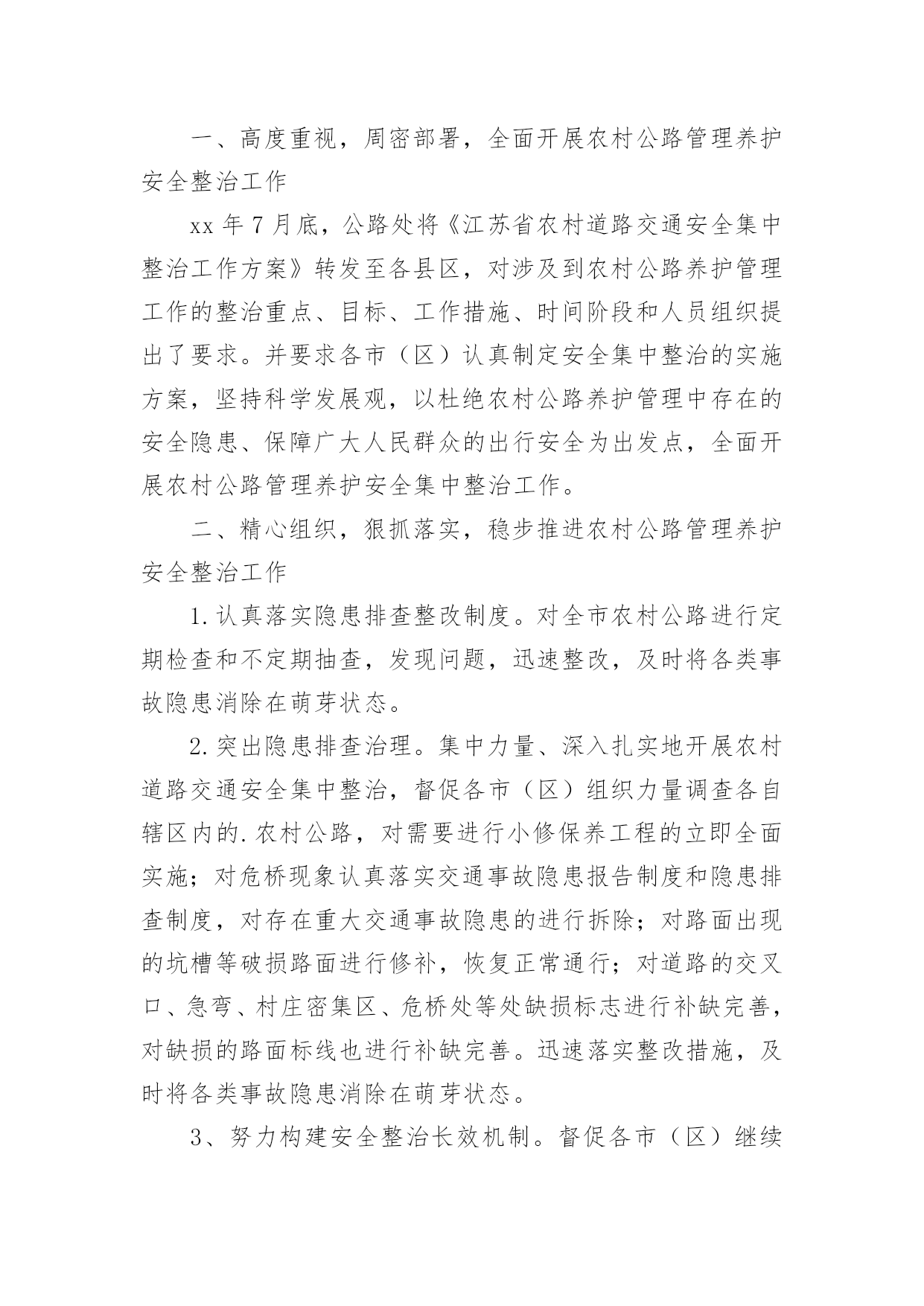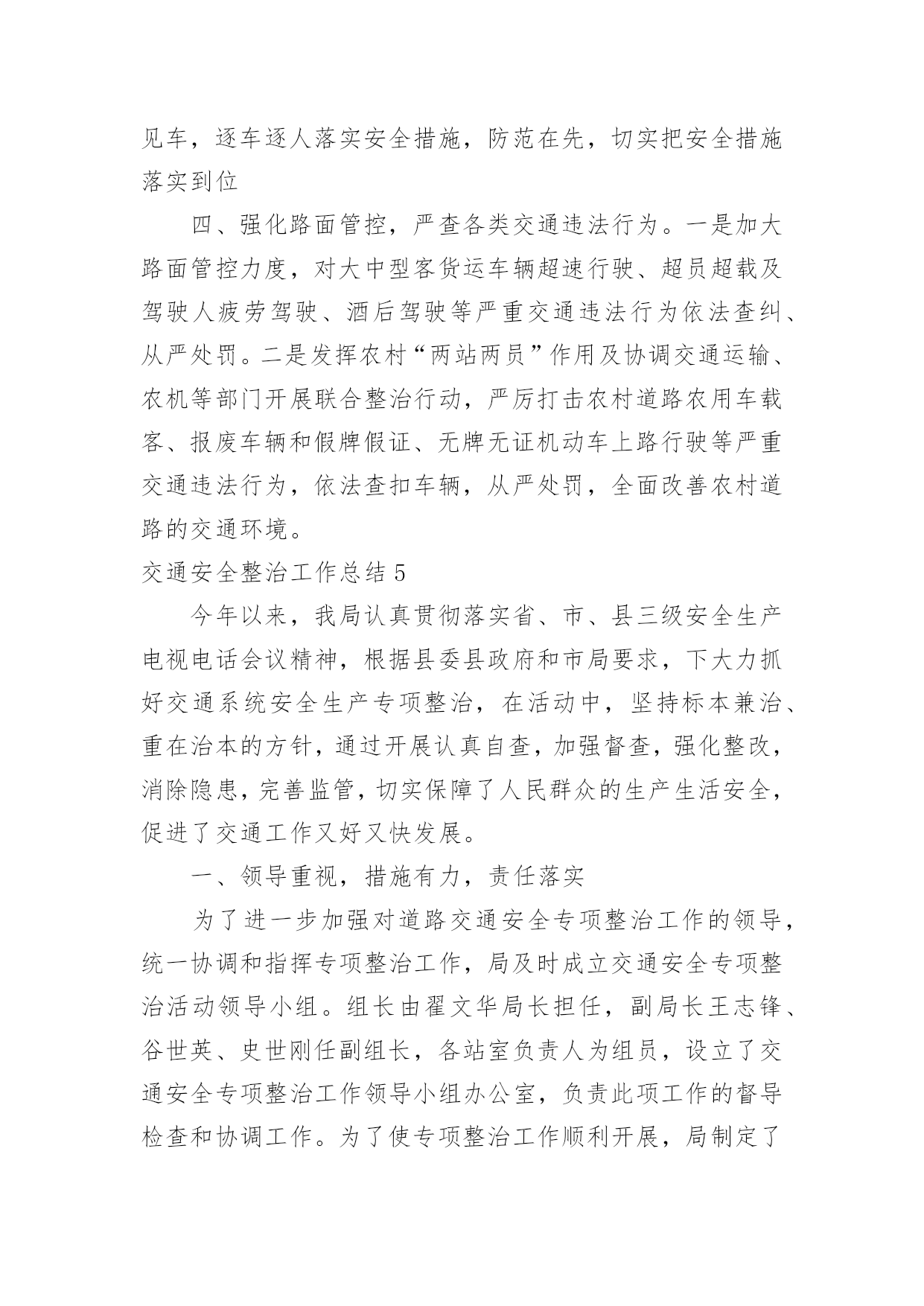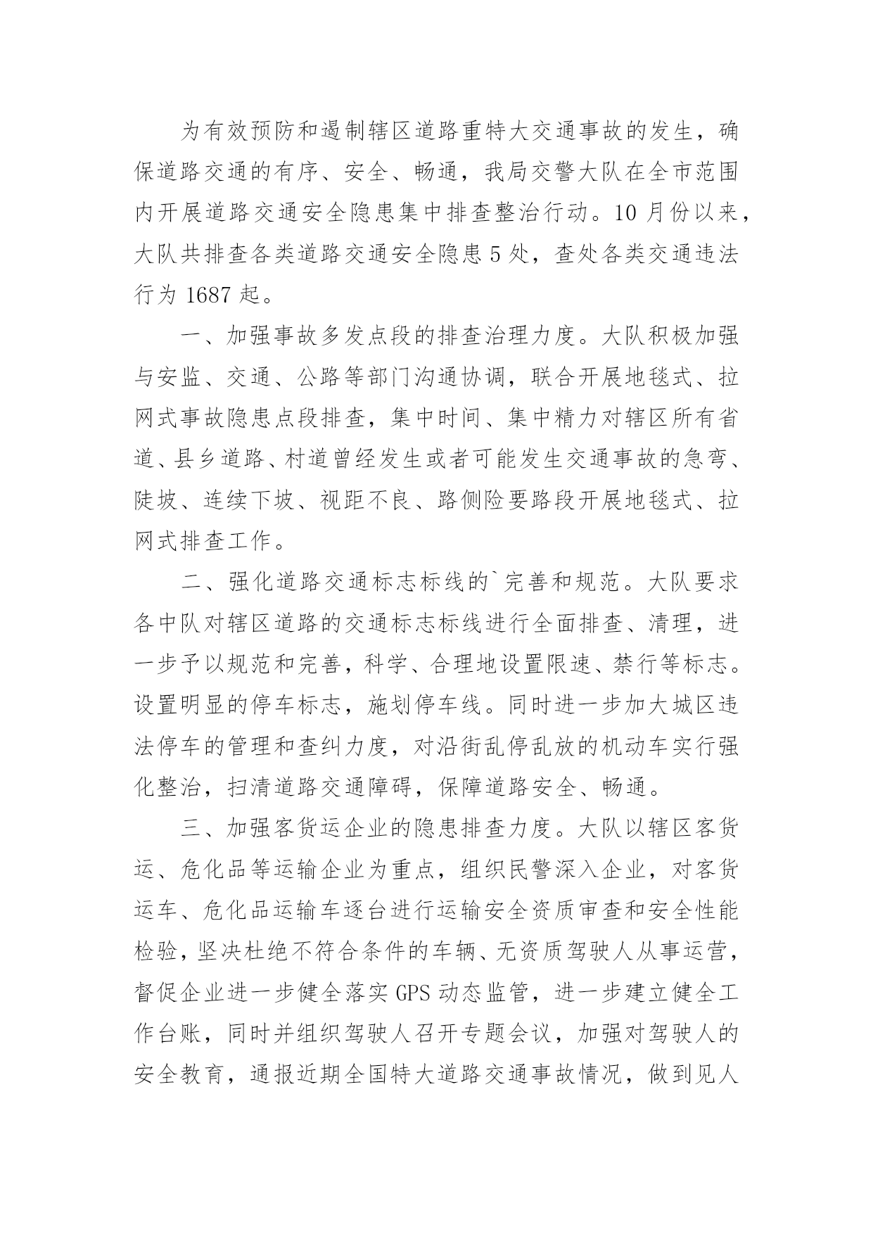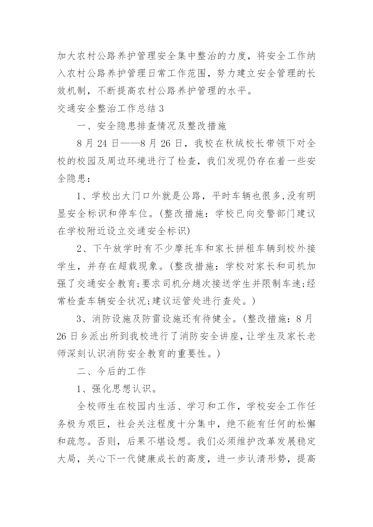 交通安全整治工作总结交通安全整治工作总结总结是对某一阶段的工作、学习或思想中的经验或情况进行分析研究的书面材料,它能使我们及时找出错误并改正,因此我们要做好归纳,写好总结。那么总结要注意有什么内容呢?下面是小编收集整理的交通安全整治工作总结,欢迎大家借鉴与参考,希望对大家有所帮助。交通安全整治工作总结1为了强化学生交通法规和安全常识的意识,提高学生自我防护实力,从小养成良好的交通行为习惯学校高度重视,开展一系列活动,在活动中,不断加强学生道路交通安全宣扬教育,强化学校师生及家长的道路交通安全和乘车安全意识,自觉抵制交通违法违规行为。现将活动开展小结如下:一、营造宣扬教育氛围学校悬挂有关道路交通安全的宣扬标语横幅、宣扬内容进行更新和完善。充分利用校讯通平台、社区广播等开展交通安全常态化宣扬,播放交通安全宣扬标语和安全提示语,努力营造深厚的校内氛围。二、加强宣扬教育,强化师生交通安全意识1、利用国旗下的讲话利用国旗下的讲话等形式对学生集中开展交通安全宣扬教育,教育学生自觉遵守道路交通安全管理规定,不乘坐无牌、无证、车况差及报废车辆,不乘坐农用车辆,提高学生的交通安全意识,主动防范交通事故。2、组织全体学生观看交通安全宣扬片。为了强化学生交通法规和安全常识的意识,提高学生自我防护实力,从小养成良好的`交通行为习惯,我校组织全体学生观看交通安全宣扬片。通过活动对进一步加高校校安全的宣扬力度,增加全体学生的安全观念,提高师生的交通安全意识。3、开展交通安全学问讲座。11月22日,我校邀请安海派出所郭警官为同学们开展了“安全在我心中”的交通安全学问讲座。讲座中,警官从学生应如何遵守交通法规入手,并结合一些重大交通安全事故案例分析,要求同学们坚固树立安全法规意识,引导学生如何在道路上骑车或行走才会有安全保障。并依据当前交通形势和学校周边交通环境,通过各种生动的案例教育学生,增加防范意识,提高自我爱护实力,指出道路交通安全事故是“头号杀手”,而导致悲剧发生的一个重要缘由,就是人们欠缺安全防卫学问,自我爱护实力差。听完交通安全学问讲座,同学们纷纷表示,交通安全关乎生命,要珍爱生命,就肯定要安全出行,今后除了自觉遵守交通法规,还将努力做好小小宣扬员,一齐播撒安全的种子。三、开展交通安全专项整治行动1、学校全面加强学生放学路队整合与管理,严格规范学生入放学路上行走,遵守道路交通规则行为。2、开展了学生上学、放学交通方式调查,驾驭学生每天出行交通方式的详细状况;严禁违规车辆接送学生,存在交通安全隐患的车辆,特殊是无牌、无证,报废或检验不合格接送学生的车辆要排查摸底,刚好报地方交警部门查处。确保师生上学放学道路交通安全。四、仔细自查,解除隐患。学校常常性组织专人开展周边道路交通隐患专项排查活动。加强对学校周边道路交通进行仔细、细致的检查,针对限速、慢行、让行等警示标记标牌、减速带等基础设施进行梳理。并对学校道路安全工作提出合理化建议,从而为保障师生道路交通安全做好一切打算。学校始终把安全教育工作作为学校的头等大事来抓,开展一系列安全学问的教育活动,增加广阔师生的交通安全法规意识和安全文明意识,教育学生关爱生命,共同打造安全校内而努力。交通安全整治工作总结2为认真贯彻落实省市关于农村公路安全集中整治工作会议精神,在泰州市交通局统一部署下,泰州市公路处认真督促各市(区)农村公路管理养护办公室对辖区内农村公路养护管理工作进行了安全集中整治,从安全隐患的防范和整治工作抓起,全面提升农村公路养护管理安全工作水平,现将整治工作总结:一、高度重视,周密部署,全面开展农村公路管理养护安全整治工作xx年7月底,公路处将《江苏省农村道路交通安全集中整治工作方案》转发至各县区,对涉及到农村公路养护管理工作的整治重点、目标、工作措施、时间阶段和人员组织提出了要求。并要求各市(区)认真制定安全集中整治的实施方案,坚持科学发展观,以杜绝农村公路养护管理中存在的安全隐患、保障广大人民群众的出行安全为出发点,全面开展农村公路管理养护安全集中整治工作。二、精心组织,狠抓落实,稳步推进农村公路管理养护安全整治工作1.认真落实隐患排查整改制度。对全市农村公路进行定期检查和不定期抽查,发现问题,迅速整改,及时将各类事故隐患消除在萌芽状态。2.突出隐患排查治理。集中力量、深入扎实地开展农村道路交通安全集中整治,督促各市(区)组织力量调查各自辖区内的.农村公路,对需要进行小修保养工程的立即全面实施;对危桥现象认真落实交通事故隐患报告制度和隐患排查制度,对存在重大交通事故隐患的进行拆除;对路面出现的坑槽等破损路面进行修补,恢复正常通行;对道路的交叉口、急弯、村庄密集区、危桥处等处缺损标志进行补缺完善,对缺损的路面标线也进行补缺完善。迅速落实整改措施,及时将各类事故隐患消除在萌芽状态。3、努力构