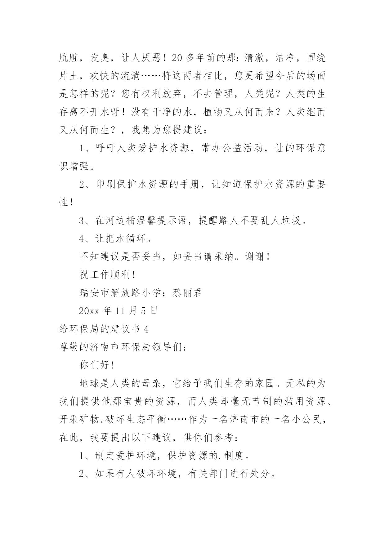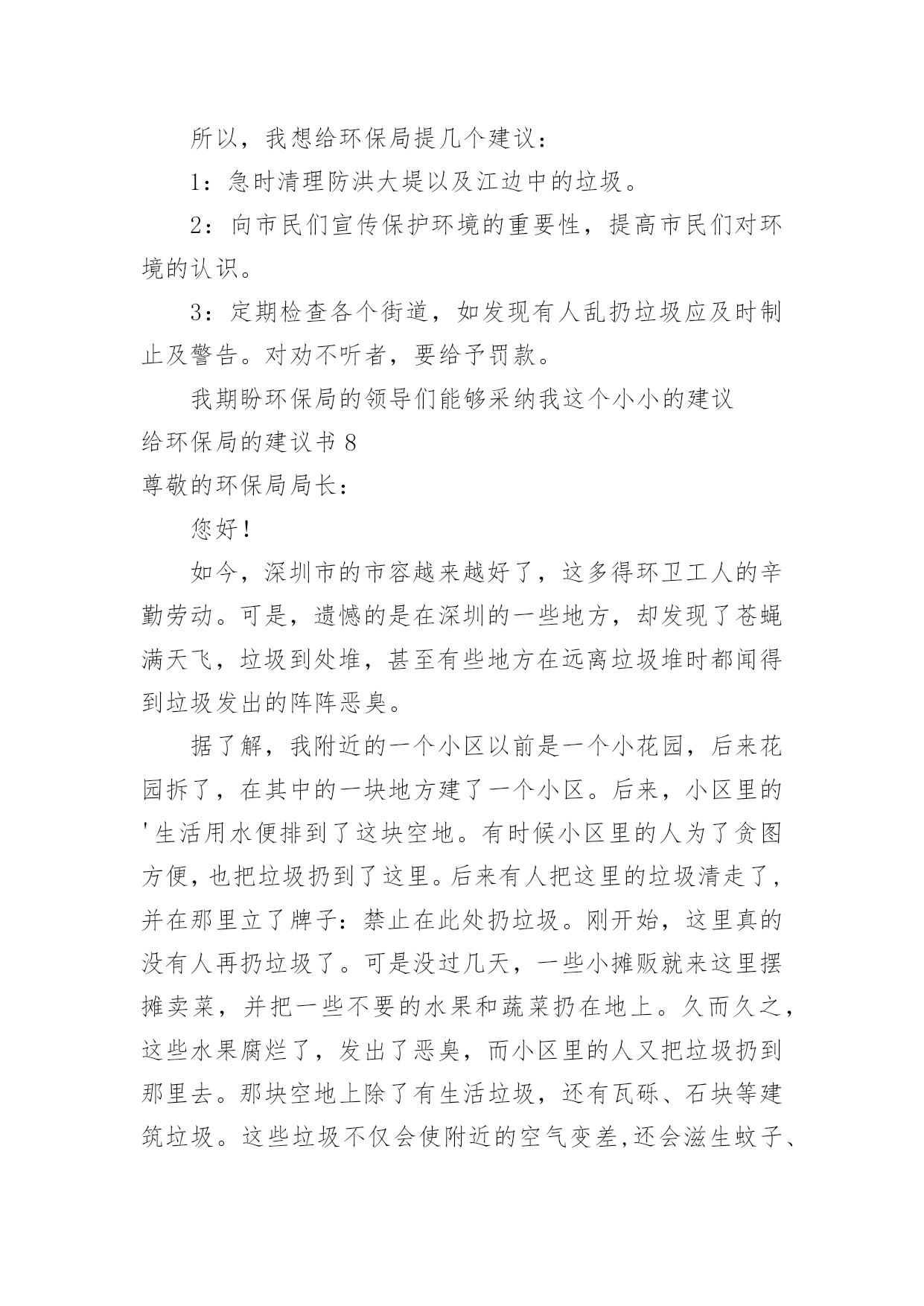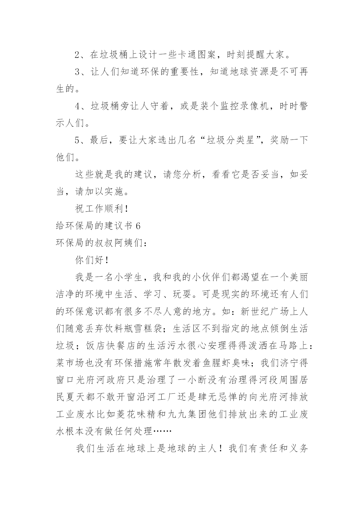 给环保局的建议书给环保局的建议书18篇在社会一步步向前发展的今天,越来越多地方需要用到建议书,使用正确的写作思路书写建议书会更加事半功倍。那么问题来了,到底应如何写一份恰当的建议书呢?以下是小编收集整理的给环保局的建议书,供大家参考借鉴,希望可以帮助到有需要的朋友。给环保局的建议书1亲爱的卫生局的工作人员:你们好!我是来自樟木头镇中心小学六(2)班的廖嘉怡!保护环境是人类有意识地保护自然资源并使其得到合理的利用,防止自然环境受到污染和破坏。我国把环境保护宣布为我国的一项基本国策。所以我们要努力做好保护环境的工作。然而,现在有许多不爱护环境的现象,例如:许多人在街上随地扔垃圾,吐痰;汽车的尾气的排放超标等。为了保护环境,保护我们的家园,我提出如下建议:1、实行垃圾分类化,这样不仅能减少环卫工人的工作量,还能更好地起到废物利用,减少污染。2、节约资源,建议大人买菜时,少用塑料袋,尽量用竹篮子、环保袋。3、外出吃饭尽量不用一次性饭盒,绿色消费,尽量少使用一次性用品,多使用耐用品。4、人类要想征服大自然,就必须尊重自然的规律,爱护大自然的一草一木,一山一石,爱护大自然的一切。5、保护环境要从小事做起,首先选择有利于保护环境的'生活方式。善待我们的家园、善待我们的母亲,共创一个美好的生活环境。环保是现代生活中人类面临的最大问题。要解决这一问题必须从现在做起,为了地球的明天,我们必须要从个人开始努力,好好地保护环境!保护环境,从我做起,从小事做起!请你们采纳我所提的建议,谢谢!给环保局的建议书2xx市环保局:你们好!以前的人行道绿树成荫,成排的立在树旁,犹如坚守在自己家园的战士。但许多人不顾后果的污染环境,乱丢果皮纸屑,树底堆积着腐臭的垃圾,苍蝇成群,人们走在人行道上都得捂着鼻子。没有了以前的阴凉,清新的空气和绿树成荫,也对附近居民们造成了不便。此次,我的建议宗旨是:保护环境,加强广大人民们的'环保意识。针对此次,我建议:一:在人行道里每隔一定的距离安置一个垃圾桶,让大家主动地将垃圾归类,让白色垃圾不再猖狂。二:在每个垃圾桶上贴上有关环保的知识,让大家意识到环保的紧迫性,重要性,呼吁人们保护环境,爱护地球。三:通过校方组织“环保”校队,一起走上街头宣传,最好不使用纸张宣传,因为这也是浪费资源的一种现象,尽量广播宣传。四:认真准备,以“让绿色重回我们身边”为题,各个班级展开讨论,进一步提高学生对此活动的认识,让我们一起做个“绿色环保”小卫士。只要我们每个人都做到这几点,“绿色”世界正在向我们走来。因为地球是我们的母亲,生命的摇篮,她是那么可爱,美丽。让我们珍惜资源,共营生命绿色。祝工作顺利!xxxxx月xx日给环保局的建议书3xx市环保局长:您好!不知您是否知道:在我们类的生命之源——水已在消失,每秒就有不计其数的水资源被破坏,被污染。有些地区喝了不干净的水而生病,生命垂危……农药化肥使用;工业废水;生活污水;医院污水等进入水体,超出了水的自净能力,引起了天然水体上,和化学上的严重变质!折现重重的水变质,水污染,水中毒的到底是一回事呢?原因只有一点:是人类的环保意识薄弱,是人类造成为污染,对水体了危害,也直接影响着人类。这是比较严重的,但也是可以控制的,但为就没有人去珍惜,痛惜过呢?的'xx河:肮脏,发臭,让人厌恶!20多年前的那:清澈,洁净,围绕片土,欢快的流淌……将这两者相比,您更希望今后的场面是怎样的呢?您有权利放弃,不去管理,人类呢?人类的生存离不开水呀!没有干净的水,植物又从何而来?人类继而又从何而生?,我想为您提建议:1、呼吁人类爱护水资源,常办公益活动,让的环保意识增强。2、印刷保护水资源的手册,让知道保护水资源的重要性!3、在河边插温馨提示语,提醒路人不要乱人垃圾。4、让把水循环。不知建议是否妥当,如妥当请采纳。谢谢!祝工作顺利!瑞安市解放路小学:蔡丽君20xx年11月5日给环保局的建议书4尊敬的济南市环保局领导们:你们好!地球是人类的母亲,它给予我们生存的家园。无私的为我们提供他那宝贵的资源,而人类却毫无节制的滥用资源、开采矿物。破坏生态平衡……作为一名济南市的一名小公民,在此,我要提出以下建议,供你们参考:1、制定爱护环境,保护资源的.制度。2、如果有人破坏环境,有关部门进行处分。3、尽量少用一次性物品,购物时自备袋子活篮子,一面减少白色污染。4、关爱及保护野生动物,多植树造林。5、不乱开采矿产资源,不破坏天然矿物。6、提倡选购绿色食品。以上是我提出的几条建议,希望各位领导能够采用。为了创造更美好的明天,我们要好好保护环境,爱护我们的家园,善待地球,共创美好的未来。建议人:年月日给环保局的建议书5广州市环保局长:您好!现在全国上下都在搞“垃圾分类”的活动,我们小学生也积极地参与进来了,草稿纸放“其它垃圾桶”,剩饭倒入