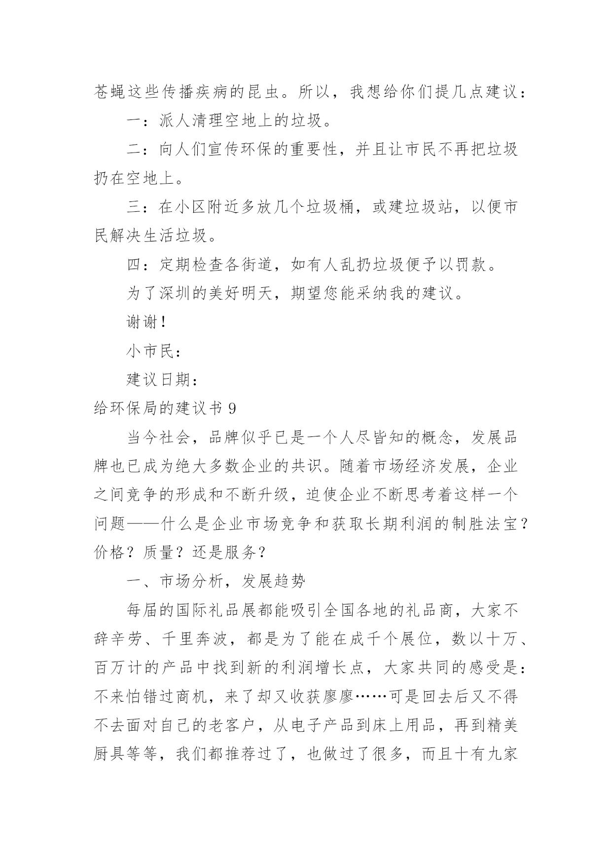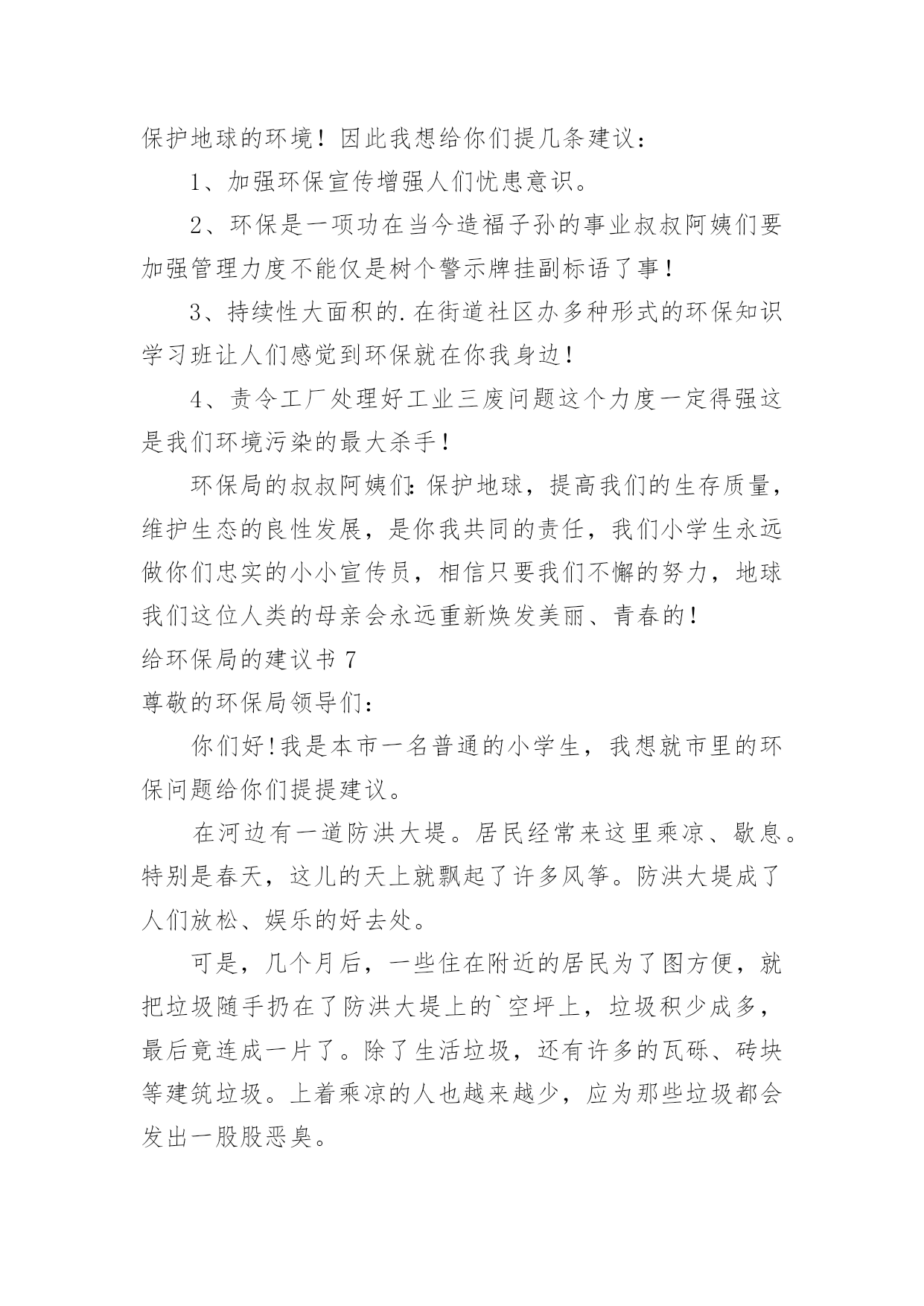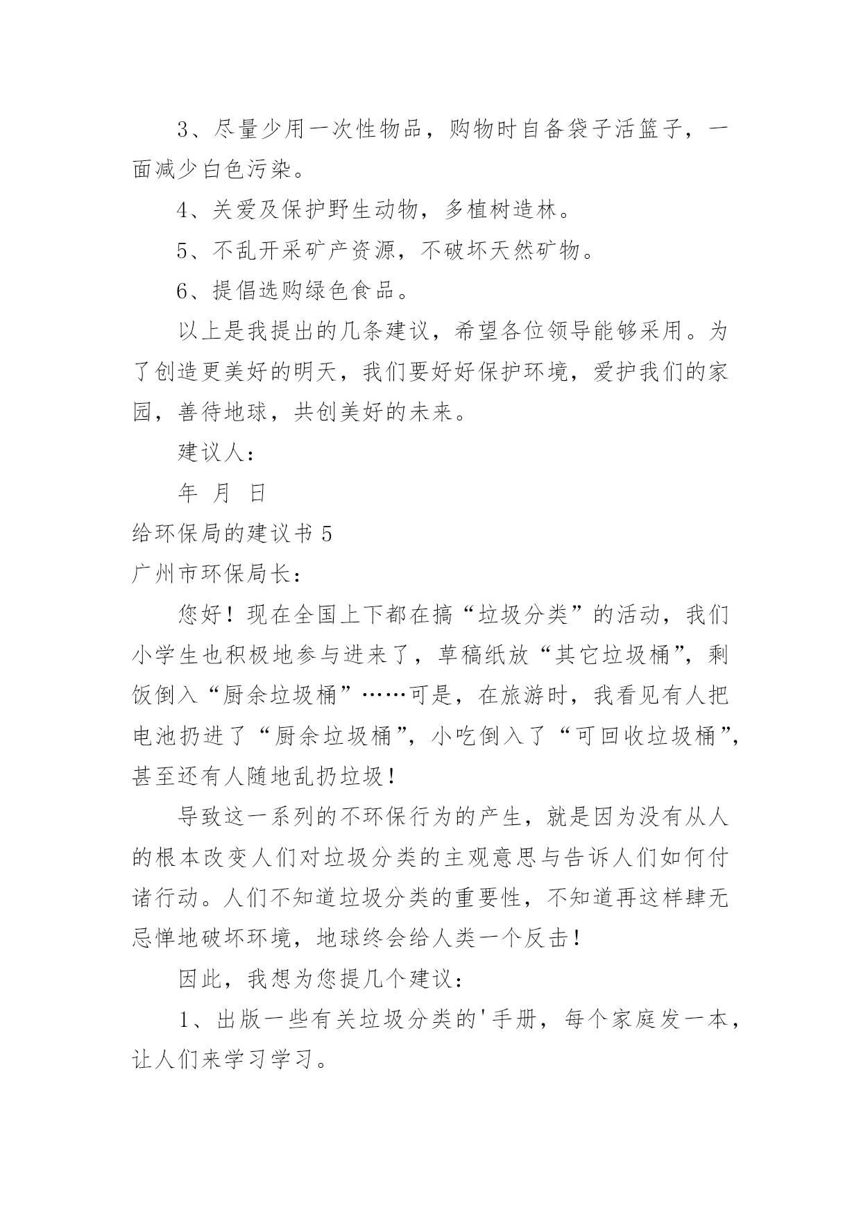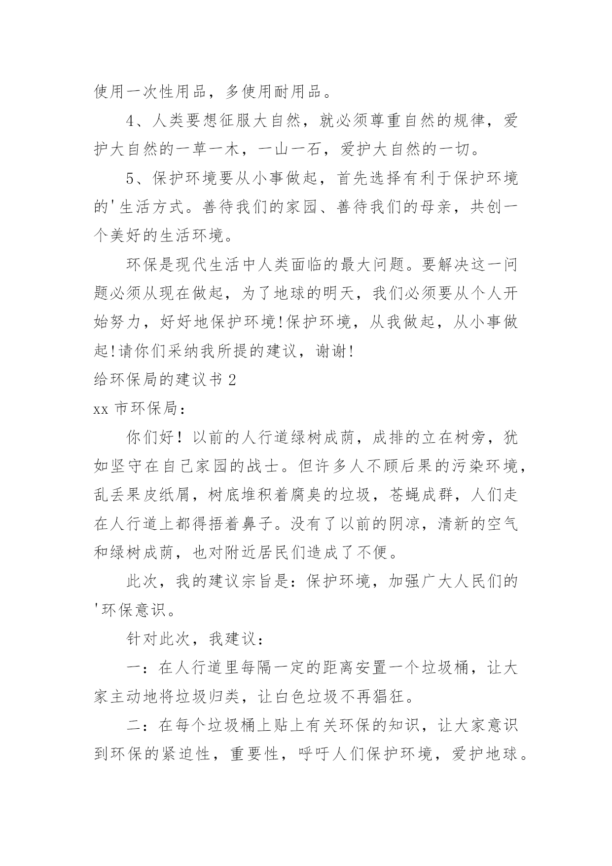 给环保局的建议书给环保局的建议书18篇在社会一步步向前发展的今天,越来越多地方需要用到建议书,使用正确的写作思路书写建议书会更加事半功倍。那么问题来了,到底应如何写一份恰当的建议书呢?以下是小编收集整理的给环保局的建议书,供大家参考借鉴,希望可以帮助到有需要的朋友。给环保局的建议书1亲爱的卫生局的工作人员:你们好!我是来自樟木头镇中心小学六(2)班的廖嘉怡!保护环境是人类有意识地保护自然资源并使其得到合理的利用,防止自然环境受到污染和破坏。我国把环境保护宣布为我国的一项基本国策。所以我们要努力做好保护环境的工作。然而,现在有许多不爱护环境的现象,例如:许多人在街上随地扔垃圾,吐痰;汽车的尾气的排放超标等。为了保护环境,保护我们的家园,我提出如下建议:1、实行垃圾分类化,这样不仅能减少环卫工人的工作量,还能更好地起到废物利用,减少污染。2、节约资源,建议大人买菜时,少用塑料袋,尽量用竹篮子、环保袋。3、外出吃饭尽量不用一次性饭盒,绿色消费,尽量少使用一次性用品,多使用耐用品。4、人类要想征服大自然,就必须尊重自然的规律,爱护大自然的一草一木,一山一石,爱护大自然的一切。5、保护环境要从小事做起,首先选择有利于保护环境的'生活方式。善待我们的家园、善待我们的母亲,共创一个美好的生活环境。环保是现代生活中人类面临的最大问题。要解决这一问题必须从现在做起,为了地球的明天,我们必须要从个人开始努力,好好地保护环境!保护环境,从我做起,从小事做起!请你们采纳我所提的建议,谢谢!给环保局的建议书2xx市环保局:你们好!以前的人行道绿树成荫,成排的立在树旁,犹如坚守在自己家园的战士。但许多人不顾后果的污染环境,乱丢果皮纸屑,树底堆积着腐臭的垃圾,苍蝇成群,人们走在人行道上都得捂着鼻子。没有了以前的阴凉,清新的空气和绿树成荫,也对附近居民们造成了不便。此次,我的建议宗旨是:保护环境,加强广大人民们的'环保意识。针对此次,我建议:一:在人行道里每隔一定的距离安置一个垃圾桶,让大家主动地将垃圾归类,让白色垃圾不再猖狂。二:在每个垃圾桶上贴上有关环保的知识,让大家意识到环保的紧迫性,重要性,呼吁人们保护环境,爱护地球。三:通过校方组织“环保”校队,一起走上街头宣传,最好不使用纸张宣传,因为这也是浪费资源的一种现象,尽量广播宣传。四:认真准备,以“让绿色重回我们身边”为题,各个班级展开讨论,进一步提高学生对此活动的认识,让我们一起做个“绿色环保”小卫士。只要我们每个人都做到这几点,“绿色”世界正在向我们走来。因为地球是我们的母亲,生命的摇篮,她是那么可爱,美丽。让我们珍惜资源,共营生命绿色。祝工作顺利!xxxxx月xx日给环保局的建议书3xx市环保局长:您好!不知您是否知道:在我们类的生命之源——水已在消失,每秒就有不计其数的水资源被破坏,被污染。有些地区喝了不干净的水而生病,生命垂危……农药化肥使用;工业废水;生活污水;医院污水等进入水体,超出了水的自净能力,引起了天然水体上,和化学上的严重变质!折现重重的水变质,水污染,水中毒的到底是一回事呢?原因只有一点:是人类的环保意识薄弱,是人类造成为污染,对水体了危害,也直接影响着人类。这是比较严重的,但也是可以控制的,但为就没有人去珍惜,痛惜过呢?的'xx河:肮脏,发臭,让人厌恶!20多年前的那:清澈,洁净,围绕片土,欢快的流淌……将这两者相比,您更希望今后的场面是怎样的呢?您有权利放弃,不去管理,人类呢?人类的生存离不开水呀!没有干净的水,植物又从何而来?人类继而又从何而生?,我想为您提建议:1、呼吁人类爱护水资源,常办公益活动,让的环保意识增强。2、印刷保护水资源的手册,让知道保护水资源的重要性!3、在河边插温馨提示语,提醒路人不要乱人垃圾。4、让把水循环。不知建议是否妥当,如妥当请采纳。谢谢!祝工作顺利!瑞安市解放路小学:蔡丽君20xx年11月5日给环保局的建议书4尊敬的济南市环保局领导们:你们好!地球是人类的母亲,它给予我们生存的家园。无私的为我们提供他那宝贵的资源,而人类却毫无节制的滥用资源、开采矿物。破坏生态平衡……作为一名济南市的一名小公民,在此,我要提出以下建议,供你们参考:1、制定爱护环境,保护资源的.制度。2、如果有人破坏环境,有关部门进行处分。3、尽量少用一次性物品,购物时自备袋子活篮子,一面减少白色污染。4、关爱及保护野生动物,多植树造林。5、不乱开采矿产资源,不破坏天然矿物。6、提倡选购绿色食品。以上是我提出的几条建议,希望各位领导能够采用。为了创造更美好的明天,我们要好好保护环境,爱护我们的家园,善待地球,共创美好的未来。建议人:年月日给环保局的建议书5广州市环保局长:您好!现在全国上下都在搞“垃圾分类”的活动,我们小学生也积极地参与进来了,草稿纸放“其它垃圾桶”,剩饭倒入