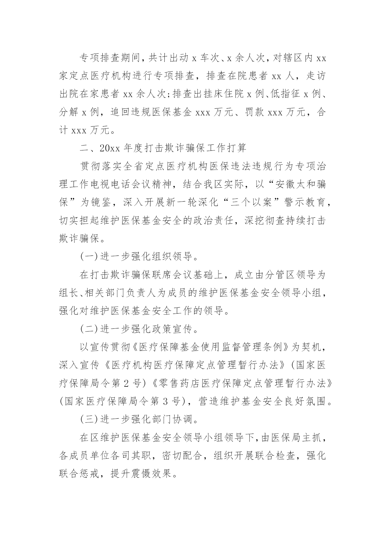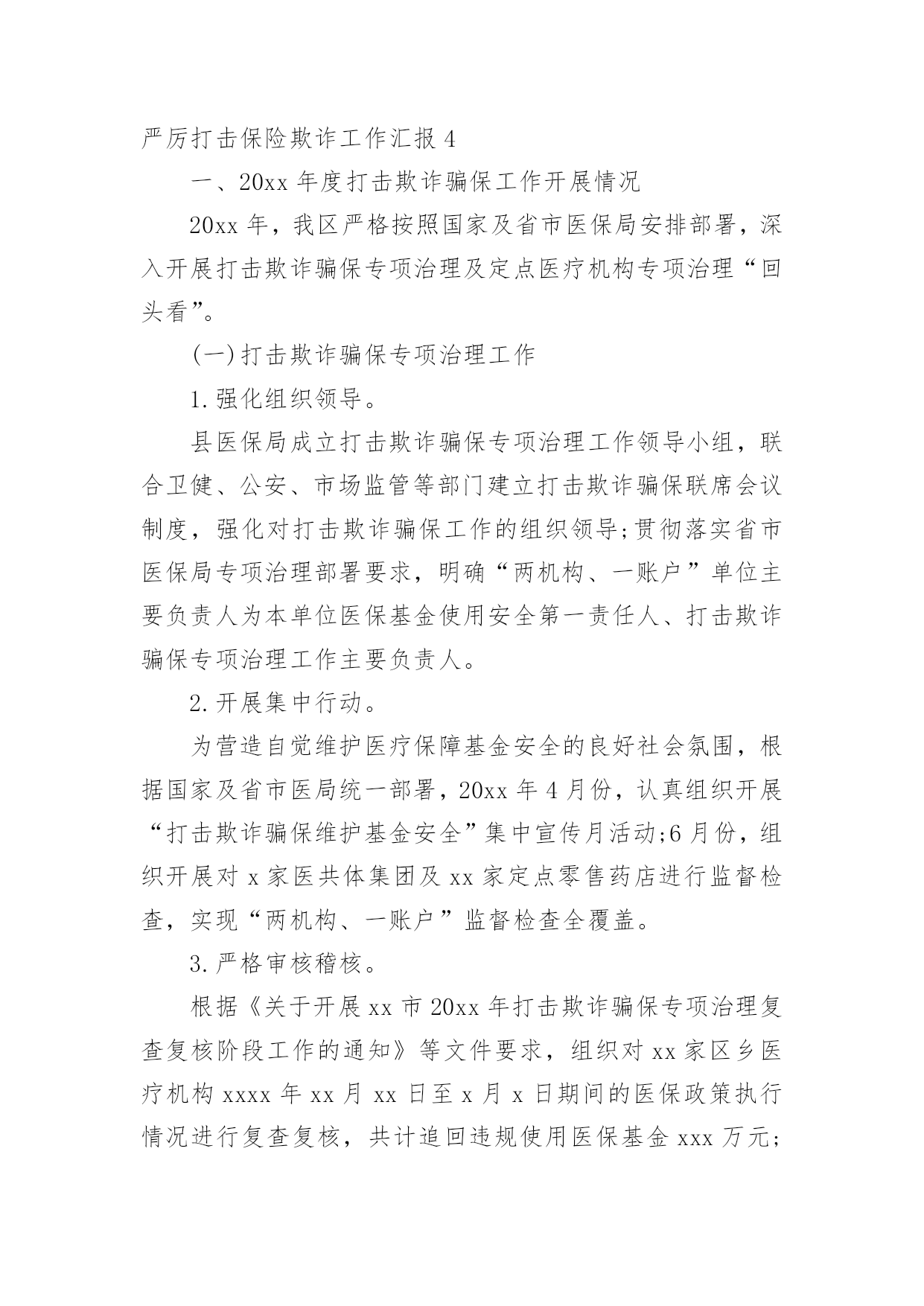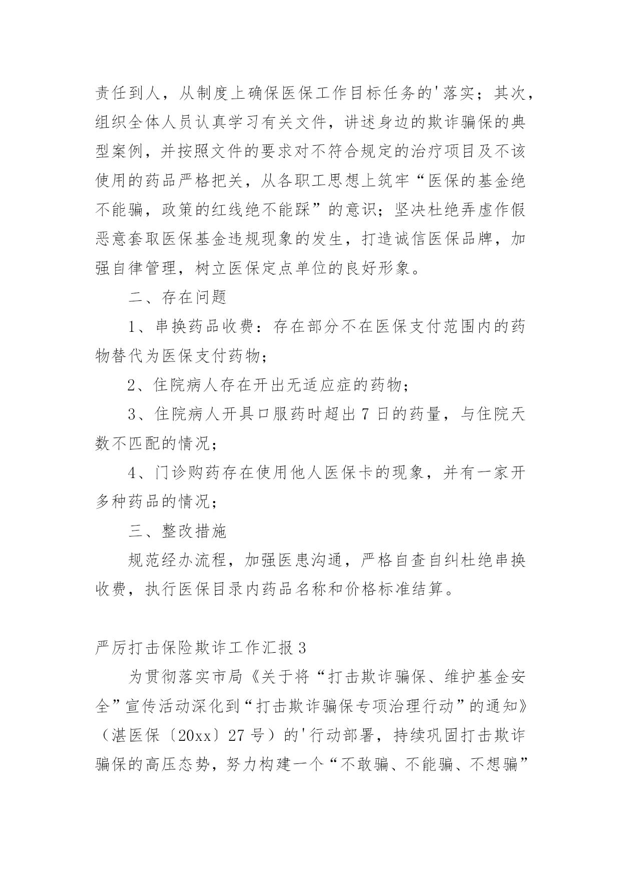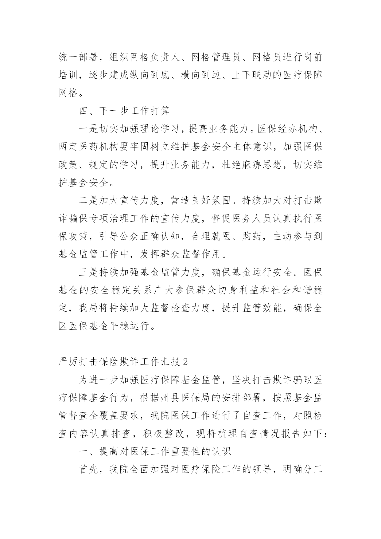 严厉打击保险欺诈工作汇严厉打击保险欺诈工作汇报从小学、初中、高中到大学乃至工作,很多时候都离不开汇报,汇报就是把某个阶段做的工作,进行全面系统的分析、研究后报告给上级领导,但是,每次要写汇报的时候都无从下手?下面是小编整理的严厉打击保险欺诈工作汇报,仅供参考,希望能够帮助到大家。严厉打击保险欺诈工作汇报1一、定点医疗机构医保违法违规行为专项治理推进情况:(一)切实提高站位。制定印发《20xx年全区定点医疗机构医保违法违规行为专项治理工作方案》成立xx区定点医疗机构医保违法违规行为专项治理工作领导小组,明确工作目标、工作重点、实施步骤、工作要求,狠抓专项整治行动落实,全力保障基金安全。(二)抓好《条例》集中宣传月。全面开展《条例》集中宣传月活动,举办全区《条例》学习培训、“两定管理办法”培训会,全方位、多层次贴近基层宣传《条例》,发放宣传材料11650份,营造出全社会关注并自觉维护医保基金安全的良好氛围。(三)强化稽核监管。按照20xx年检查要求,召开两定机构现场检查部署会,制定检查计划、统一检查标准、强调检查纪律。统筹局机关及经办机构力量,抽调人员组成5个检查组,对定点医药机构开展现场检查,并将检查结果纳入年终考核。截至目前,已完成141家定点医药机构现场检查全覆盖,暂停医保结算关系11家,追回、拒付、核减违规医保基金225.43万元。二、专项检查工作开展情况(一)“三假”欺诈骗保问题专项整治情况。要求全区家定点医疗机构是否存在“假病人、假病情、假票据”欺诈骗保行为对医保基金使用情况进行全面自查,对发现的问题立行立改。5月底前家定点医疗机构均开展了“假病人、假病情、假票据”自查自纠工作并上报了工作报告,自查均尚无“三假”欺诈骗保问题发生,结合现场检查未发现“三假”情况。(二)将有医疗事故纠纷医疗费用纳入医保报销专题整治情况。按照要求,积极对接区司法局、卫健委、法院三个部门提供20xx年2月医保局成立以来全区涉及医疗纠纷调解或医疗机构关于医疗纠纷损害责任纠纷人员的基本信息,经比对,xx区无将有医疗事故纠纷医疗费用纳入医保报销情况。(三)开展违规问题处理清零。摸排自查xx区医保局自成立以来截止20xx年12月31日查处的31件违规问题涉及金额252.98万元均已处理到位,实现违规问题处理见底清零。(四)开展欺诈骗取城乡居民门诊统筹基金专项整治工作。依托市医保局提供门诊疑似数据,联合区卫健委、区市场监管局、市市场监管局黄山高新技术产业开发区分局,通过调阅诊疗记录、核对药品进销存、电话回访、走访参保群众、问询当事人等方式对筛查疑似数据开展现场核查。通过检查发现家定点医疗机构门诊结算时存在自立收费项目、药品实际库存与系统库存不一致等问题,下一步将责令限时整改,并跟踪问效。三、建立健全医保基金监管长效机制(一)建立联席会议制度。印发《xx区人民政府办公室关于建立xx区医疗保障联席会议制度的通知》,进一步加强全区医疗保险基金监管,强化部门协调配合,形成基金监管合力,保持打击欺诈骗保高压态势,有效防范和化解基金风险,维护参保人员合法权益。(二)建立“医保专员”驻点巡查机制。联合区卫健委印发《关于建立“医保专员”驻点工作制度的通知》,将医保窗口前移,对口驻点提供医保政策讲解咨询、开展事中指导、医保基金使用监管,搜集定点医药机构的意见建议,开展“医保专员”驻点月巡查。(三)完善医保社会监督机制。实施社会监督员制度,聘请人大代表、政协委员,基层乡镇、村居社区等行业的代表共27人为区医疗保障基金社会监督员,发挥其广泛的.群众代表性、扎实的专业功底,共同构建基金安全防线。(四)推进医保“网格化”管理。印发《xx区医疗保障网格化管理实施方案》,征集各镇街、村社区网格员名单,统一部署,组织网格负责人、网格管理员、网格员进行岗前培训,逐步建成纵向到底、横向到边、上下联动的医疗保障网格。四、下一步工作打算一是切实加强理论学习,提高业务能力。医保经办机构、两定医药机构要牢固树立维护基金安全主体意识,加强医保政策、规定的学习,提升业务能力,杜绝麻痹思想,切实维护基金安全。二是加大宣传力度,营造良好氛围。持续加大对打击欺诈骗保专项治理工作的宣传力度,督促医务人员认真执行医保政策,引导公众正确认知,合理就医、购药,主动参与到基金监管工作中,发挥群众监督作用。三是持续加强基金监管力度,确保基金运行安全。医保基金的安全稳定关系广大参保群众切身利益和社会和谐稳定,我局将持续加大监督检查力度,提升监管效能,确保全区医保基金平稳运行。严厉打击保险欺诈工作汇报2为进一步加强医疗保障基金监管,坚决打击欺诈骗取医疗保障基金行为,根据州县医保局的安排部署,按照基金监管督查全覆盖要求,我院医保工作进行了自查工作,对照检查内容认真排查,积极整改,现将梳理自查情况报告如下:一、提高对医保
