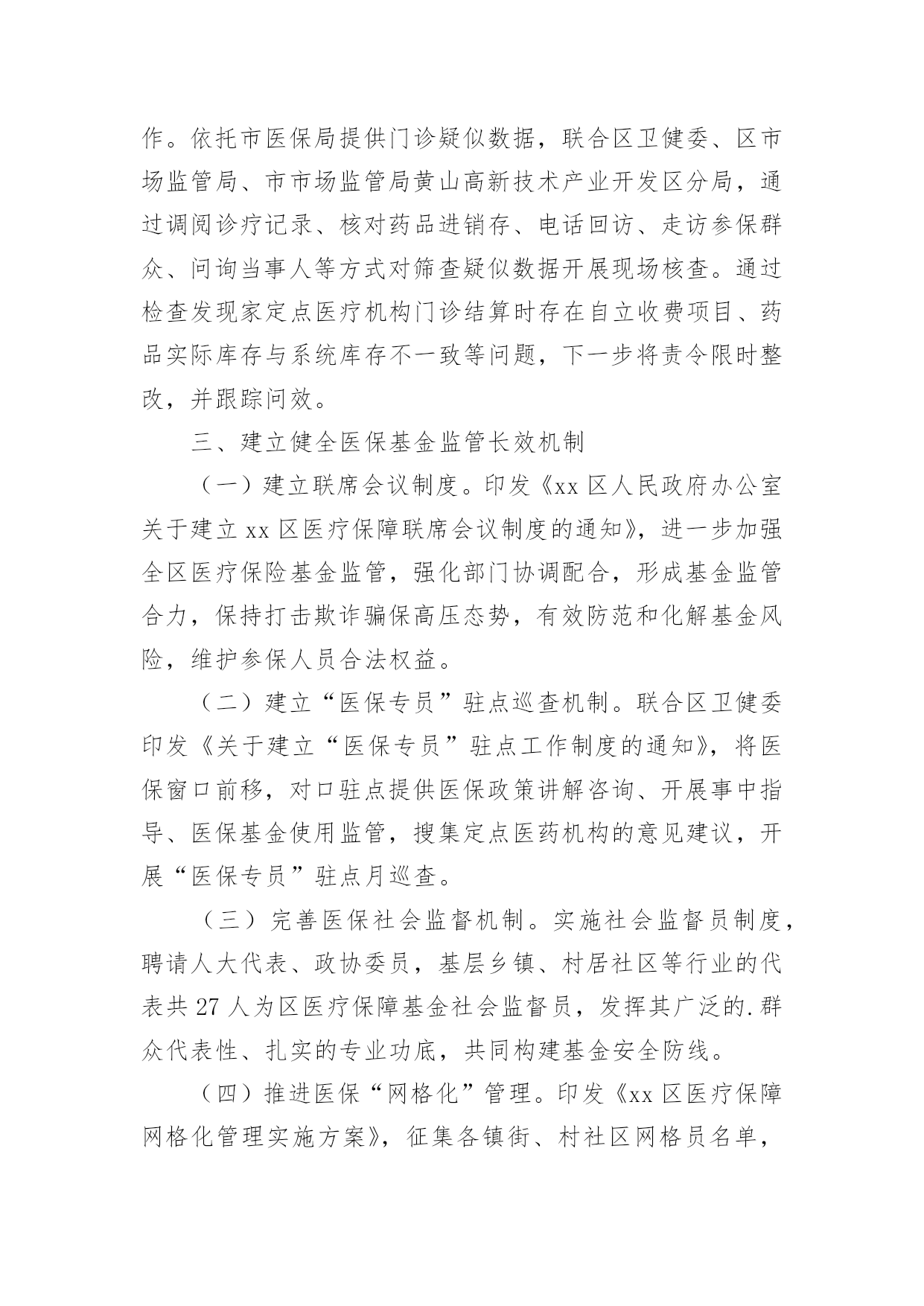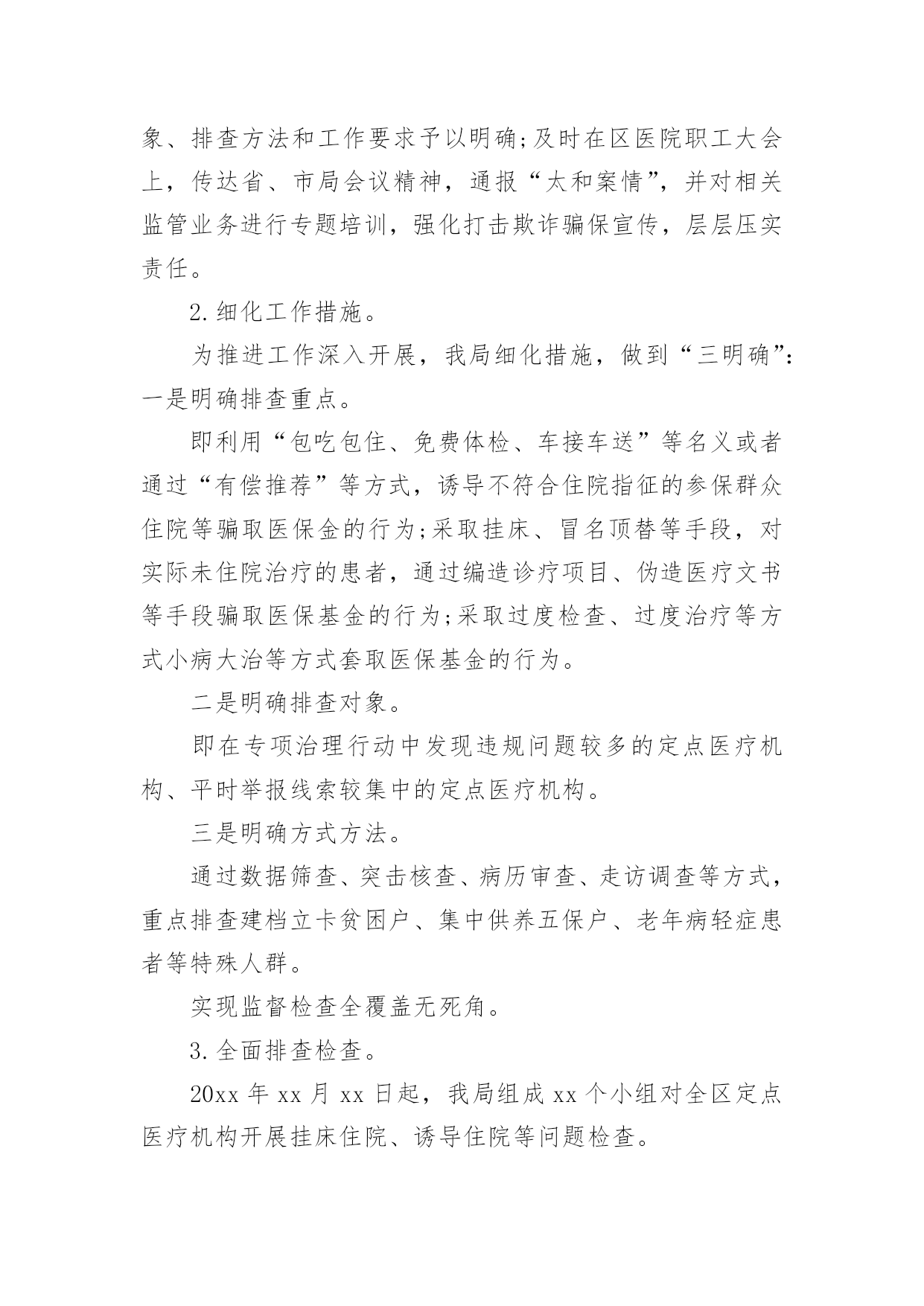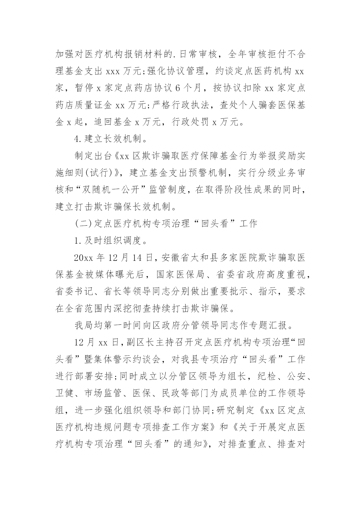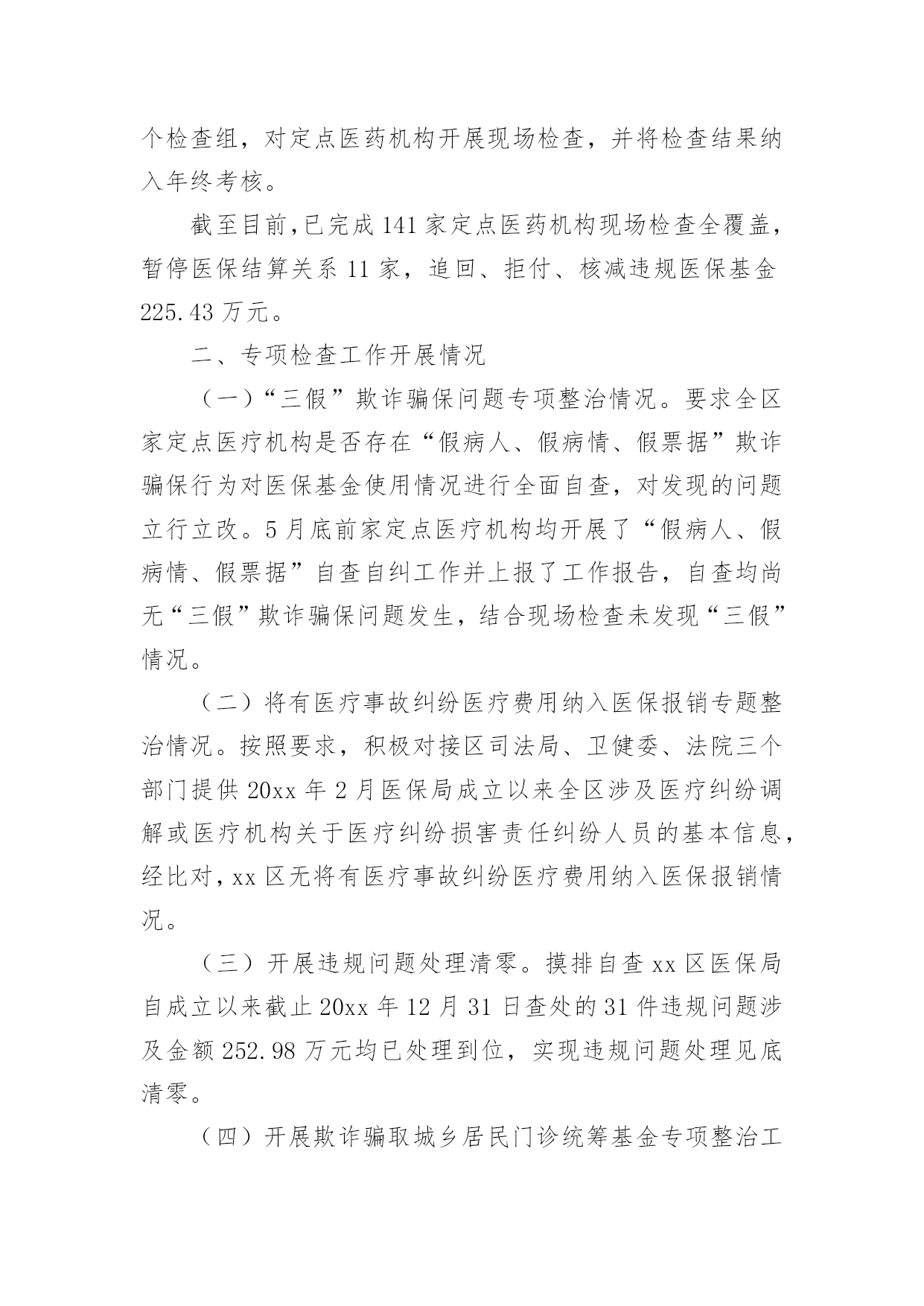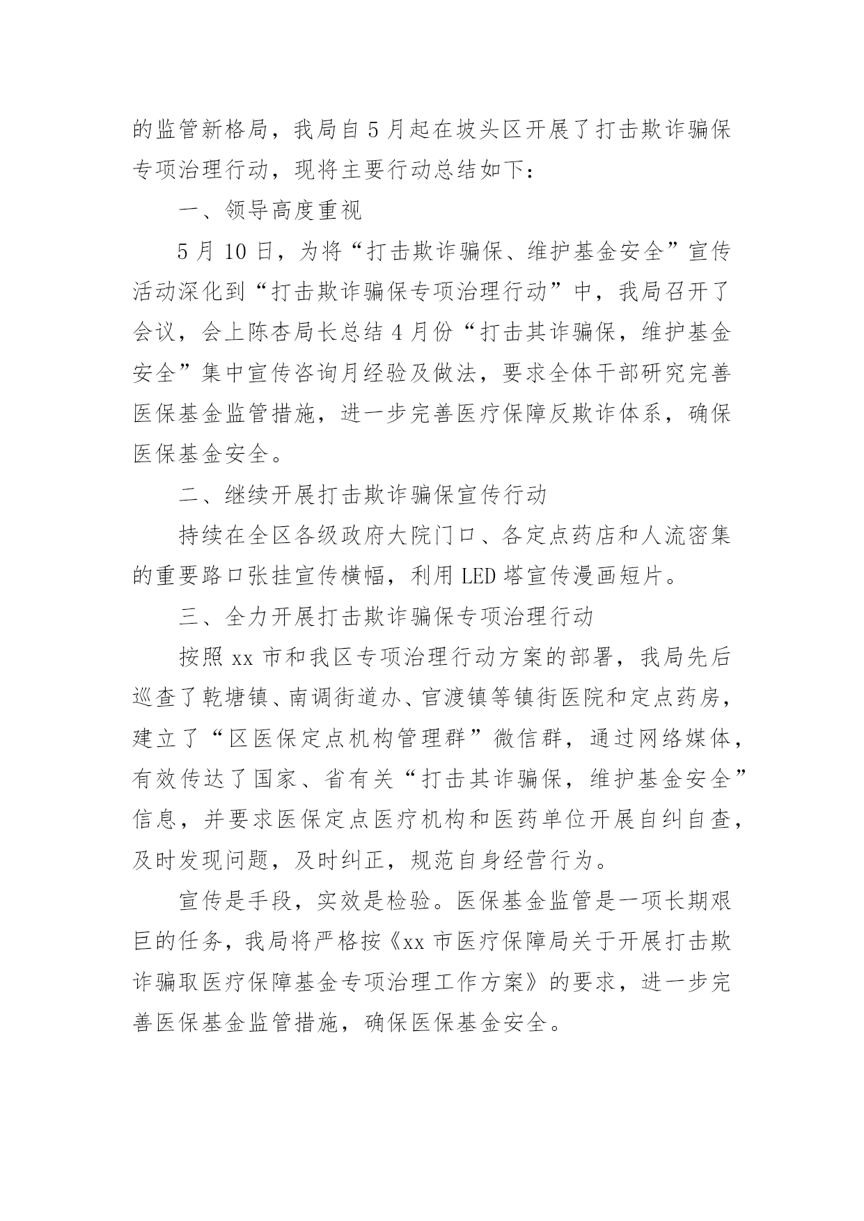 严厉打击保险欺诈工作汇严厉打击保险欺诈工作汇报从小学、初中、高中到大学乃至工作,很多时候都离不开汇报,汇报就是把某个阶段做的工作,进行全面系统的分析、研究后报告给上级领导,但是,每次要写汇报的时候都无从下手?下面是小编整理的严厉打击保险欺诈工作汇报,仅供参考,希望能够帮助到大家。严厉打击保险欺诈工作汇报1一、定点医疗机构医保违法违规行为专项治理推进情况:(一)切实提高站位。制定印发《20xx年全区定点医疗机构医保违法违规行为专项治理工作方案》成立xx区定点医疗机构医保违法违规行为专项治理工作领导小组,明确工作目标、工作重点、实施步骤、工作要求,狠抓专项整治行动落实,全力保障基金安全。(二)抓好《条例》集中宣传月。全面开展《条例》集中宣传月活动,举办全区《条例》学习培训、“两定管理办法”培训会,全方位、多层次贴近基层宣传《条例》,发放宣传材料11650份,营造出全社会关注并自觉维护医保基金安全的良好氛围。(三)强化稽核监管。按照20xx年检查要求,召开两定机构现场检查部署会,制定检查计划、统一检查标准、强调检查纪律。统筹局机关及经办机构力量,抽调人员组成5个检查组,对定点医药机构开展现场检查,并将检查结果纳入年终考核。截至目前,已完成141家定点医药机构现场检查全覆盖,暂停医保结算关系11家,追回、拒付、核减违规医保基金225.43万元。二、专项检查工作开展情况(一)“三假”欺诈骗保问题专项整治情况。要求全区家定点医疗机构是否存在“假病人、假病情、假票据”欺诈骗保行为对医保基金使用情况进行全面自查,对发现的问题立行立改。5月底前家定点医疗机构均开展了“假病人、假病情、假票据”自查自纠工作并上报了工作报告,自查均尚无“三假”欺诈骗保问题发生,结合现场检查未发现“三假”情况。(二)将有医疗事故纠纷医疗费用纳入医保报销专题整治情况。按照要求,积极对接区司法局、卫健委、法院三个部门提供20xx年2月医保局成立以来全区涉及医疗纠纷调解或医疗机构关于医疗纠纷损害责任纠纷人员的基本信息,经比对,xx区无将有医疗事故纠纷医疗费用纳入医保报销情况。(三)开展违规问题处理清零。摸排自查xx区医保局自成立以来截止20xx年12月31日查处的31件违规问题涉及金额252.98万元均已处理到位,实现违规问题处理见底清零。(四)开展欺诈骗取城乡居民门诊统筹基金专项整治工作。依托市医保局提供门诊疑似数据,联合区卫健委、区市场监管局、市市场监管局黄山高新技术产业开发区分局,通过调阅诊疗记录、核对药品进销存、电话回访、走访参保群众、问询当事人等方式对筛查疑似数据开展现场核查。通过检查发现家定点医疗机构门诊结算时存在自立收费项目、药品实际库存与系统库存不一致等问题,下一步将责令限时整改,并跟踪问效。三、建立健全医保基金监管长效机制(一)建立联席会议制度。印发《xx区人民政府办公室关于建立xx区医疗保障联席会议制度的通知》,进一步加强全区医疗保险基金监管,强化部门协调配合,形成基金监管合力,保持打击欺诈骗保高压态势,有效防范和化解基金风险,维护参保人员合法权益。(二)建立“医保专员”驻点巡查机制。联合区卫健委印发《关于建立“医保专员”驻点工作制度的通知》,将医保窗口前移,对口驻点提供医保政策讲解咨询、开展事中指导、医保基金使用监管,搜集定点医药机构的意见建议,开展“医保专员”驻点月巡查。(三)完善医保社会监督机制。实施社会监督员制度,聘请人大代表、政协委员,基层乡镇、村居社区等行业的代表共27人为区医疗保障基金社会监督员,发挥其广泛的.群众代表性、扎实的专业功底,共同构建基金安全防线。(四)推进医保“网格化”管理。印发《xx区医疗保障网格化管理实施方案》,征集各镇街、村社区网格员名单,统一部署,组织网格负责人、网格管理员、网格员进行岗前培训,逐步建成纵向到底、横向到边、上下联动的医疗保障网格。四、下一步工作打算一是切实加强理论学习,提高业务能力。医保经办机构、两定医药机构要牢固树立维护基金安全主体意识,加强医保政策、规定的学习,提升业务能力,杜绝麻痹思想,切实维护基金安全。二是加大宣传力度,营造良好氛围。持续加大对打击欺诈骗保专项治理工作的宣传力度,督促医务人员认真执行医保政策,引导公众正确认知,合理就医、购药,主动参与到基金监管工作中,发挥群众监督作用。三是持续加强基金监管力度,确保基金运行安全。医保基金的安全稳定关系广大参保群众切身利益和社会和谐稳定,我局将持续加大监督检查力度,提升监管效能,确保全区医保基金平稳运行。严厉打击保险欺诈工作汇报2为进一步加强医疗保障基金监管,坚决打击欺诈骗取医疗保障基金行为,根据州县医保局的安排部署,按照基金监管督查全覆盖要求,我院医保工作进行了自查工作,对照检查内容认真排查,积极整改,现将梳理自查情况报告如下:一、提高对医保