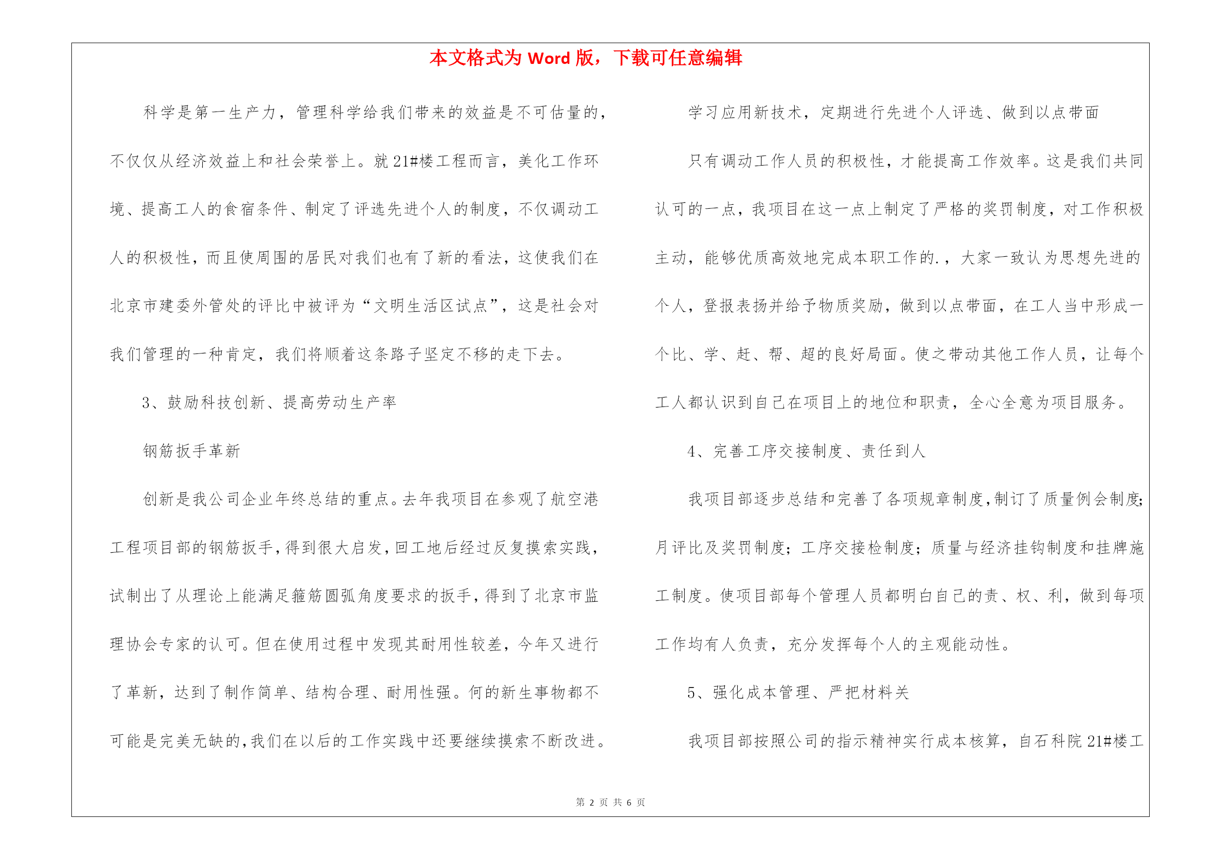 本文格式为Word版,下载可任意编辑第PAGE\*MERGEFORMAT6页共NUMPAGES\*MERGEFORMAT6页最新建筑行业技术员年终工作总结最新建筑行业技术员年终工作总结总结是指社会团体、企业单位和个人对某一阶段的学习、工作或其完成情况加以回顾和分析,得出教训和一些规律性认识的一种书面材料,它可以帮助我们总结以往思想,发扬成绩,为此我们要做好回顾,写好总结。那么如何把总结写出新花样呢?下面是我编写整理的最新建筑行业技术员年终工作总结,希望能够帮助到大家。最新建筑行业技术员年终工作总结1硕果累累的20xx年已悄然过去,充满希望的20xx年已然来临。20xx年,是我公司在建设公司领导下不畏困难,大刀阔斧进行人事改革的一年,也是我公司全面总结以往的经验,不断探索发展新路,努力寻求新的发展的一年,更是我公司在面对金融危机下不断萎缩的市场在寒冬中不懈地打基础、练内功、强管理、谋发展,为尽快实现脱困走上发展之路的关键性一年。下面我就为我公司这一年的工作情况作一个企业年终总结。一年来,我公司紧跟建设公司的发展步伐,按照年初职代会暨生产工作会议的精神,扎扎实实地开展各项工作,使我公司的人事改革、经营管理、质量安全、党的建设以及队伍稳定等各项工作都有了良好的开端。1、各项指标完成情况全年减员42人:其中:解除劳动合同22人;办理退休15人;调出公司:5人;分流输送到其他单位或项目部57人。全年工亡率为0;工伤重伤率亿元产值≤0。4(重伤事故为0);工伤伤亡率≤2(轻伤一起,与20xx年相比下降50%);全年无新增职业病人;机械事故率为0;交通事故为0;特种人员体检覆盖率未达标;环境污染事故为0;各项环保指标全部达标。2、积极推进项目科学化管理科学是第一生产力,管理科学给我们带来的效益是不可估量的,不仅仅从经济效益上和社会荣誉上。就21#楼工程而言,美化工作环境、提高工人的食宿条件、制定了评选先进个人的制度,不仅调动工人的积极性,而且使周围的居民对我们也有了新的看法,这使我们在北京市建委外管处的评比中被评为“文明生活区试点”,这是社会对我们管理的一种肯定,我们将顺着这条路子坚定不移的走下去。3、鼓励科技创新、提高劳动生产率钢筋扳手革新创新是我公司企业年终总结的重点。去年我项目在参观了航空港工程项目部的钢筋扳手,得到很大启发,回工地后经过反复摸索实践,试制出了从理论上能满足箍筋圆弧角度要求的扳手,得到了北京市监理协会专家的认可。但在使用过程中发现其耐用性较差,今年又进行了革新,达到了制作简单、结构合理、耐用性强。何的新生事物都不可能是完美无缺的,我们在以后的工作实践中还要继续摸索不断改进。学习应用新技术,定期进行先进个人评选、做到以点带面只有调动工作人员的积极性,才能提高工作效率。这是我们共同认可的一点,我项目在这一点上制定了严格的奖罚制度,对工作积极主动,能够优质高效地完成本职工作的.,大家一致认为思想先进的个人,登报表扬并给予物质奖励,做到以点带面,在工人当中形成一个比、学、赶、帮、超的良好局面。使之带动其他工作人员,让每个工人都认识到自己在项目上的地位和职责,全心全意为项目服务。4、完善工序交接制度、责任到人我项目部逐步总结和完善了各项规章制度,制订了质量例会制度;月评比及奖罚制度;工序交接检制度;质量与经济挂钩制度和挂牌施工制度。使项目部每个管理人员都明白自己的责、权、利,做到每项工作均有人负责,充分发挥每个人的主观能动性。5、强化成本管理、严把材料关我项目部按照公司的指示精神实行成本核算,自石科院21#楼工程开始,就对人工费实行了“三定”承包,取消了工长记工制度,由记工员直接记工,公司会计直接将工资发到工人手中。建立了完善的项目材料进场制度,从报量、签字、审批、材料进场验收、使用完全按公司制度进行,没有出现因材料不合格出现事故的现象。而且从废料处理上也制定了相关条例。6、安全生产与文明施工我公司企业年终总结会上我想重点强调一下安全方面。安全第一是我公司安全方针中的首要一条。在这一年施工过程中20#楼装饰施工、21#楼基础施工,其工种繁杂、工人数目多,但未出现打架斗殴事件,更没有出现伤亡事故,在公司每月评比中,获得连续夺得总分第一名。文明施工的地位与安全生产是同等的,我们不仅在工作中要与甲方、监理出理好关系,还要与当地居民处好,这样我们才能放手大胆的去干。20#楼工程就是这样一个先例,也就是在这样的一前提下我们争取到了21#楼工程。然而这一切都已经成为历史,在以后的工作中我们仍需努力,逐步完善安全制度、文明施工管理制度。7、总结20#楼的施工经验,保证21#楼稳步提高回顾过去的一年,我们有过失败有过成功,在有些方面我们是有些不足,需要向别的公司学习。对于过去一年所取得的成就,我们不能骄傲,一定要保持艰苦奋斗