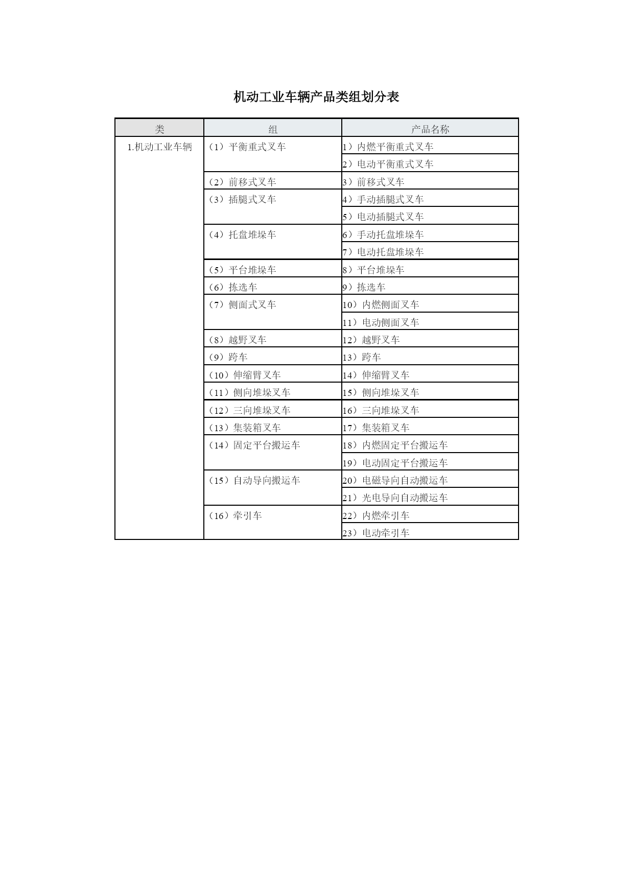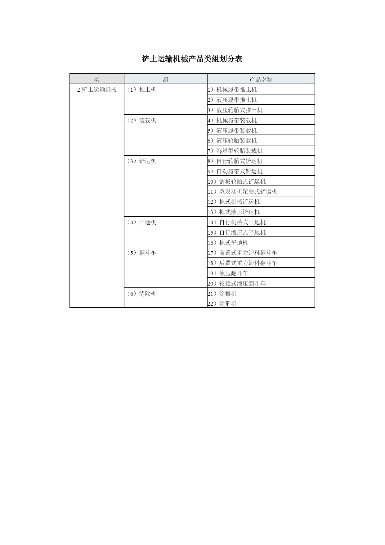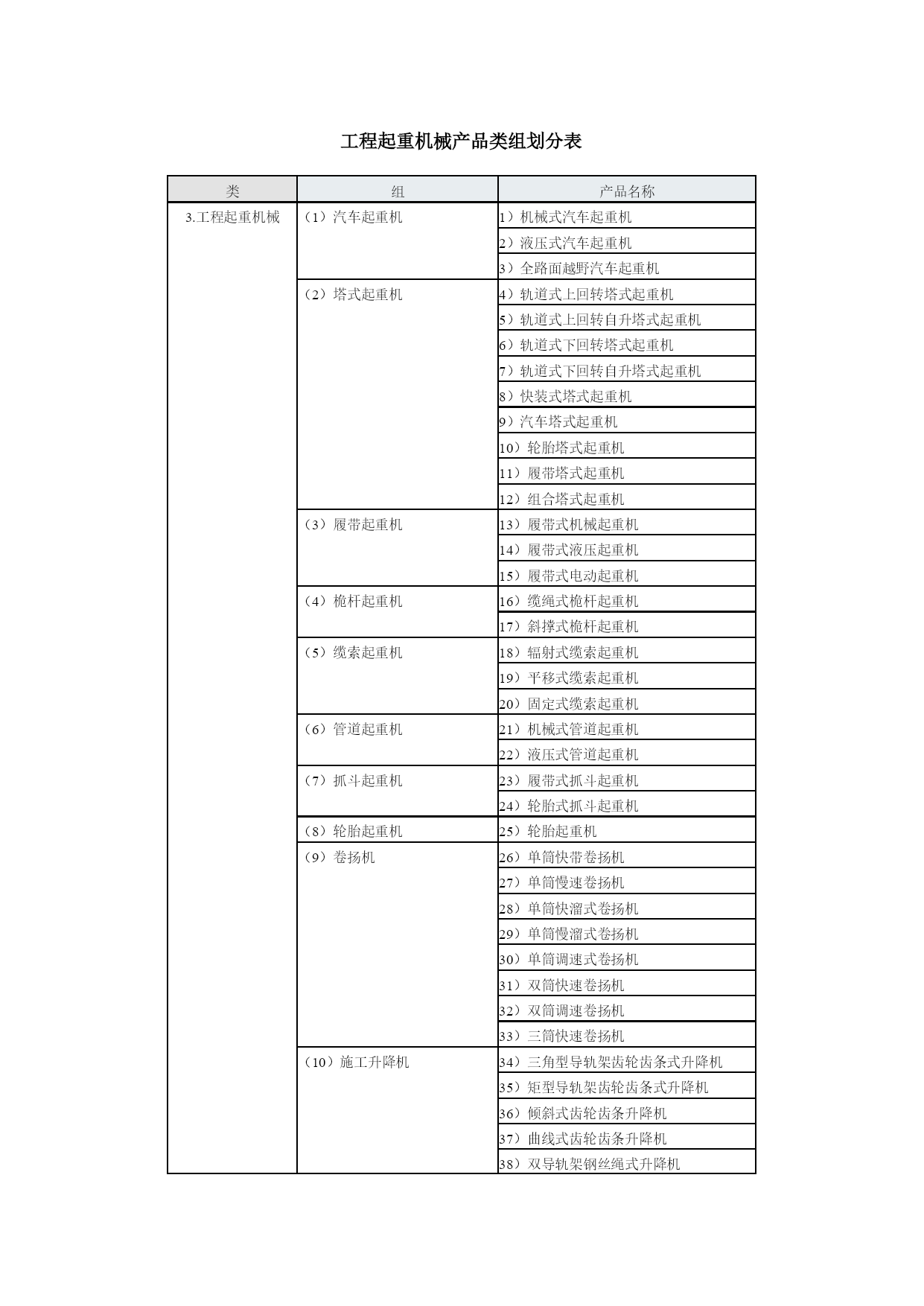 工程机械产品型谱工程机械挖掘机械(9组35种)铲土运输机械(6组2种)工程起重机械(14组48种)机动工业车辆(16组23种)压实机械(4组23种)路面机械(6组38种)桩工机械(9组30种)混凝土机械(12组57种)钢筋和预应力机械(4组25种)装修机械(9组67种)凿岩机械(5组25种)气动工具(3组46种)线路机械(4组19种)市政工程与环卫机械(6组58种)军用工程机械(5组20种)电梯与扶梯(2组12种)工程机械专用零部件(4组19种)其他专用工程机械(4组)挖掘机械产品类组划分表类组产品名称1.挖掘机械(1)单斗挖掘机1)履带式机械单斗挖掘机2)履带式电动单斗挖掘机3)履带式液压单斗挖掘机4)轮胎式机械单斗挖掘机5)轮胎式液压单斗挖掘机6)轮胎式电动单斗挖掘机7)汽车式单斗挖掘机8)步履式机械单斗挖掘机9)步履式液压单斗挖掘机(2)多斗挖掘机10)机械轮斗挖掘机11)液压轮斗挖掘机12)电动轮斗挖掘机13)机械链斗挖掘机14)液压链斗挖掘机15)电动链斗挖掘机(3)多斗挖沟机16)机械轮斗挖沟机17)液压轮斗挖沟机18)电动轮斗挖沟机19)机械链斗挖沟机20)液压链斗挖沟机21)电动链斗挖沟机(4)斗轮挖掘机22)机械斗轮挖掘机23)液压斗轮挖掘机24)电动斗轮挖掘机(5)挖掘装载机25)挖掘装载机(6)滚切挖掘机26)滚切挖掘机(7)铣切挖掘机27)铣切挖掘机(8)掘进机28)盾构掘进机29)顶管掘进机30)隧道掘进机31)涵洞掘进机(9)特殊用途挖掘机32)水陆两用挖掘机33)隧道挖掘机34)湿地挖掘机35)船用挖掘机铲土运输机械产品类组划分表类组产品名称2.铲土运输机械(1)推土机1)机械履带推土机2)液压履带推土机3)液压轮胎式推土机(2)装载机4)机械履带装载机5)液压履带装载机6)液压轮胎装载机7)隧道型轮胎装载机(3)铲运机8)自行轮胎式铲运机9)自动履带式铲运机10)链板轮胎式铲运机11)双发动机轮胎式铲运机12)拖式机械铲运机13)拖式液压铲运机(4)平地机14)自行机械式平地机15)自行液压式平地机16)拖式平地机(5)翻斗车17)前置式重力卸料翻斗车18)后置式重力卸料翻斗车19)液压翻斗车20)铰接式液压翻斗车(6)清除机21)除根机22)除荆机工程起重机械产品类组划分表类组产品名称3.工程起重机械(1)汽车起重机1)机械式汽车起重机2)液压式汽车起重机3)全路面越野汽车起重机(2)塔式起重机4)轨道式上回转塔式起重机5)轨道式上回转自升塔式起重机6)轨道式下回转塔式起重机7)轨道式下回转自升塔式起重机8)快装式塔式起重机9)汽车塔式起重机10)轮胎塔式起重机11)履带塔式起重机12)组合塔式起重机(3)履带起重机13)履带式机械起重机14)履带式液压起重机15)履带式电动起重机(4)桅杆起重机16)缆绳式桅杆起重机17)斜撑式桅杆起重机(5)缆索起重机18)辐射式缆索起重机19)平移式缆索起重机20)固定式缆索起重机(6)管道起重机21)机械式管道起重机22)液压式管道起重机(7)抓斗起重机23)履带式抓斗起重机24)轮胎式抓斗起重机(8)轮胎起重机25)轮胎起重机(9)卷扬机26)单筒快带卷扬机27)单筒慢速卷扬机28)单筒快溜式卷扬机29)单筒慢溜式卷扬机30)单筒调速式卷扬机31)双筒快速卷扬机32)双筒调速卷扬机33)三筒快速卷扬机(10)施工升降机34)三角型导轨架齿轮齿条式升降机35)矩型导轨架齿轮齿条式升降机36)倾斜式齿轮齿条升降机37)曲线式齿轮齿条升降机38)双导轨架钢丝绳式升降机39)单导轨架包容吊笼钢丝绳式升降机40)单导轨架不包容式吊笼钢丝绳式升降机41)混合式升降机(11)液压顶升机42)自控式液压顶升机43)手动式液压顶升机(12)高空作业机械44)高空作业车45)高空作业平台(13)随车起重机46)随车起重机(14)清障抢救车47)机械式清障抢救车48)液压式清障抢救车机动工业车辆产品类组划分表类组产品名称1.机动工业车辆(1)平衡重式叉车1)内燃平衡重式叉车2)电动平衡重式叉车(2)前移式叉车3)前移式叉车(3)插腿式叉车4)手动插腿式叉车5)电动插腿式叉车(4)托盘堆垛车6)手动托盘堆垛车7)电动托盘堆垛车(5)平台堆垛车8)平台堆垛车(6)拣选车9)拣选车(7)侧面式叉车10)内燃侧面叉车11)电动侧面叉车(8)越野叉车12)越野叉车(9)跨车13)跨车(10)伸缩臂叉车14)伸缩臂叉车(11)侧向堆垛叉车15)侧向堆垛叉车(12)三向堆垛叉车16)三向堆垛叉车(13)集装箱叉车17)集装箱叉车(14)固定平台搬运车18)内燃固定平台搬运车19)电动固定平台搬运车(15)自动导向搬运车20)电磁导向自动搬运车21)光电导