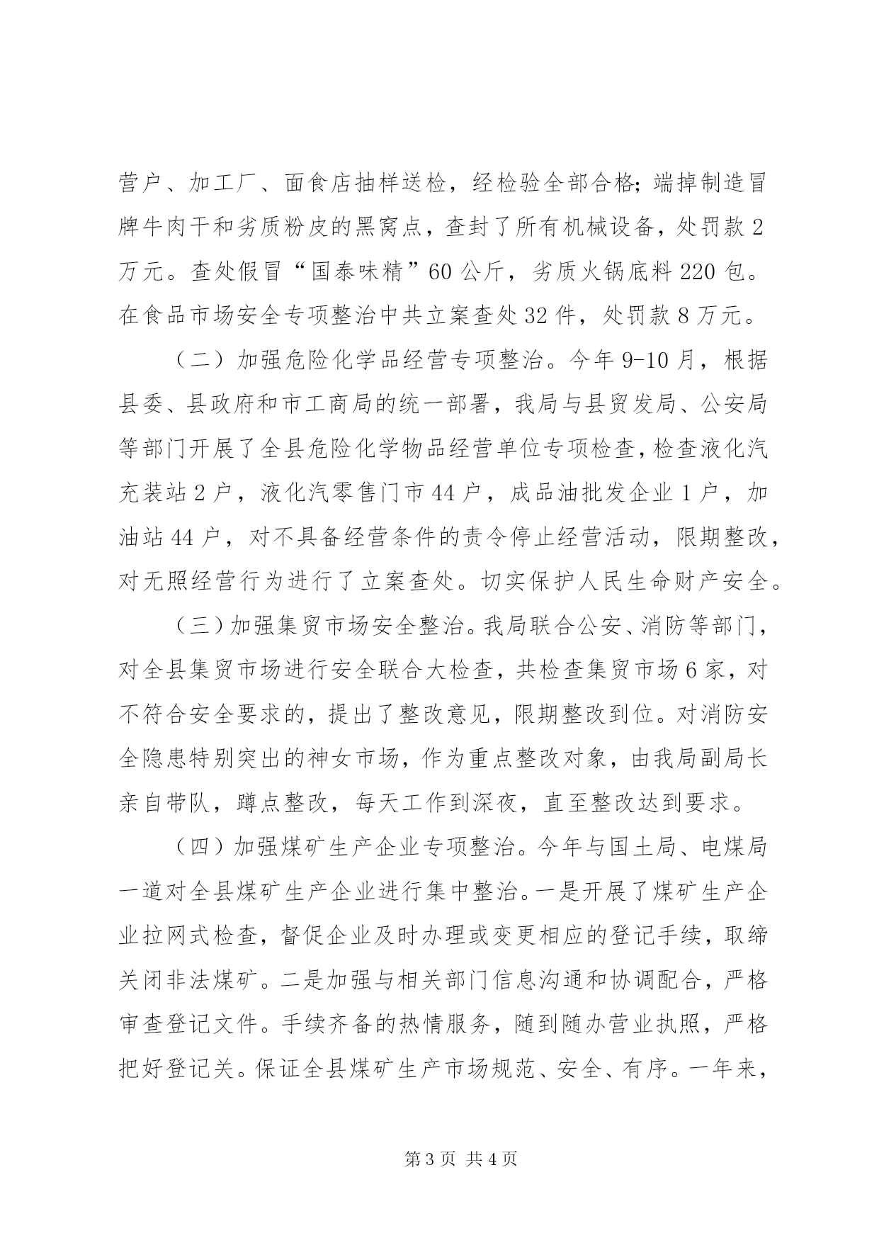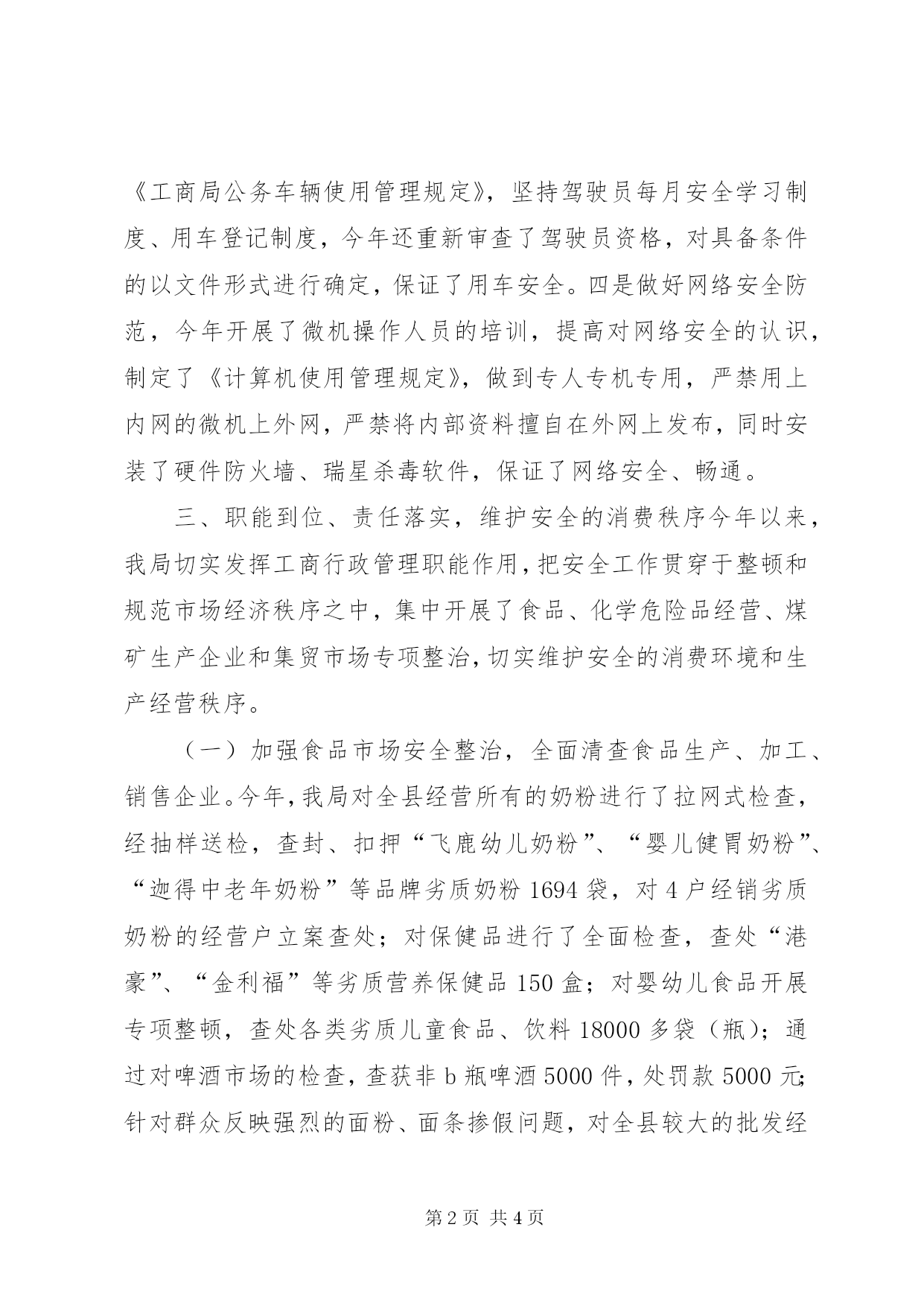第PAGE\*Arabic\*MERGEFORMAT4页共NUMPAGES\*MERGEFORMAT4页县工商局安全工作总结2004年度安全工作总结今年,我局安全工作在县委、县政府和XX市工商局的正确领导下,在县安监局具体指导下,坚持“安全第一、预防为主”的方针,充分发挥工商行政管理职能作用,积极开展各类市场安全整治,加强内部安全管理,切实抓好“三到位、三落实”,取得较好成绩。一、认识到位,机构落实,强化安全工作组织领导今年以来,我局高度重视安全工作,将全年安全工作与业务工作同安排、同部署、同落实。年初成立了安全领导小组,由党组书记、局长任组长,副局长为副组长,各科室、工商所负责人为成员。领导小组下设办公室于局办公室.二、管理到位,措施落实,营造安全的工作生活环境为切实加强全系统安全工作,规范安全工作行为,保证安全的工作生活环境,今年来采取了一系列措施:一是县局与各工商所、科室签订安全责任书,将安全责任落实到科所,明确科所长为本单位安全第一责任人,加强科所长安全工作责任意识,确保安全工作落到实处。二是加强机关内部保卫工作,重新修订细化了保安工作职责,实行24小时保安值班服务和护楼守楼,把重点放在防火、防盗和安全用电上。同时对巫峡工商所办公综合楼和新城工商所宿舍楼63家住户安装了电子防盗门,解决了职工的后顾之忧。三是加强车辆使用安全管理,建立了车辆管理制度,制定《工商局公务车辆使用管理规定》,坚持驾驶员每月安全学习制度、用车登记制度,今年还重新审查了驾驶员资格,对具备条件的以文件形式进行确定,保证了用车安全。四是做好网络安全防范,今年开展了微机操作人员的培训,提高对网络安全的认识,制定了《计算机使用管理规定》,做到专人专机专用,严禁用上内网的微机上外网,严禁将内部资料擅自在外网上发布,同时安装了硬件防火墙、瑞星杀毒软件,保证了网络安全、畅通。三、职能到位、责任落实,维护安全的消费秩序今年以来,我局切实发挥工商行政管理职能作用,把安全工作贯穿于整顿和规范市场经济秩序之中,集中开展了食品、化学危险品经营、煤矿生产企业和集贸市场专项整治,切实维护安全的消费环境和生产经营秩序。(一)加强食品市场安全整治,全面清查食品生产、加工、销售企业。今年,我局对全县经营所有的奶粉进行了拉网式检查,经抽样送检,查封、扣押“飞鹿幼儿奶粉”、“婴儿健胃奶粉”、“迦得中老年奶粉”等品牌劣质奶粉1694袋,对4户经销劣质奶粉的经营户立案查处;对保健品进行了全面检查,查处“港豪”、“金利福”等劣质营养保健品150盒;对婴幼儿食品开展专项整顿,查处各类劣质儿童食品、饮料18000多袋(瓶);通过对啤酒市场的检查,查获非b瓶啤酒5000件,处罚款5000元;针对群众反映强烈的面粉、面条掺假问题,对全县较大的批发经营户、加工厂、面食店抽样送检,经检验全部合格;端掉制造冒牌牛肉干和劣质粉皮的黑窝点,查封了所有机械设备,处罚款2万元。查处假冒“国泰味精”60公斤,劣质火锅底料220包。在食品市场安全专项整治中共立案查处32件,处罚款8万元。(二)加强危险化学品经营专项整治。今年9-10月,根据县委、县政府和市工商局的统一部署,我局与县贸发局、公安局等部门开展了全县危险化学物品经营单位专项检查,检查液化汽充装站2户,液化汽零售门市44户,成品油批发企业1户,加油站44户,对不具备经营条件的责令停止经营活动,限期整改,对无照经营行为进行了立案查处。切实保护人民生命财产安全。(三)加强集贸市场安全整治。我局联合公安、消防等部门,对全县集贸市场进行安全联合大检查,共检查集贸市场6家,对不符合安全要求的,提出了整改意见,限期整改到位。对消防安全隐患特别突出的神女市场,作为重点整改对象,由我局副局长亲自带队,蹲点整改,每天工作到深夜,直至整改达到要求。(四)加强煤矿生产企业专项整治。今年与国土局、电煤局一道对全县煤矿生产企业进行集中整治。一是开展了煤矿生产企业拉网式检查,督促企业及时办理或变更相应的登记手续,取缔关闭非法煤矿。二是加强与相关部门信息沟通和协调配合,严格审查登记文件。手续齐备的热情服务,随到随办营业执照,严格把好登记关。保证全县煤矿生产市场规范、安全、有序。一年来,我局安全工作坚持“安全无小事,责任重于山”的指导思想,把安全工作贯穿于各项业务的始终,保障各项工作顺利推进,发挥了积极作用,取得了一定成绩。新的一年我局将更加重视安全工作,加强制度规范,落实安全责任,把工作做得更好。二OO四年十二月十五日