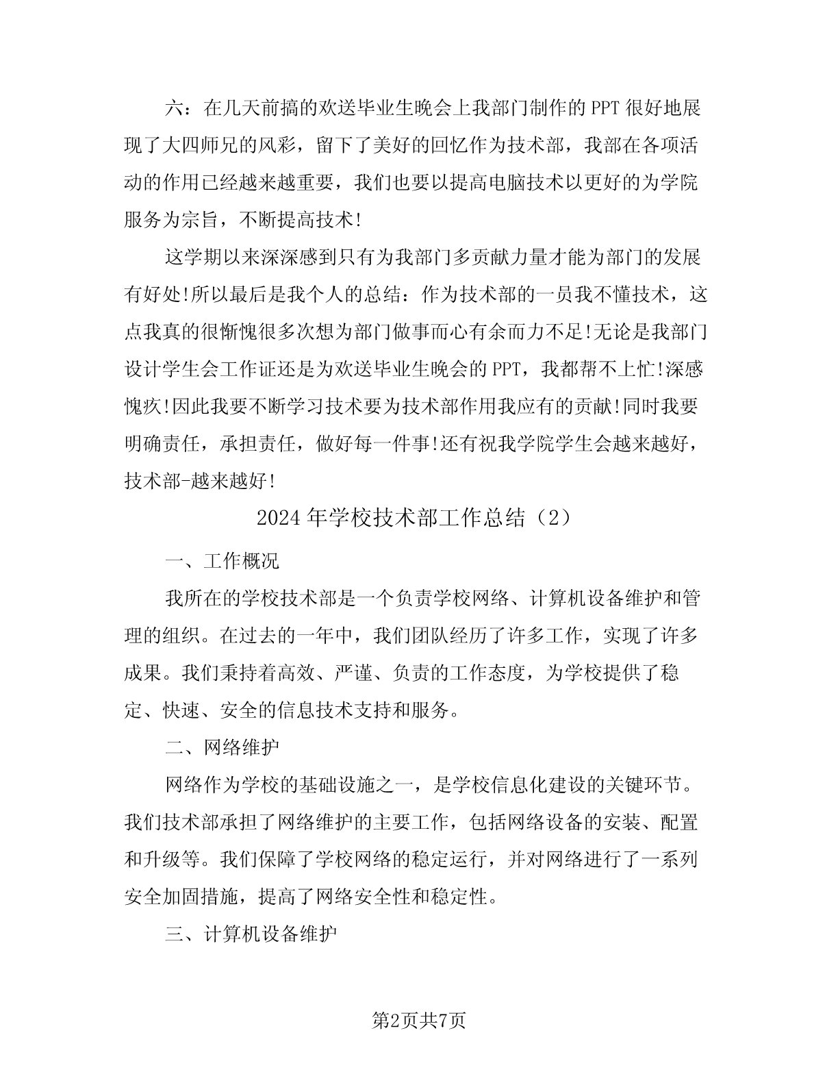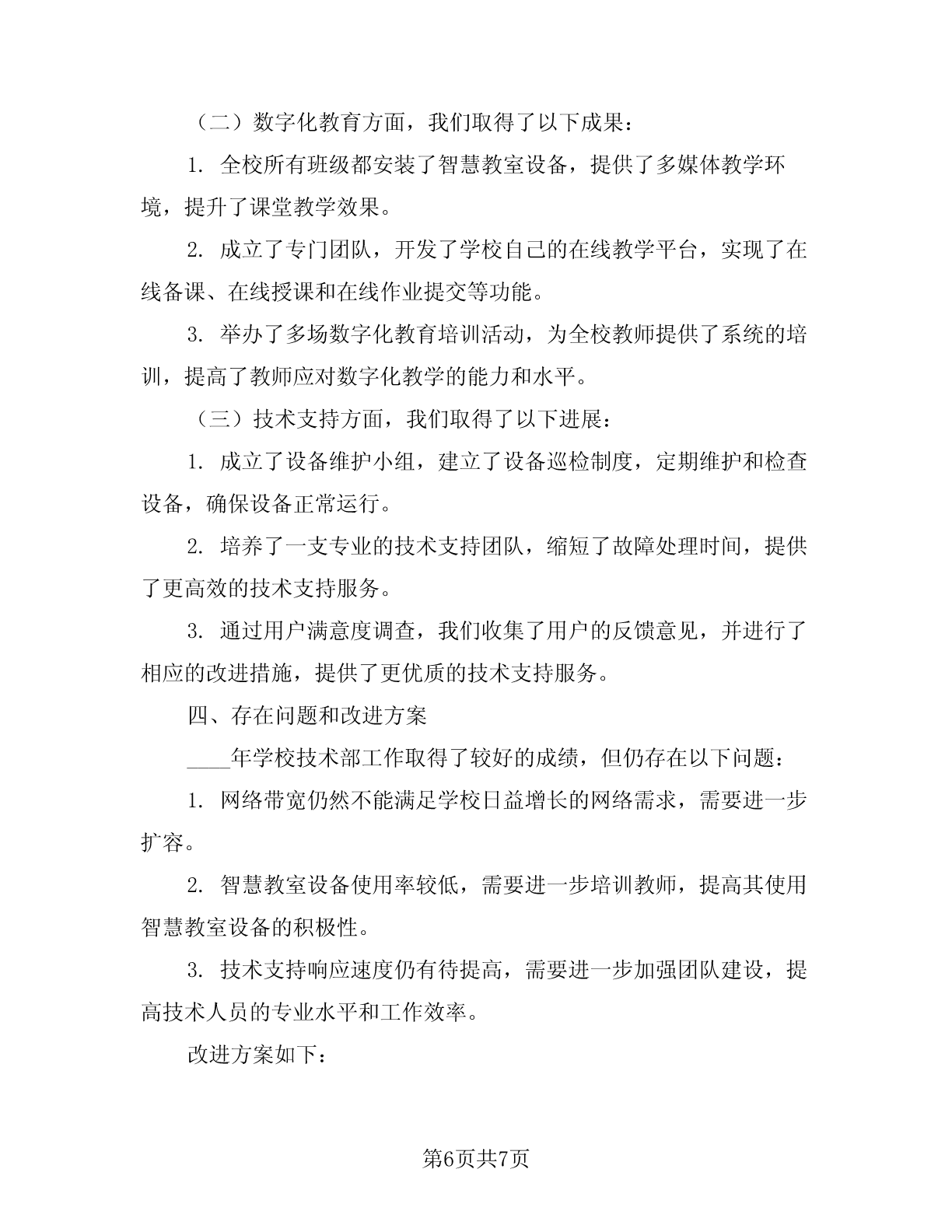 2024年学校技术部工作总结又一个学期快过去,就如“黄河之水天上来,奔腾到海不复回”那样来得壮观去得也豪迈!每一段时间都有它特别的东西透过点点滴滴的小事而留存下来!许许多多的时间片段是构成时间长河的水滴!在技术部的每一天我都会像珍惜每一滴水那样让这条长河越变越宽阔!下面是我在这学期在技术部的工作总结:一:这学期技术部的最重要的事情我认为是技术部换届选举!英子师姐当选部长之后对这件尤为重视!换届结果是部门留下四个副部,六人参选,三人弃权!当天我们还向三位退任部长副部师兄赠送礼物以表达我们的感谢!换届后虽然有些同事要离开技术部,但是我们还是一个整体,曾经一起为技术部的荣誉而努力奋斗过!留在技术部的也会为技术部的发展和壮大而且继续奋斗!二:深感男丁少对部门开展工作的困难,这学期我部门为我学院男女排训练送水频率较多,这粗重活应该是男丁的事,如果由女丁来干这活那感觉怪怪的!所以我建议我部门在这方面有所改进!三:部门各同事都能做好本职工作,在各项活动中他们的优秀表现都让我在他们身上学到了许多东西!四:与我学院其他部门的沟通互联方面有所不足,但是我部门能很好的与其他部门一起为学院活动而一起工作,把活动搞好!但平时一起工作的时间很有限,因此我部门应与其他部门加强沟通与了解!五:我部门主管学院音响设备,在那次四院联欢晚会上彩排的事宜上发挥了我部门应有的作用!我部门在熟练掌握音响技术的基础上应不断进取,争取更好的表现!六:在几天前搞的欢送毕业生晚会上我部门制作的PPT很好地展现了大四师兄的风彩,留下了美好的回忆作为技术部,我部在各项活动的作用已经越来越重要,我们也要以提高电脑技术以更好的为学院服务为宗旨,不断提高技术!这学期以来深深感到只有为我部门多贡献力量才能为部门的发展有好处!所以最后是我个人的总结:作为技术部的一员我不懂技术,这点我真的很惭愧很多次想为部门做事而心有余而力不足!无论是我部门设计学生会工作证还是为欢送毕业生晚会的PPT,我都帮不上忙!深感愧疚!因此我要不断学习技术要为技术部作用我应有的贡献!同时我要明确责任,承担责任,做好每一件事!还有祝我学院学生会越来越好,技术部-越来越好!2024年学校技术部工作总结(2)一、工作概况我所在的学校技术部是一个负责学校网络、计算机设备维护和管理的组织。在过去的一年中,我们团队经历了许多工作,实现了许多成果。我们秉持着高效、严谨、负责的工作态度,为学校提供了稳定、快速、安全的信息技术支持和服务。二、网络维护网络作为学校的基础设施之一,是学校信息化建设的关键环节。我们技术部承担了网络维护的主要工作,包括网络设备的安装、配置和升级等。我们保障了学校网络的稳定运行,并对网络进行了一系列安全加固措施,提高了网络安全性和稳定性。三、计算机设备维护学校内的计算机设备是学生和教职工进行教学和学习活动的重要工具。我们技术部定期对计算机设备进行巡检和修复,及时解决设备故障和问题,保障了教学和学习的顺利进行。我们还负责计算机软件的安装和升级,为师生提供了良好的软硬件环境。四、新技术研究与应用技术部是学校信息化建设的主力军,我们不仅要掌握和运用现有的技术,还要对新兴技术进行研究和应用。我们积极推动云计算、人工智能、物联网等技术在学校的应用,为学校提供绿色、智能、高效的信息化解决方案。五、培训和支持作为学校信息化建设的核心力量,我们不仅要掌握技术,还要将技术传授给其他人。我们定期组织技术培训和讲座,帮助教职工和学生提高信息技术应用能力。同时,我们还建立了技术支持热线和在线问答平台,及时解答师生的技术问题,为他们提供便利和支持。六、团队管理和合作作为一支优秀的团队,良好的团队管理和合作是我们工作的重要保障。我们注重团队的凝聚力和协作能力,经常组织团队建设和活动,促进成员之间的沟通和交流。在工作中,我们注重任务分工和合理安排,互相配合和协作,提高了工作效率和质量。七、存在的问题和不足虽然我们取得了一些成绩,但我们也必须正视存在的问题和不足。首先,由于技术发展的不断变化和学校信息化建设的需要,我们需要不断学习和更新知识,提升自己的技术水平。其次,我们需要进一步完善工作流程和管理机制,提高工作效率和规范性。另外,我们还需要加强与其他部门的合作和协调,共同推进学校信息化建设。八、工作展望在未来的工作中,我们将继续加强学习和研究,紧跟技术发展的脚步,提供更加先进和有效的技术支持和服务。我们将进一步完善工作流程和管理机制,提高工作效率和质量。同时,我们将加强与其他部门的合作和协调,共同推进学校信息化建设的进程。总结起来,学校技术部的工作是一项艰巨而又充满