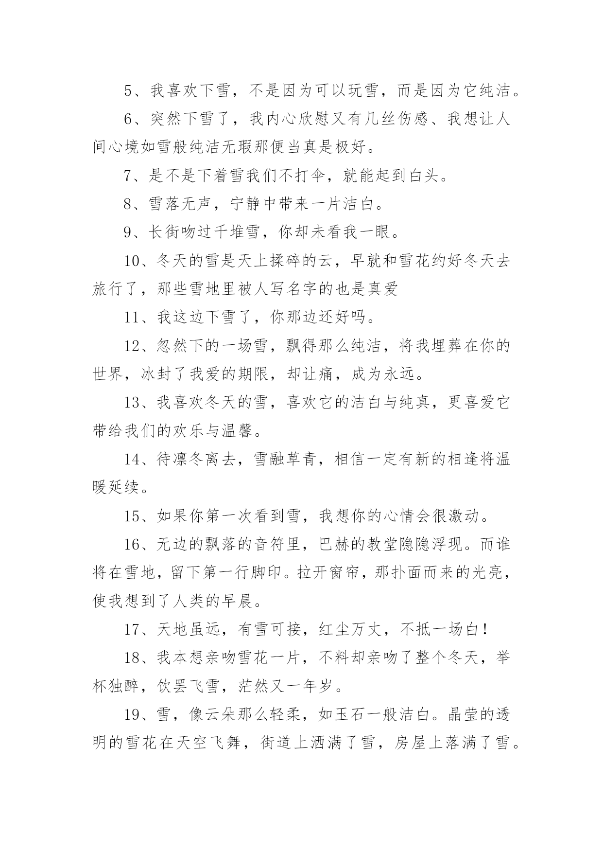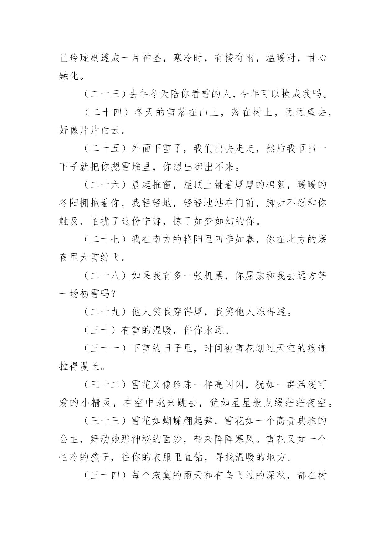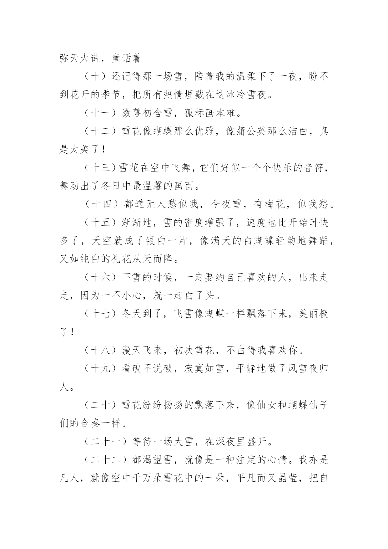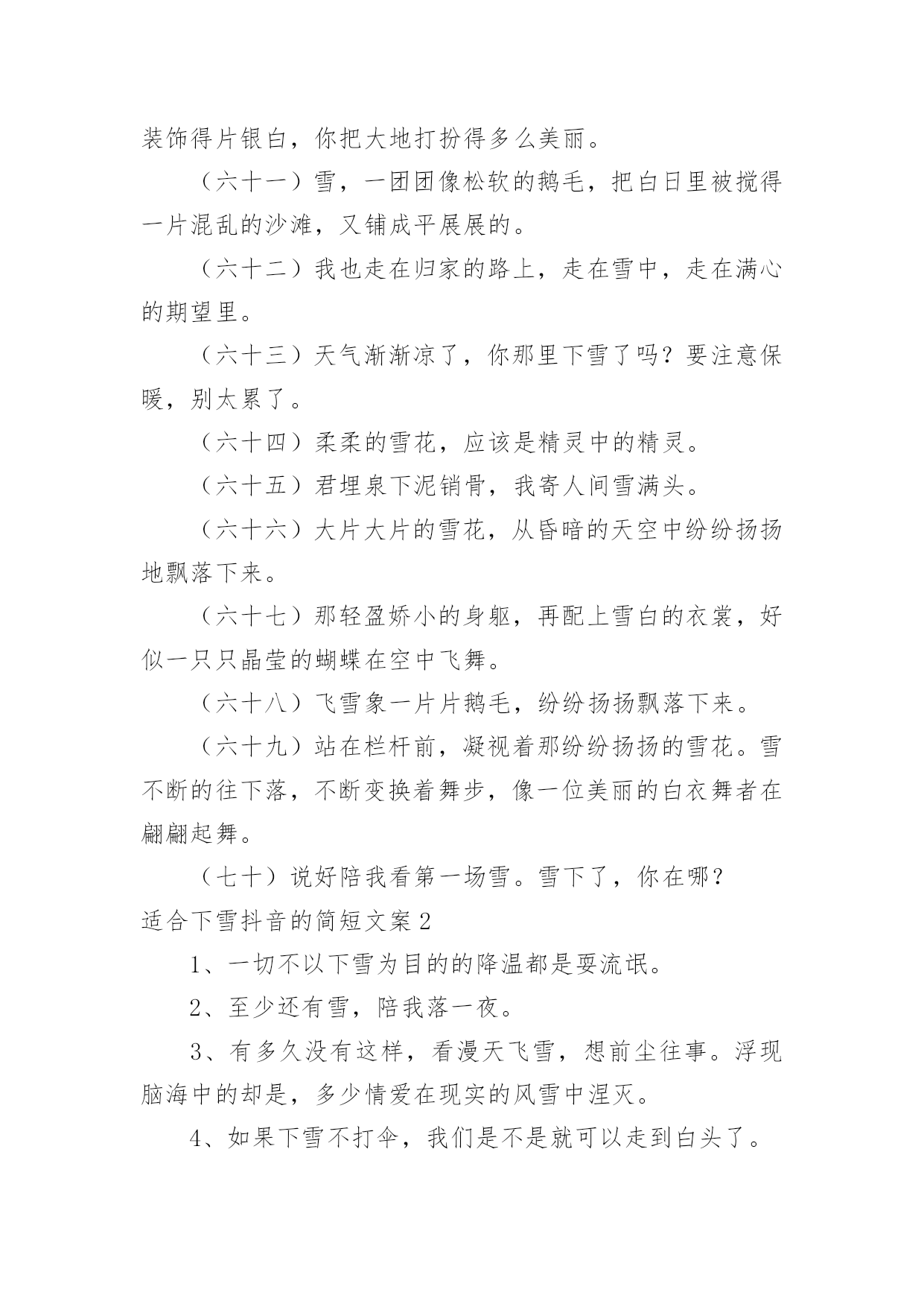 适合下雪抖音的简短文案适合下雪抖音的简短文案随着社交网络开始流行,越来越多人钟情于在社交平台上发布文案,文案具有在理智上启发人们,在情感上打动人们的作用。那些被广泛运用的文案都是什么样子的呢?下面是小编帮大家整理的适合下雪抖音的简短文案,欢迎大家借鉴与参考,希望对大家有所帮助。适合下雪抖音的简短文案1(一)一片片雪花像是一只只美丽的白色蝴蝶满天飞舞。(二)雪终于停了,茫茫的田野一片雪白,房舍、群山披上了银装。(三)听说初雪的这一天,说谎的人可以被原谅,告白的人能白头偕老。(四)让一句祝福,为你送上冬日的暖阳。(五)风再大,也吹不散思念之心,雾再浓,也迷不了牵挂之意,天再冷,也冻不住友谊之情,雪再厚,也盖不住问候之意,愿你多保重,忙里偷闲努力照顾好自己。(六)冬天的雪像一位技艺高超的女工,给大地织出了一条厚厚的白毯子。(七)凛冬已至,星河长明。(八)孤飞一片雪,百里见秋毫。(九)在大雪中,才分不清什么是黑,什么是白,犹如弥天大谎,童话着(十)还记得那一场雪,陪着我的温柔下了一夜,盼不到花开的季节,把所有热情埋藏在这冰冷雪夜。(十一)数萼初含雪,孤标画本难。(十二)雪花像蝴蝶那么优雅,像蒲公英那么洁白,真是太美了!(十三)雪花在空中飞舞,它们好似一个个快乐的音符,舞动出了冬日中最温馨的画面。(十四)都道无人愁似我,今夜雪,有梅花,似我愁。(十五)渐渐地,雪的密度增强了,速度也比开始时快多了,天空就成了银白一片,像满天的白蝴蝶轻韵地舞蹈,又如纯白的礼花从天而降。(十六)下雪的时候,一定要约自己喜欢的人,出来走走,因为一不小心,就一起白了头。(十七)冬天到了,飞雪像蝴蝶一样飘落下来,美丽极了!(十八)漫天飞来,初次雪花,不由得我喜欢你。(十九)看破不说破,寂寞如雪,平静地做了风雪夜归人。(二十)雪花纷纷扬扬的飘落下来,像仙女和蝴蝶仙子们的合奏一样。(二十一)等待一场大雪,在深夜里盛开。(二十二)都渴望雪,就像是一种注定的心情。我亦是凡人,就像空中千万朵雪花中的一朵,平凡而又晶莹,把自己玲珑剔透成一片神圣,寒冷时,有棱有雨,温暖时,甘心融化。(二十三)去年冬天陪你看雪的人,今年可以换成我吗。(二十四)冬天的雪落在山上,落在树上,远远望去,好像片片白云。(二十五)外面下雪了,我们出去走走,然后我哐当一下子就把你摁雪堆里,你想出都出不来。(二十六)晨起推窗,屋顶上铺着厚厚的棉絮,暖暖的冬阳拥抱着你,我轻轻地,轻轻地站在门前,脚步不忍和你触及,怕扰了这份宁静,惊了如梦如幻的你。(二十七)我在南方的艳阳里四季如春,你在北方的寒夜里大雪纷飞。(二十八)如果我有多一张机票,你愿意和我去远方等一场初雪吗?(二十九)他人笑我穿得厚,我笑他人冻得透。(三十)有雪的温暖,伴你永远。(三十一)下雪的日子里,时间被雪花划过天空的痕迹拉得漫长。(三十二)雪花又像珍珠一样亮闪闪,犹如一群活泼可爱的小精灵,在空中跳来跳去,犹如星星般点缀茫茫夜空。(三十三)雪花如蝴蝶翩起舞,雪花如一个高贵典雅的公主,舞动她那神秘的面纱,带来阵阵寒风。雪花又如一个怕冷的孩子,往你的衣服里直钻,寻找温暖的地方。(三十四)每个寂寞的雨天和有鸟飞过的深秋,都在树干上留下痕迹变成年轮,然后在下雪的日子里等待一头双眸如湖水般的鹿。(三十五)下雪了,你那边是否也在下着雪,你在雪中是否收到了我对你的思念!(三十六)雪花儿飘飘,我抬头仰望天空,雪花正像一片片羽毛飘落下来。(三十七)雪花像舞蹈家,在空中一边转圈一边飘舞。(三十八)冬天的那场雪,就像噩梦般给人们的心灵带来的无法磨灭的伤痕。(三十九)听雪超尘,问雪落几许。(四十)好久没看到雪了,亦如好久不见你,然而雪会再下,你却不再来。(四十一)下雪了,晶莹的雪花纷纷扬扬从天空中飘落下来,就像扇动着美丽翅膀的白蝴蝶,舞姿轻盈优美。雪花落在了教学楼的楼顶上,仿佛童话王国里的宫殿。(四十二)一片片小雪花,飘飘洒洒,纷纷扬扬,像烟一样轻,像玉一样白,像一群穿着白色小纱裙的小仙女,慢悠悠、轻飘飘地从天而降。(四十三)雪花像洁白的花瓣,像满天飞舞的羽毛,像一群小天使在跳舞,我太喜欢下雪天了。(四十四)明月照积雪,朔风劲且哀。昨夜阵阵寒风,迎来20xx的初雪。(四十五)冬天的雪落在树上,像千万朵盛开的梨花。(四十六)我把冬天握在手里啦,要不要送一片给你。(四十七)冬天到了,寒流也来了,鹅毛般的大雪漫天飞舞,整个世界穿上了白色的外衣。(四十八)片片雪花随风飞舞,好像白色的精灵穿梭于世界各个角落,令大地华光四溢,精彩纷呈。(四十九)雪花,像一个个可爱的小精灵,在云端漫步着、飞舞着;又像一朵朵蒲公英,在空中旋转着,升腾着。(五十)水晶帘外娟娟月,梨花枝上层层雪。(五十一)雪花挂在树头上,就像毛茸茸亮晶晶的银柱。(五十二)雪里温柔,水边明秀,不借春工力。(五十三)一丝挂念