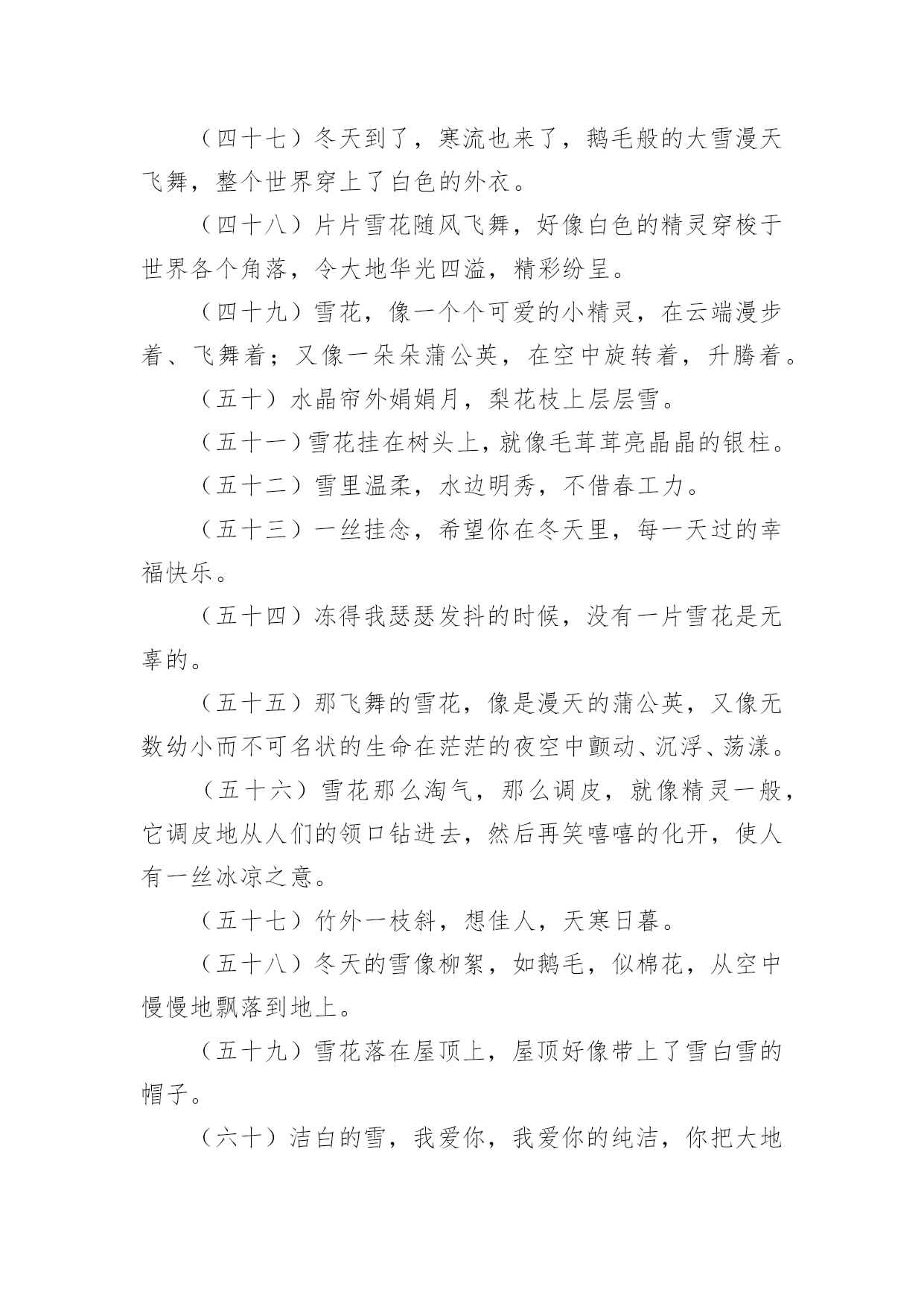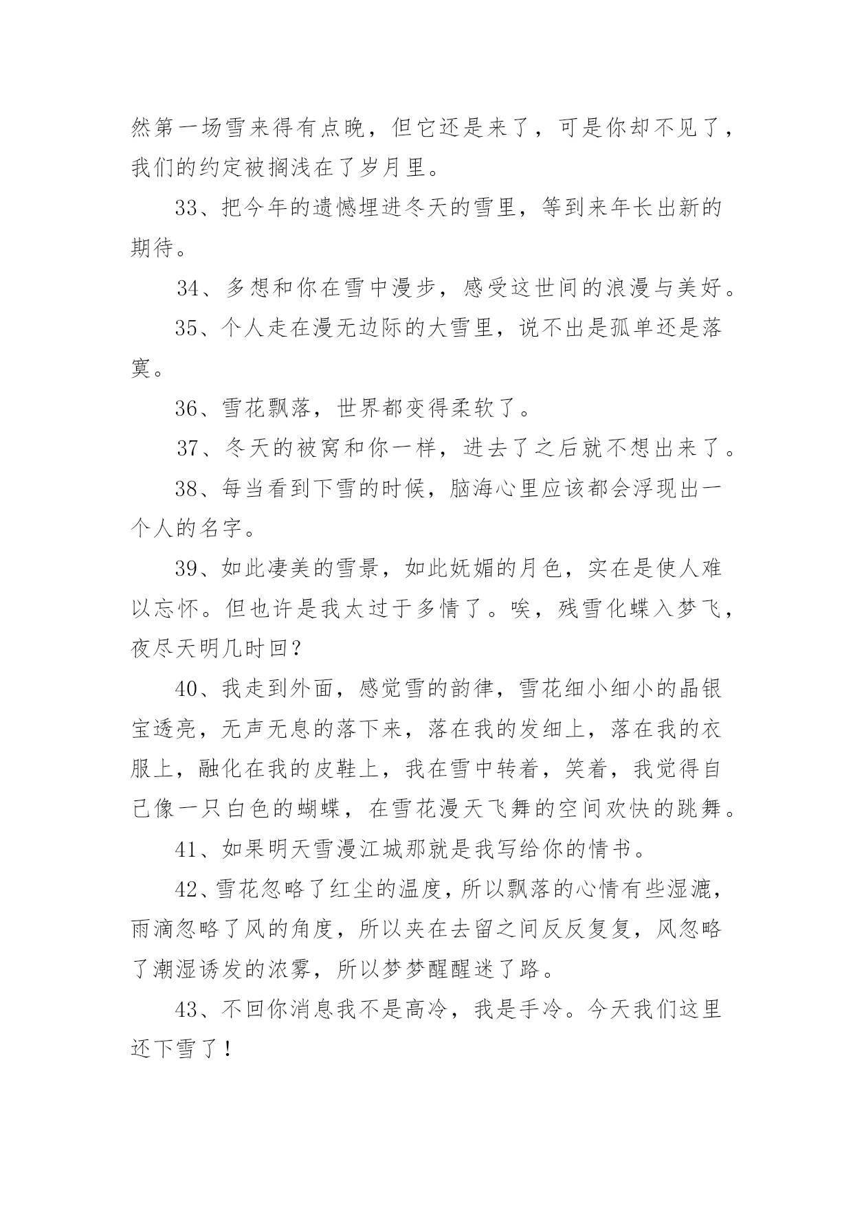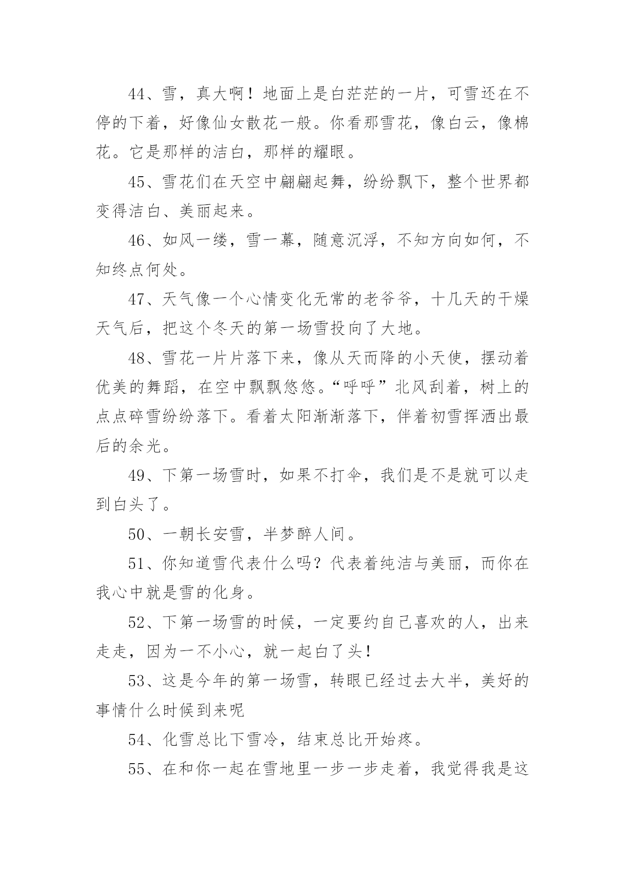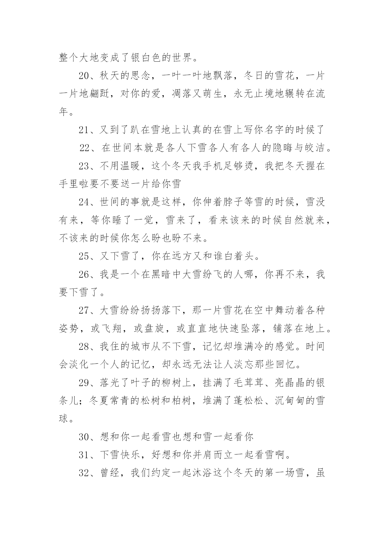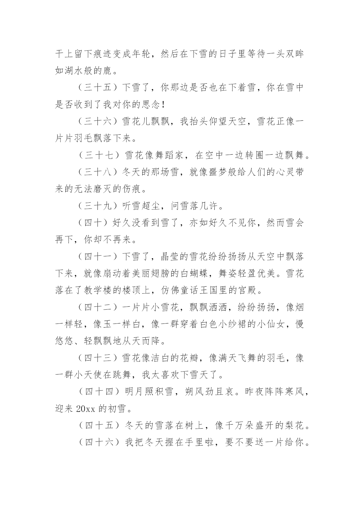 适合下雪抖音的简短文案适合下雪抖音的简短文案随着社交网络开始流行,越来越多人钟情于在社交平台上发布文案,文案具有在理智上启发人们,在情感上打动人们的作用。那些被广泛运用的文案都是什么样子的呢?下面是小编帮大家整理的适合下雪抖音的简短文案,欢迎大家借鉴与参考,希望对大家有所帮助。适合下雪抖音的简短文案1(一)一片片雪花像是一只只美丽的白色蝴蝶满天飞舞。(二)雪终于停了,茫茫的田野一片雪白,房舍、群山披上了银装。(三)听说初雪的这一天,说谎的人可以被原谅,告白的人能白头偕老。(四)让一句祝福,为你送上冬日的暖阳。(五)风再大,也吹不散思念之心,雾再浓,也迷不了牵挂之意,天再冷,也冻不住友谊之情,雪再厚,也盖不住问候之意,愿你多保重,忙里偷闲努力照顾好自己。(六)冬天的雪像一位技艺高超的女工,给大地织出了一条厚厚的白毯子。(七)凛冬已至,星河长明。(八)孤飞一片雪,百里见秋毫。(九)在大雪中,才分不清什么是黑,什么是白,犹如弥天大谎,童话着(十)还记得那一场雪,陪着我的温柔下了一夜,盼不到花开的季节,把所有热情埋藏在这冰冷雪夜。(十一)数萼初含雪,孤标画本难。(十二)雪花像蝴蝶那么优雅,像蒲公英那么洁白,真是太美了!(十三)雪花在空中飞舞,它们好似一个个快乐的音符,舞动出了冬日中最温馨的画面。(十四)都道无人愁似我,今夜雪,有梅花,似我愁。(十五)渐渐地,雪的密度增强了,速度也比开始时快多了,天空就成了银白一片,像满天的白蝴蝶轻韵地舞蹈,又如纯白的礼花从天而降。(十六)下雪的时候,一定要约自己喜欢的人,出来走走,因为一不小心,就一起白了头。(十七)冬天到了,飞雪像蝴蝶一样飘落下来,美丽极了!(十八)漫天飞来,初次雪花,不由得我喜欢你。(十九)看破不说破,寂寞如雪,平静地做了风雪夜归人。(二十)雪花纷纷扬扬的飘落下来,像仙女和蝴蝶仙子们的合奏一样。(二十一)等待一场大雪,在深夜里盛开。(二十二)都渴望雪,就像是一种注定的心情。我亦是凡人,就像空中千万朵雪花中的一朵,平凡而又晶莹,把自己玲珑剔透成一片神圣,寒冷时,有棱有雨,温暖时,甘心融化。(二十三)去年冬天陪你看雪的人,今年可以换成我吗。(二十四)冬天的雪落在山上,落在树上,远远望去,好像片片白云。(二十五)外面下雪了,我们出去走走,然后我哐当一下子就把你摁雪堆里,你想出都出不来。(二十六)晨起推窗,屋顶上铺着厚厚的棉絮,暖暖的冬阳拥抱着你,我轻轻地,轻轻地站在门前,脚步不忍和你触及,怕扰了这份宁静,惊了如梦如幻的你。(二十七)我在南方的艳阳里四季如春,你在北方的寒夜里大雪纷飞。(二十八)如果我有多一张机票,你愿意和我去远方等一场初雪吗?(二十九)他人笑我穿得厚,我笑他人冻得透。(三十)有雪的温暖,伴你永远。(三十一)下雪的日子里,时间被雪花划过天空的痕迹拉得漫长。(三十二)雪花又像珍珠一样亮闪闪,犹如一群活泼可爱的小精灵,在空中跳来跳去,犹如星星般点缀茫茫夜空。(三十三)雪花如蝴蝶翩起舞,雪花如一个高贵典雅的公主,舞动她那神秘的面纱,带来阵阵寒风。雪花又如一个怕冷的孩子,往你的衣服里直钻,寻找温暖的地方。(三十四)每个寂寞的雨天和有鸟飞过的深秋,都在树干上留下痕迹变成年轮,然后在下雪的日子里等待一头双眸如湖水般的鹿。(三十五)下雪了,你那边是否也在下着雪,你在雪中是否收到了我对你的思念!(三十六)雪花儿飘飘,我抬头仰望天空,雪花正像一片片羽毛飘落下来。(三十七)雪花像舞蹈家,在空中一边转圈一边飘舞。(三十八)冬天的那场雪,就像噩梦般给人们的心灵带来的无法磨灭的伤痕。(三十九)听雪超尘,问雪落几许。(四十)好久没看到雪了,亦如好久不见你,然而雪会再下,你却不再来。(四十一)下雪了,晶莹的雪花纷纷扬扬从天空中飘落下来,就像扇动着美丽翅膀的白蝴蝶,舞姿轻盈优美。雪花落在了教学楼的楼顶上,仿佛童话王国里的宫殿。(四十二)一片片小雪花,飘飘洒洒,纷纷扬扬,像烟一样轻,像玉一样白,像一群穿着白色小纱裙的小仙女,慢悠悠、轻飘飘地从天而降。(四十三)雪花像洁白的花瓣,像满天飞舞的羽毛,像一群小天使在跳舞,我太喜欢下雪天了。(四十四)明月照积雪,朔风劲且哀。昨夜阵阵寒风,迎来20xx的初雪。(四十五)冬天的雪落在树上,像千万朵盛开的梨花。(四十六)我把冬天握在手里啦,要不要送一片给你。(四十七)冬天到了,寒流也来了,鹅毛般的大雪漫天飞舞,整个世界穿上了白色的外衣。(四十八)片片雪花随风飞舞,好像白色的精灵穿梭于世界各个角落,令大地华光四溢,精彩纷呈。(四十九)雪花,像一个个可爱的小精灵,在云端漫步着、飞舞着;又像一朵朵蒲公英,在空中旋转着,升腾着。(五十)水晶帘外娟娟月,梨花枝上层层雪。(五十一)雪花挂在树头上,就像毛茸茸亮晶晶的银柱。(五十二)雪里温柔,水边明秀,不借春工力。(五十三)一丝挂念