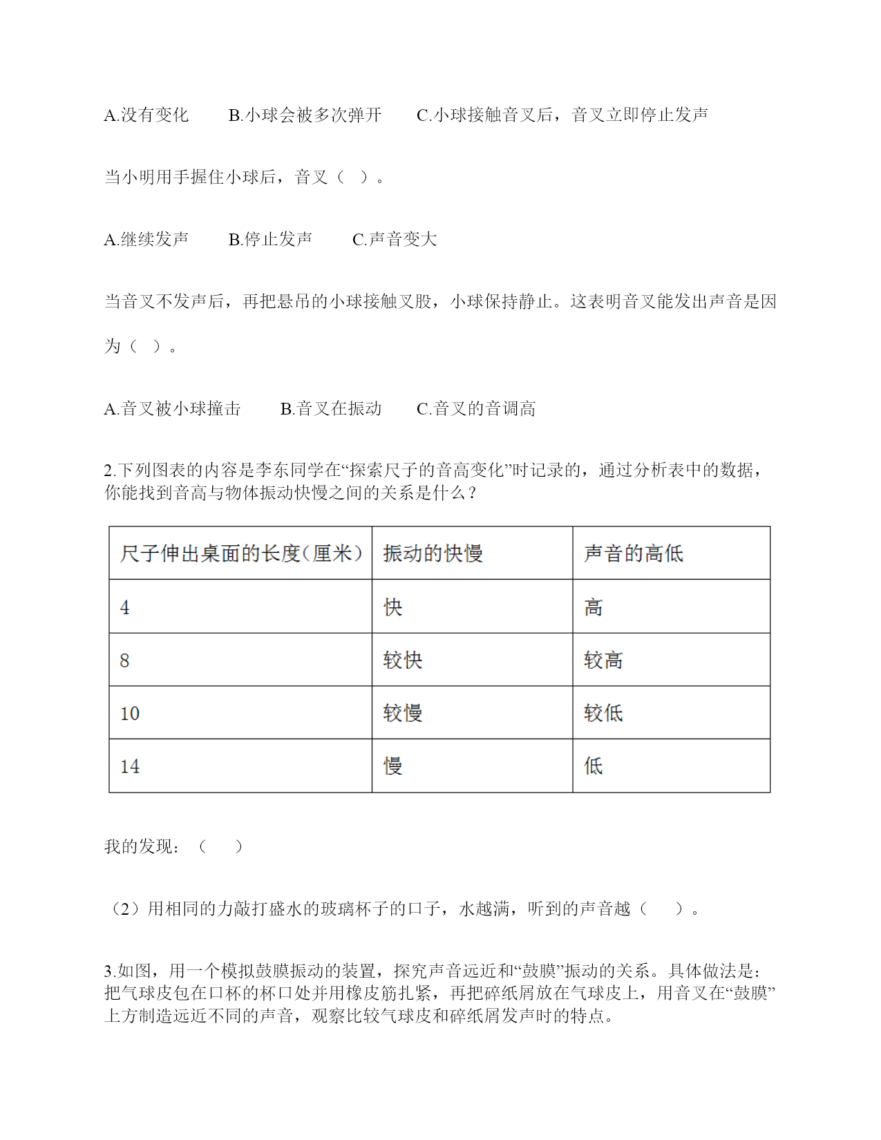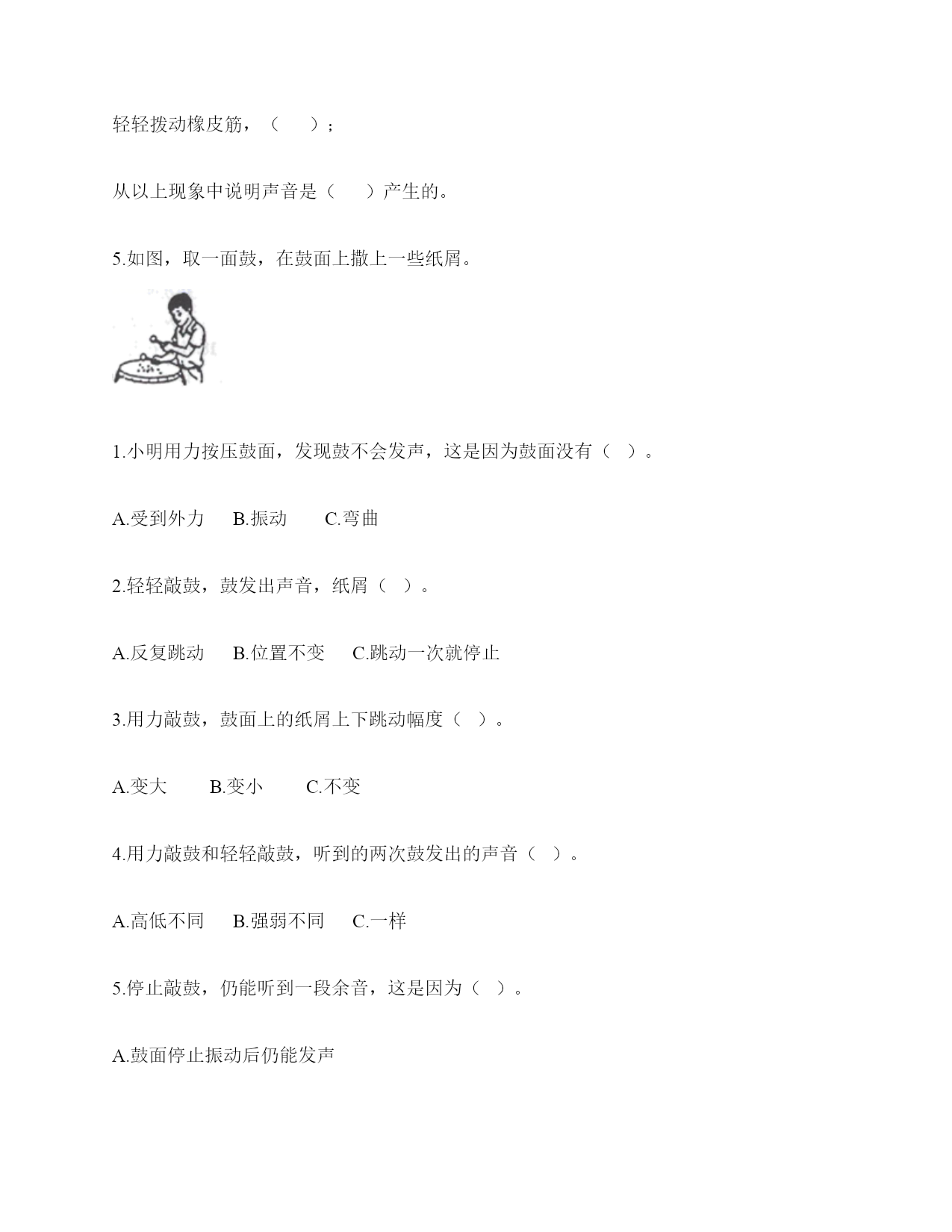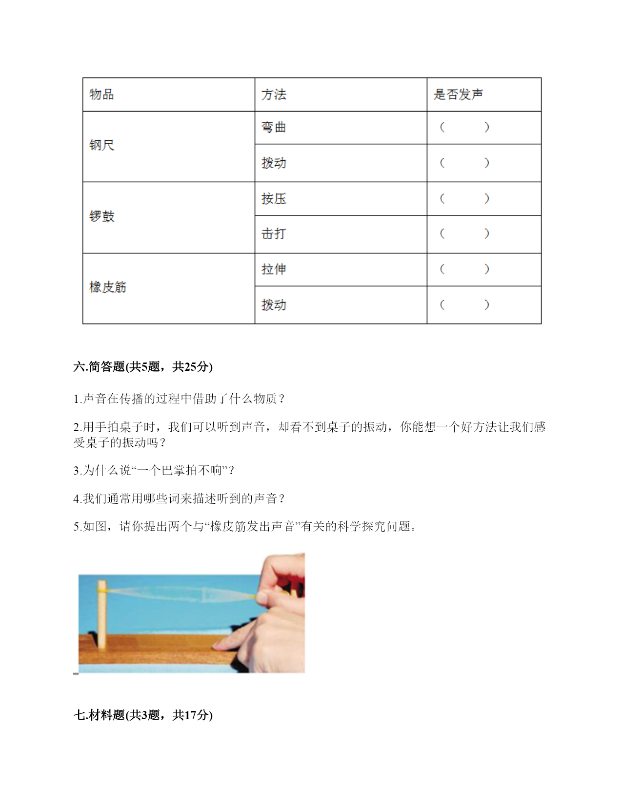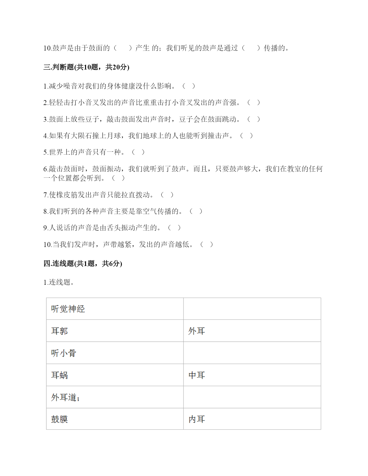 小学科学《声音》练习题一.选择题(共10题,共20分)1.如图,铝片琴()边的音高,()的音低。A.左边,中间B.右边、左边C.中间,左边2.小明用手摸着自己的喉结并说话,体会喉结在振动的感觉;小红在桌上用手按住钢尺然后拨动钢尺伸出桌面的那部分,观察尺子的状态;小强在鼓面上放一些碎纸屑然后敲击鼓面,观察纸屑的状态。这三位同学研究的问题是()。A.声音是怎样产生的B.声音的强弱C.声音的高低3.在弹奏吉他时,若想要使它发出的声音响一些,可以()。A.调节弦的松紧度B.用的力气大一点C.用的力气小一点4.一般情况下,成年女子的声带比成年男子的短,振动速度快,这说明()。A.女子音高比男子高B.女子音高比男子低C.女子音量比男子高5.声音在()传播速度最快。A.固体B.液体C.气体6.我们做的土电话能听到对方小声讲话,是因为纸杯把声音()了。A.扩大B.缩小C.不变7.我们的喉咙里有一个能够发出声音、控制声音的器官是()。A.音带B.声带C.听小骨8.声音可以向()传播。A.一个方向B.四面八方C.两个方向9.尺子振动的频率和尺子伸出桌面部分的()有关。A.高度B.长度C.刻度10.小明自制了一个橡皮筋琴,如图:用相同大小的力从细弦到粗弦依次弹拨,声音的变化是()。A.从低到高B.从高到低C.从弱到强二.填空题(共10题,共36分)1.人的耳朵由外耳、()和()三部分组成。2.用相同的力量敲打盛水的玻璃杯杯口,水越满,听到的声音越()。3.()可将振动传达到内耳,并刺激听觉神经,产生信号。4.音量的大小与物体()有关。振动幅度越(),声音越();振动幅度越(),声音越()。5.用相同的力拨动钢尺时,钢尺伸出桌面越短,发出的声音越();钢尺伸出桌面越长,发出的声音越()。6.蚊子发出的“嗡嗡”声是由()振动产生的。7.音叉上有字母和数字,字母代表的是(),数字代表的是音叉每秒钟()的次数。8.()很薄而且有弹性,即使是很轻的声音,它都会产生振动。9.声音的传播是以()的形式传播的。10.鼓声是由于鼓面的()产生的;我们听见的鼓声是通过()传播的。三.判断题(共10题,共20分)1.减少噪音对我们的身体健康没什么影响。()2.轻轻击打小音叉发出的声音比重重击打小音叉发出的声音强。()3.鼓面上放些豆子,敲击鼓面发出声音时,豆子会在鼓面跳动。()4.如果有大陨石撞上月球,我们地球上的人也能听到撞击声。()5.世界上的声音只有一种。()6.敲击鼓面时,鼓面振动,我们就听到了鼓声。而且,只要鼓声够大,我们在教室的任何一个位置都会听到。()7.使橡皮筋发出声音只能拉直拨动。()8.我们听到的各种声音主要是靠空气传播的。()9.人说话的声音是由舌头振动产生的。()10.当我们发声时,声带越紧,发出的声音越低。()四.连线题(共1题,共6分)1.连线题。五.填表题(共2题,共18分)1.猜想:声音强弱与物体振动幅度有关,振幅越大,声音越();物体振幅越小,声音越()。实验器材:钢尺,桌子改变的条件:()不改变的条件:()填写表格。实验结论是什么?2.观察物体是否发声。六.简答题(共5题,共25分)1.声音在传播的过程中借助了什么物质?2.用手拍桌子时,我们可以听到声音,却看不到桌子的振动,你能想一个好方法让我们感受桌子的振动吗?3.为什么说“一个巴掌拍不响”?4.我们通常用哪些词来描述听到的声音?5.如图,请你提出两个与“橡皮筋发出声音”有关的科学探究问题。七.材料题(共3题,共17分)1.唐朝著名诗人白居易在《琵琶行》中有“大弦嘈嘈如急雨,小弦切切如私语”的诗句。意思是粗弦嘈嘈,好像是疾风骤雨,细弦切切,好像是儿女私语。根据所学的知识,说一说弦的粗细对音高有什么影响?还有哪些因素能影响音高?2.小明有3根长短相同,粗细不同的钢管,小丽说:“我可以闭上眼睛,只通过用相同的力敲击钢管就可以判断它们的粗细。”请解释其中的原理。3.如图所示:在一块木板上钉两个钉子,在两个钉子之间绑一根橡皮筋,拨弹橡皮筋,观察比较声音高低的变化。实验记录如下:实验说明:物体振动得越快,发出的声音就越();物体振动得越慢,发出的声音就越();同时还说明声音是由物体()而产生的。八.综合题(共5题,共39分)1.如图所示,小明使悬吊的小球接触发声音叉的叉股,会发生什么现象?()A.没有变化B.小球会被多次弹开C.小球接触音叉后,音叉立即停止发声当小明用手握住小球后,音叉()。A.继续发声B.停止发声C.声音变大当音叉不发声后,再把悬吊的小球接触叉股,小球保持静止。这表明音叉能发出声音是因为()。A.音叉被小球撞击B.音叉