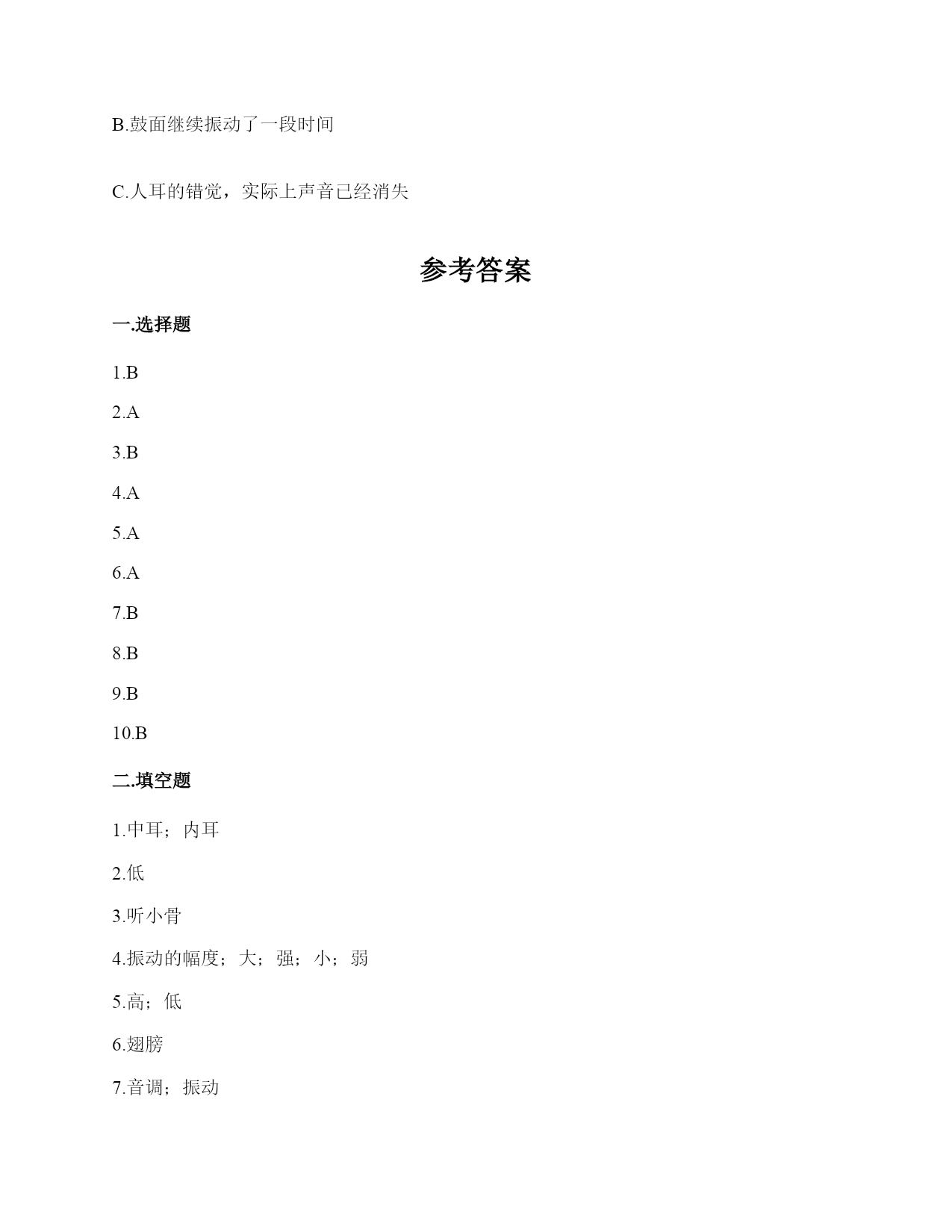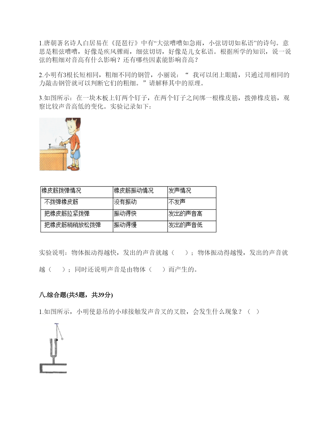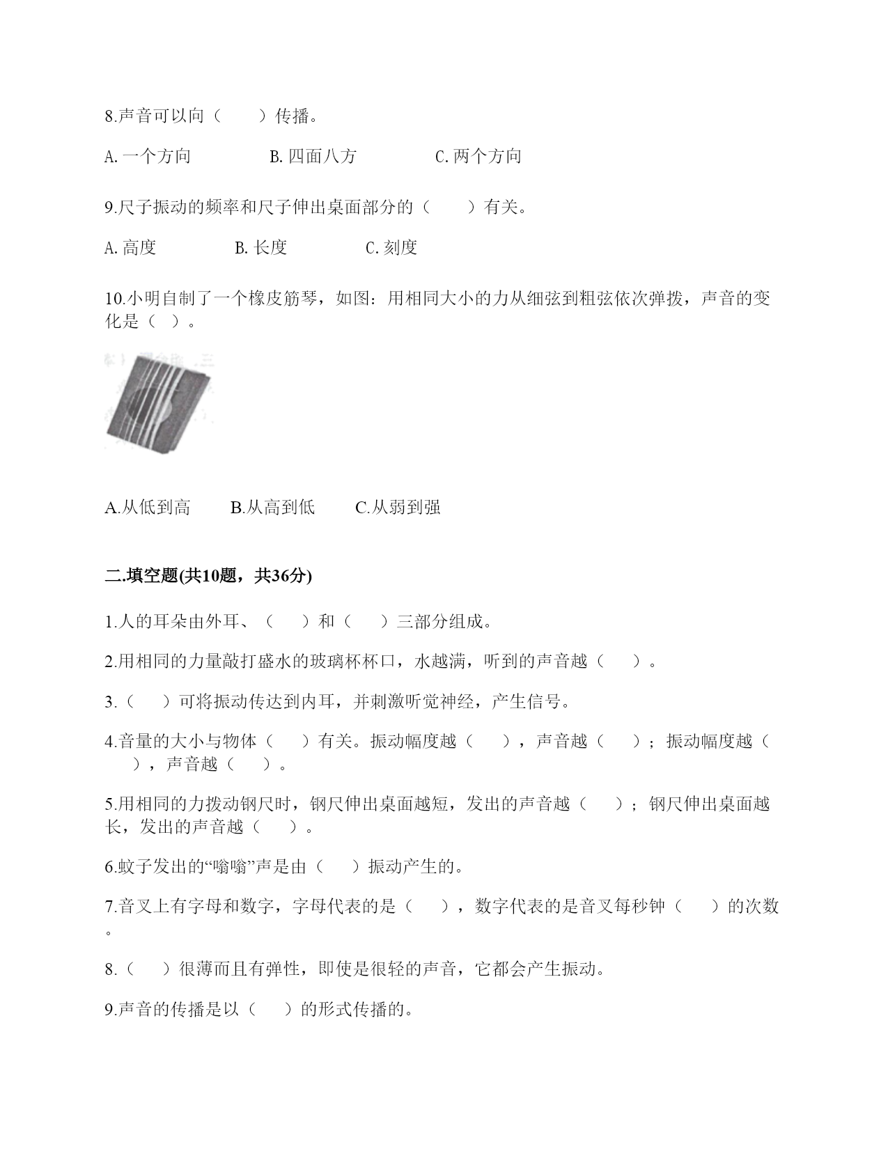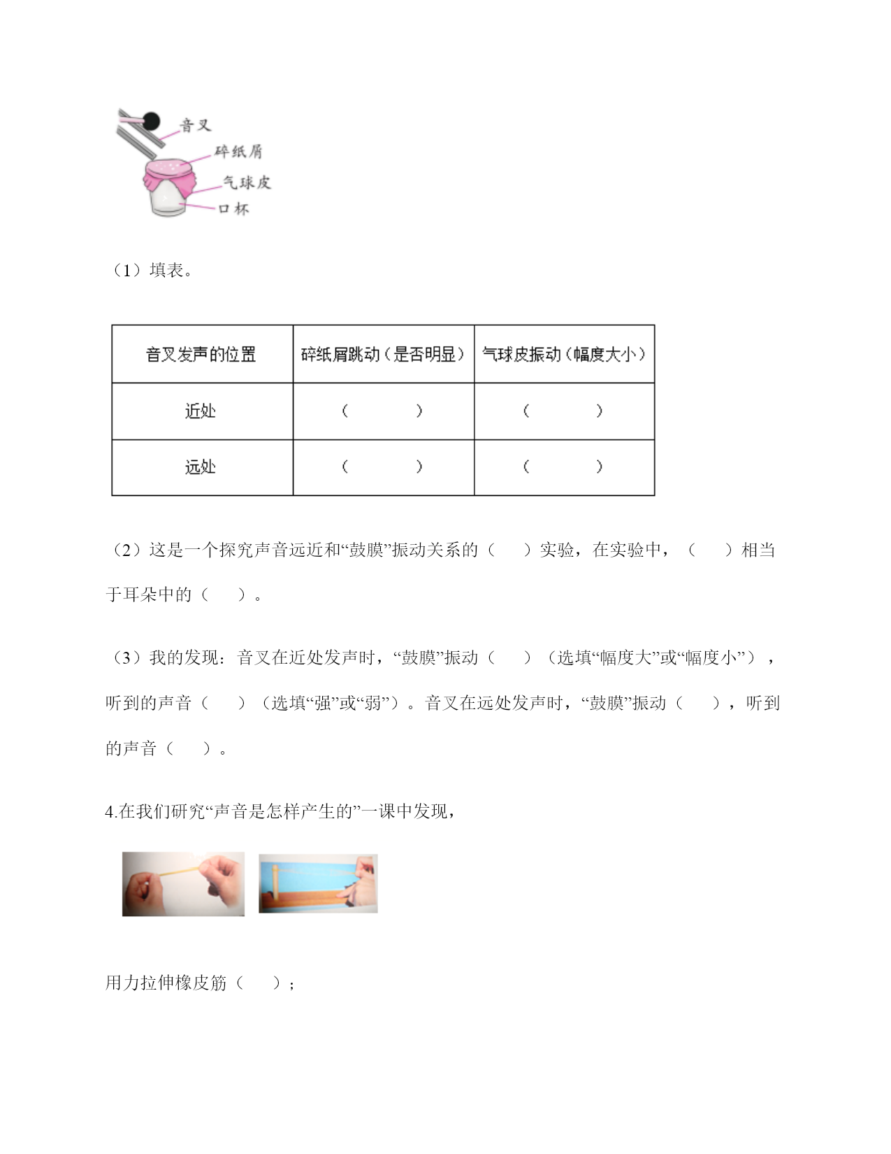 小学科学《声音》练习题一.选择题(共10题,共20分)1.如图,铝片琴()边的音高,()的音低。A.左边,中间B.右边、左边C.中间,左边2.小明用手摸着自己的喉结并说话,体会喉结在振动的感觉;小红在桌上用手按住钢尺然后拨动钢尺伸出桌面的那部分,观察尺子的状态;小强在鼓面上放一些碎纸屑然后敲击鼓面,观察纸屑的状态。这三位同学研究的问题是()。A.声音是怎样产生的B.声音的强弱C.声音的高低3.在弹奏吉他时,若想要使它发出的声音响一些,可以()。A.调节弦的松紧度B.用的力气大一点C.用的力气小一点4.一般情况下,成年女子的声带比成年男子的短,振动速度快,这说明()。A.女子音高比男子高B.女子音高比男子低C.女子音量比男子高5.声音在()传播速度最快。A.固体B.液体C.气体6.我们做的土电话能听到对方小声讲话,是因为纸杯把声音()了。A.扩大B.缩小C.不变7.我们的喉咙里有一个能够发出声音、控制声音的器官是()。A.音带B.声带C.听小骨8.声音可以向()传播。A.一个方向B.四面八方C.两个方向9.尺子振动的频率和尺子伸出桌面部分的()有关。A.高度B.长度C.刻度10.小明自制了一个橡皮筋琴,如图:用相同大小的力从细弦到粗弦依次弹拨,声音的变化是()。A.从低到高B.从高到低C.从弱到强二.填空题(共10题,共36分)1.人的耳朵由外耳、()和()三部分组成。2.用相同的力量敲打盛水的玻璃杯杯口,水越满,听到的声音越()。3.()可将振动传达到内耳,并刺激听觉神经,产生信号。4.音量的大小与物体()有关。振动幅度越(),声音越();振动幅度越(),声音越()。5.用相同的力拨动钢尺时,钢尺伸出桌面越短,发出的声音越();钢尺伸出桌面越长,发出的声音越()。6.蚊子发出的“嗡嗡”声是由()振动产生的。7.音叉上有字母和数字,字母代表的是(),数字代表的是音叉每秒钟()的次数。8.()很薄而且有弹性,即使是很轻的声音,它都会产生振动。9.声音的传播是以()的形式传播的。10.鼓声是由于鼓面的()产生的;我们听见的鼓声是通过()传播的。三.判断题(共10题,共20分)1.减少噪音对我们的身体健康没什么影响。()2.轻轻击打小音叉发出的声音比重重击打小音叉发出的声音强。()3.鼓面上放些豆子,敲击鼓面发出声音时,豆子会在鼓面跳动。()4.如果有大陨石撞上月球,我们地球上的人也能听到撞击声。()5.世界上的声音只有一种。()6.敲击鼓面时,鼓面振动,我们就听到了鼓声。而且,只要鼓声够大,我们在教室的任何一个位置都会听到。()7.使橡皮筋发出声音只能拉直拨动。()8.我们听到的各种声音主要是靠空气传播的。()9.人说话的声音是由舌头振动产生的。()10.当我们发声时,声带越紧,发出的声音越低。()四.连线题(共1题,共6分)1.连线题。五.填表题(共2题,共18分)1.猜想:声音强弱与物体振动幅度有关,振幅越大,声音越();物体振幅越小,声音越()。实验器材:钢尺,桌子改变的条件:()不改变的条件:()填写表格。实验结论是什么?2.观察物体是否发声。六.简答题(共5题,共25分)1.声音在传播的过程中借助了什么物质?2.用手拍桌子时,我们可以听到声音,却看不到桌子的振动,你能想一个好方法让我们感受桌子的振动吗?3.为什么说“一个巴掌拍不响”?4.我们通常用哪些词来描述听到的声音?5.如图,请你提出两个与“橡皮筋发出声音”有关的科学探究问题。七.材料题(共3题,共17分)1.唐朝著名诗人白居易在《琵琶行》中有“大弦嘈嘈如急雨,小弦切切如私语”的诗句。意思是粗弦嘈嘈,好像是疾风骤雨,细弦切切,好像是儿女私语。根据所学的知识,说一说弦的粗细对音高有什么影响?还有哪些因素能影响音高?2.小明有3根长短相同,粗细不同的钢管,小丽说:“我可以闭上眼睛,只通过用相同的力敲击钢管就可以判断它们的粗细。”请解释其中的原理。3.如图所示:在一块木板上钉两个钉子,在两个钉子之间绑一根橡皮筋,拨弹橡皮筋,观察比较声音高低的变化。实验记录如下:实验说明:物体振动得越快,发出的声音就越();物体振动得越慢,发出的声音就越();同时还说明声音是由物体()而产生的。八.综合题(共5题,共39分)1.如图所示,小明使悬吊的小球接触发声音叉的叉股,会发生什么现象?()A.没有变化B.小球会被多次弹开C.小球接触音叉后,音叉立即停止发声当小明用手握住小球后,音叉()。A.继续发声B.停止发声C.声音变大当音叉不发声后,再把悬吊的小球接触叉股,小球保持静止。这表明音叉能发出声音是因为()。A.音叉被小球撞击B.音叉