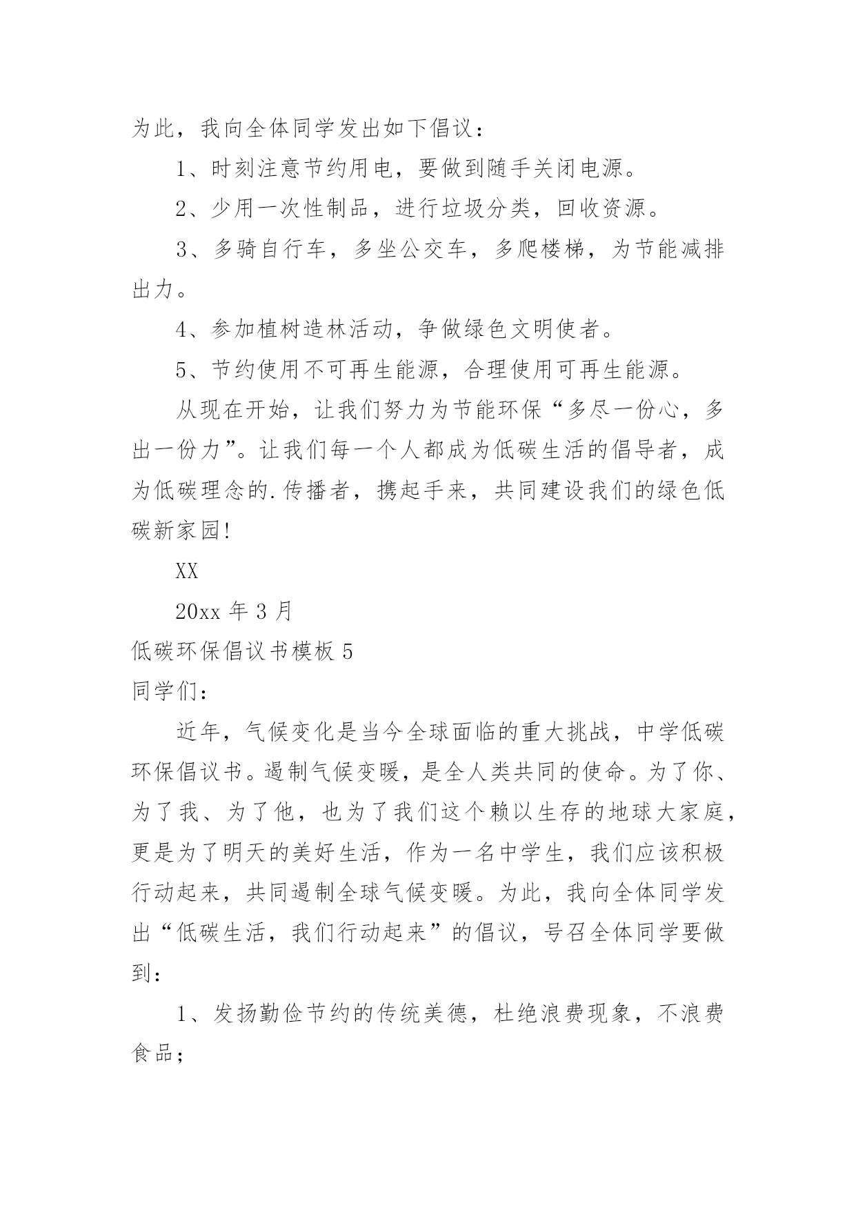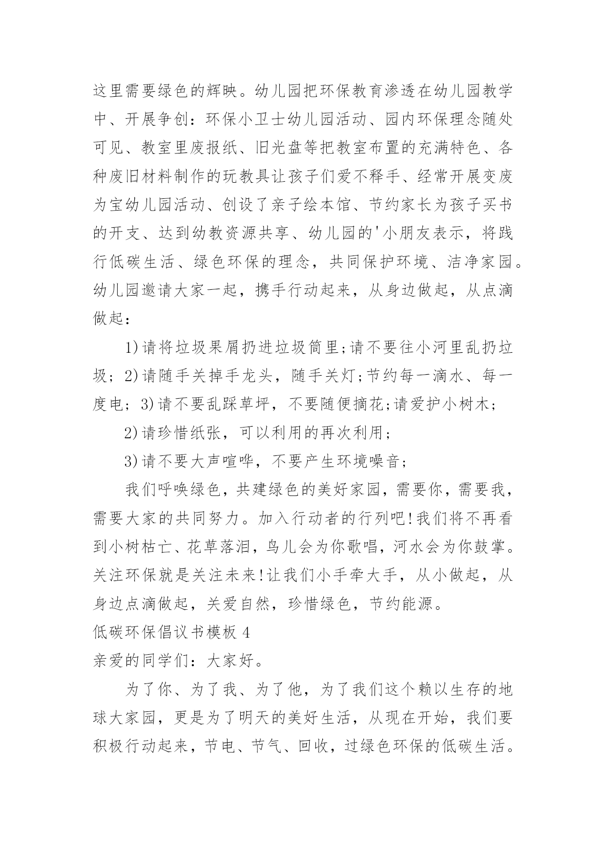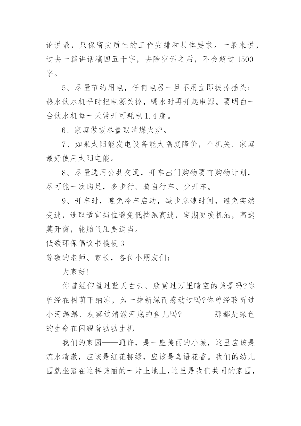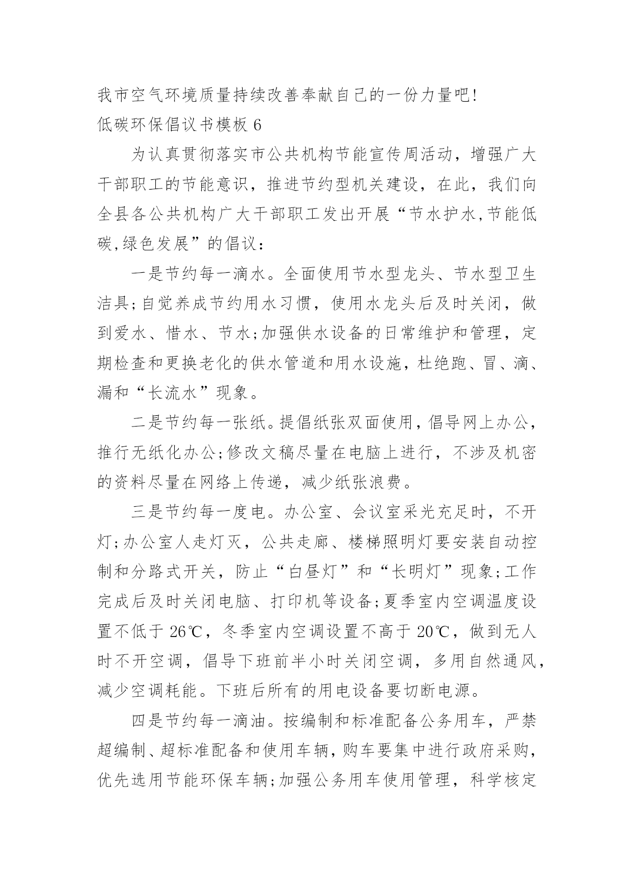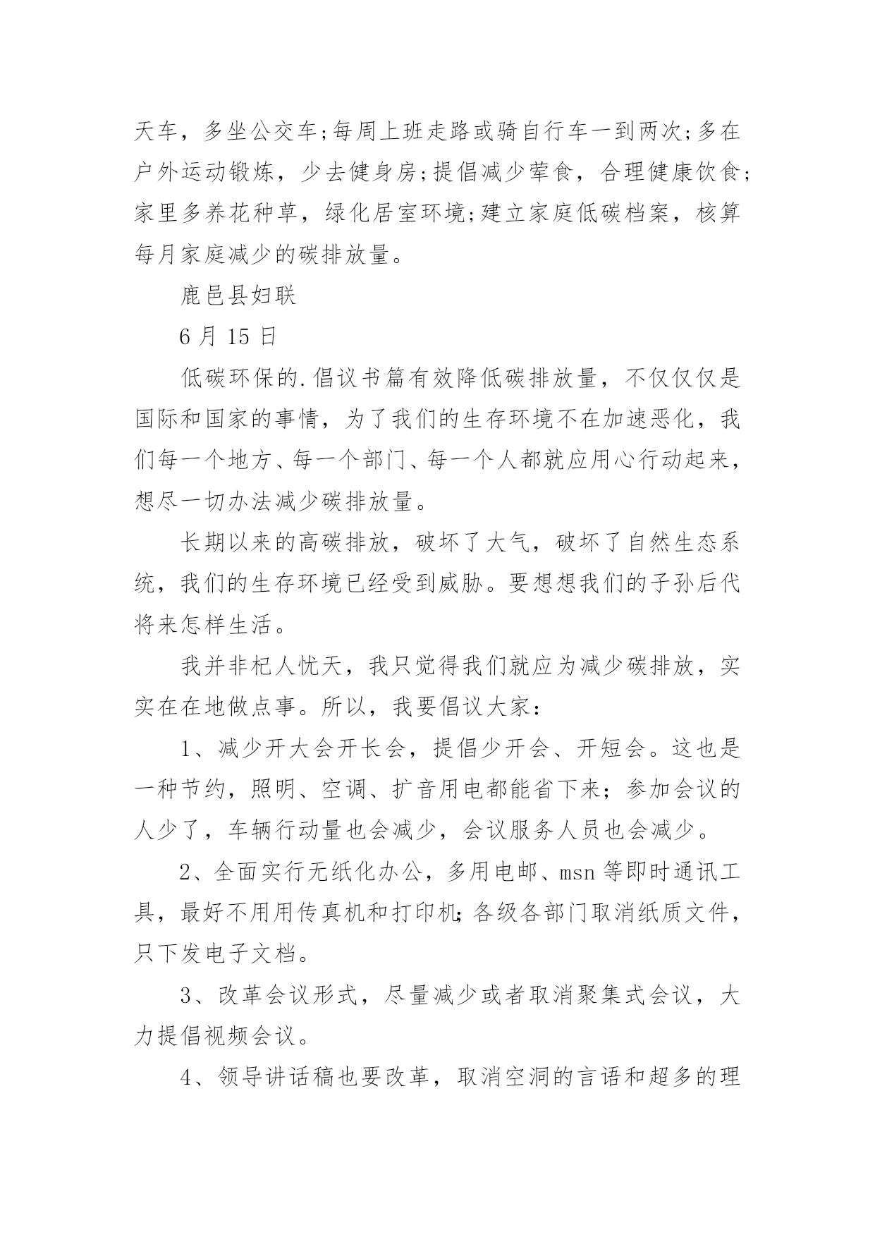 低碳环保倡议书低碳环保倡议书模板随着社会一步步向前发展,我们都跟倡议书有着直接或间接的联系,倡议书一般由标题、称呼、正文、结尾、落款五部分组成。怎么写倡议书才能避免踩雷呢?以下是小编帮大家整理的低碳环保倡议书模板,欢迎大家分享。低碳环保倡议书模板1尊敬的职工师傅们,亲爱的青年朋友们:“低碳生活”代表了一种生活方式,旨在最大程度地减少所使用的能量,从而减少二氧化碳的排放量。它是一种自然而然的习惯,节约身边各种资源。因此,段团委发起了“低碳行动,从我做起”的号召,希望全段干部职工从自己身边做起,推动污染减排,倡导绿色生活,为构建环境友好型社会以及建设生态文明尽自己的一份力。一、倡导低碳行动低碳生活不仅仅存在于我们的日常生活中的种种琐事,而且具有深远意义和巨大影响。我们鼓励广大干部职工通过不同途径认真学习和宣传低碳生活知识,加强低碳意识,树立低碳理念,并且倡导低碳生活。我们要积极向群众和朋友推广“低碳城市宜居可持续”思想,宣传健康有益、环保的出行方式,带动更多人自觉参与“低碳行动,从我做起”计划,让我们的家园更绿色、更文明、更健康。二、倡导低碳行动随着汽车的普及,二氧化碳排放越来越多,直接加快了全球气候变暖的趋势。我们呼吁广大干部职工充分认识驾驶汽车对环境问题造成的影响,倡导“能走不骑,能骑不坐,能坐不开”的出行理念。我们支持“购车族”尽量选择低油耗、低排放、低污染、更环保的汽车;倡导“有车族”在6月15日这一天放弃使用小汽车,尽可能采取乘坐公共交通、骑自行车或步行等低碳绿色出行方式,未来尽可能每周一天放弃使用小汽车,并采纳低碳绿色出行方式。让我们的地球和城市多“放”一天,让我们的.身心得到一个美好的放松。三、践行低碳行动我们提倡广大团员青年积极参与“低碳行动,从我做起”活动,带头乘坐公共交通工具、选择“拼车”结伴而行、选择自行车或步行等绿色出行方式上下班,尽量减少摩托车或小汽车的使用。尤其要将步行和骑自行车作为促进节能减排、保护环境、强身健体的有效方式。尊敬的干部职工朋友们,如今,我们正目睹着一股回归自然、简单、纯朴和生态的生活趋势,对于我们而言,负责任、节约是当下最流行的生活潮流。让我们一起发誓,从我开始,从现在开始,积极地行动起来,倡导“低碳行动,从我做起”这一现代化、有别于时代的活动,共同致力于创造更加便利、优美和绿色健康的出行环境和归宿!低碳环保倡议书模板2全县广大妇女姐妹们:地球是我们共同的家园,环境与我们的生活息息相关。在推进经济又好又快发展的今天,合理使用自然资源,减少各种人为排放对环境的危害,保护我们的共同家园,已经成为全社会的共同责任。家庭是社会的细胞,妇女是家庭生活的主要成员,是推动节能减排的重要依靠力量。如果我们在工作和生活中自觉地节约一滴水、节约一度电、节约一张纸,不仅能减少家庭开支,更能为促进经济社会全面协调可持续发展带来巨大的效益。为此,我们向全县广大妇女姐妹们发出如下倡议:做节能低碳、保护环境的倡导者。广大妇女姐妹们要牢固树立健康生活、绿色生活理念,将科学使用资源、节能降耗的低碳生活方式作为自觉行动贯穿到我们的日常生活中,建立健康、文明、节约、环保的生活方式,努力营造节约能源、合理消费、健康生活的良好氛围。做节能低碳、保护环境的实践者。广大妇女姐妹们要积极参与“节能宣传月”主题活动,从现在做起,从我做起,从点滴小事做起,争做节约型女性,争创节能环保家庭,用行动推动低碳生活、时尚生活。做好家庭节能环保15件事:少用空调多开窗;使用节水型洁具,循环用水;温水洗衣自然晾晒;随身自备饮水杯,不用一次性纸杯;少喝瓶装饮料,多喝白开水;外出用餐自备筷、勺等便携餐具;购物使用布袋子,尽量不用塑料袋;电梯少乘几层,楼梯多爬几层;每周少开两天车,多坐公交车;每周上班走路或骑自行车一到两次;多在户外运动锻炼,少去健身房;提倡减少荤食,合理健康饮食;家里多养花种草,绿化居室环境;建立家庭低碳档案,核算每月家庭减少的碳排放量。鹿邑县妇联6月15日低碳环保的.倡议书篇有效降低碳排放量,不仅仅仅是国际和国家的事情,为了我们的生存环境不在加速恶化,我们每一个地方、每一个部门、每一个人都就应用心行动起来,想尽一切办法减少碳排放量。长期以来的高碳排放,破坏了大气,破坏了自然生态系统,我们的生存环境已经受到威胁。要想想我们的子孙后代将来怎样生活。我并非杞人忧天,我只觉得我们就应为减少碳排放,实实在在地做点事。所以,我要倡议大家:1、减少开大会开长会,提倡少开会、开短会。这也是一种节约,照明、空调、扩音用电都能省下来;参加会议的人少了,车辆行动量也会减少,会议服务人员也会减少。2、全面实行无纸化办公,多用电邮、msn等即时通讯工具,最好不用用传真机和打印机;各级各部门取消纸质文件,只下发电子文档。3、改革会议形式,尽量减少或者取消聚集