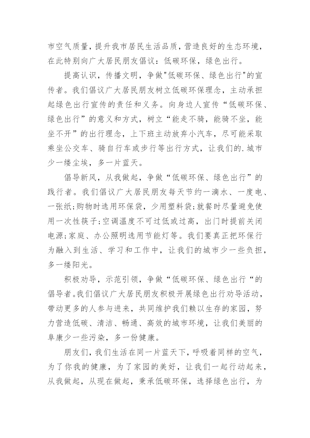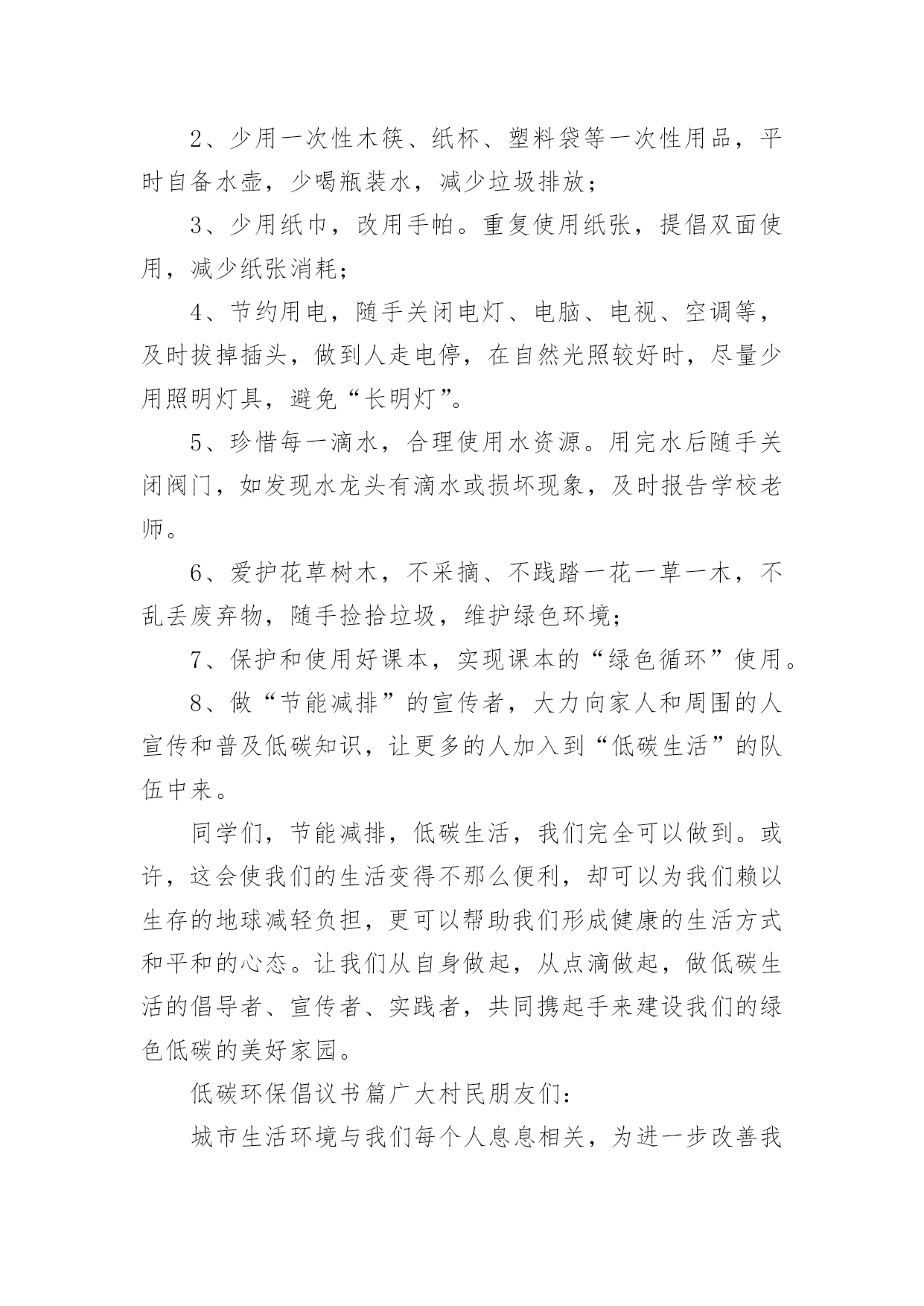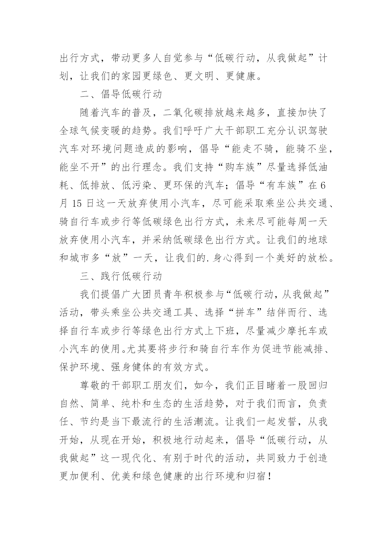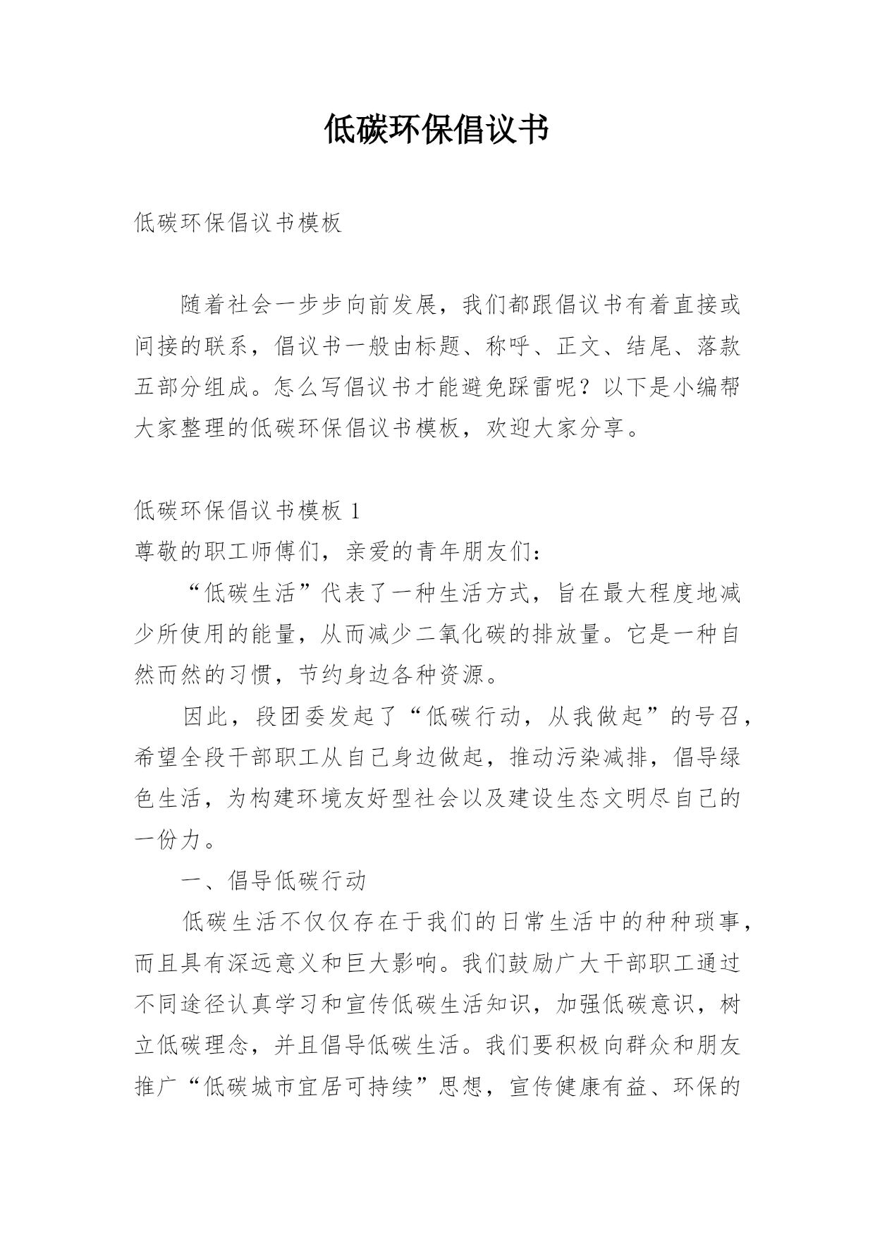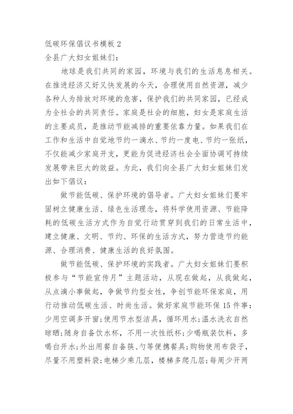 低碳环保倡议书低碳环保倡议书模板随着社会一步步向前发展,我们都跟倡议书有着直接或间接的联系,倡议书一般由标题、称呼、正文、结尾、落款五部分组成。怎么写倡议书才能避免踩雷呢?以下是小编帮大家整理的低碳环保倡议书模板,欢迎大家分享。低碳环保倡议书模板1尊敬的职工师傅们,亲爱的青年朋友们:“低碳生活”代表了一种生活方式,旨在最大程度地减少所使用的能量,从而减少二氧化碳的排放量。它是一种自然而然的习惯,节约身边各种资源。因此,段团委发起了“低碳行动,从我做起”的号召,希望全段干部职工从自己身边做起,推动污染减排,倡导绿色生活,为构建环境友好型社会以及建设生态文明尽自己的一份力。一、倡导低碳行动低碳生活不仅仅存在于我们的日常生活中的种种琐事,而且具有深远意义和巨大影响。我们鼓励广大干部职工通过不同途径认真学习和宣传低碳生活知识,加强低碳意识,树立低碳理念,并且倡导低碳生活。我们要积极向群众和朋友推广“低碳城市宜居可持续”思想,宣传健康有益、环保的出行方式,带动更多人自觉参与“低碳行动,从我做起”计划,让我们的家园更绿色、更文明、更健康。二、倡导低碳行动随着汽车的普及,二氧化碳排放越来越多,直接加快了全球气候变暖的趋势。我们呼吁广大干部职工充分认识驾驶汽车对环境问题造成的影响,倡导“能走不骑,能骑不坐,能坐不开”的出行理念。我们支持“购车族”尽量选择低油耗、低排放、低污染、更环保的汽车;倡导“有车族”在6月15日这一天放弃使用小汽车,尽可能采取乘坐公共交通、骑自行车或步行等低碳绿色出行方式,未来尽可能每周一天放弃使用小汽车,并采纳低碳绿色出行方式。让我们的地球和城市多“放”一天,让我们的.身心得到一个美好的放松。三、践行低碳行动我们提倡广大团员青年积极参与“低碳行动,从我做起”活动,带头乘坐公共交通工具、选择“拼车”结伴而行、选择自行车或步行等绿色出行方式上下班,尽量减少摩托车或小汽车的使用。尤其要将步行和骑自行车作为促进节能减排、保护环境、强身健体的有效方式。尊敬的干部职工朋友们,如今,我们正目睹着一股回归自然、简单、纯朴和生态的生活趋势,对于我们而言,负责任、节约是当下最流行的生活潮流。让我们一起发誓,从我开始,从现在开始,积极地行动起来,倡导“低碳行动,从我做起”这一现代化、有别于时代的活动,共同致力于创造更加便利、优美和绿色健康的出行环境和归宿!低碳环保倡议书模板2全县广大妇女姐妹们:地球是我们共同的家园,环境与我们的生活息息相关。在推进经济又好又快发展的今天,合理使用自然资源,减少各种人为排放对环境的危害,保护我们的共同家园,已经成为全社会的共同责任。家庭是社会的细胞,妇女是家庭生活的主要成员,是推动节能减排的重要依靠力量。如果我们在工作和生活中自觉地节约一滴水、节约一度电、节约一张纸,不仅能减少家庭开支,更能为促进经济社会全面协调可持续发展带来巨大的效益。为此,我们向全县广大妇女姐妹们发出如下倡议:做节能低碳、保护环境的倡导者。广大妇女姐妹们要牢固树立健康生活、绿色生活理念,将科学使用资源、节能降耗的低碳生活方式作为自觉行动贯穿到我们的日常生活中,建立健康、文明、节约、环保的生活方式,努力营造节约能源、合理消费、健康生活的良好氛围。做节能低碳、保护环境的实践者。广大妇女姐妹们要积极参与“节能宣传月”主题活动,从现在做起,从我做起,从点滴小事做起,争做节约型女性,争创节能环保家庭,用行动推动低碳生活、时尚生活。做好家庭节能环保15件事:少用空调多开窗;使用节水型洁具,循环用水;温水洗衣自然晾晒;随身自备饮水杯,不用一次性纸杯;少喝瓶装饮料,多喝白开水;外出用餐自备筷、勺等便携餐具;购物使用布袋子,尽量不用塑料袋;电梯少乘几层,楼梯多爬几层;每周少开两天车,多坐公交车;每周上班走路或骑自行车一到两次;多在户外运动锻炼,少去健身房;提倡减少荤食,合理健康饮食;家里多养花种草,绿化居室环境;建立家庭低碳档案,核算每月家庭减少的碳排放量。鹿邑县妇联6月15日低碳环保的.倡议书篇有效降低碳排放量,不仅仅仅是国际和国家的事情,为了我们的生存环境不在加速恶化,我们每一个地方、每一个部门、每一个人都就应用心行动起来,想尽一切办法减少碳排放量。长期以来的高碳排放,破坏了大气,破坏了自然生态系统,我们的生存环境已经受到威胁。要想想我们的子孙后代将来怎样生活。我并非杞人忧天,我只觉得我们就应为减少碳排放,实实在在地做点事。所以,我要倡议大家:1、减少开大会开长会,提倡少开会、开短会。这也是一种节约,照明、空调、扩音用电都能省下来;参加会议的人少了,车辆行动量也会减少,会议服务人员也会减少。2、全面实行无纸化办公,多用电邮、msn等即时通讯工具,最好不用用传真机和打印机;各级各部门取消纸质文件,只下发电子文档。3、改革会议形式,尽量减少或者取消聚集